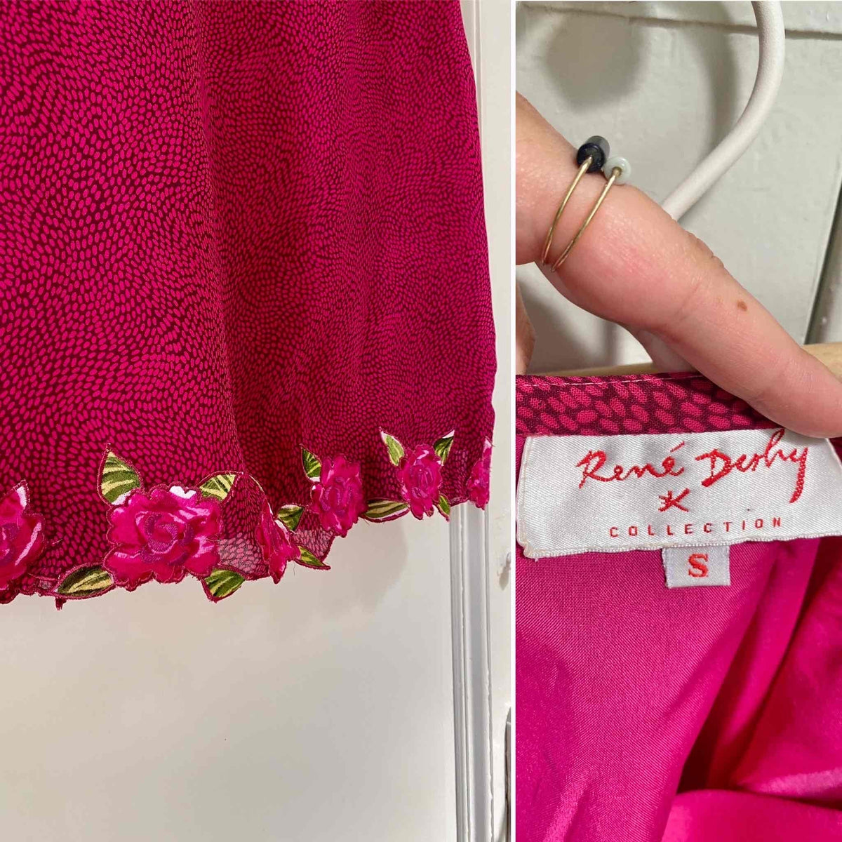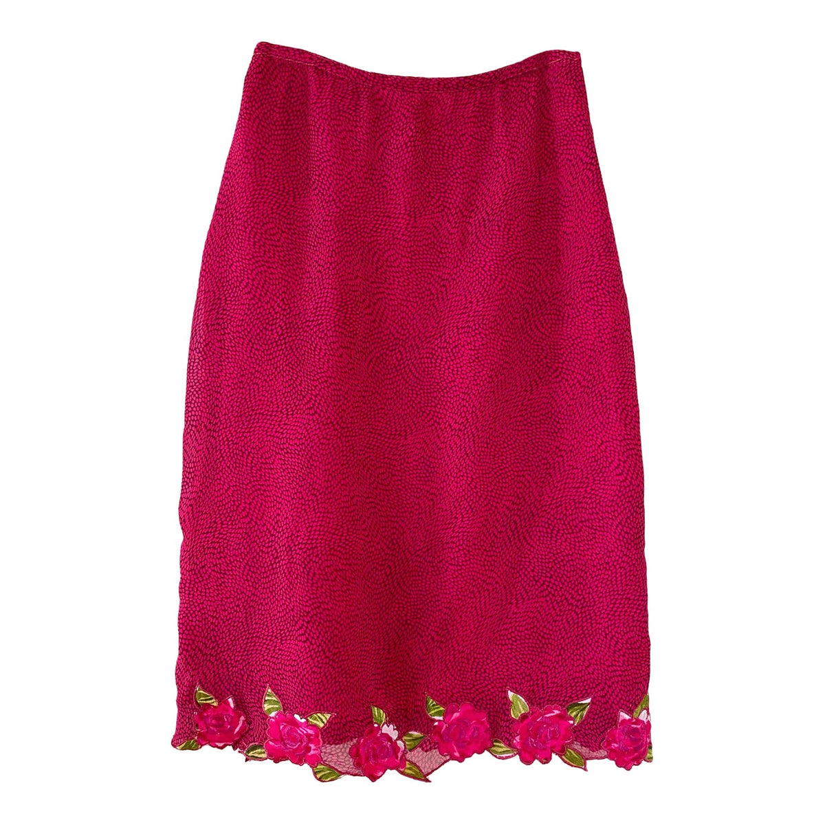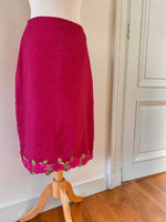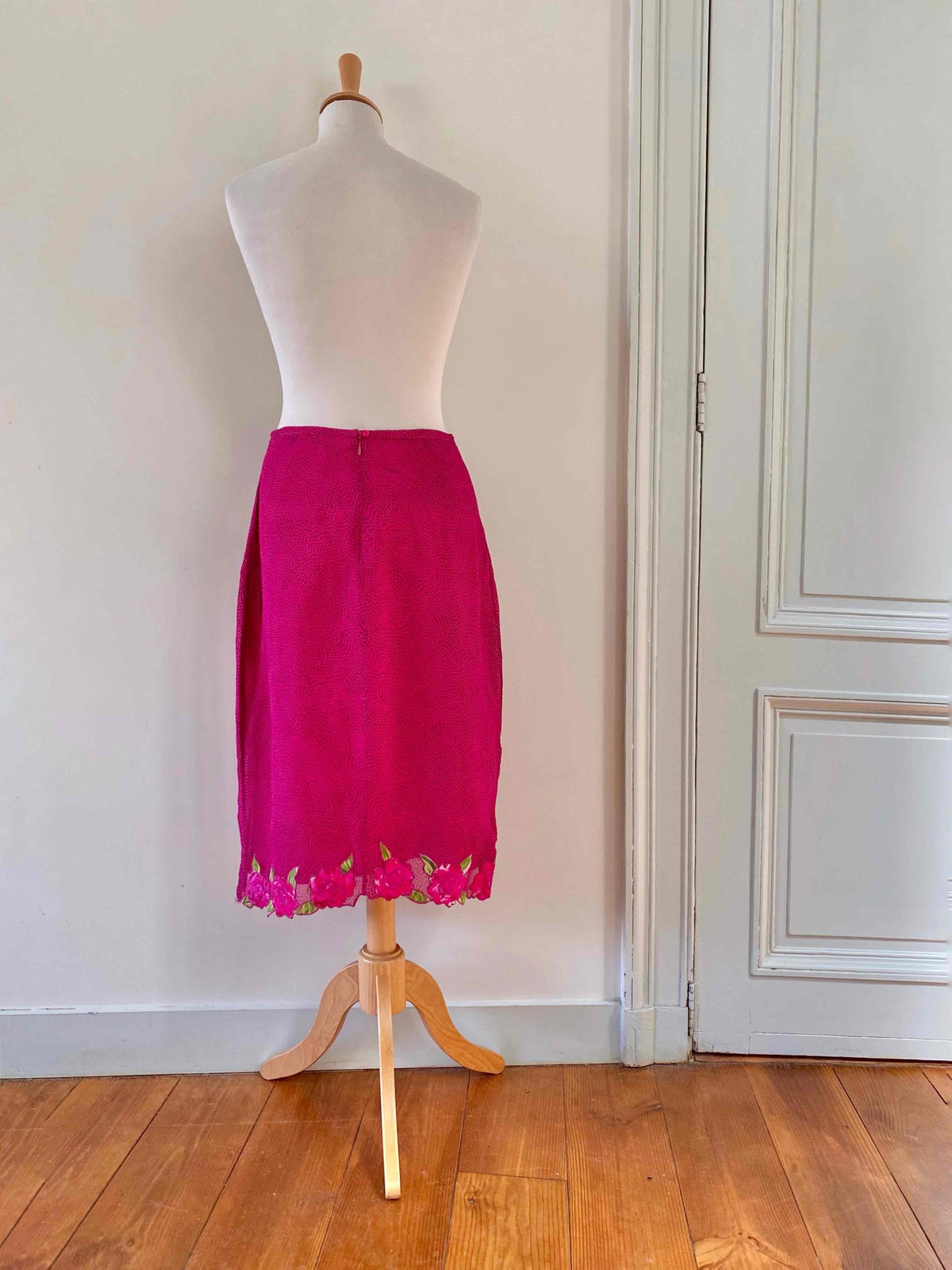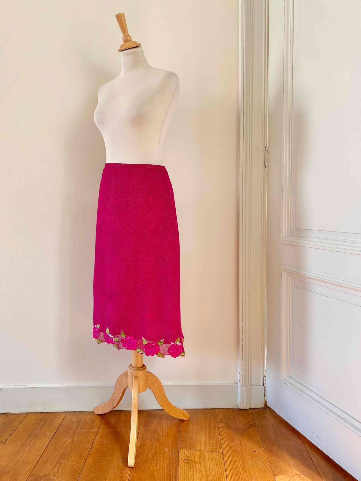 Prix unitaire parJupe midi à fleurs en voile viscose rose fuschia imprimée minis pois confettis violets, bordure bas brodé de roses fuschias et vertes en patchs appliquées, longueur midi forme fit and flare en biais, René Derhy y2k, taille 36 portée ici sur un mannequin T36, hanches 45cm.