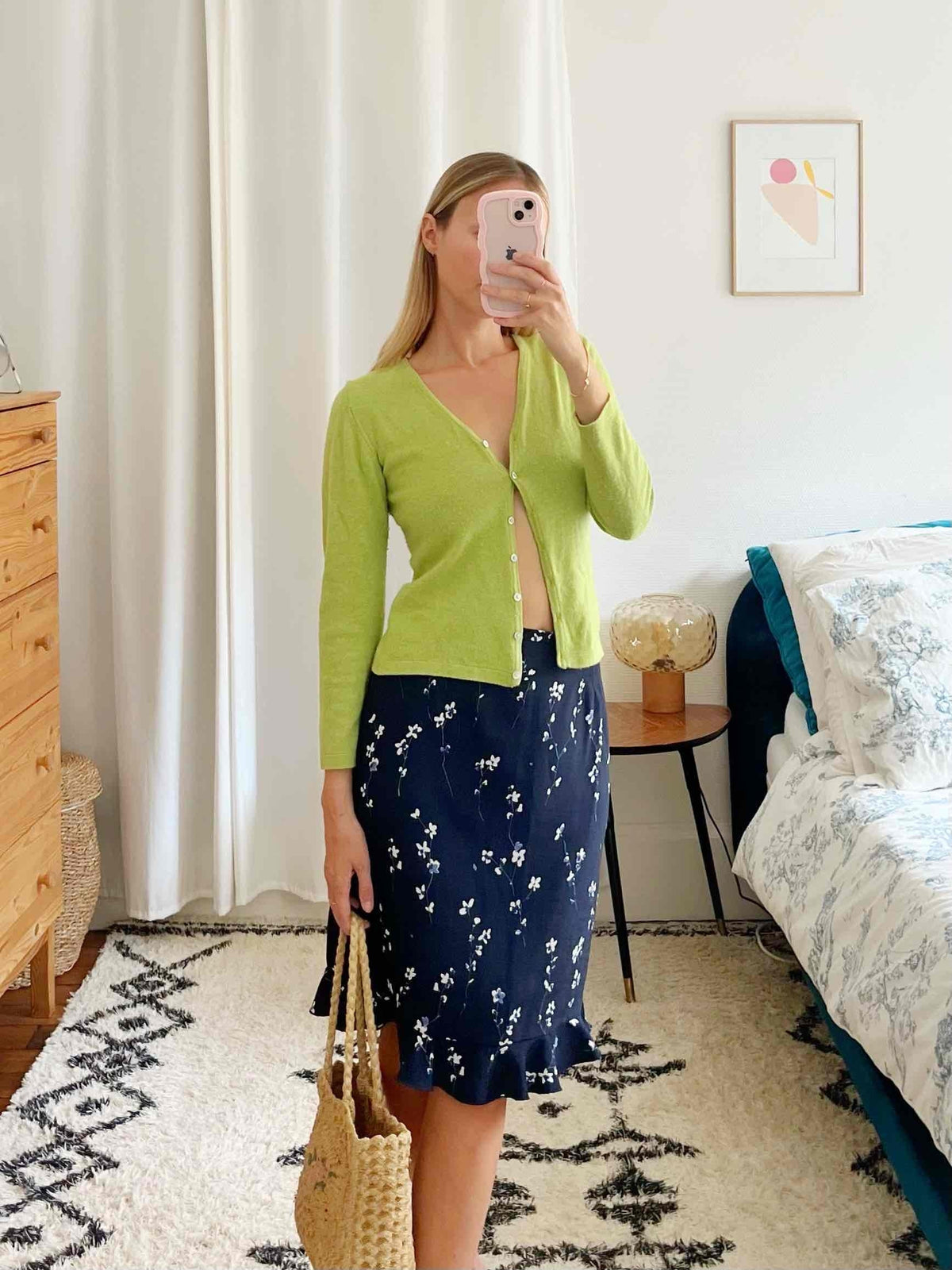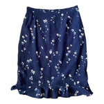 Prix unitaire parJupe midi bleu marine à fleurs, fermeture éclair à l’arrière, petits volants en bas de la jupe. Fabriquée en France. A porter seule ou avec son top.