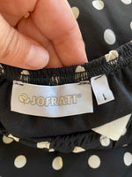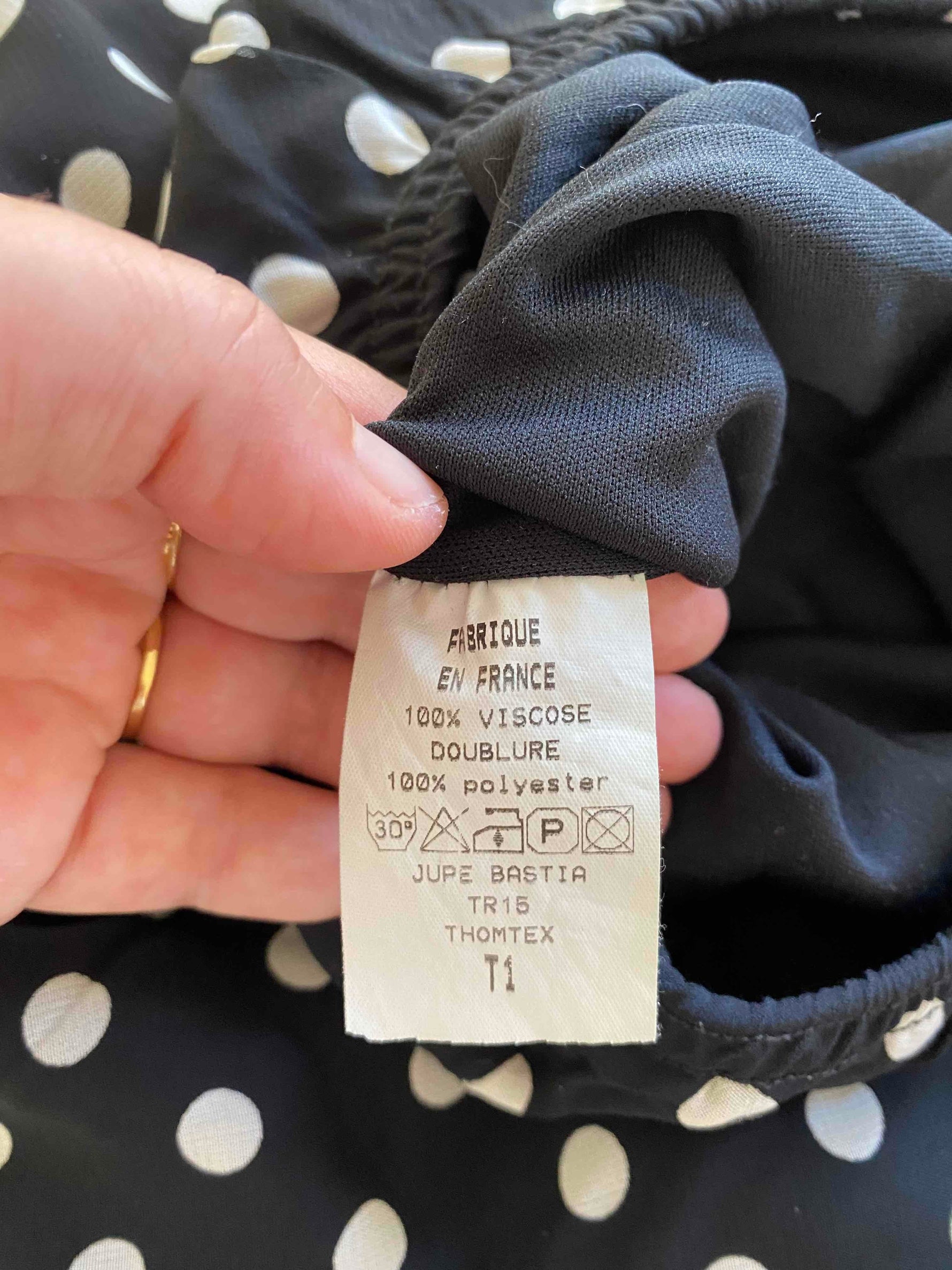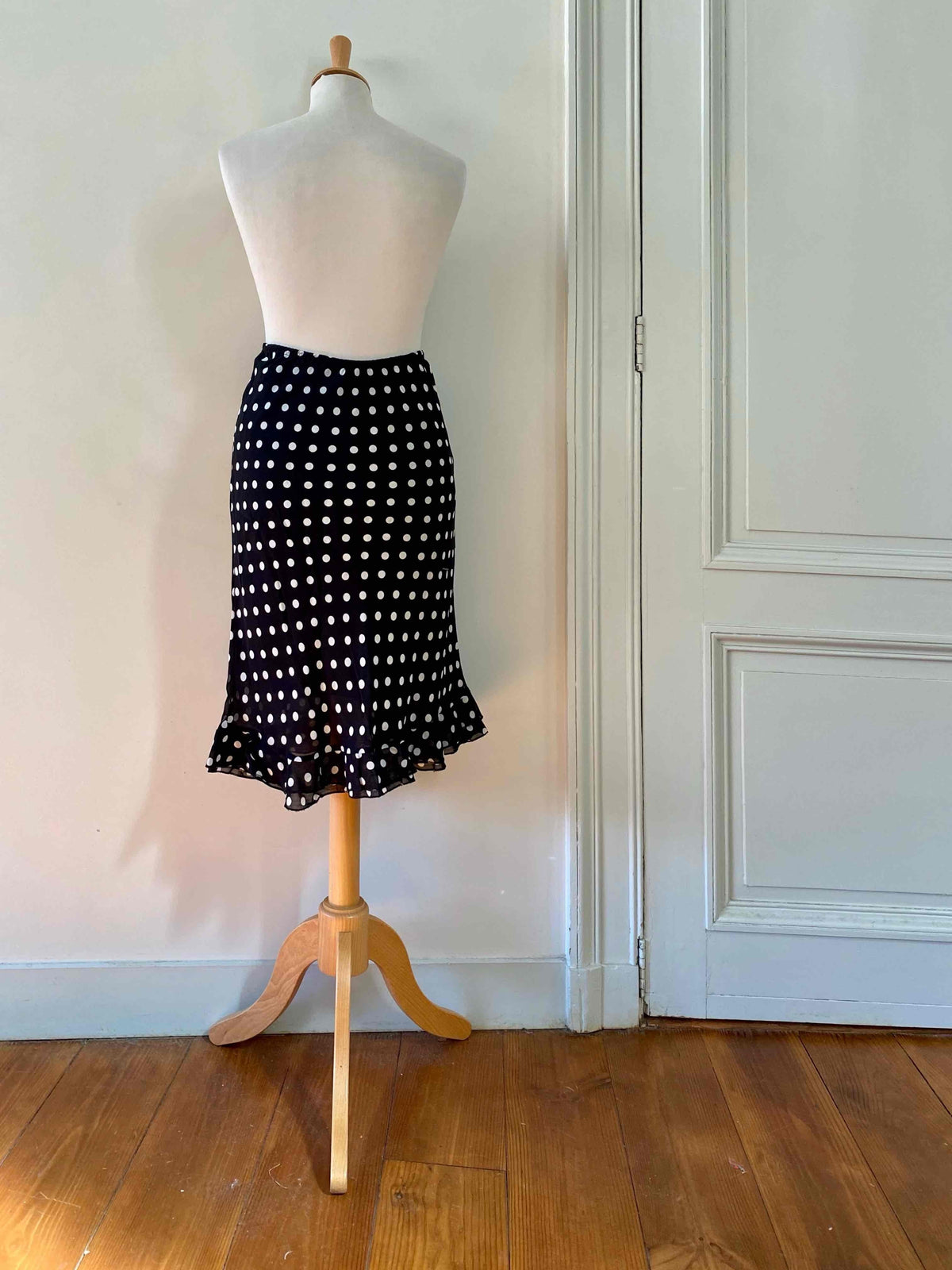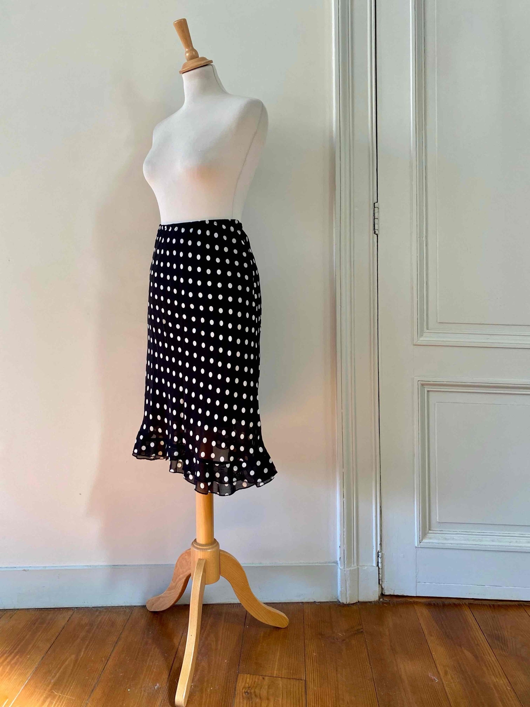 Prix unitaire parJupe midi à pois en voile viscose noir imprimée pois blancs doublée, taille élastique et forme fit and flare, fabriquée en France, taille 36 portée ici sur un mannequin T36.