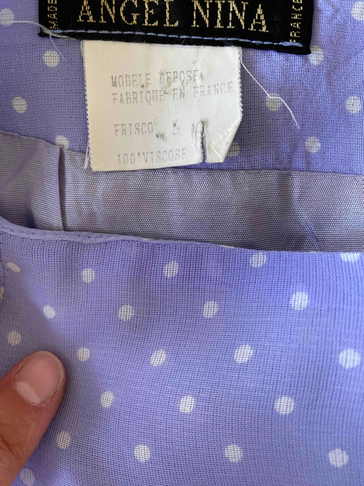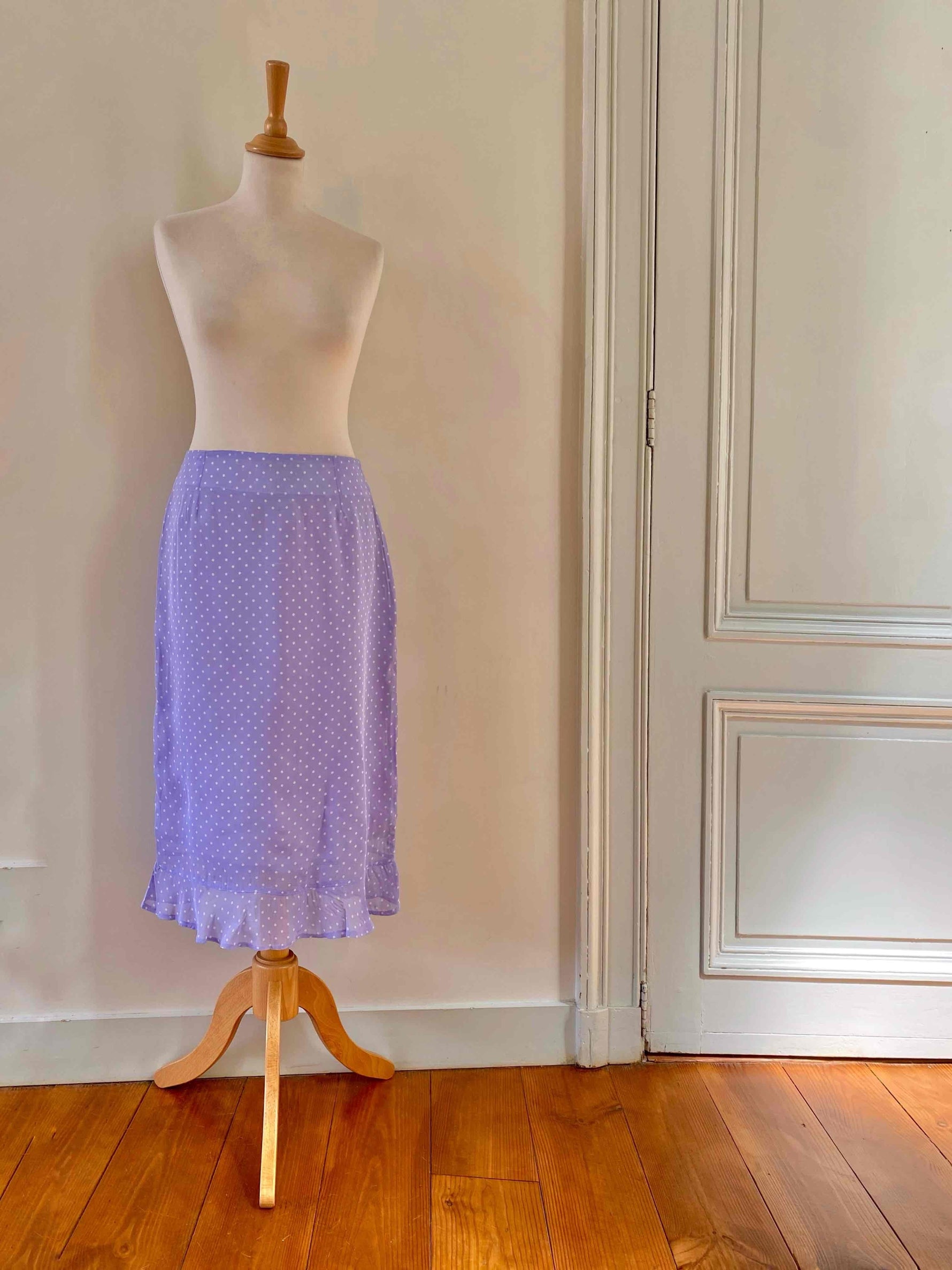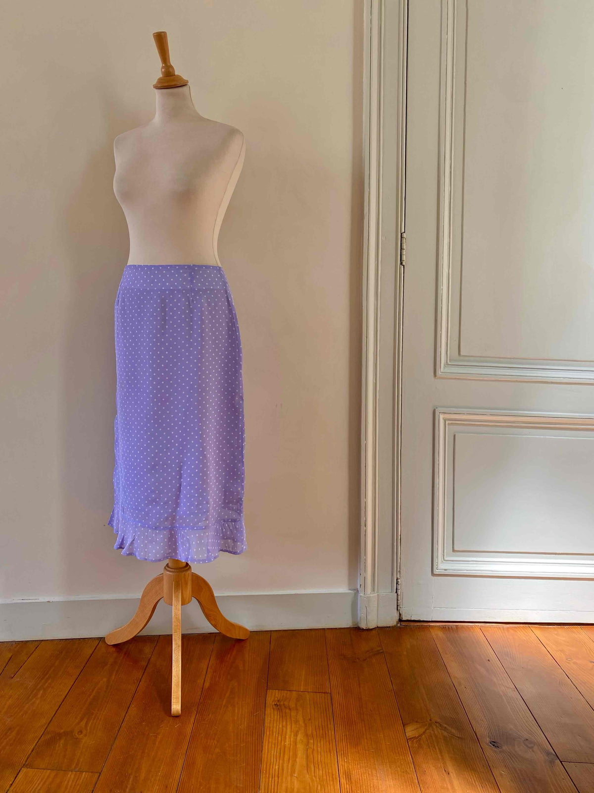 Jupe midi à pois, en voile viscose doublée lilas imprimée minis pois blancs, forme fit and flare bas volanté, fabriquée en France, peut se porter en coordonnée avec sa blouse nouée, taille 38 portée ici sur un mannequin T36, hanches 47cm.