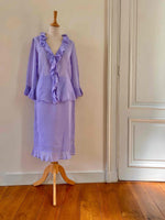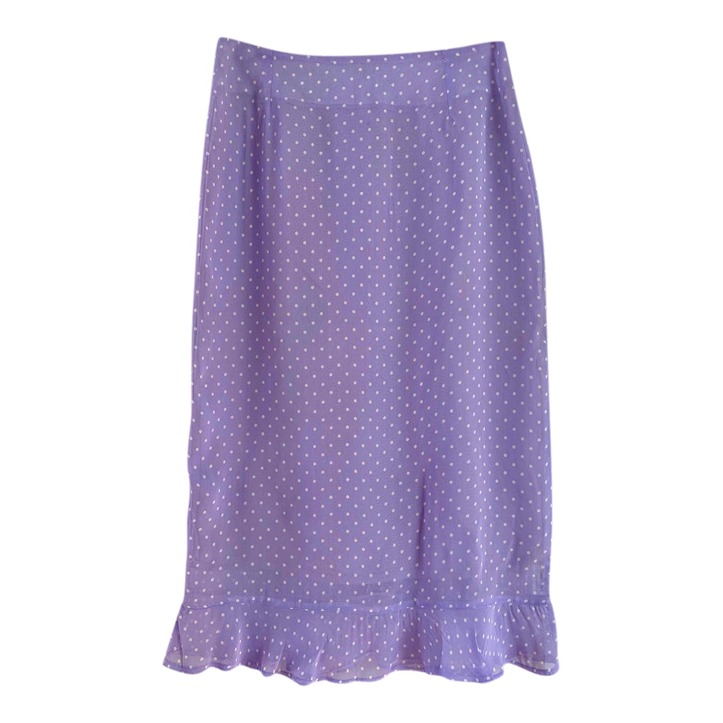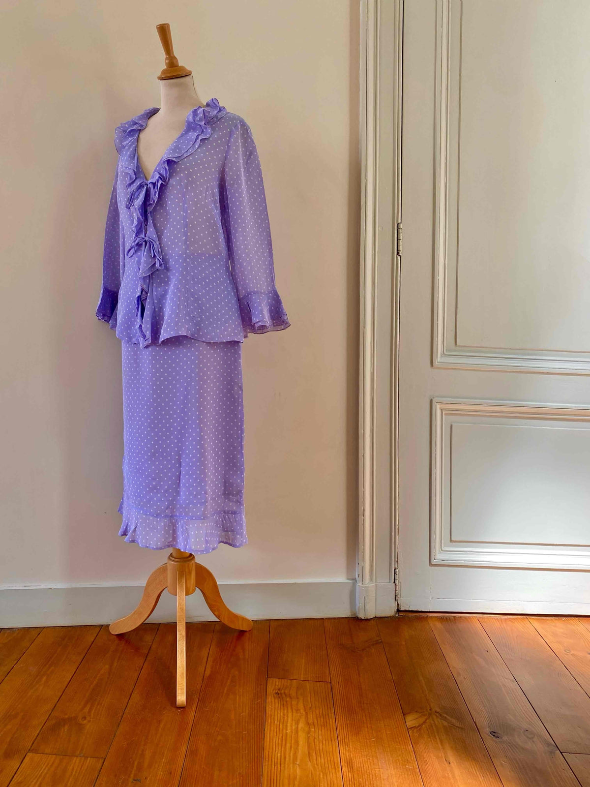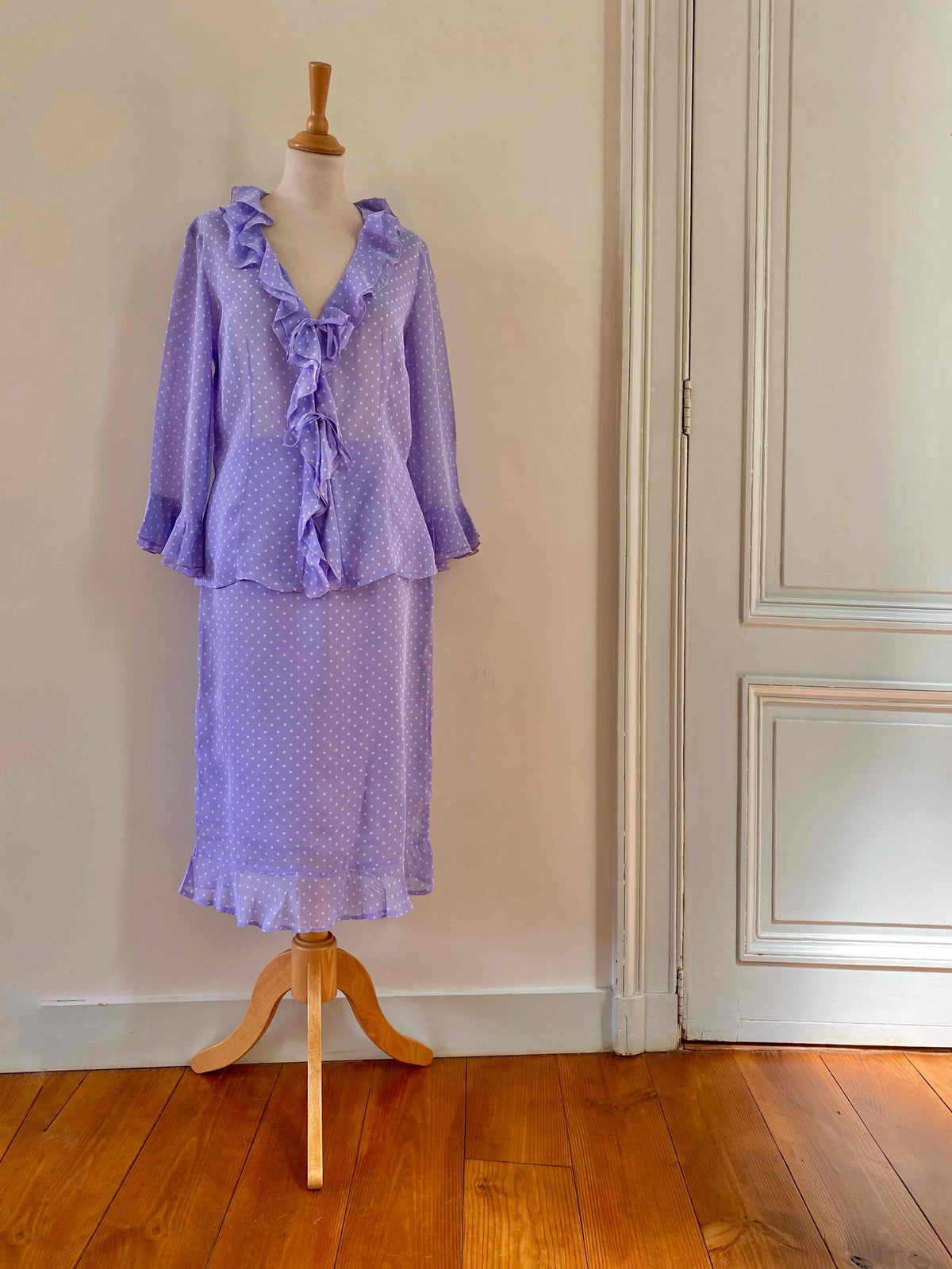 Jupe midi à pois, en voile viscose doublée lilas imprimée minis pois blancs, forme fit and flare bas volanté, fabriquée en France, peut se porter en coordonnée avec sa blouse nouée, taille 38 portée ici sur un mannequin T36, hanches 47cm.