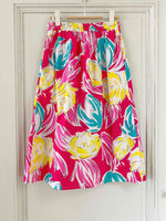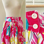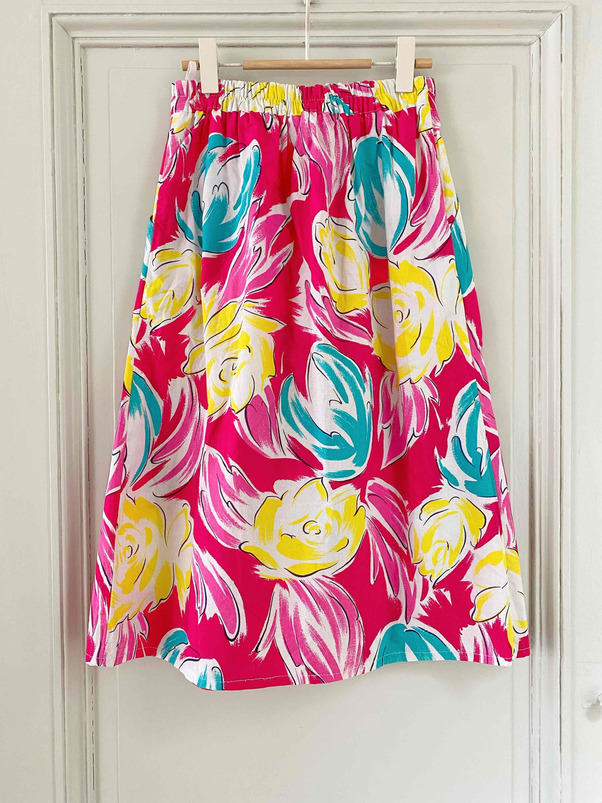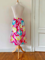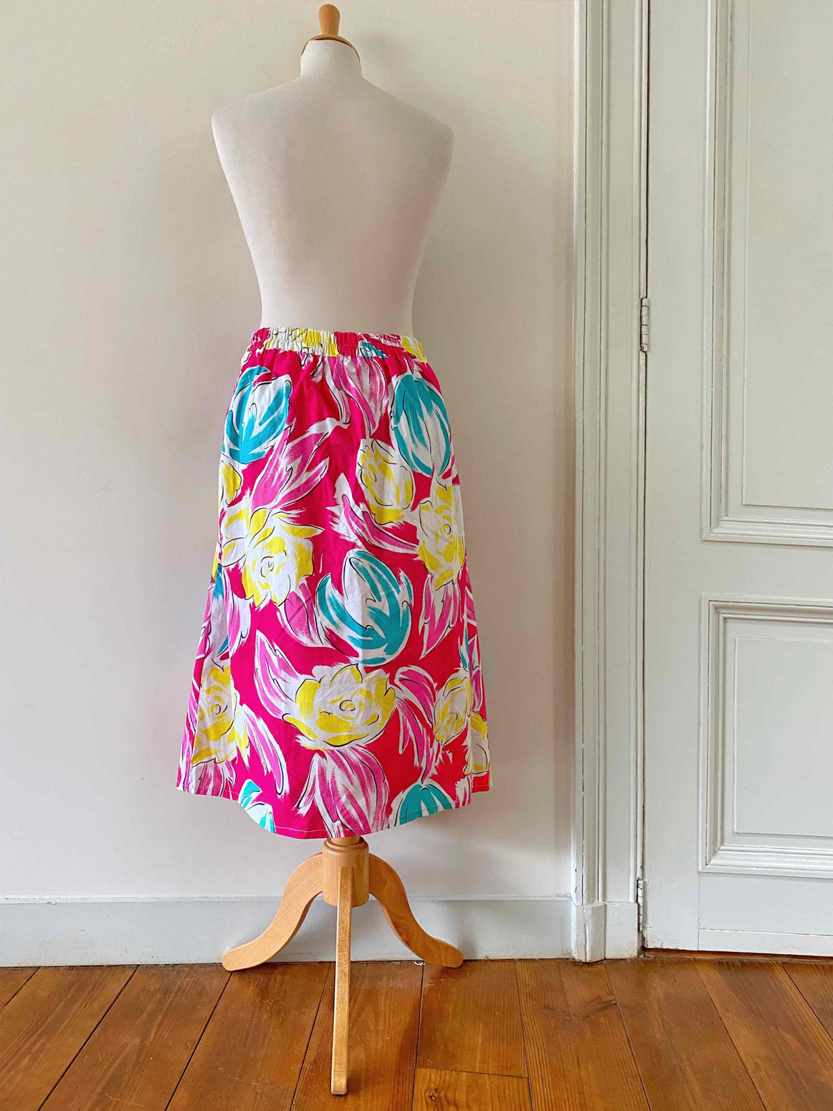 Jupe midi boutonnée en 100% coton imprimée grandes fleurs chatoyantes rose fuchsia, jaune citron, et bleu piscine, boutons fleuris blancs, taille haute élastiquée au dos, taille 36/38 portée ici sur un mannequin T36, taille 34cm élastique.