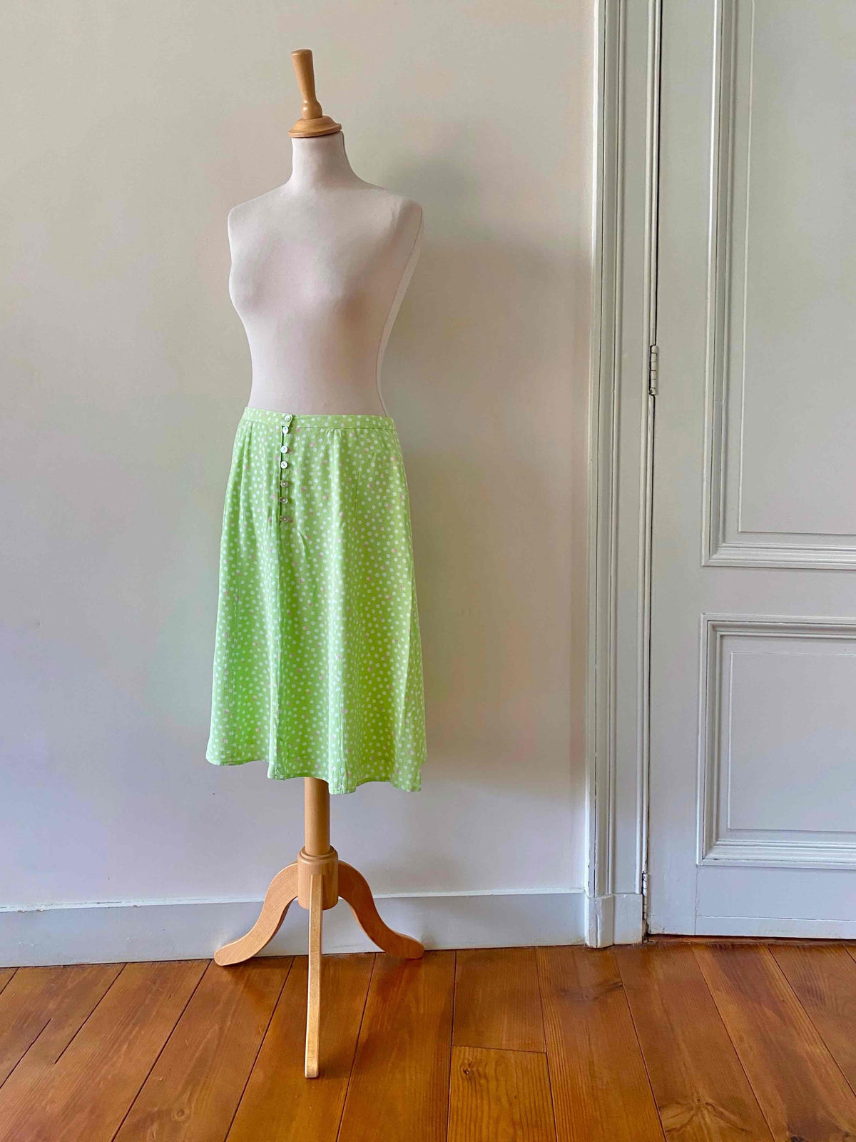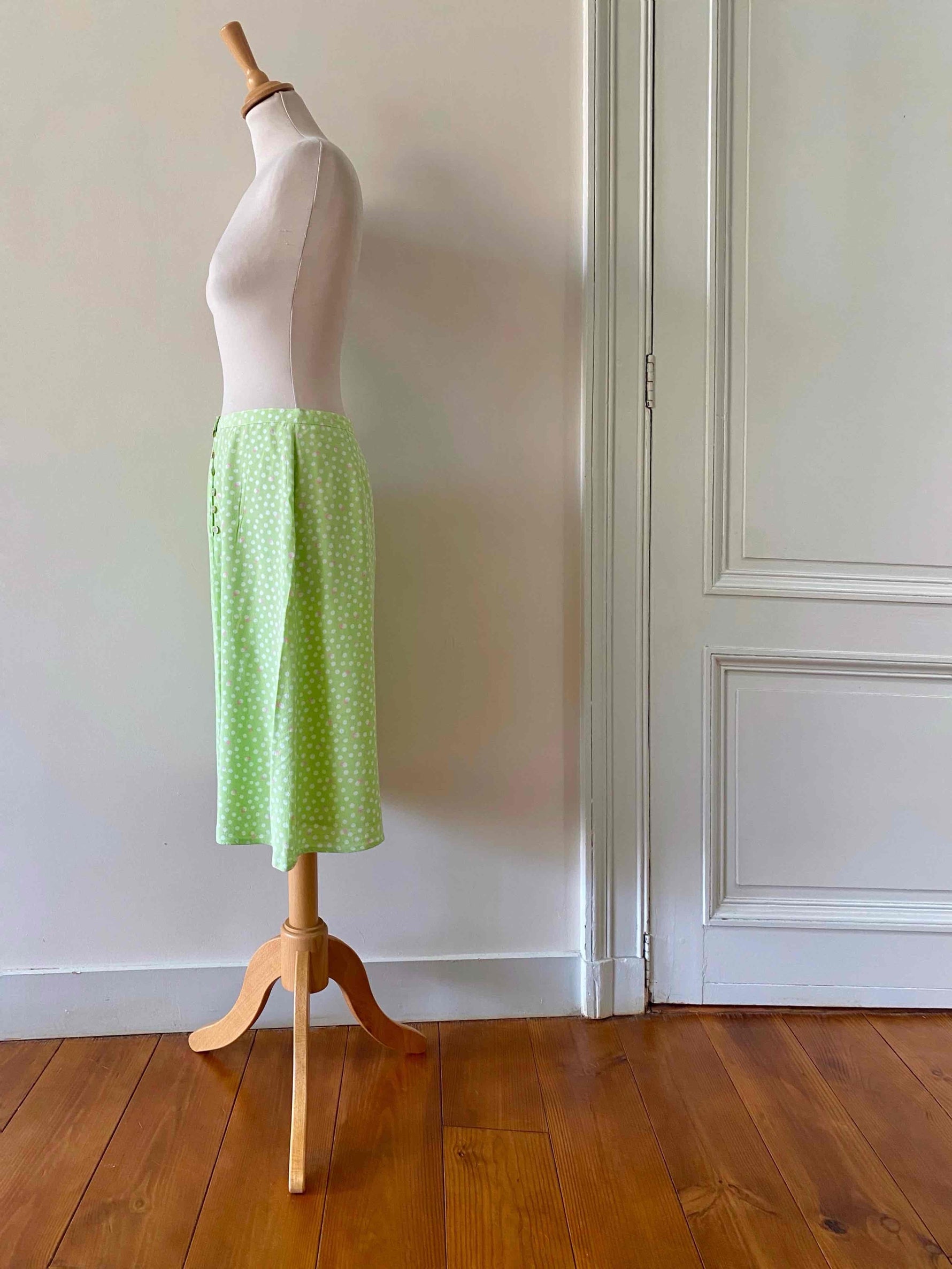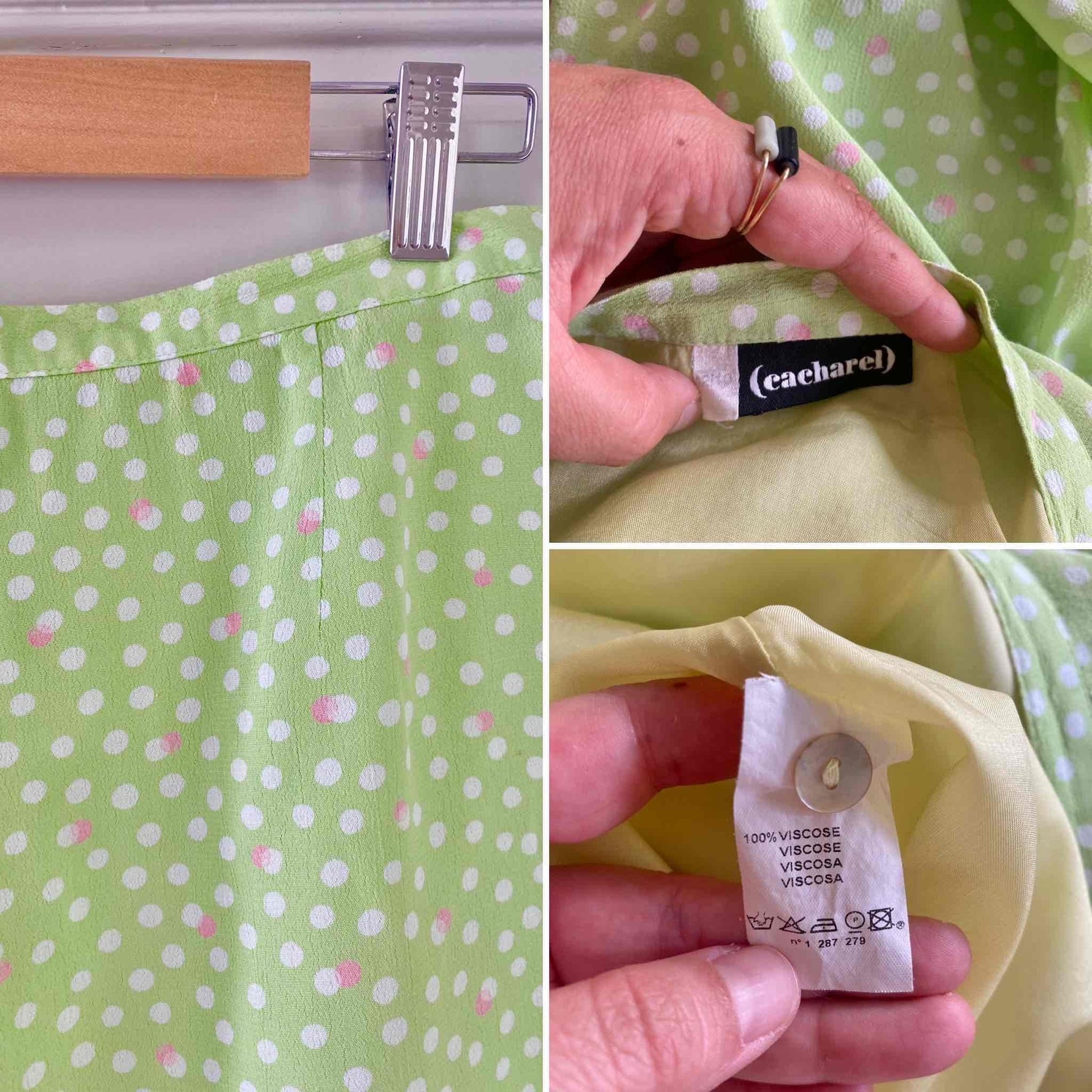 Prix unitaire parJupe midi Cacharel en viscose vert pistache imprimée double pois blancs et roses, boutons nacres à passants et à porter devant ou dos, taille 38 actuelle portée ici sur un mannequin T36.