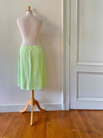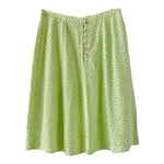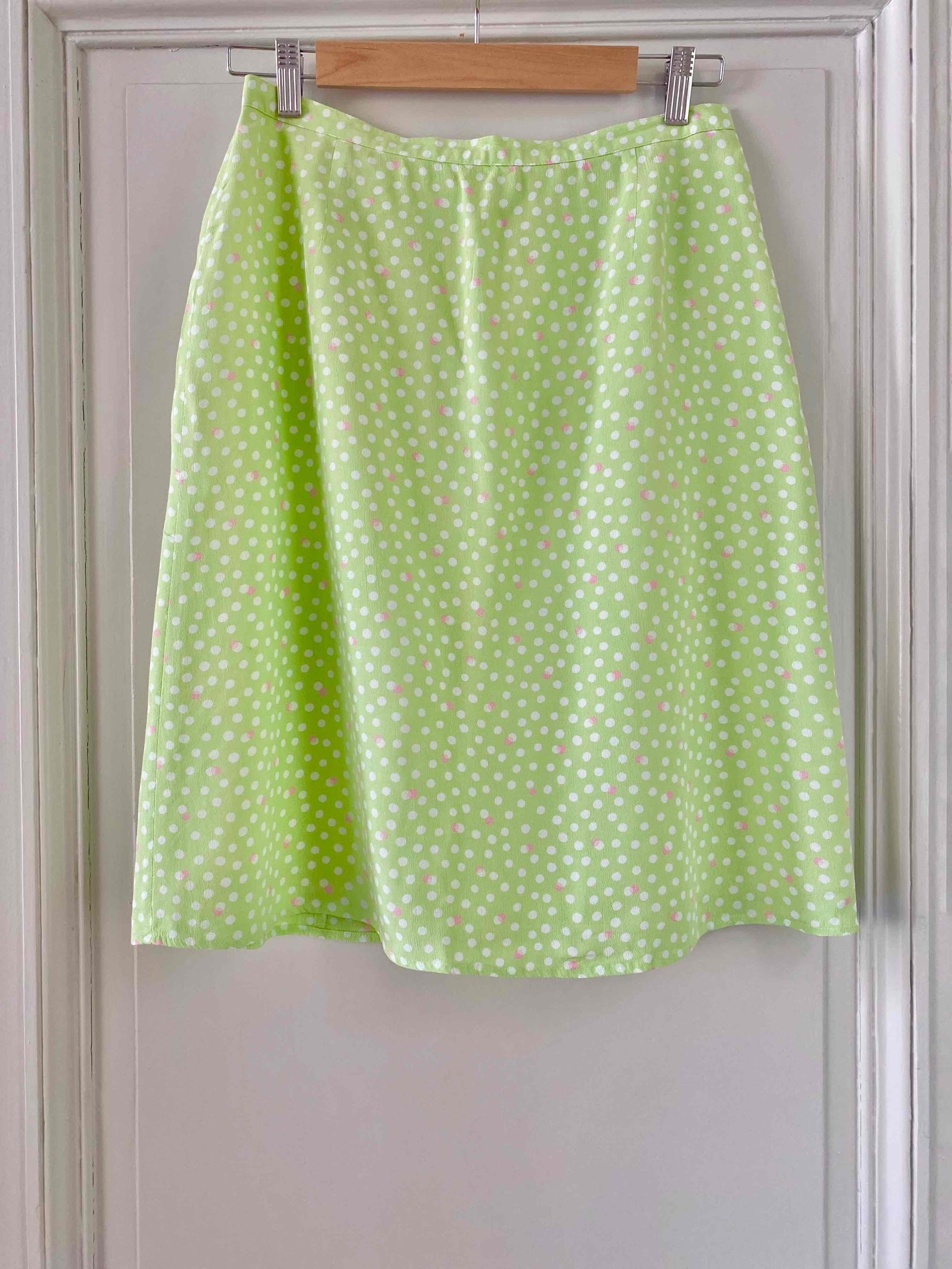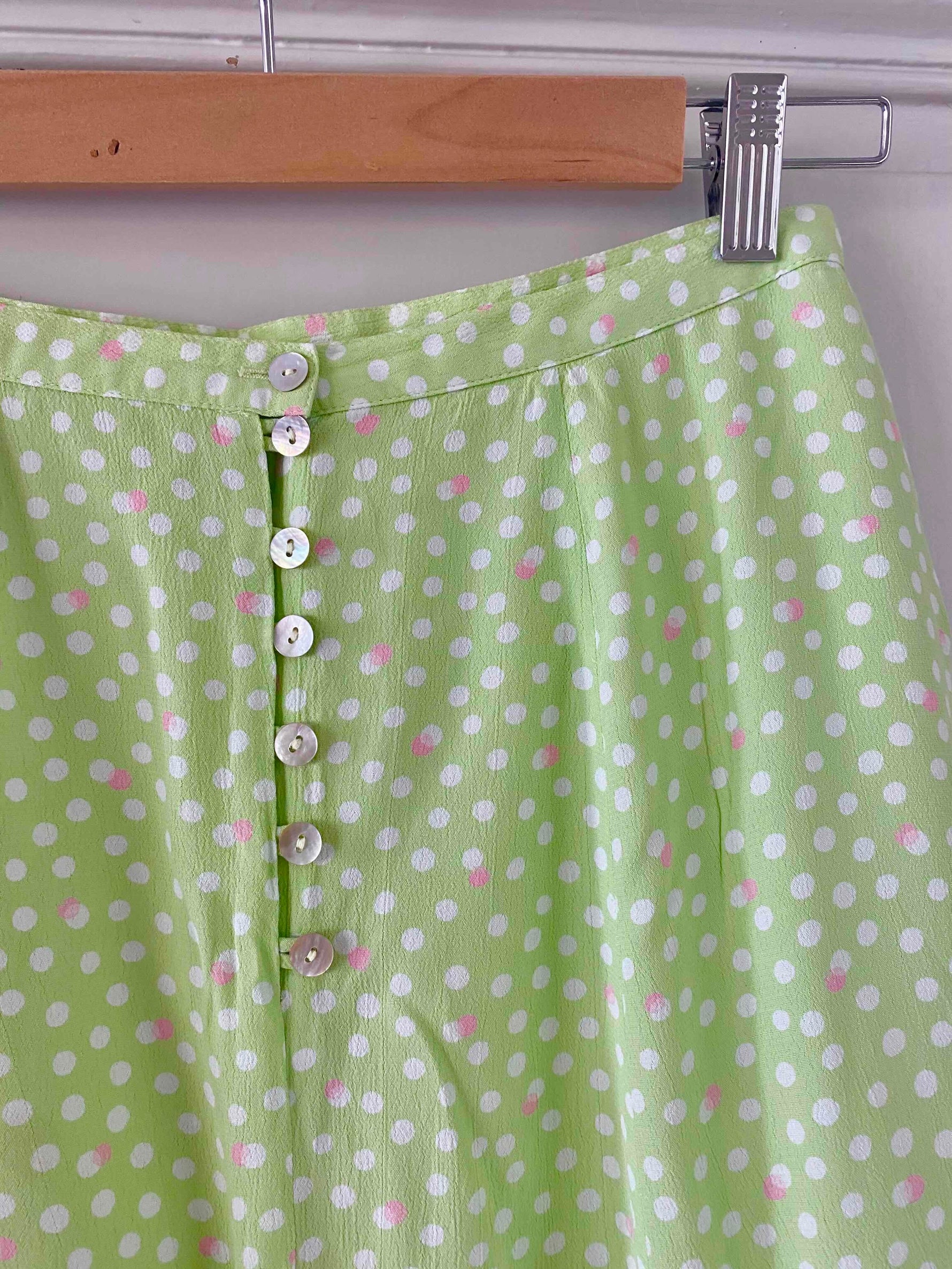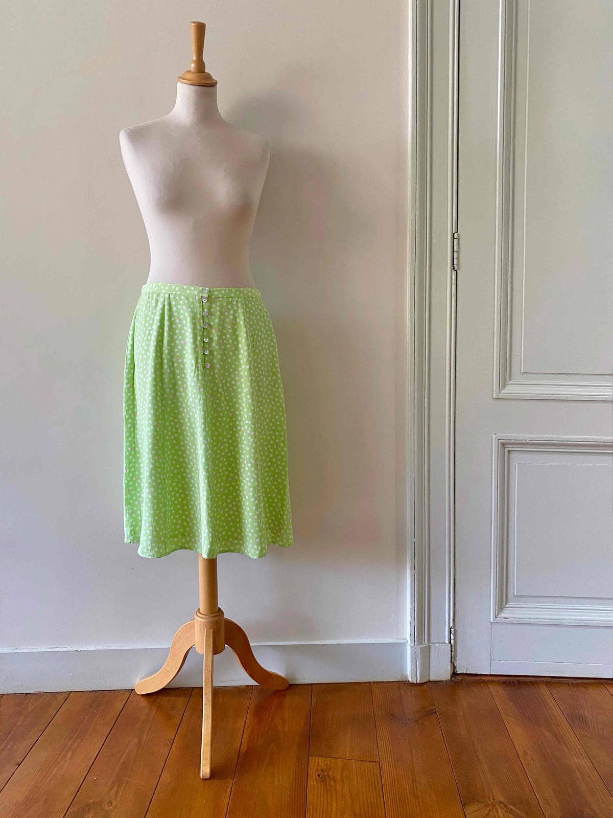Prix unitaire parJupe midi Cacharel en viscose vert pistache imprimée double pois blancs et roses, boutons nacres à passants et à porter devant ou dos, taille 38 actuelle portée ici sur un mannequin T36.