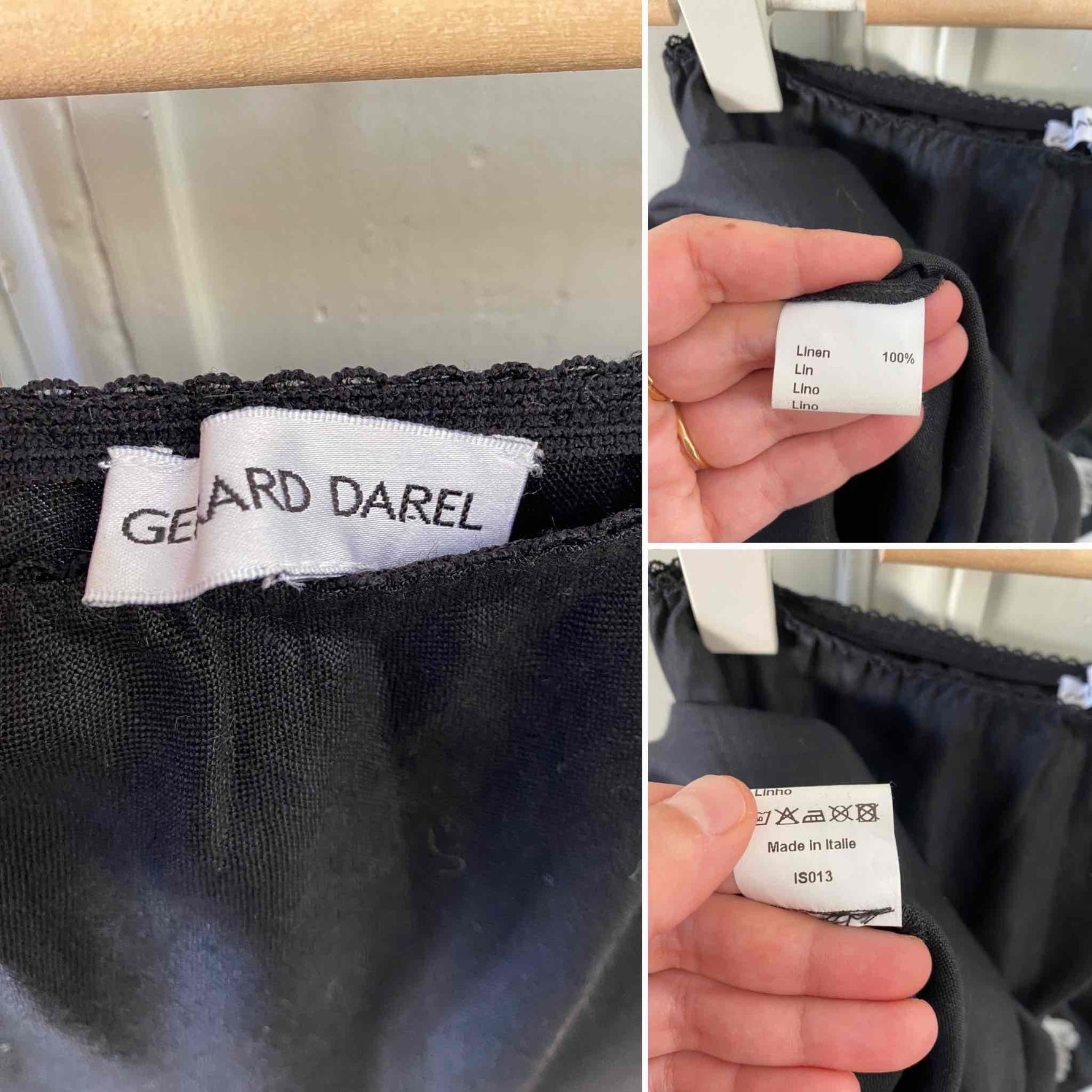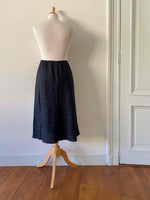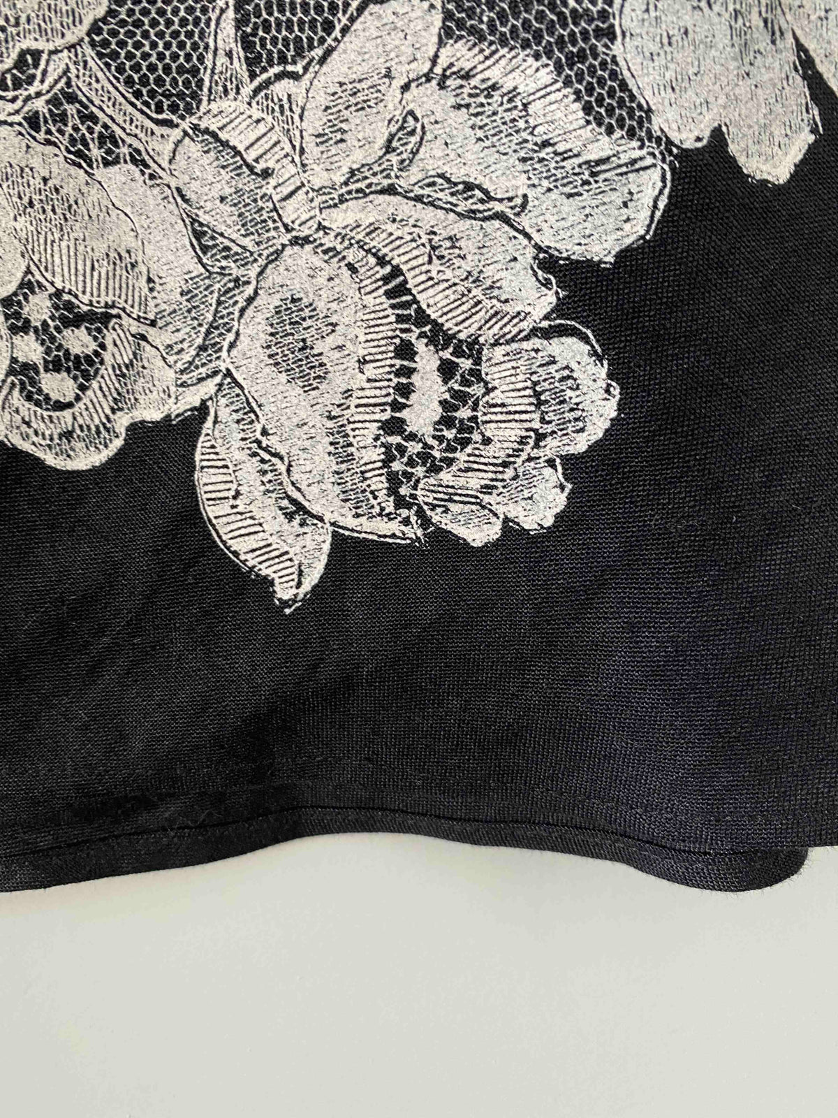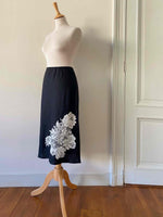 Prix unitaire parJupe midi en lin noire, floquée de dentelle blanche imprimée, taille élastique, forme fit and flare, fabriquée en Italie, y2k, taille 38 portée ici sur un mannequin T36.