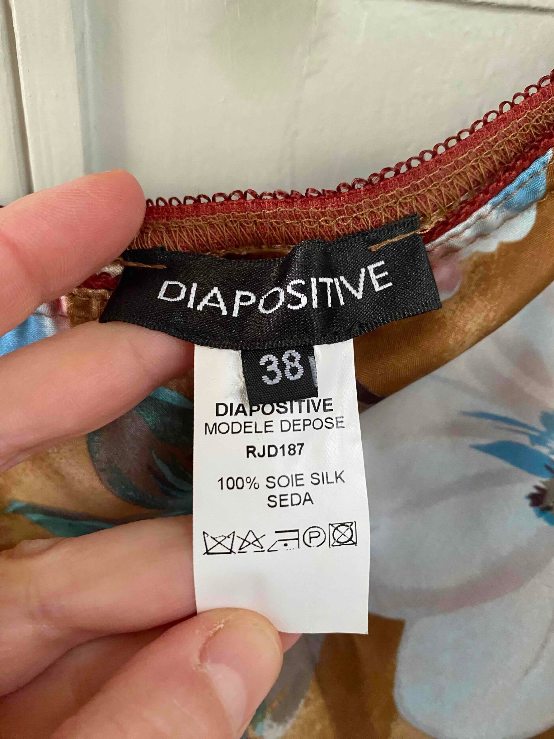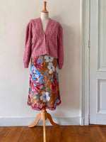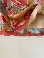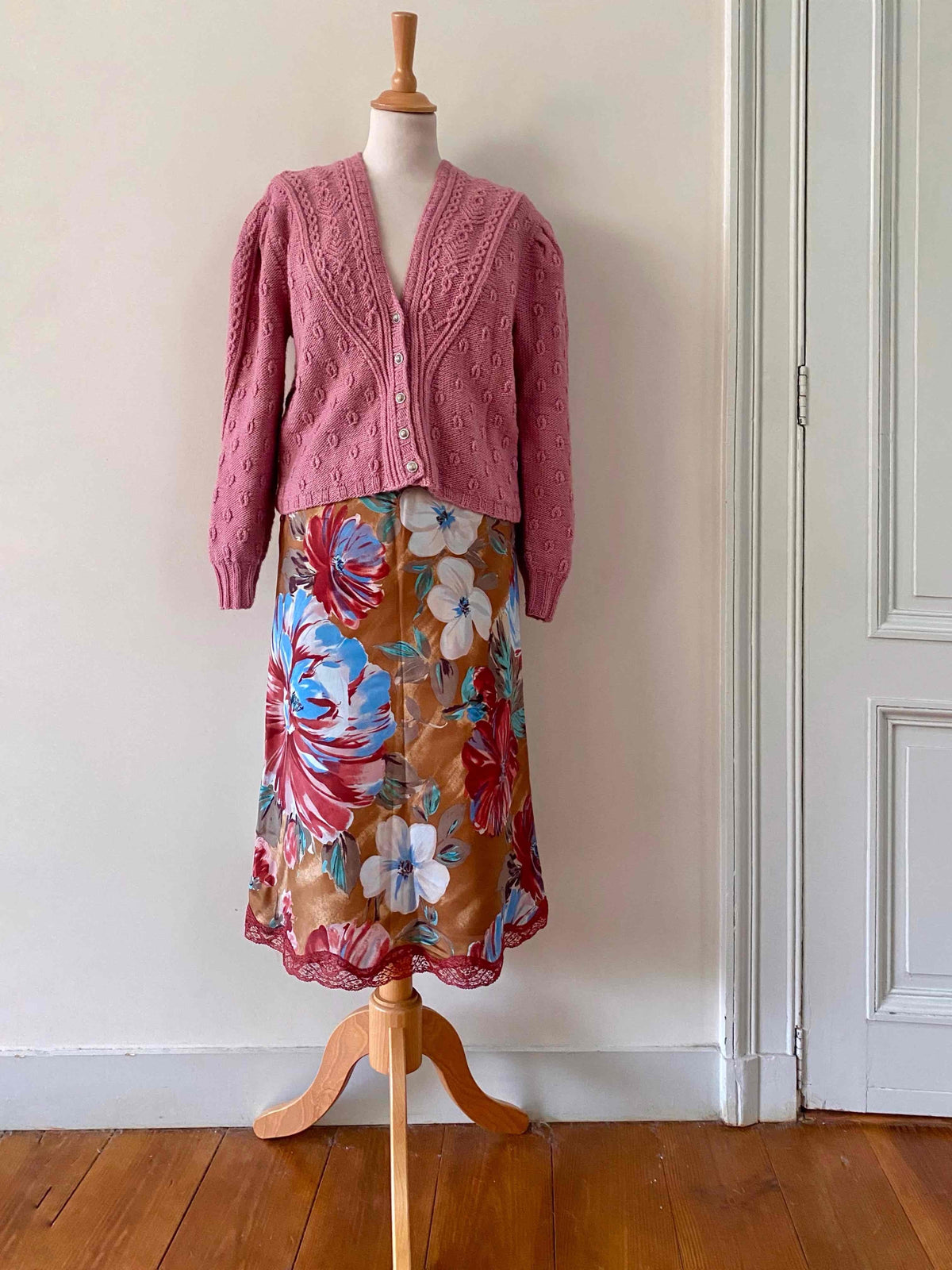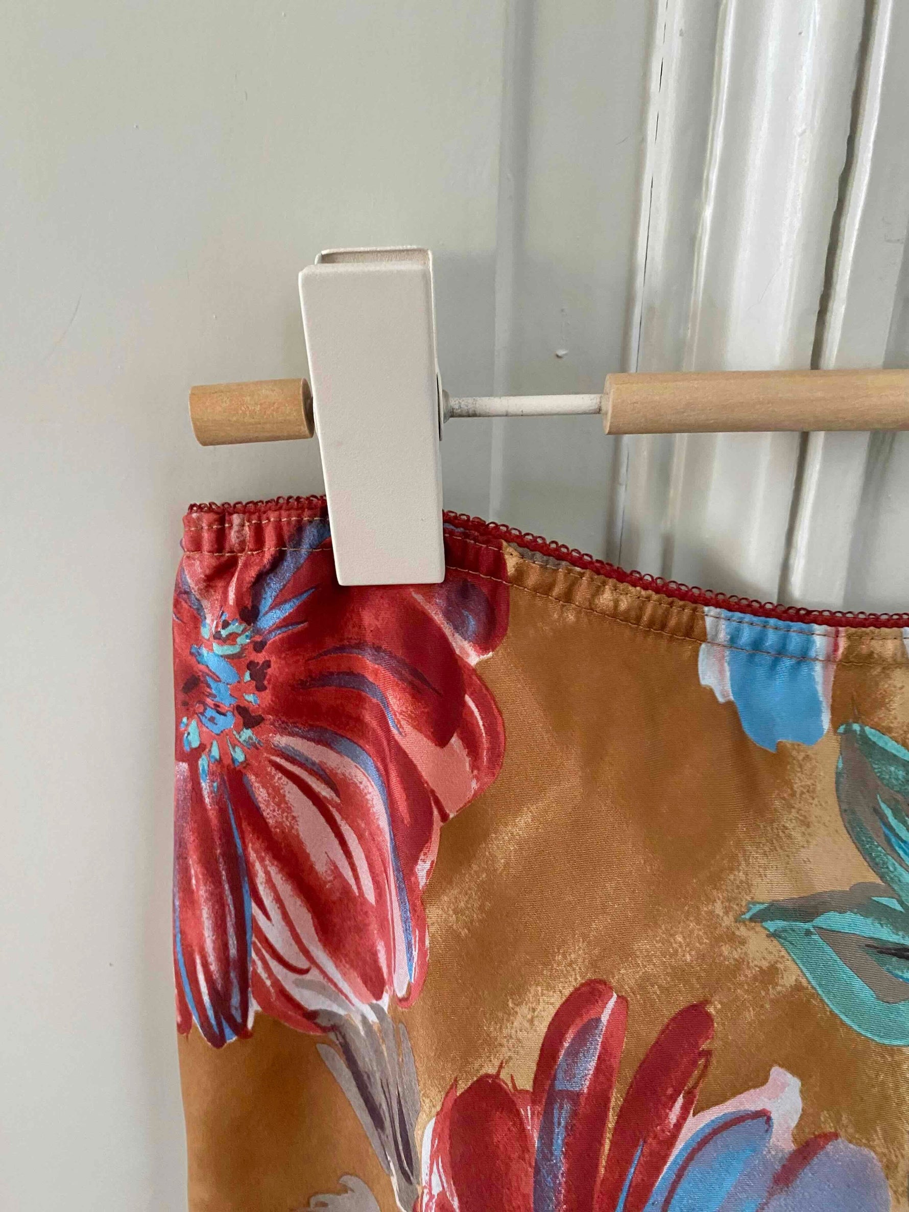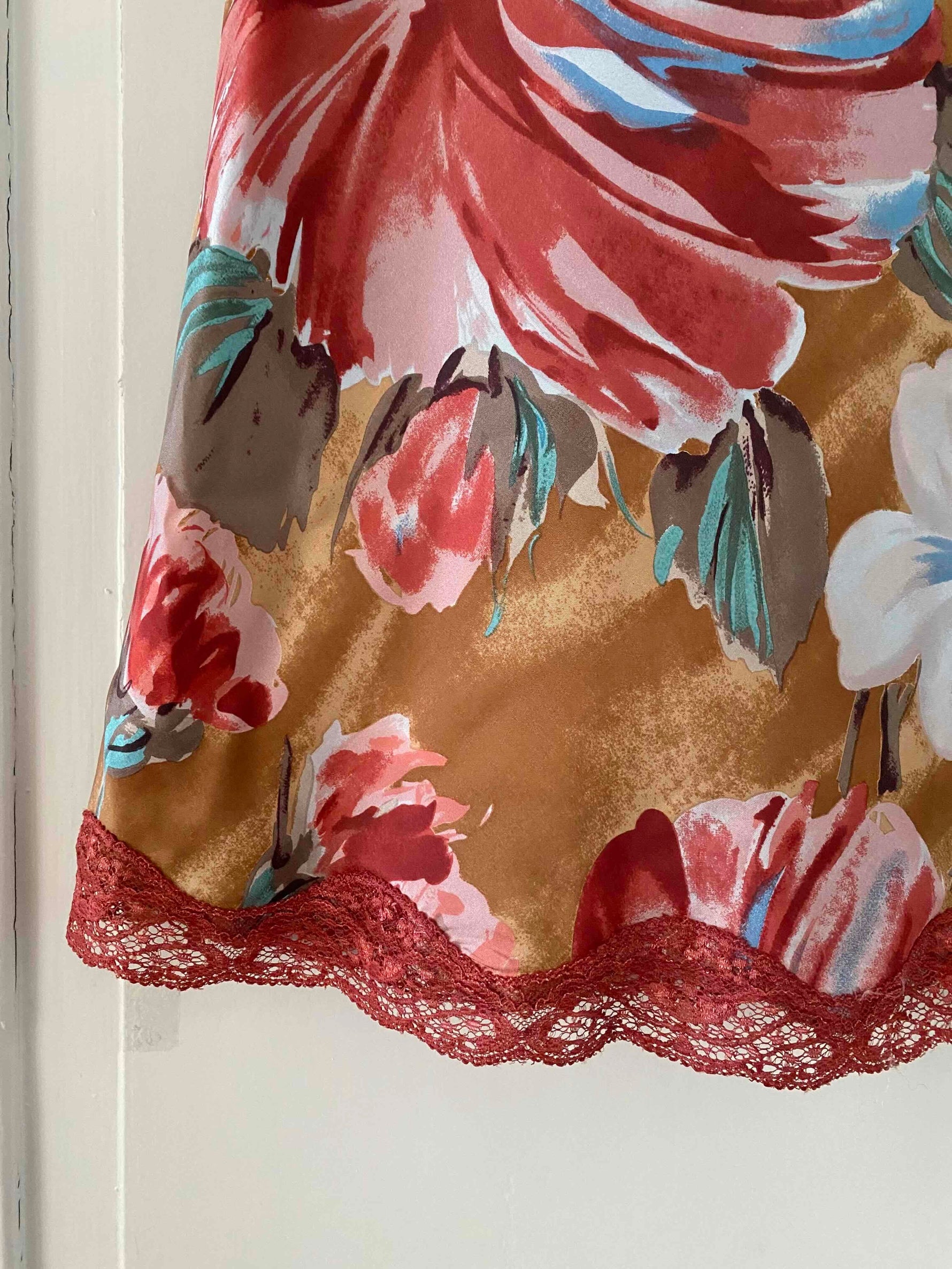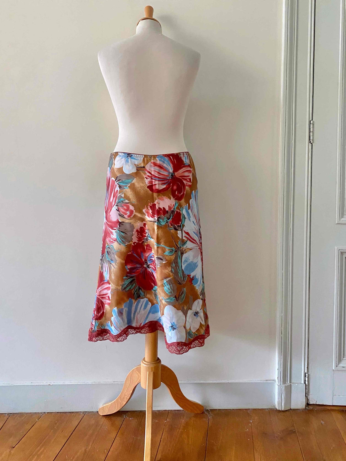 Jupe midi en soie satin, imprimée fleurs bois de rose, bleues, vertes et blanches sur fond caramel, bordure bas en dentelle, doublure voile écru, taille élastique, forme fit and flare, y2k, taille 38 portée ici sur un mannequin T36.