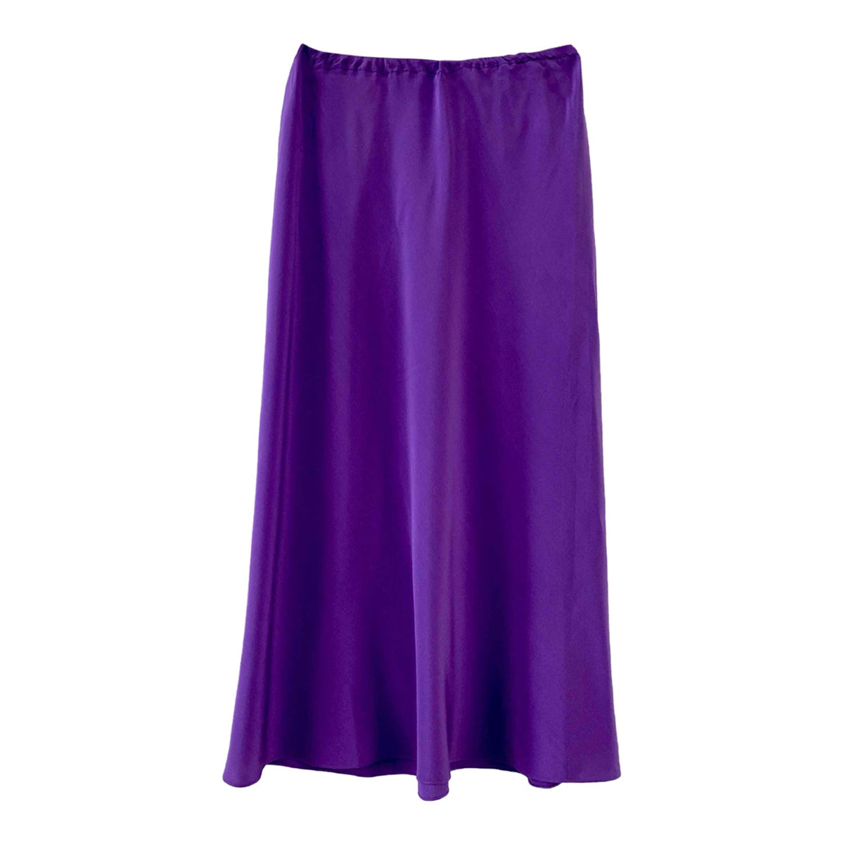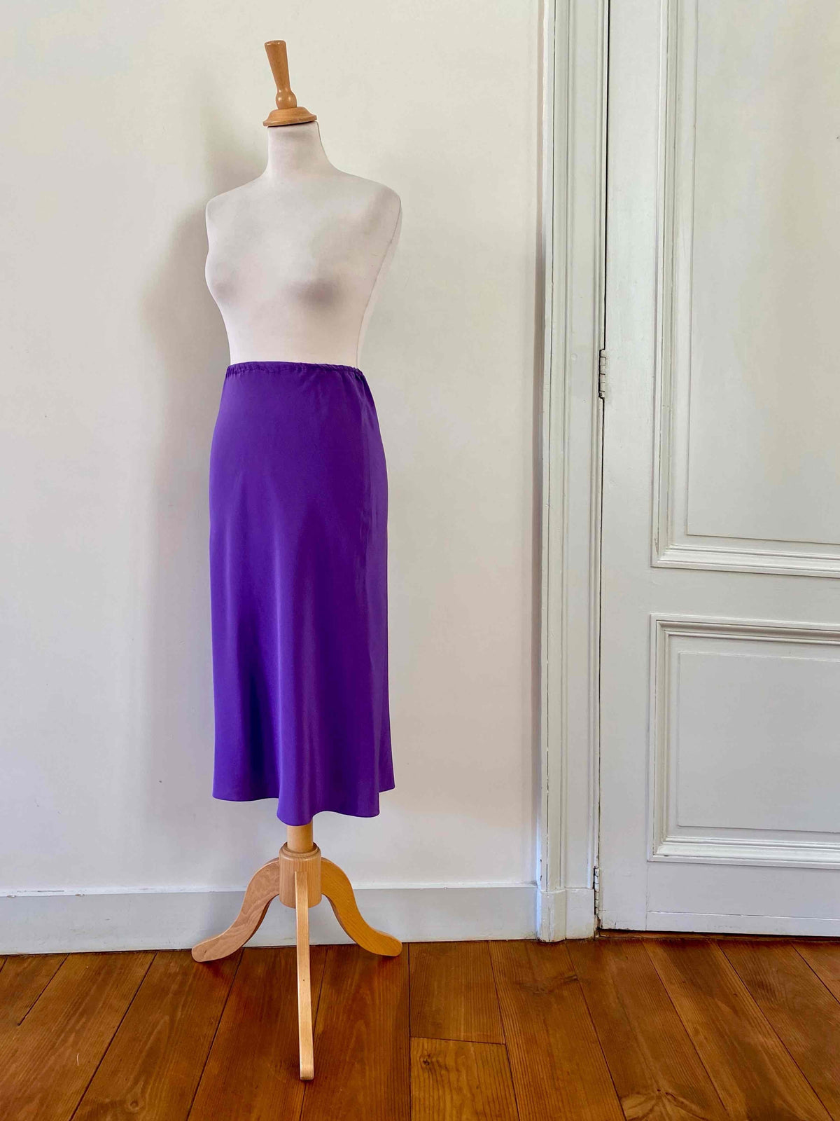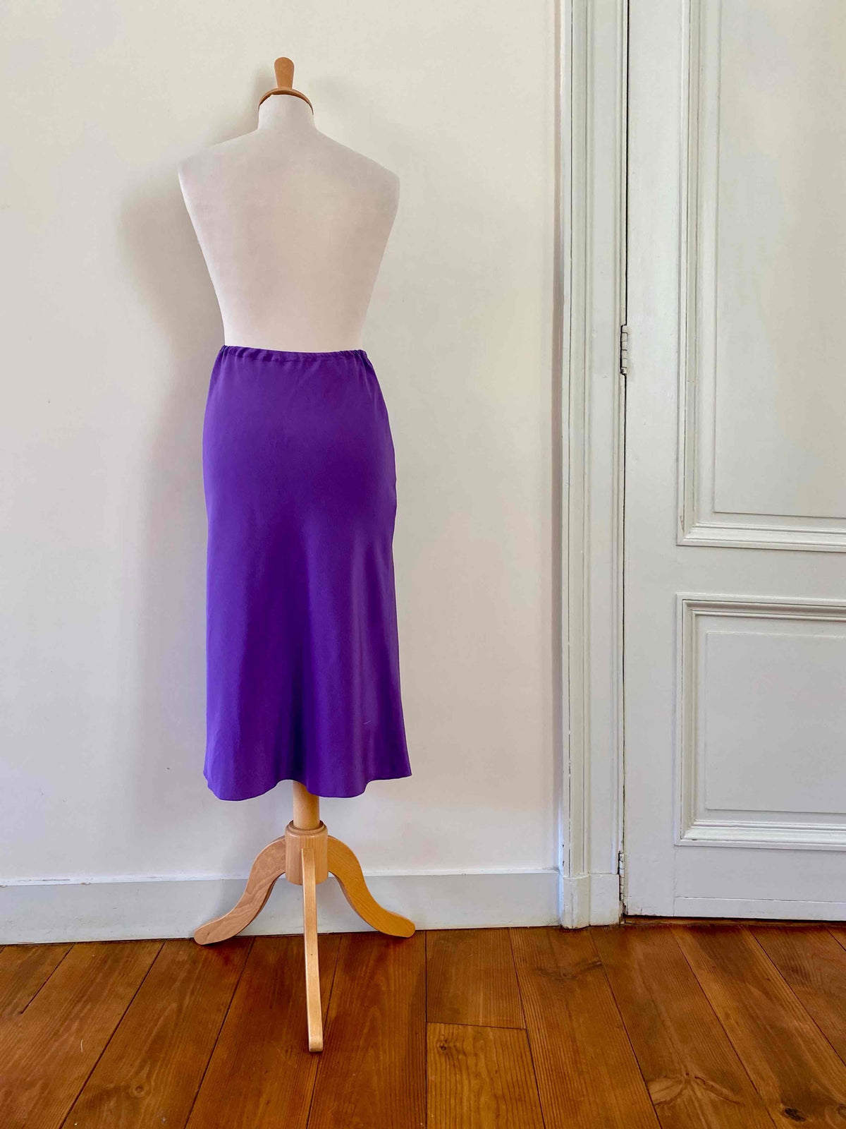 Prix unitaire parJupe midi en soie, ultre violet, taille élastique, longueur midi et forme fit and flare en biais, faite mains dans un atelier italien, taille 34 et 36 portée ici sur un mannequin T36.