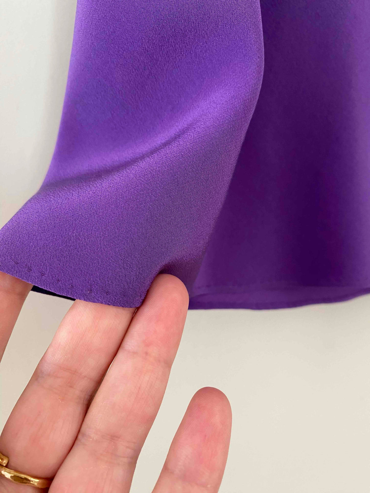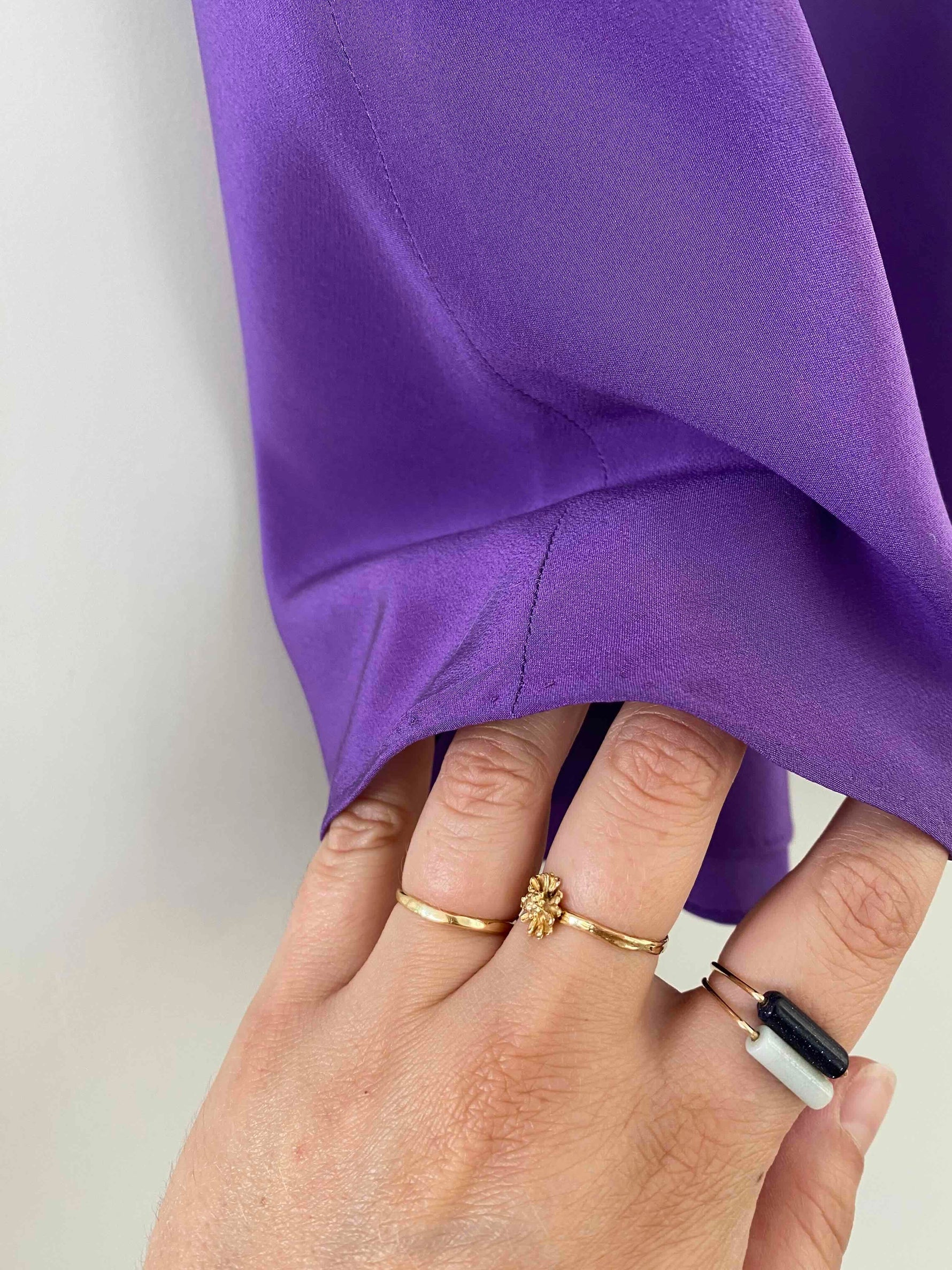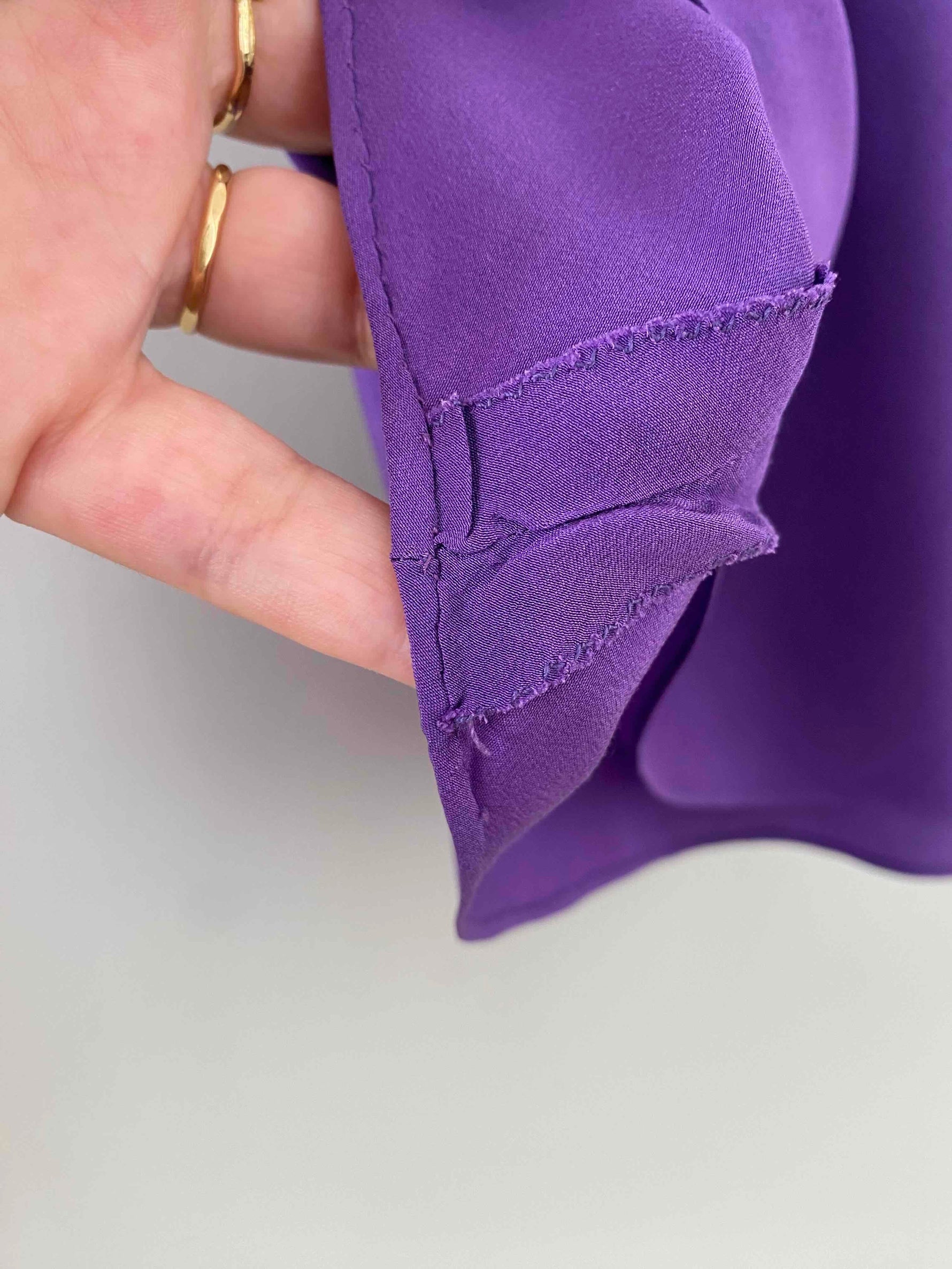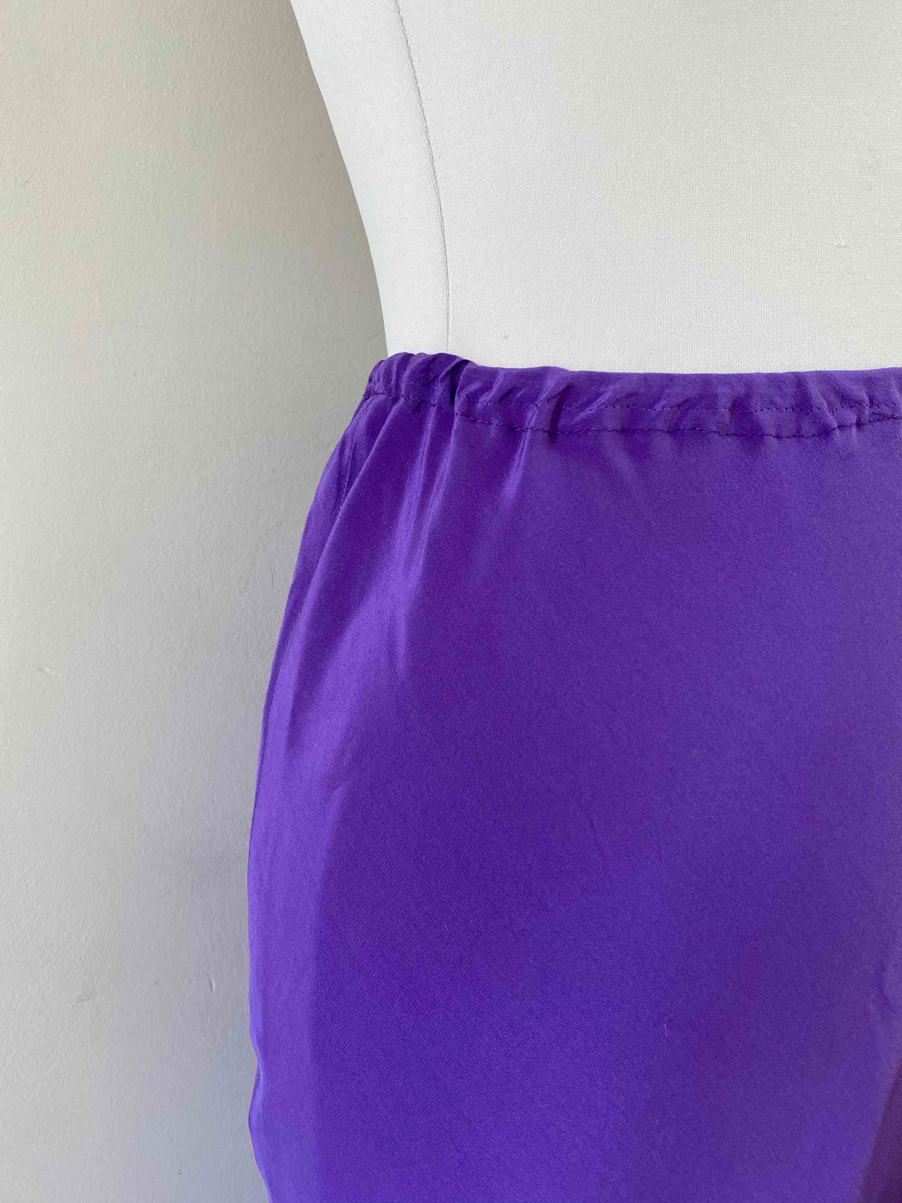Prix unitaire parJupe midi en soie, ultre violet, taille élastique, longueur midi et forme fit and flare en biais, faite mains dans un atelier italien, taille 34 et 36 portée ici sur un mannequin T36.