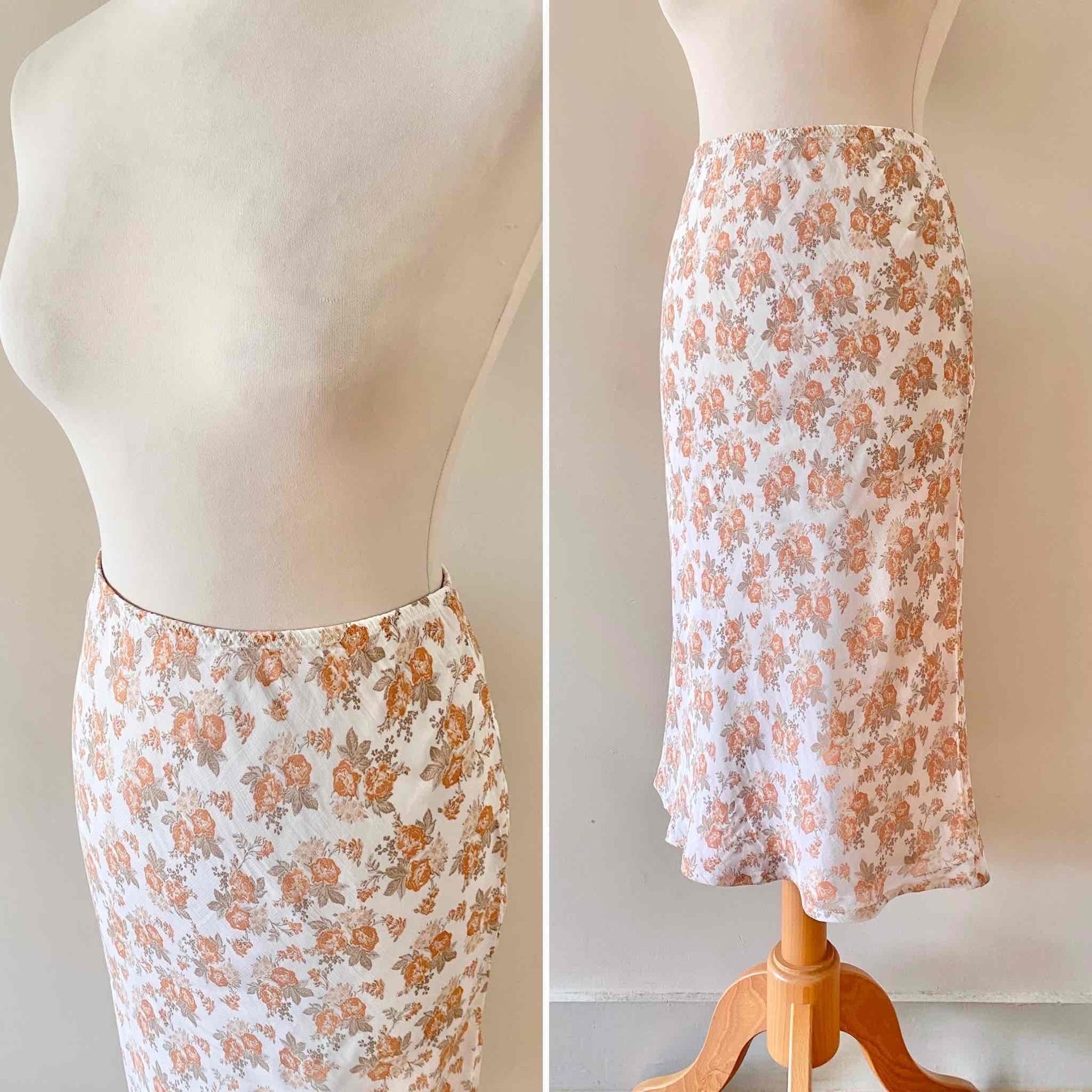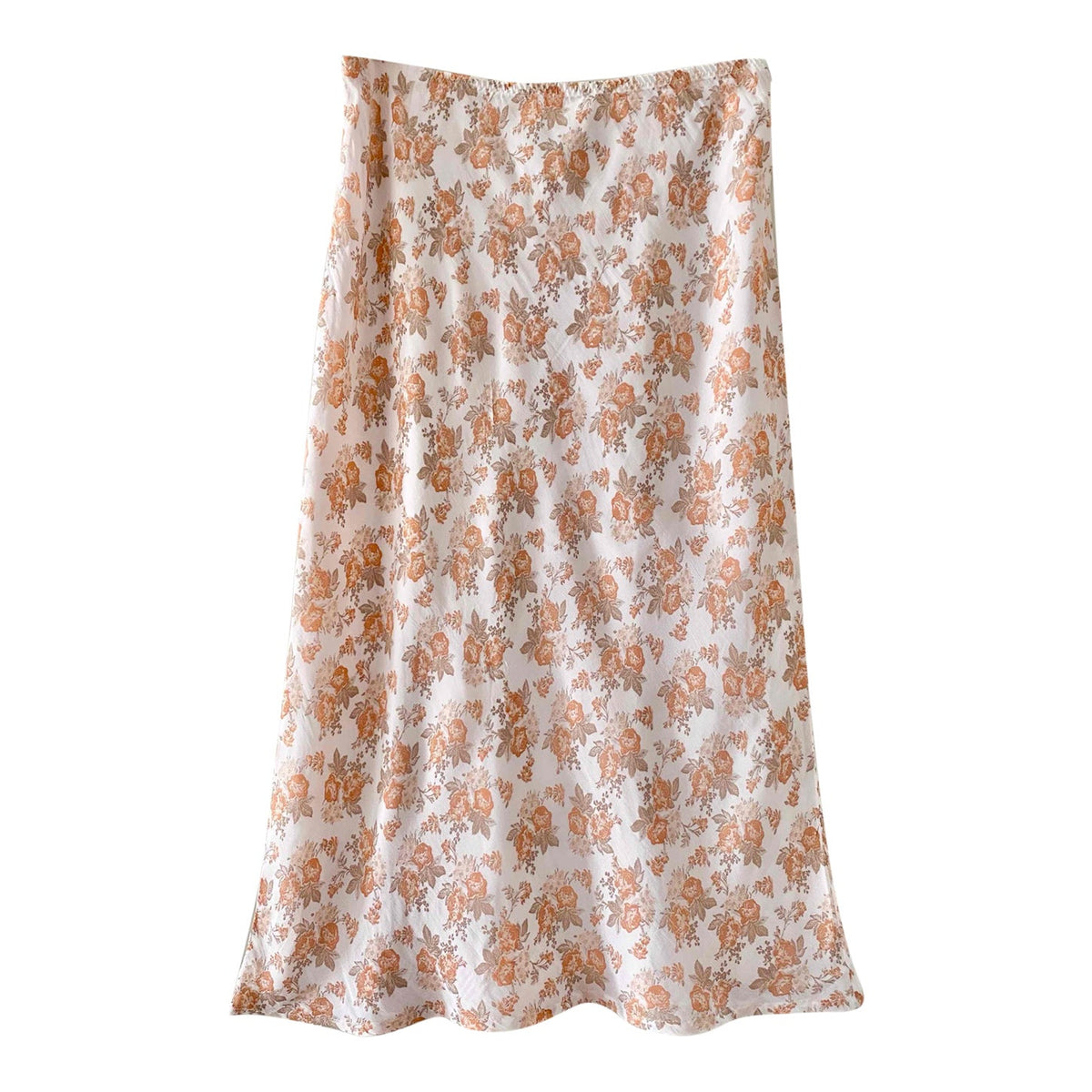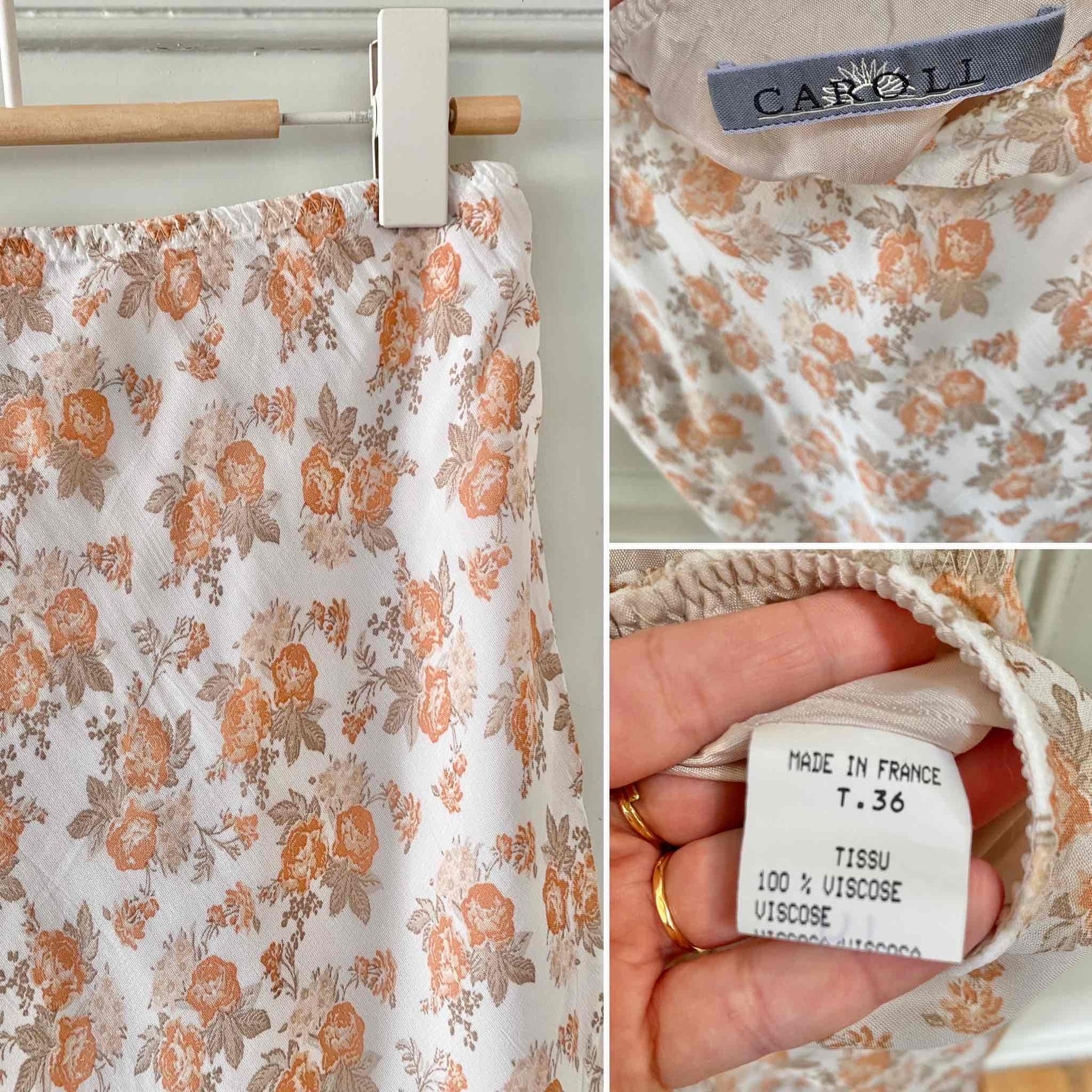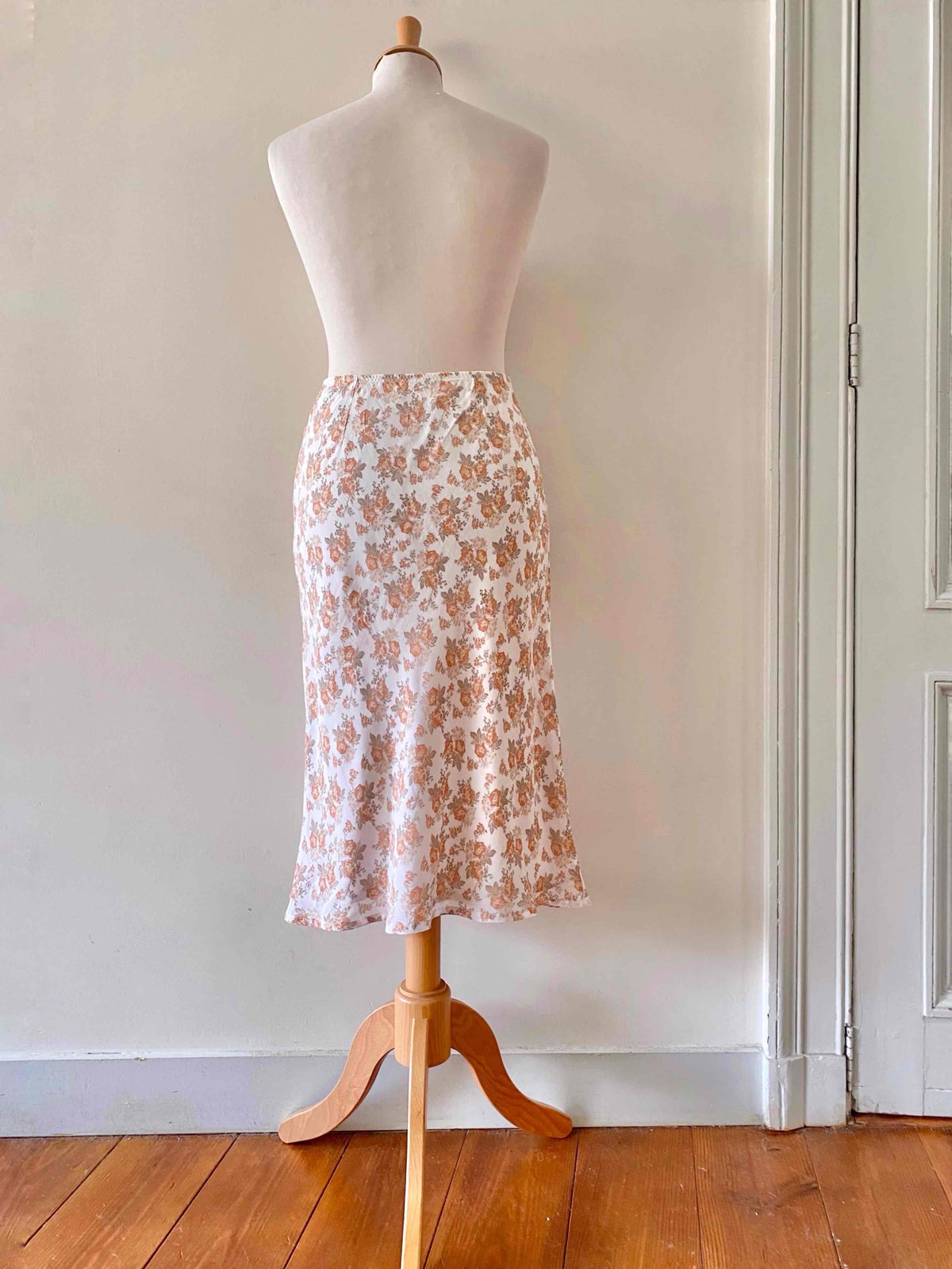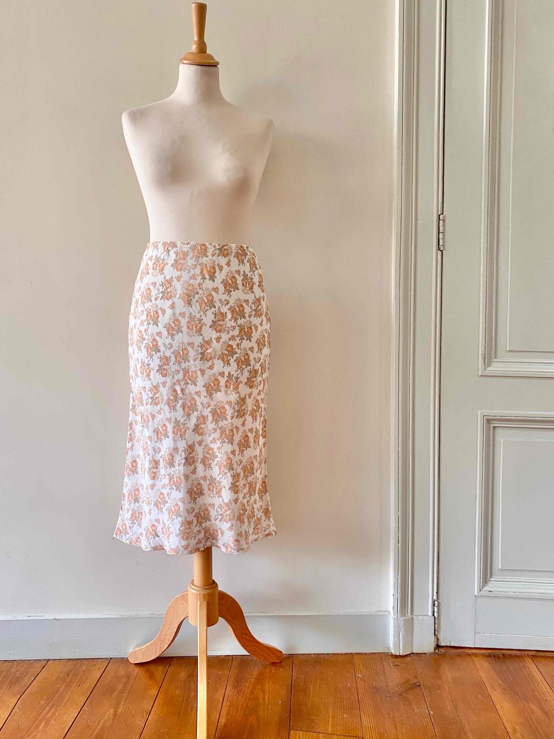 Prix unitaire parJupe midi fleurie en voile viscose blanc écru imprimée fleurs roses et orangées, taille élastique, forme fit and flare en biais, fabriquée en France, taille 36 portée ici sur un mannequin T36.