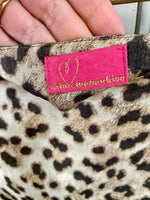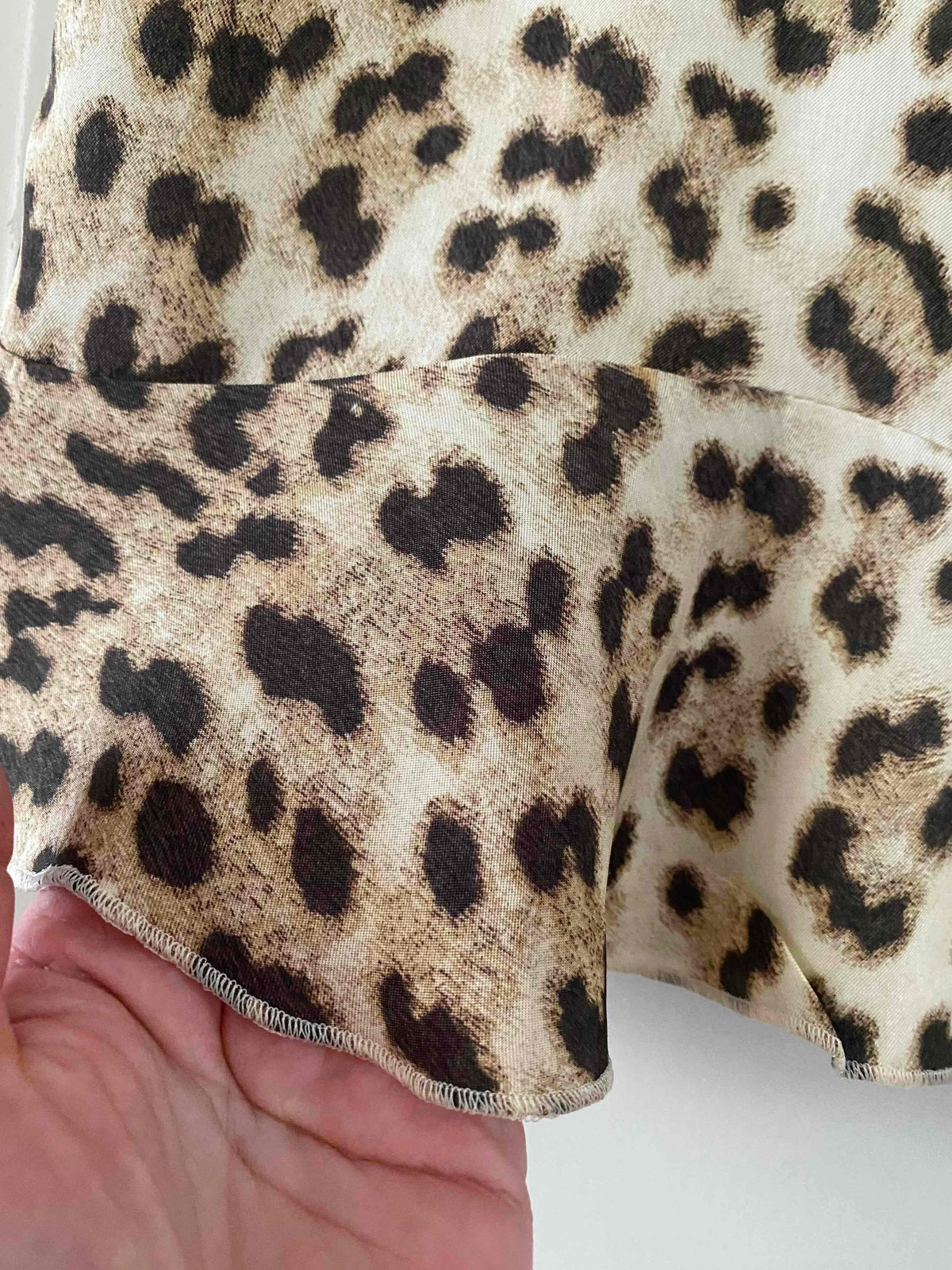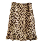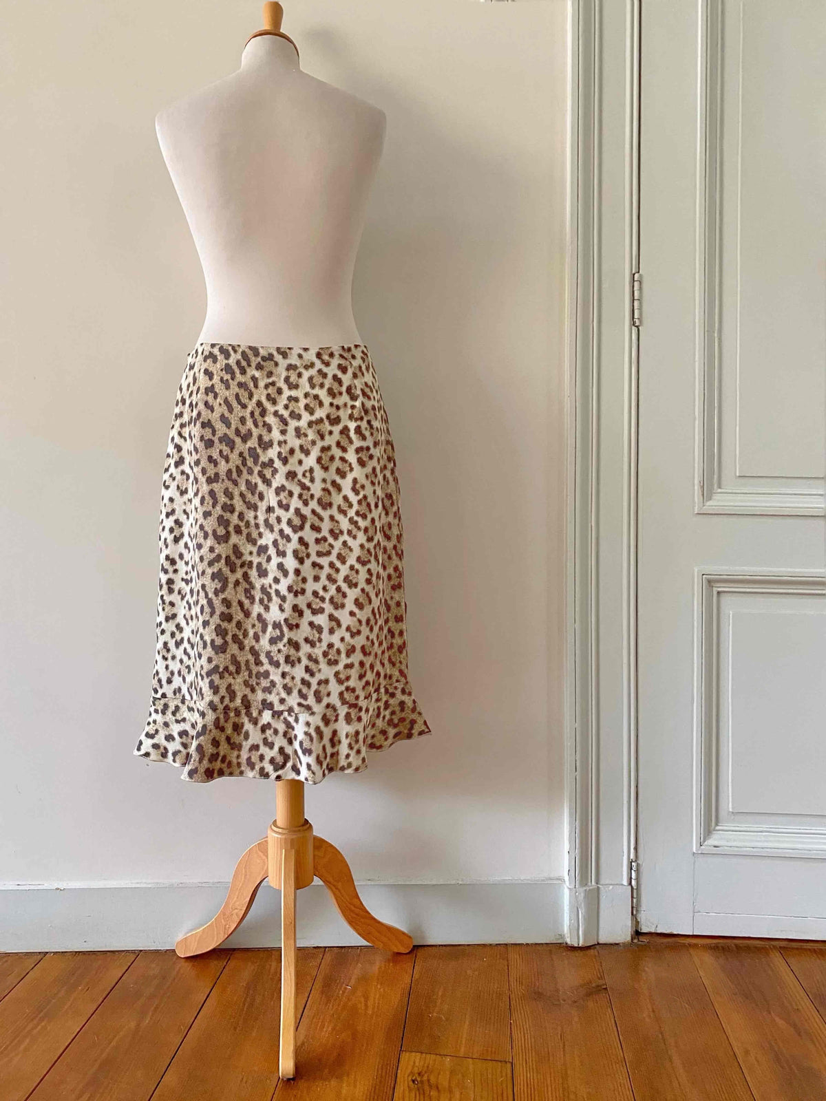 Prix unitaire parJupe midi léopard en satin viscose imprimée léopard beige, camel, chocolat et noir, bas volante, Manoukian, y2k, taille 38 portée ici sur un mannequin T36, hanches 48cm.