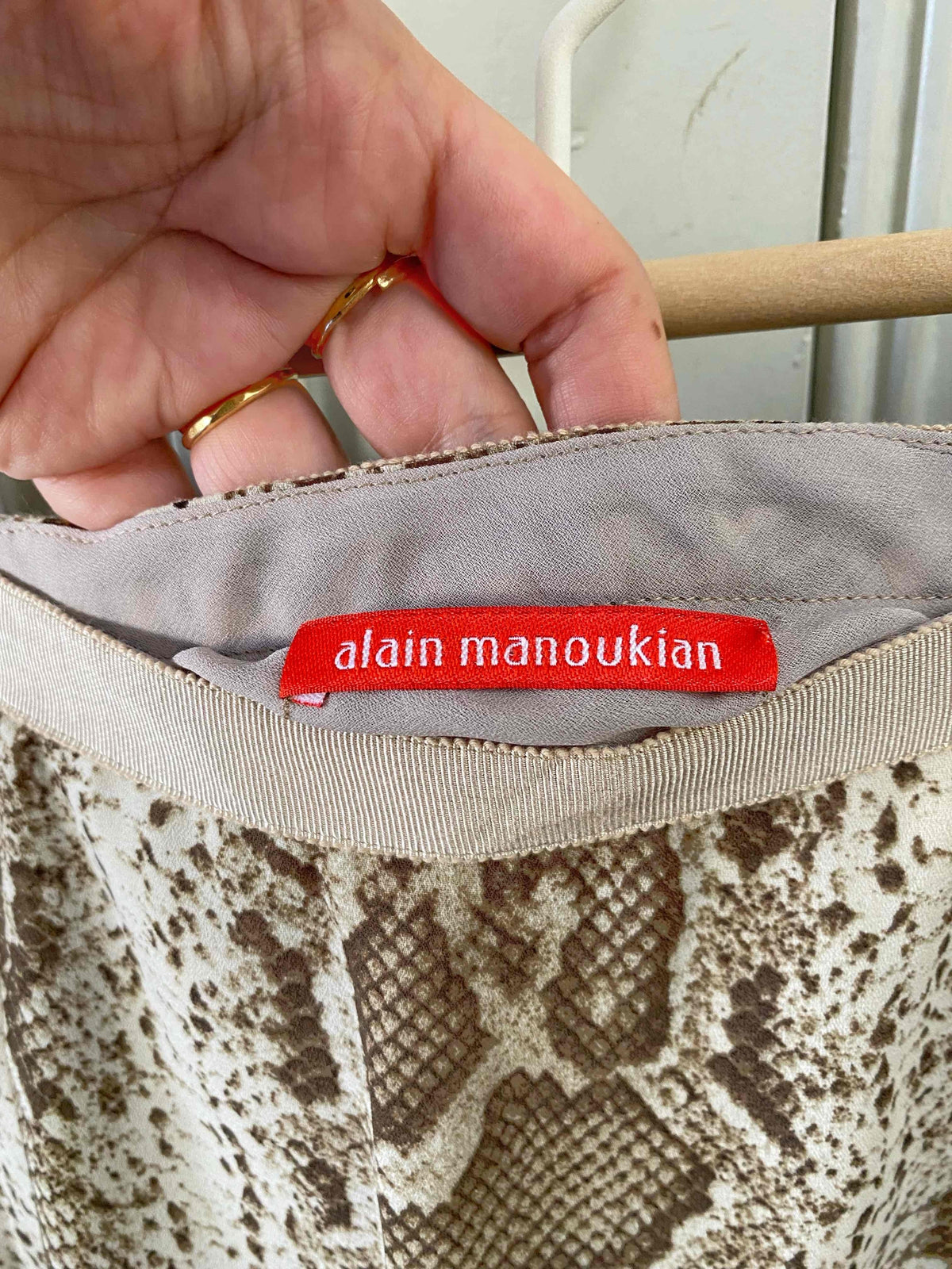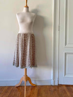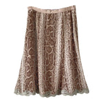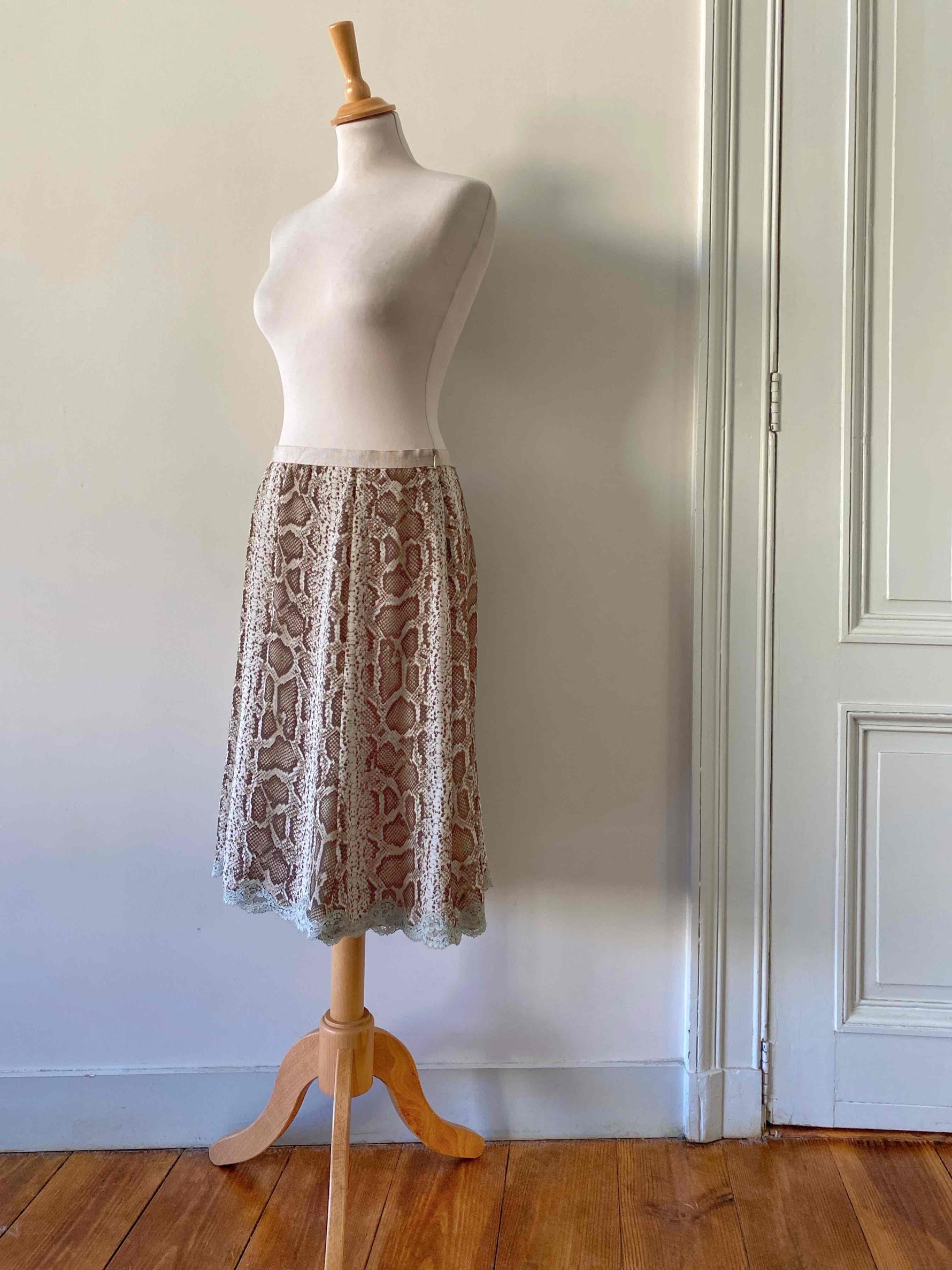 Prix unitaire parJupe midi python en voile viscose doublée imprimée serpent beige, camel et bas en dentelle vert d’eau, galon gros grain beige à la taille et fermeture éclaire côté, Alain Manoukian y2k, taille 38 portée ici sur un mannequin T36.
