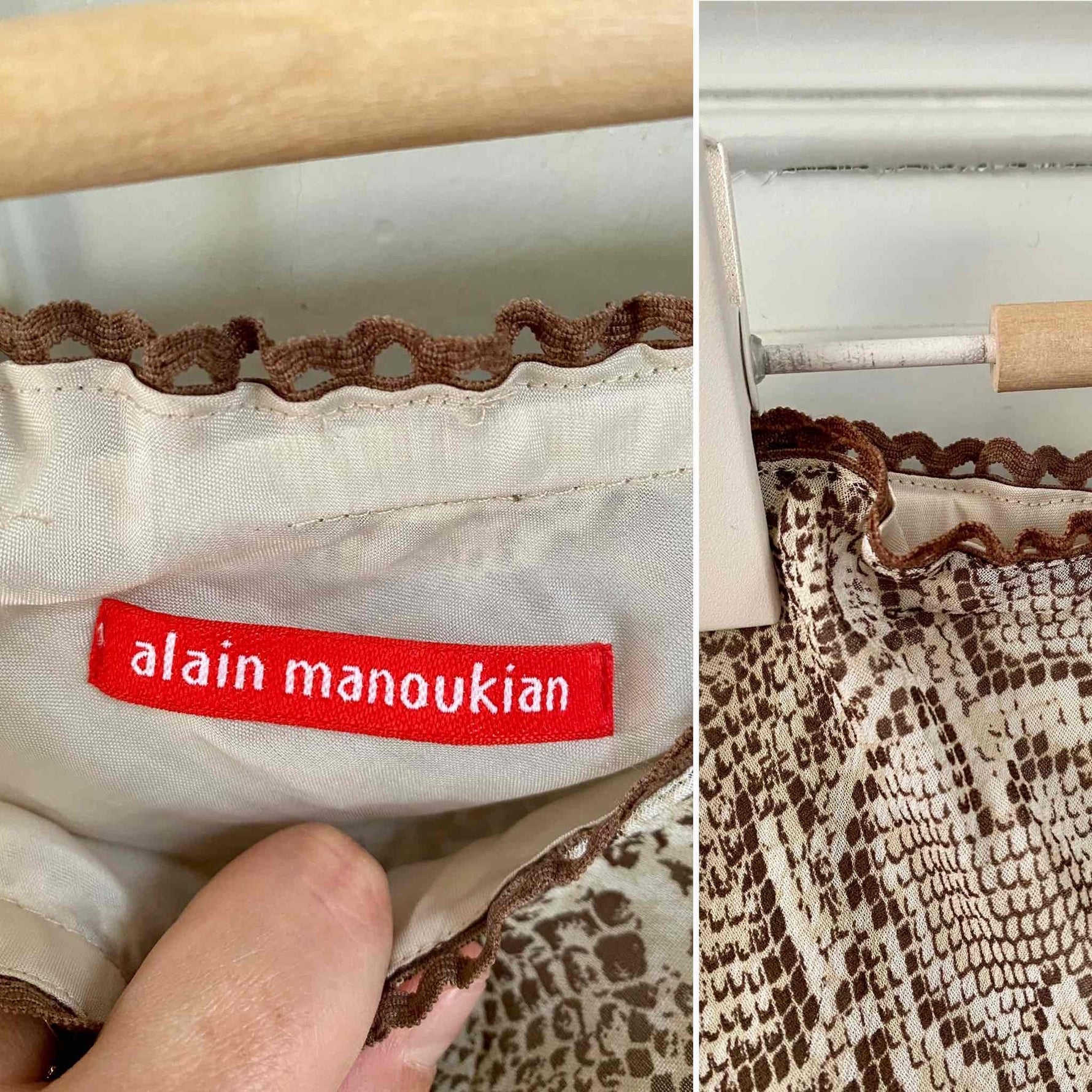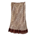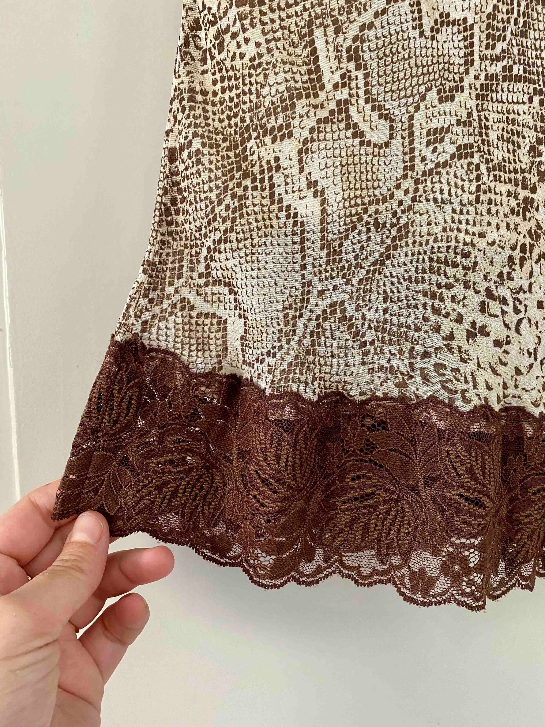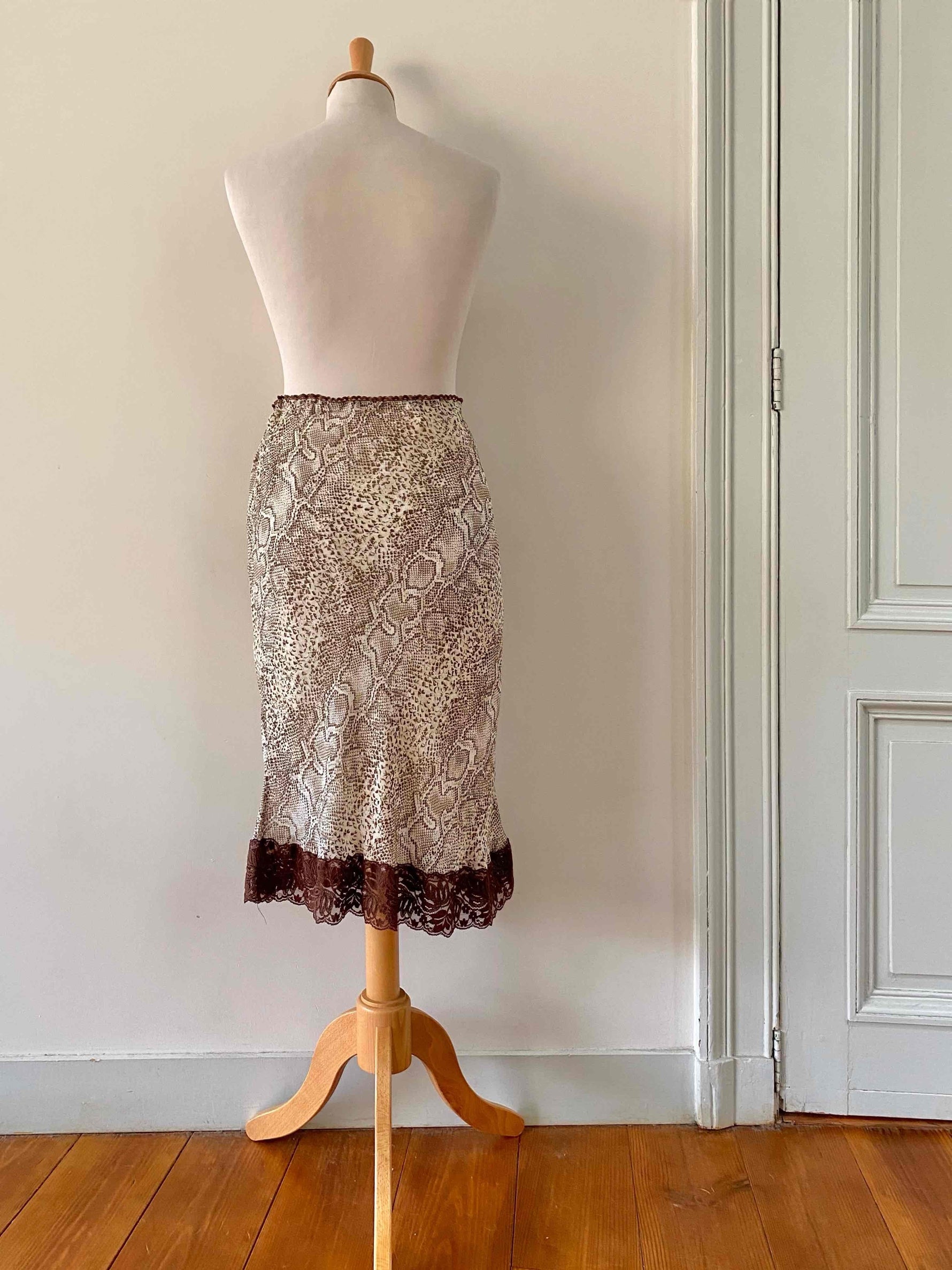 Prix unitaire parJupe midi python en voile viscose beige imprimée serpent chocolat, bas en dentelle chocolat, taille élastique, forme fit and flare, Alain Manoukian y2k, taille 36 portée ici sur un mannequin T36.