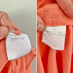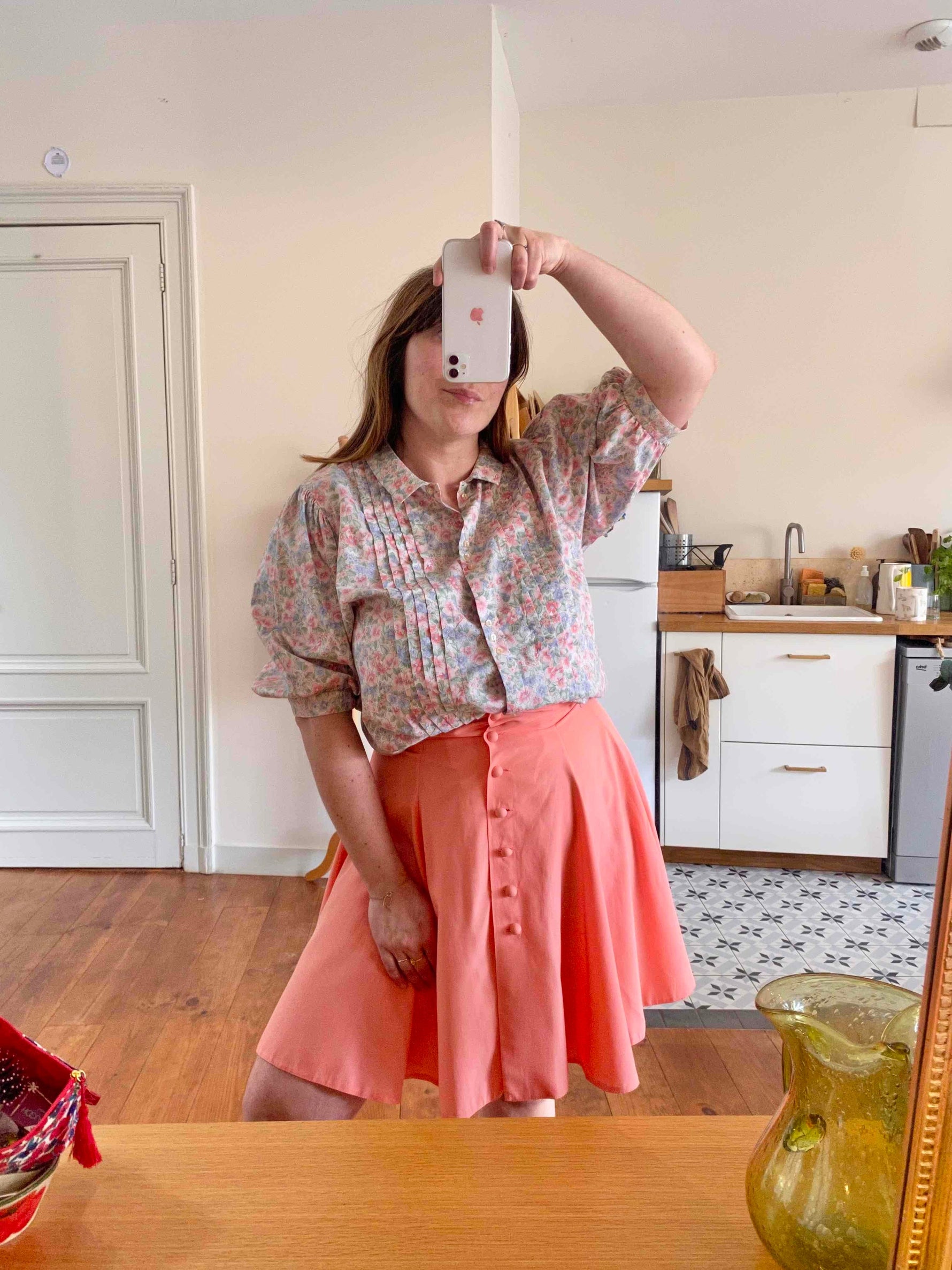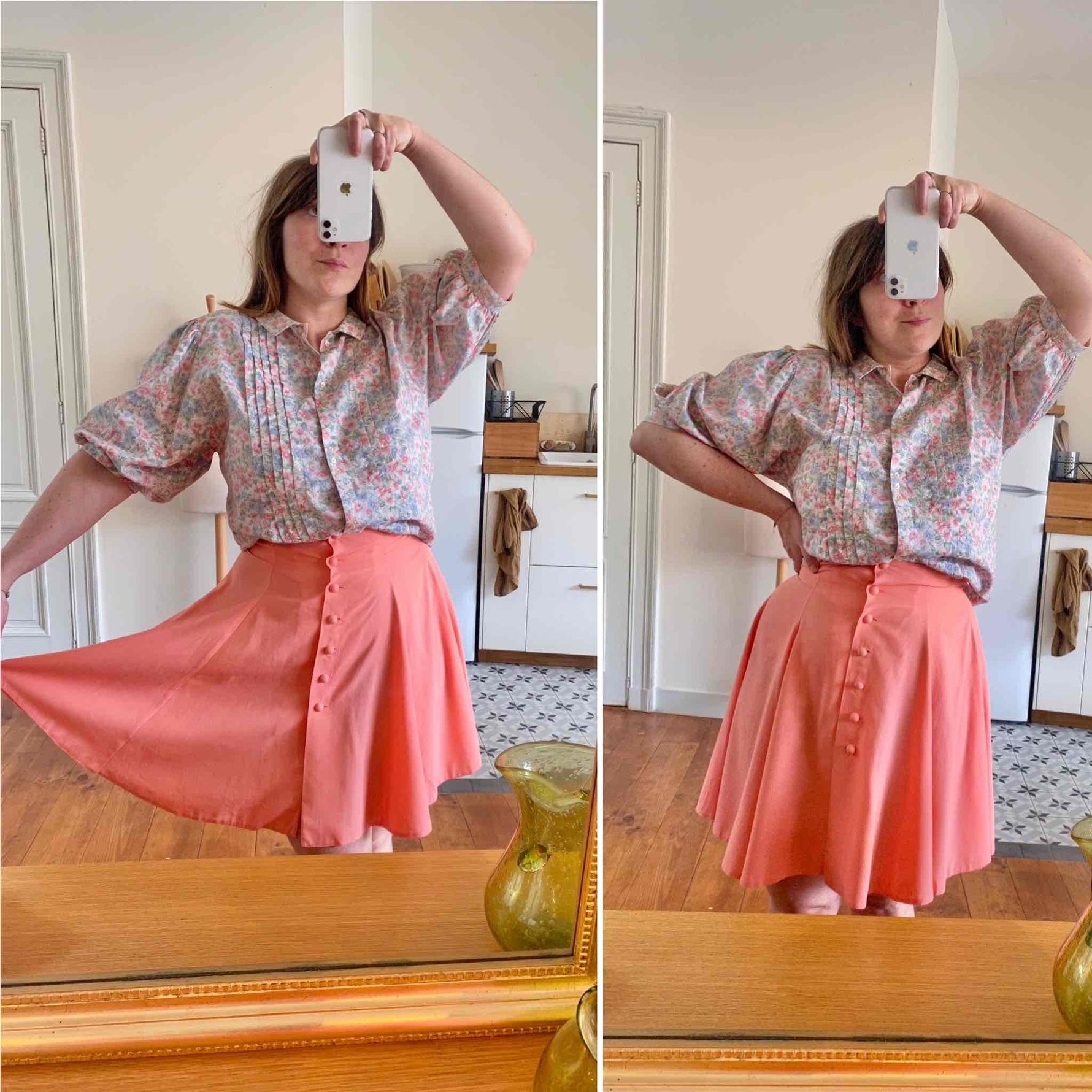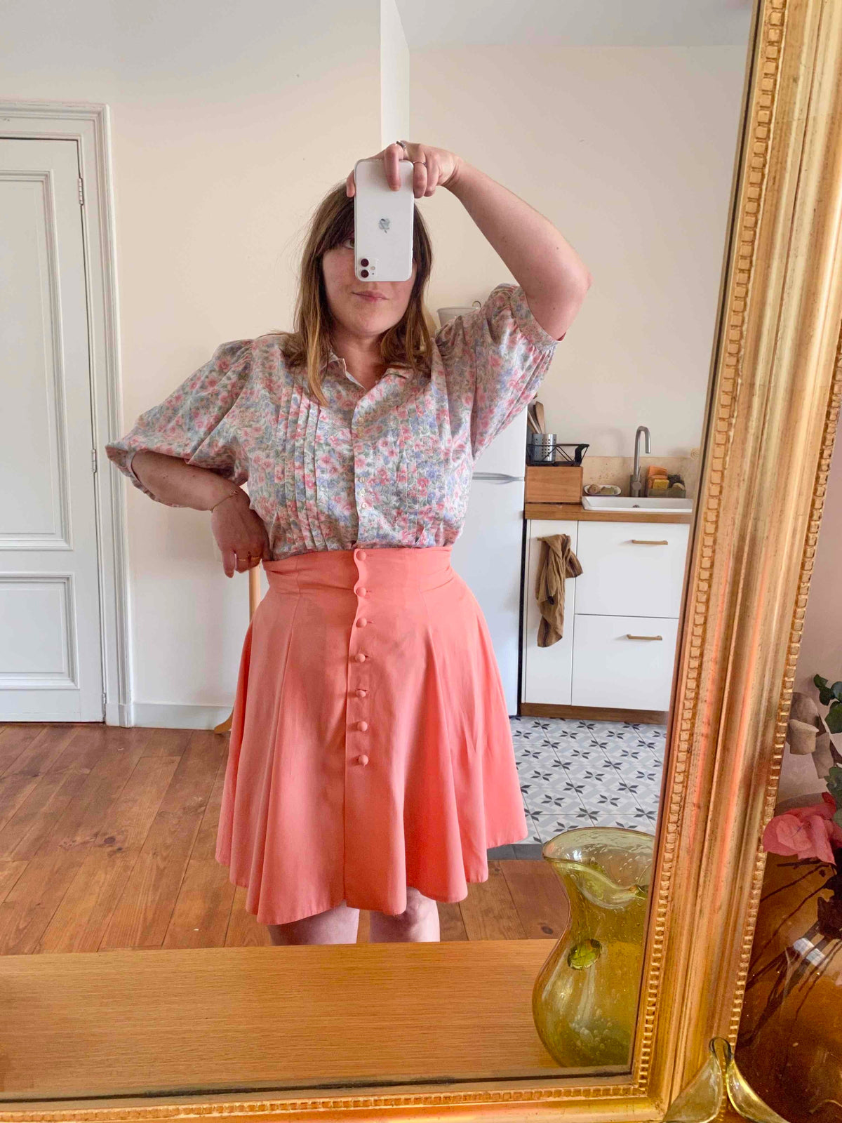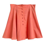 Prix unitaire parJupe Patineuse Boutonnée en viscose rose abricot, rangée de boutons recouverts, taille très haute, fabriquée en France, taille 40 portée ici sur une personne T40.
