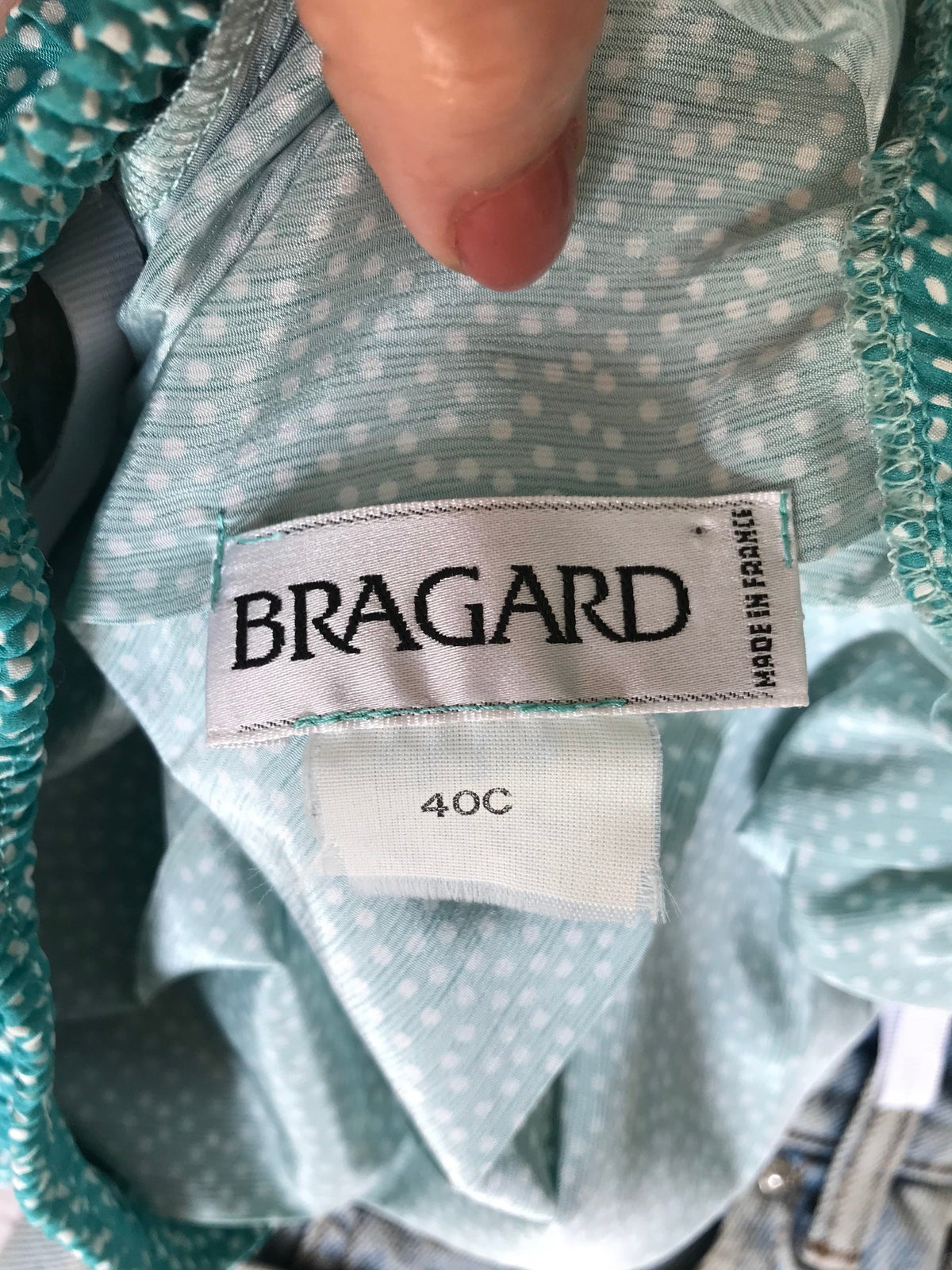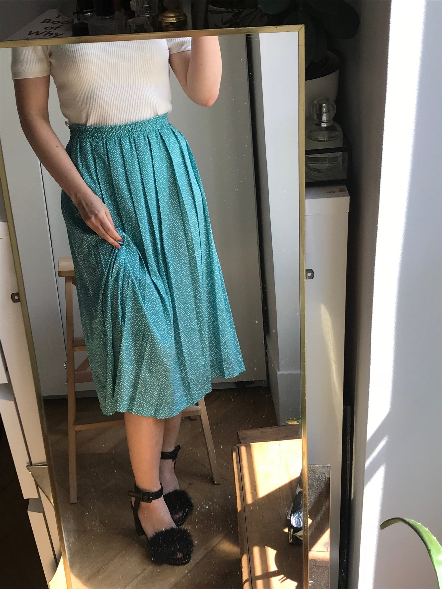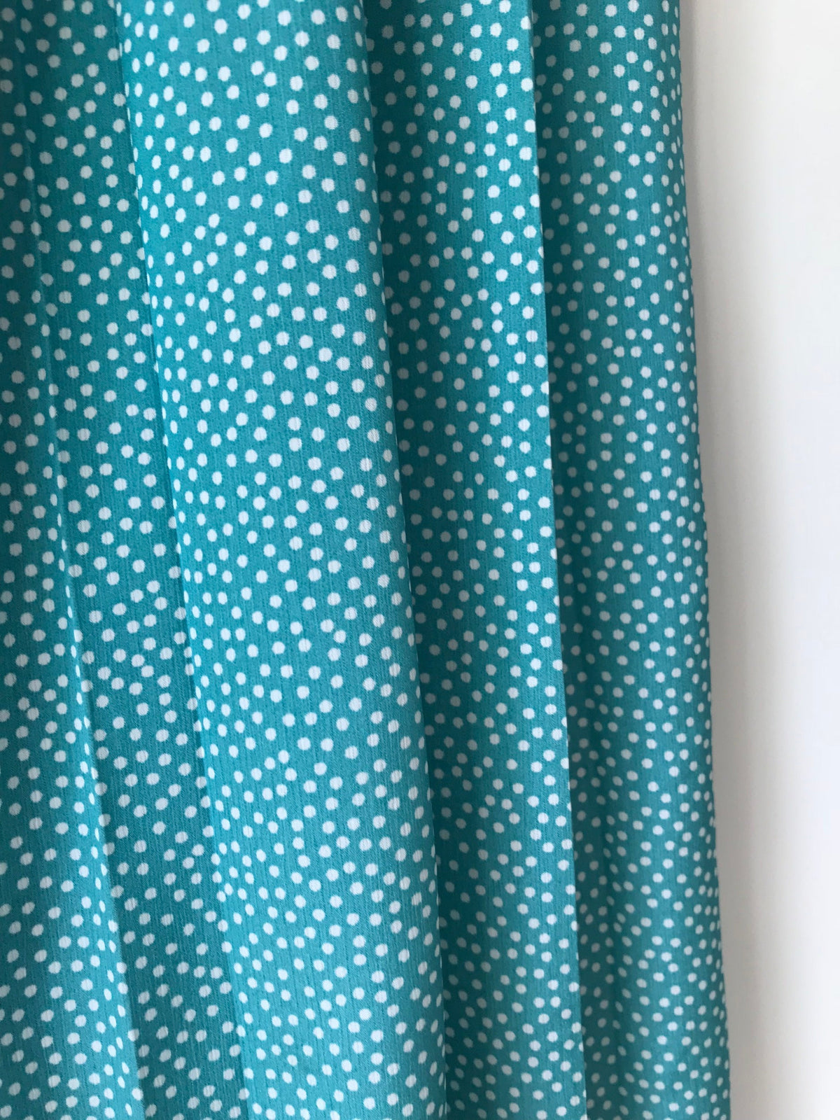 Jupe longue plissée en viscose dans un joli bleu/vert à petits pois blanc. Élastique à la taille. Made in France, de la marque "Bragard".