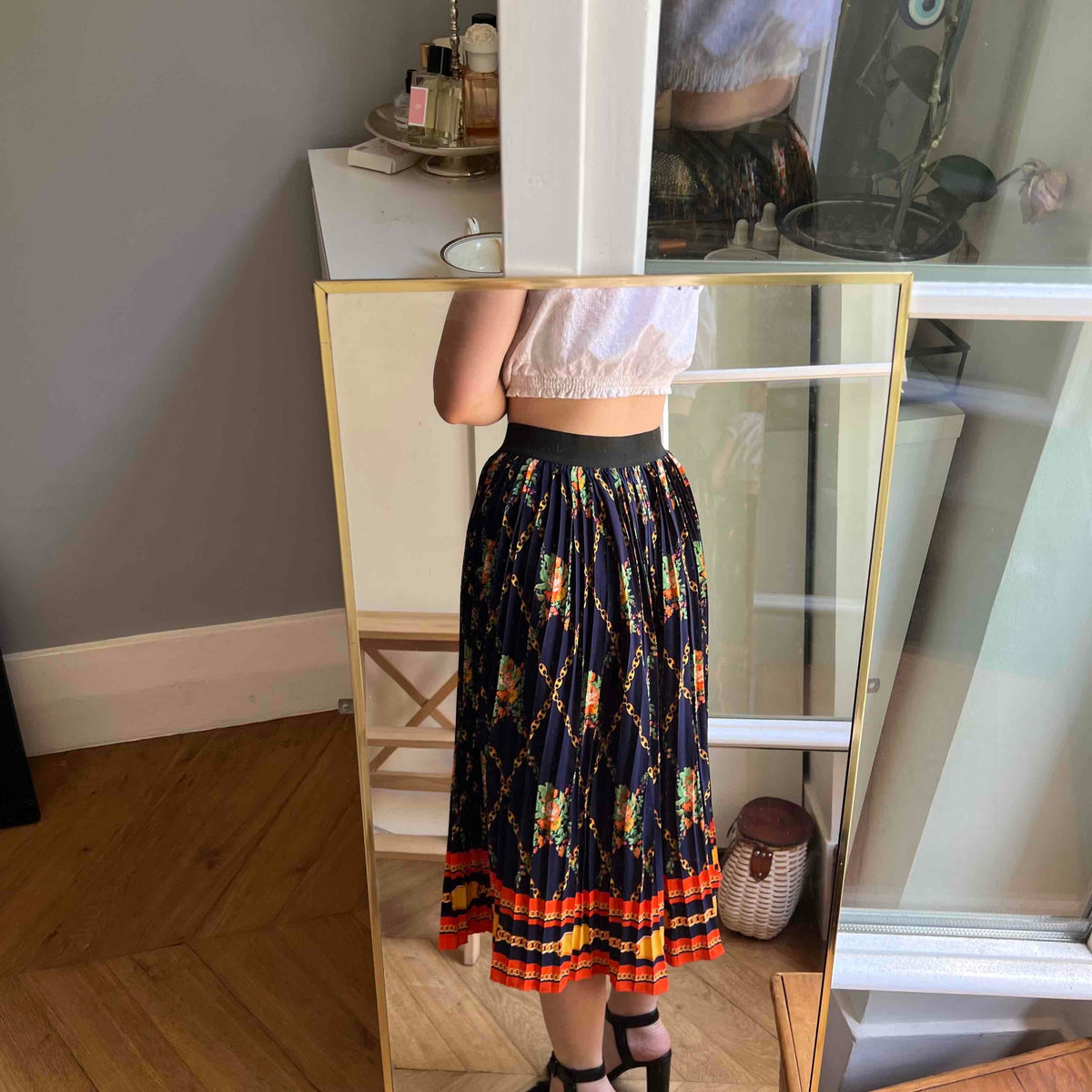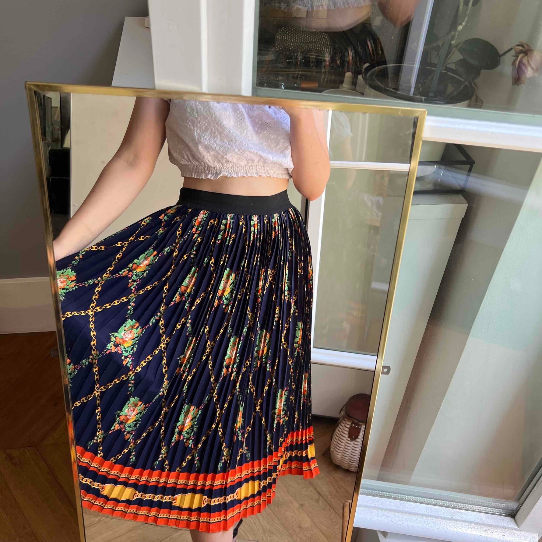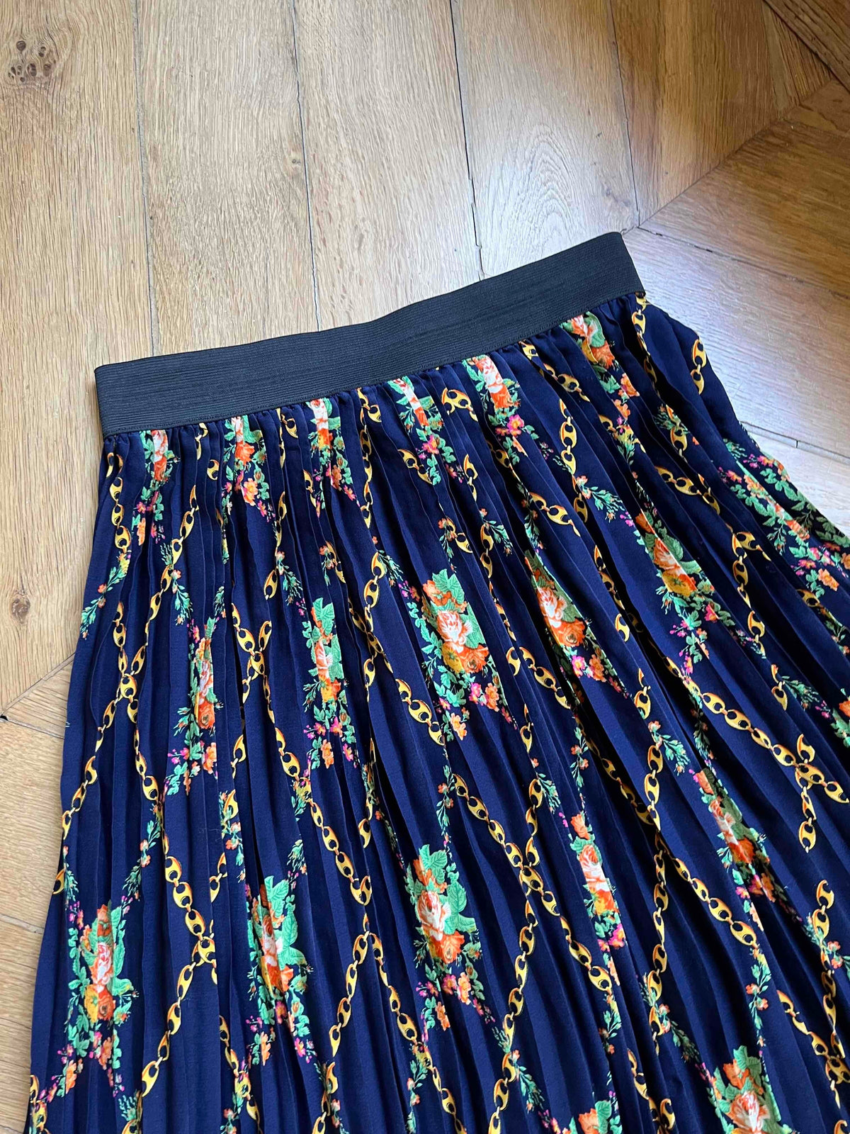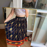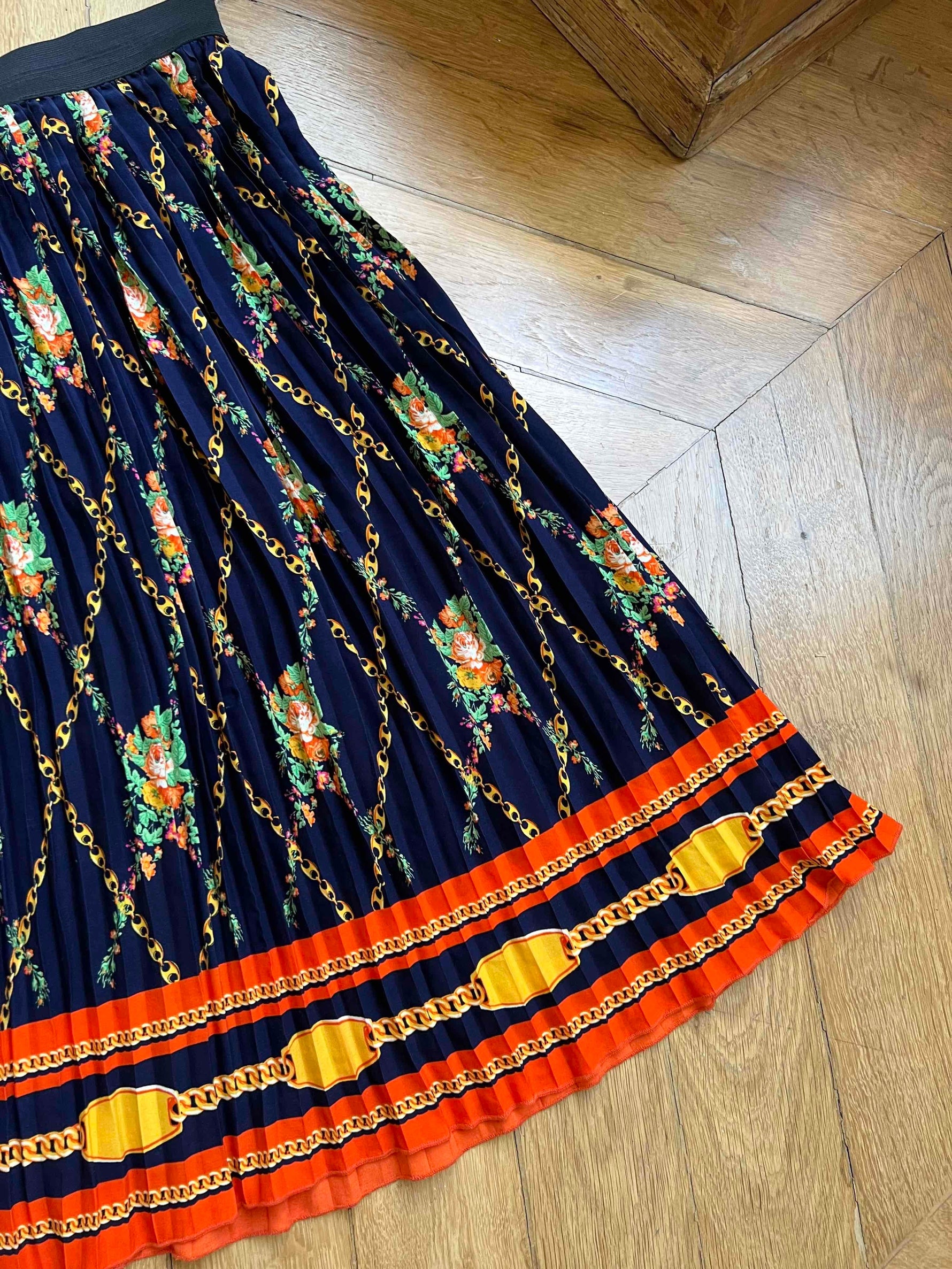 Prix unitaire parJupe longue plissée bleu marine avec des détails oranges de fleurs et des motifs de chaîne dorée, taille élastique, matière synthétique, années 90. Taille 36–38.