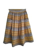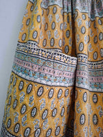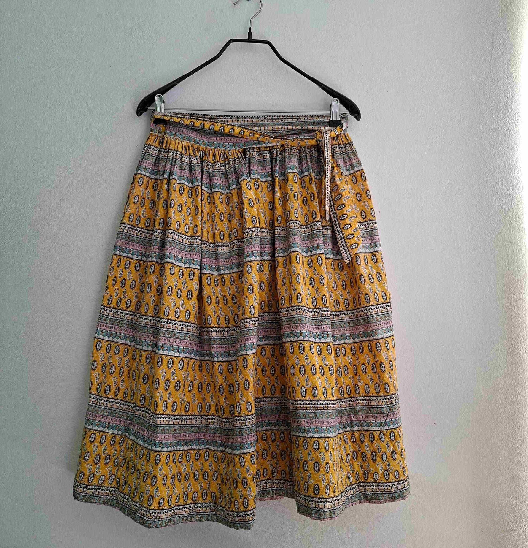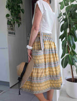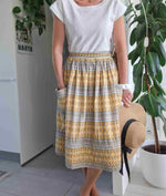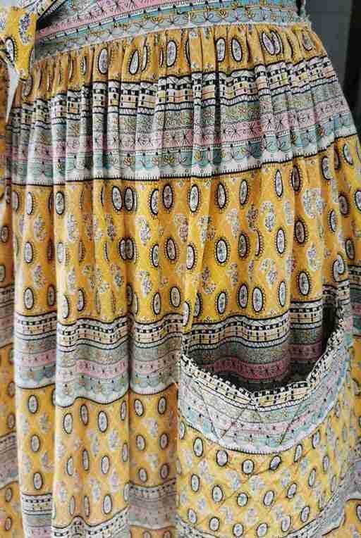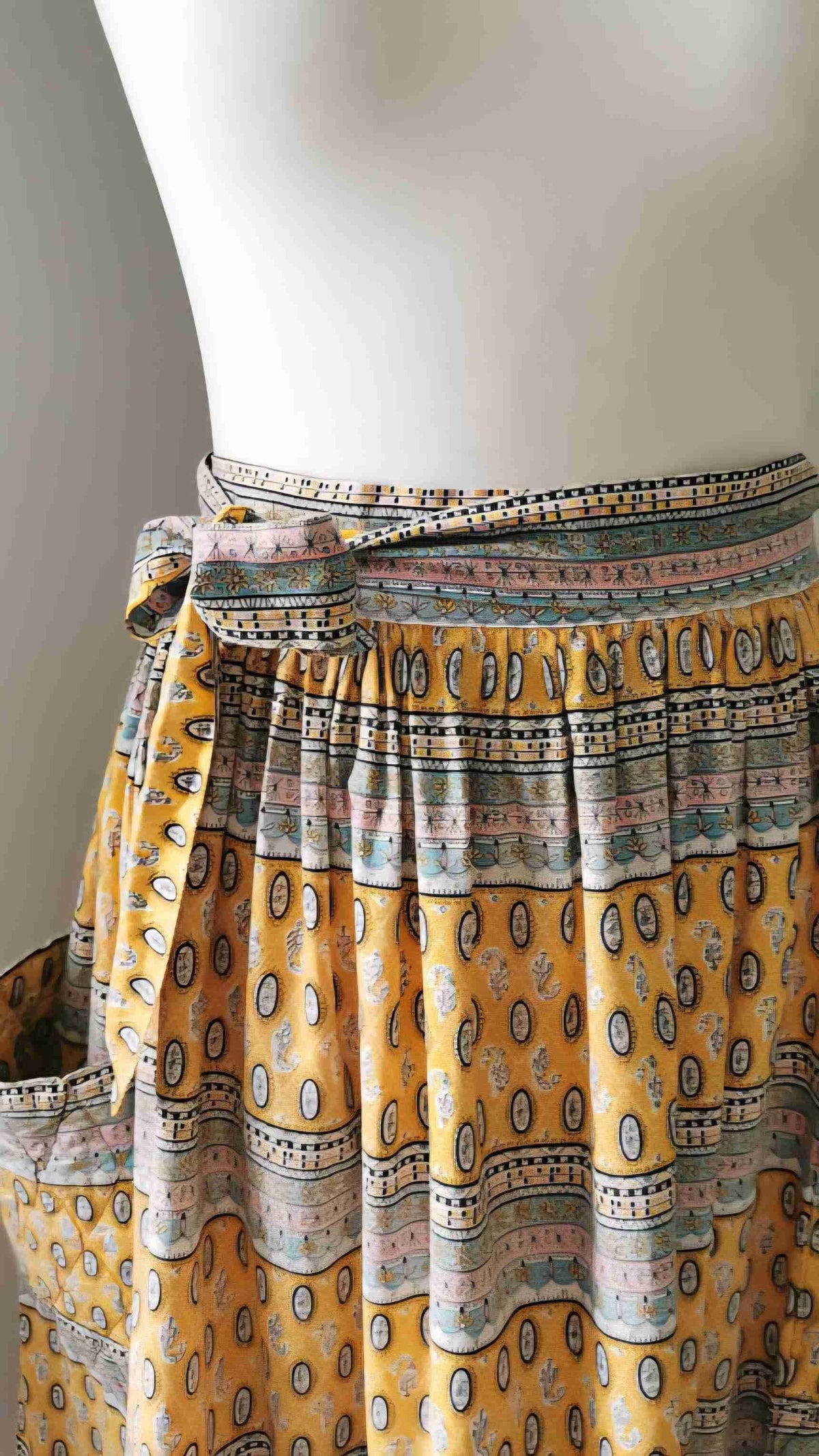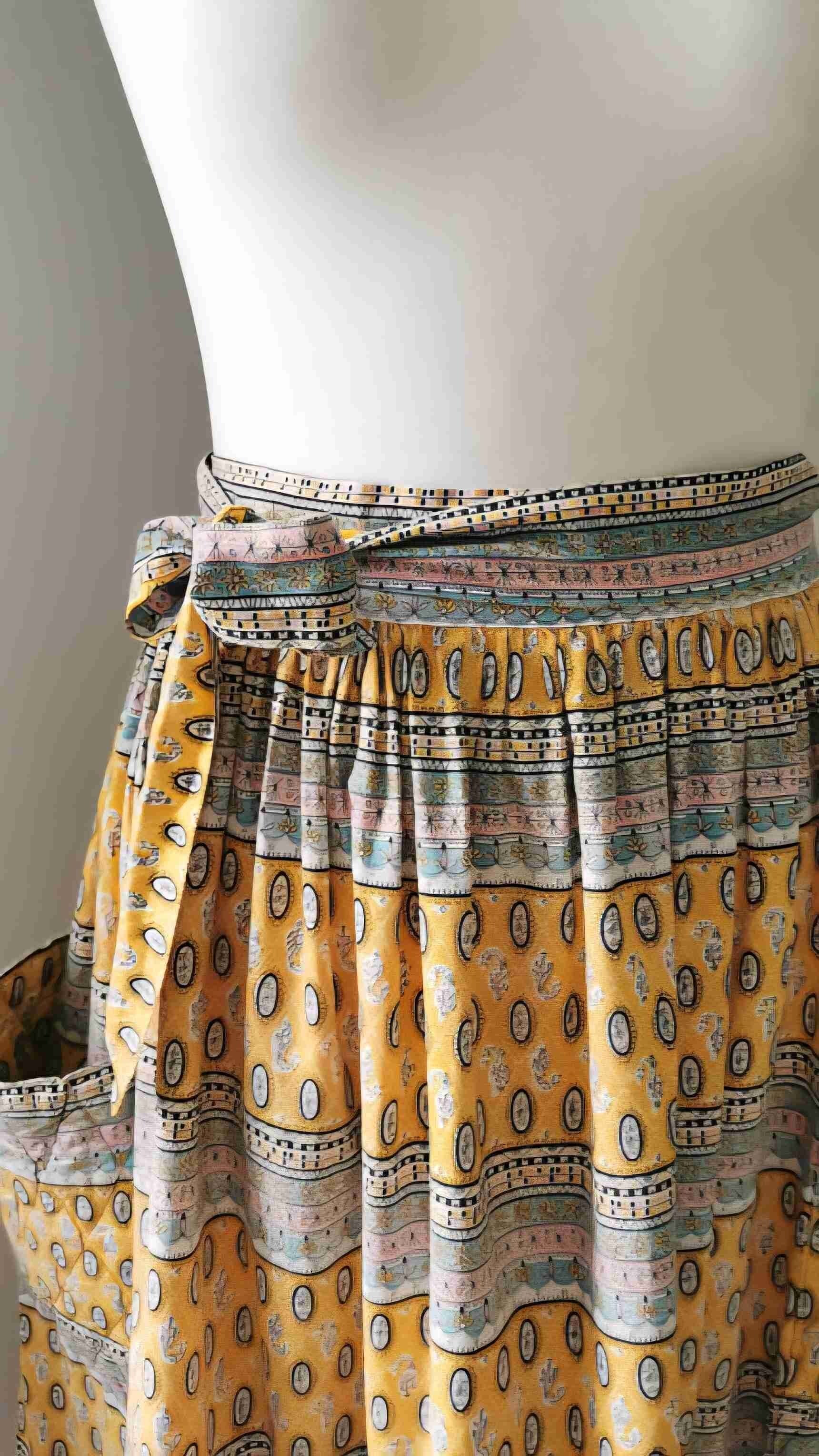 A taille haute avec des fronces devant et dos et liens à nouer sur le côté
