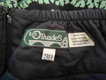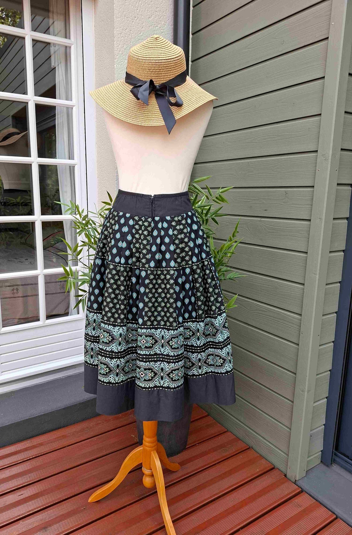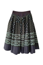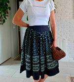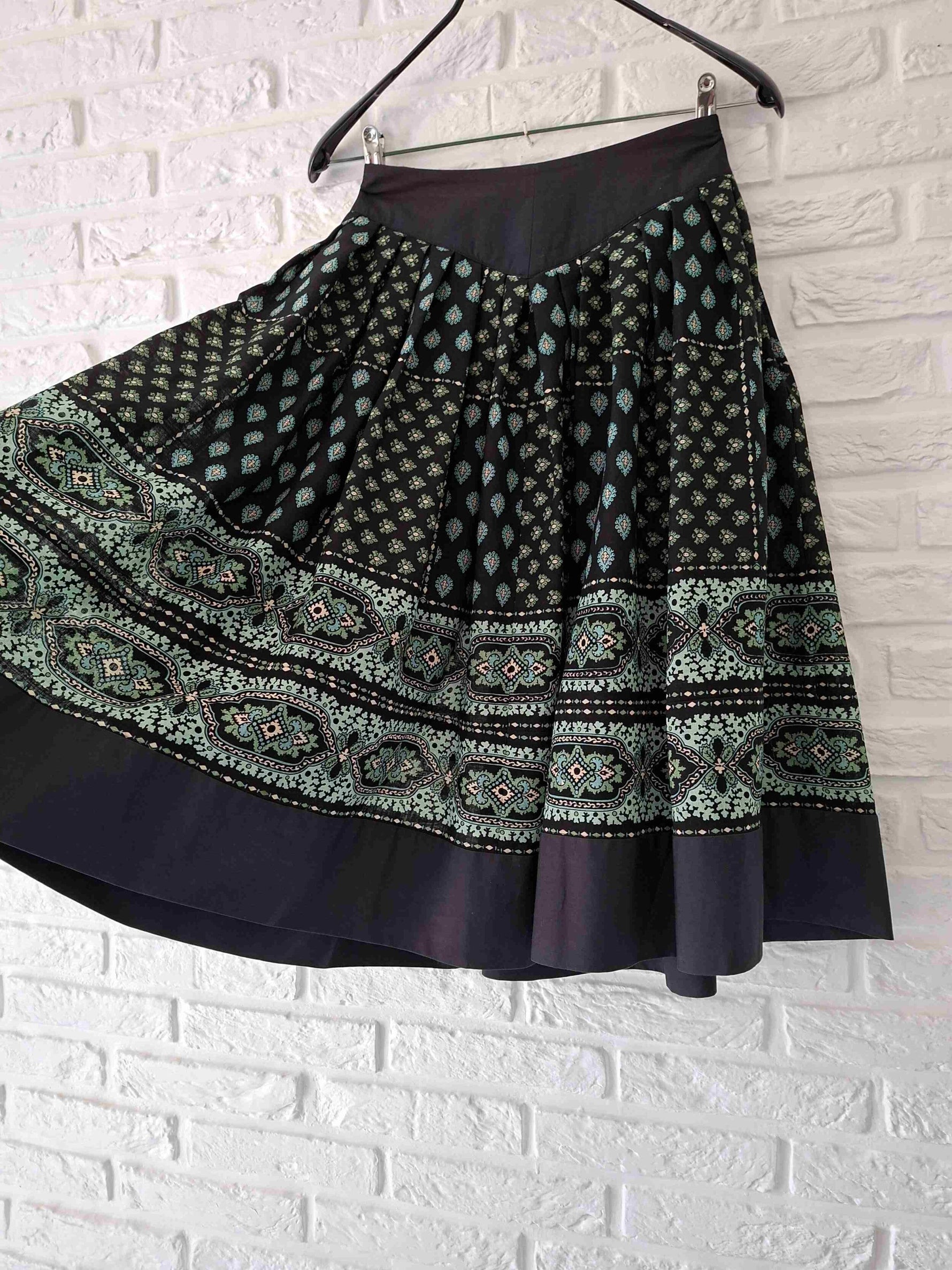 Le fond de la jupe est noir et les motifs provencaux sont vert,turquoise et écru