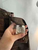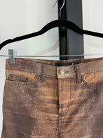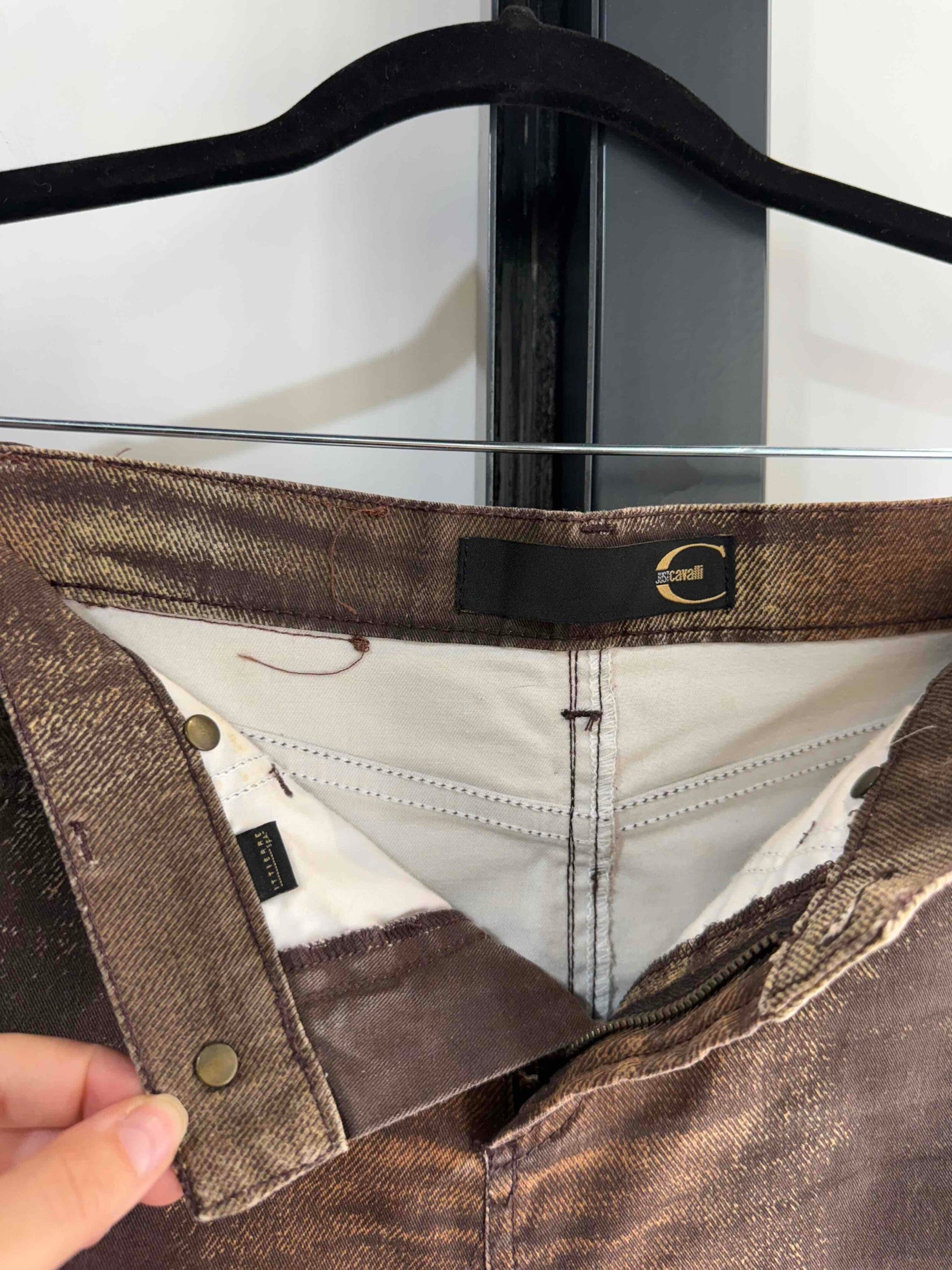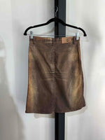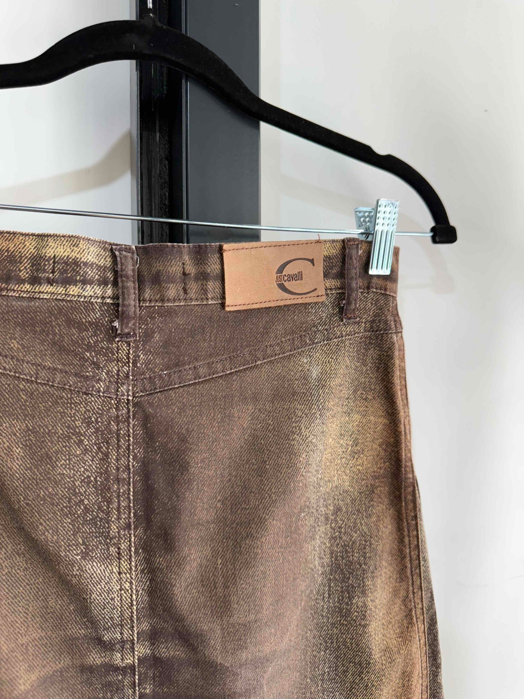 Jupe longueur genoux effet denim de la marque Roberto Cavalli, Just Cavalli. Taille 38 IT correspond à un 34 italien. Toile de coton relativement rigide mais légère. Marron effet délavé. Parfait état (neuve sans étiquette). Fabriquée en Italie. Années 2000s
