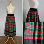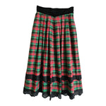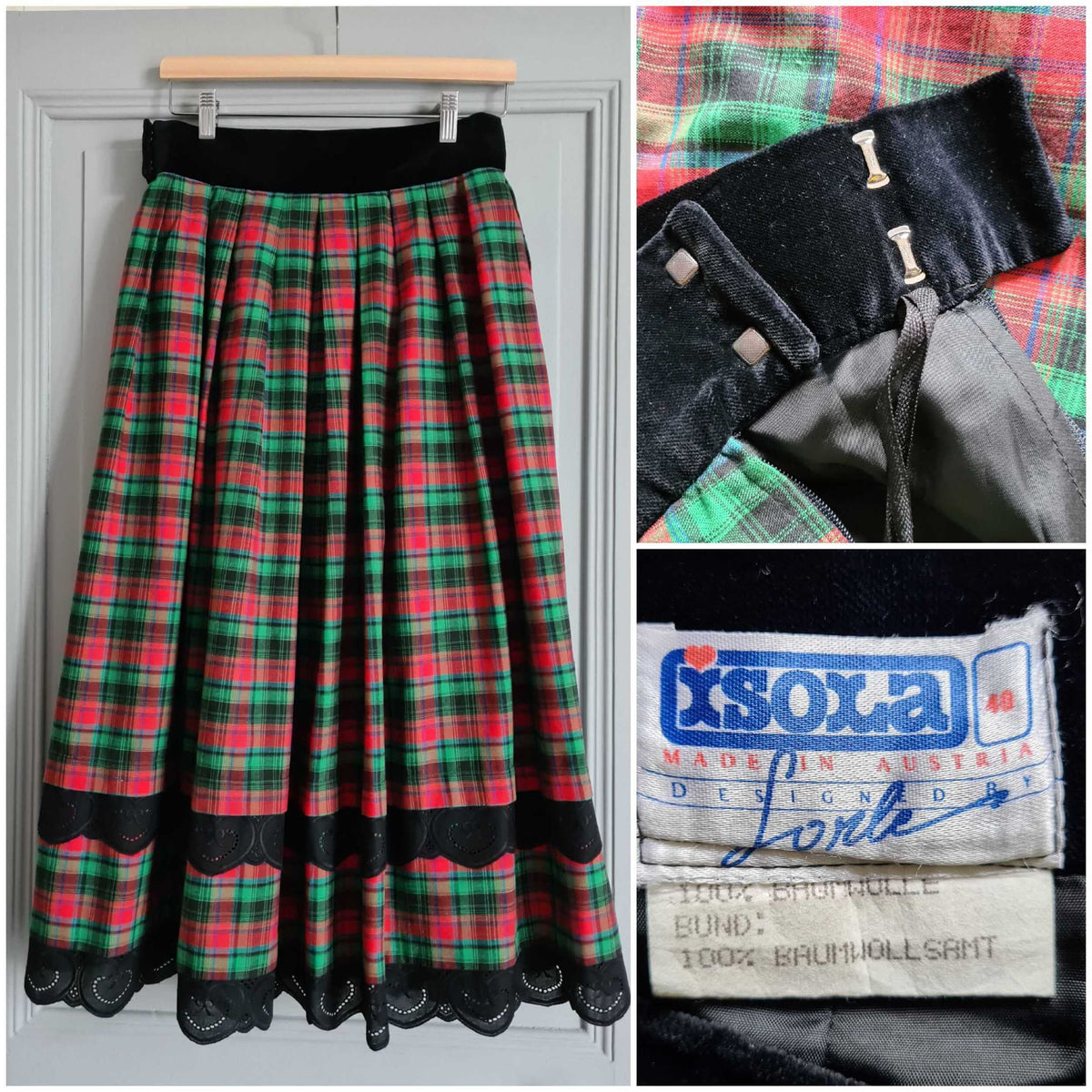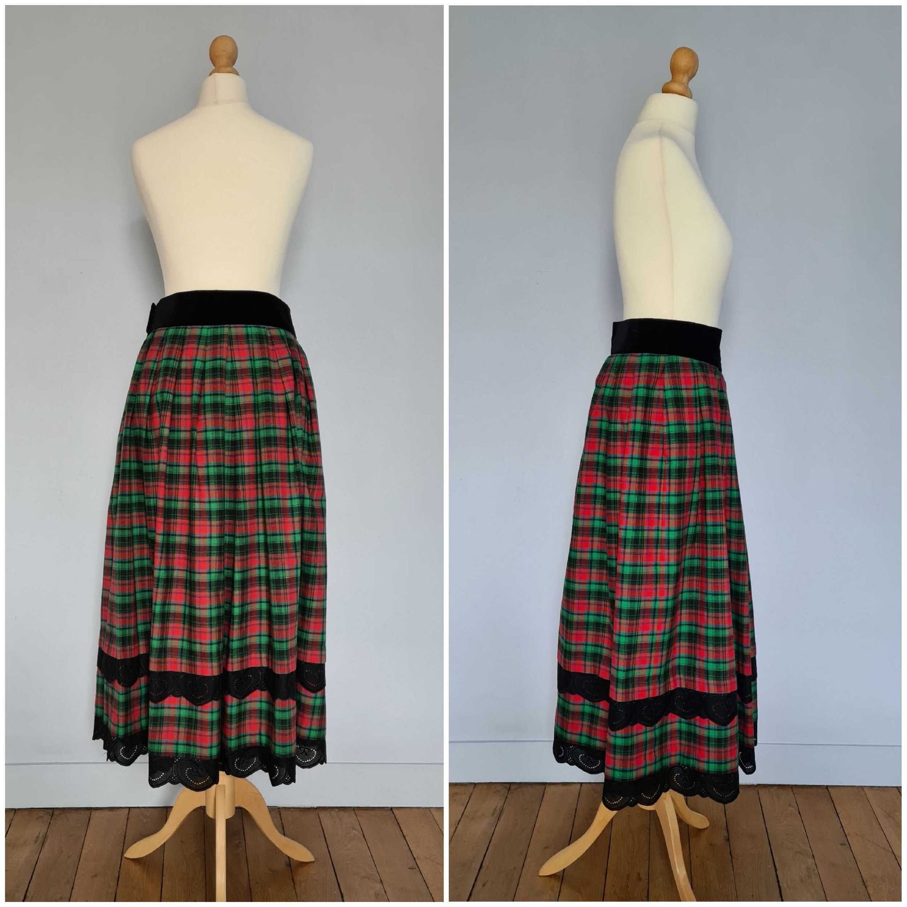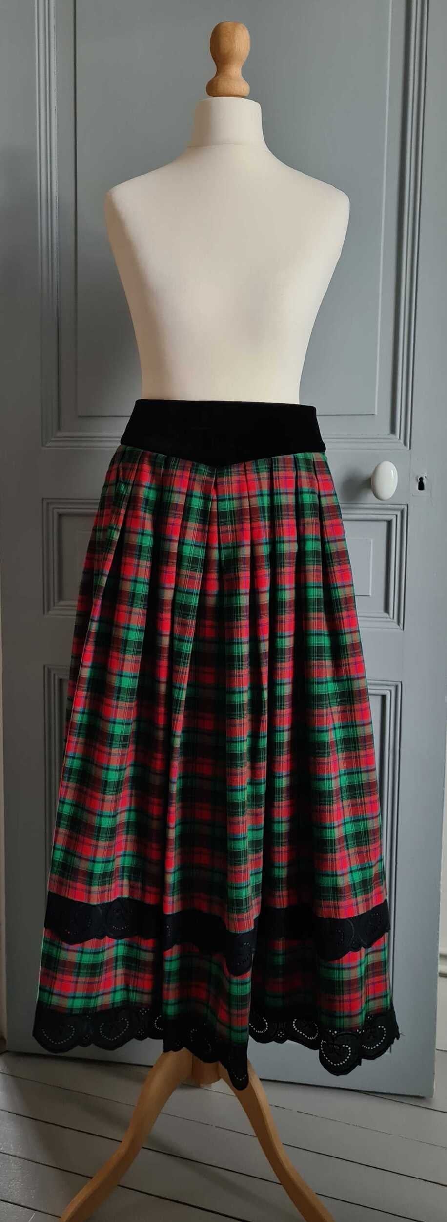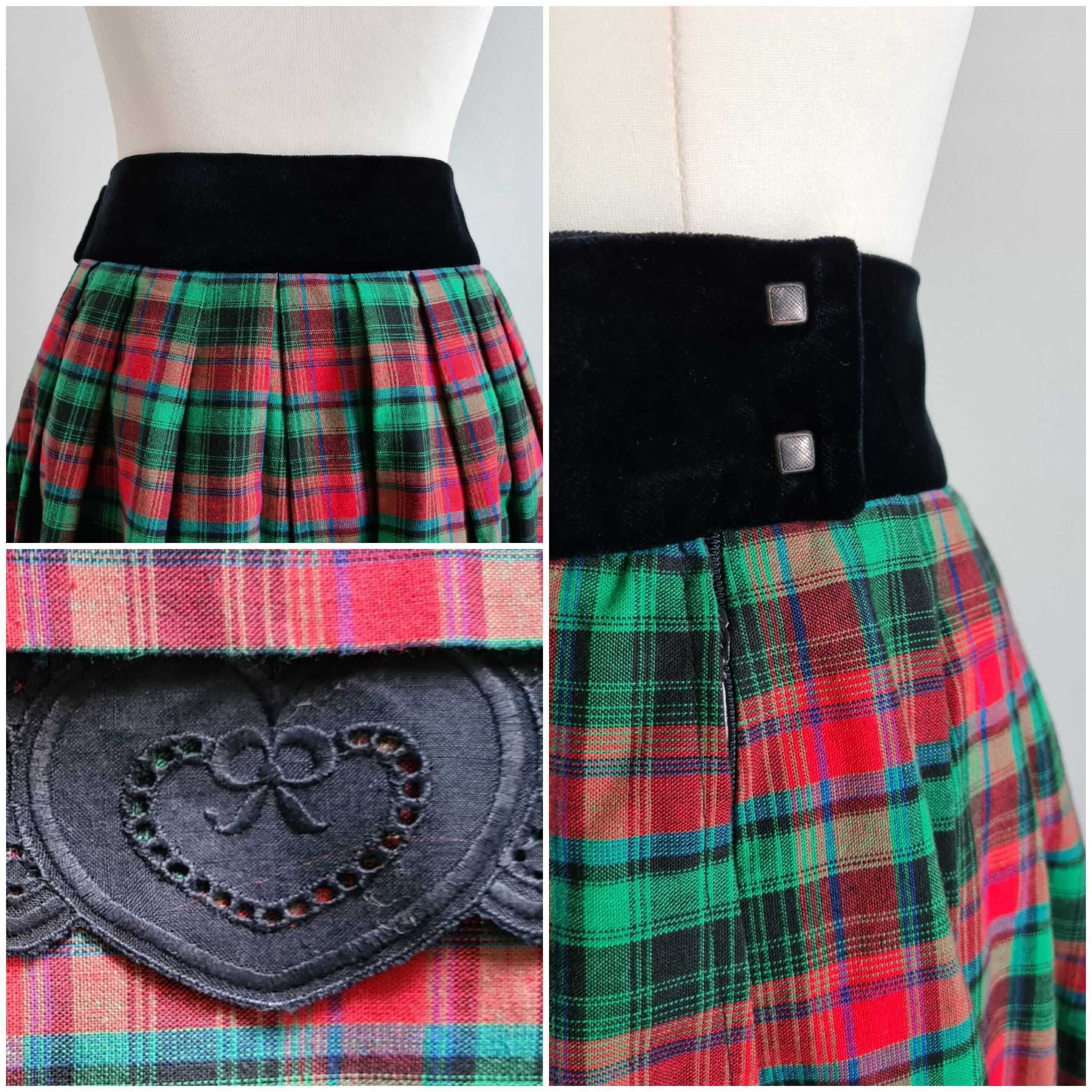 Prix unitaire parJupe midi autrichienne en coton tartan rouge cerise, vert et noir, doublée, taille haute large ceinture de velours noir, fermeture éclair et deux agrafes côté, poches invisibles de chaque côté des hanches, base étagée ornée de rubans de dentelle noire formant des cœurs. Esprit jupon avec un beau volume. Fabriquée en Autriche.