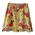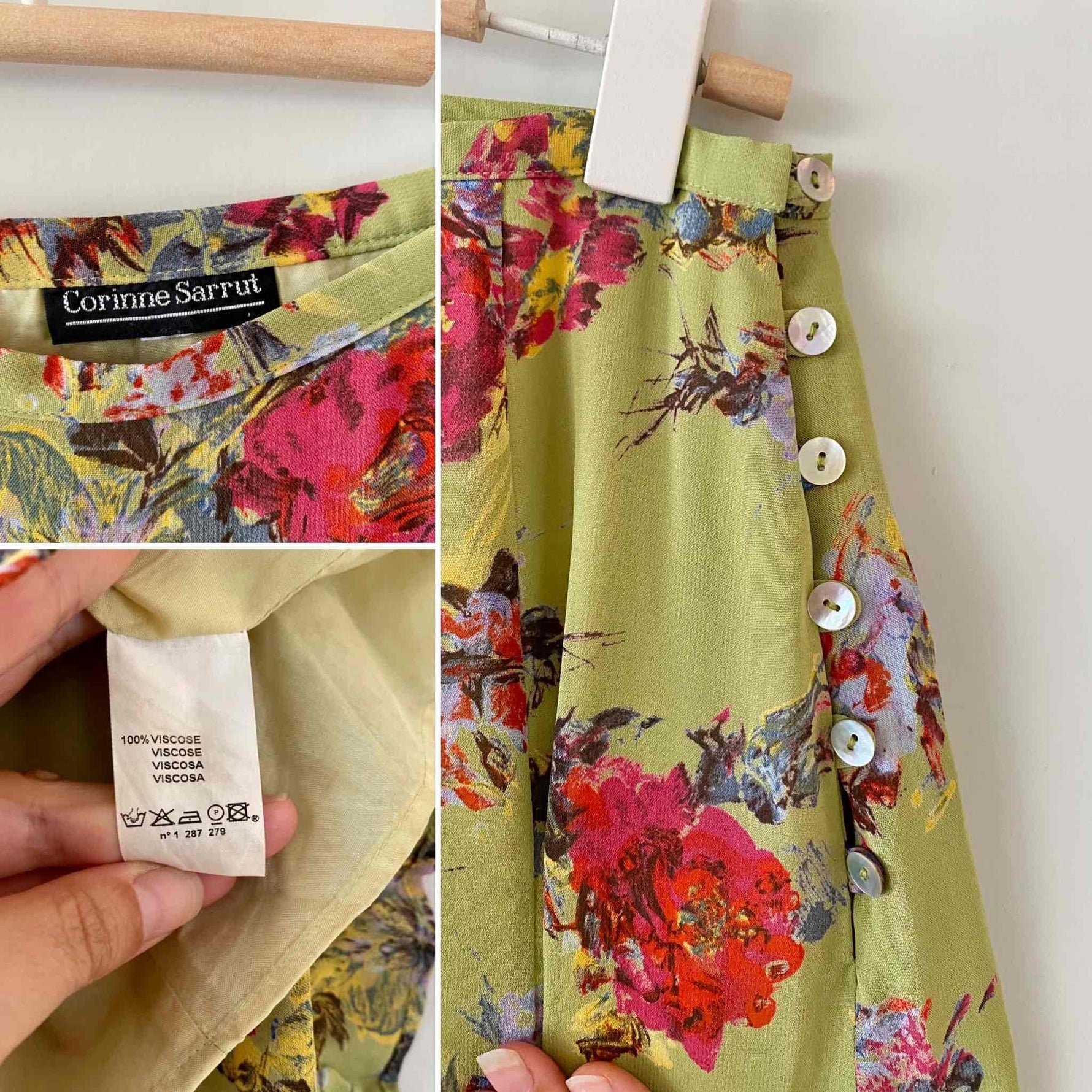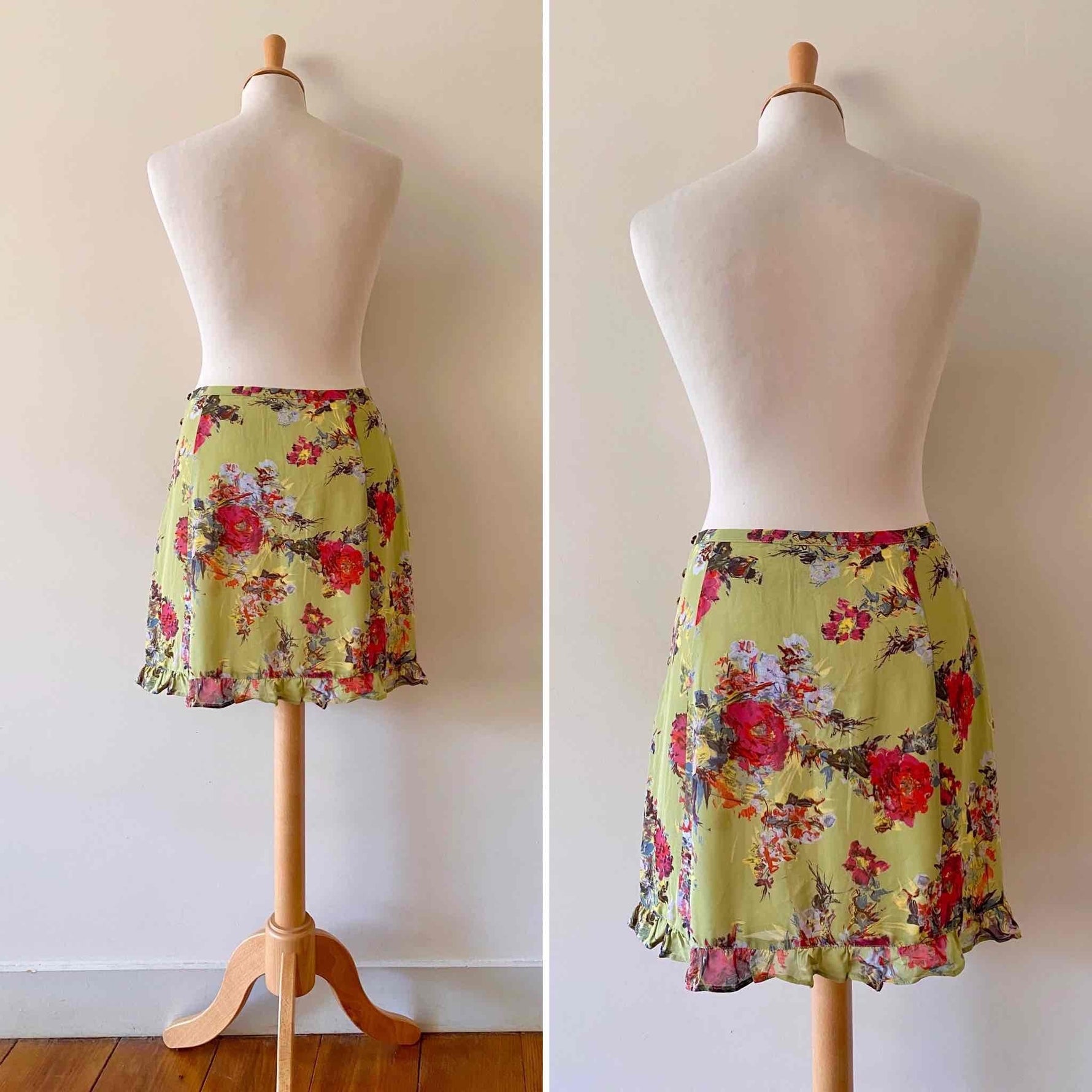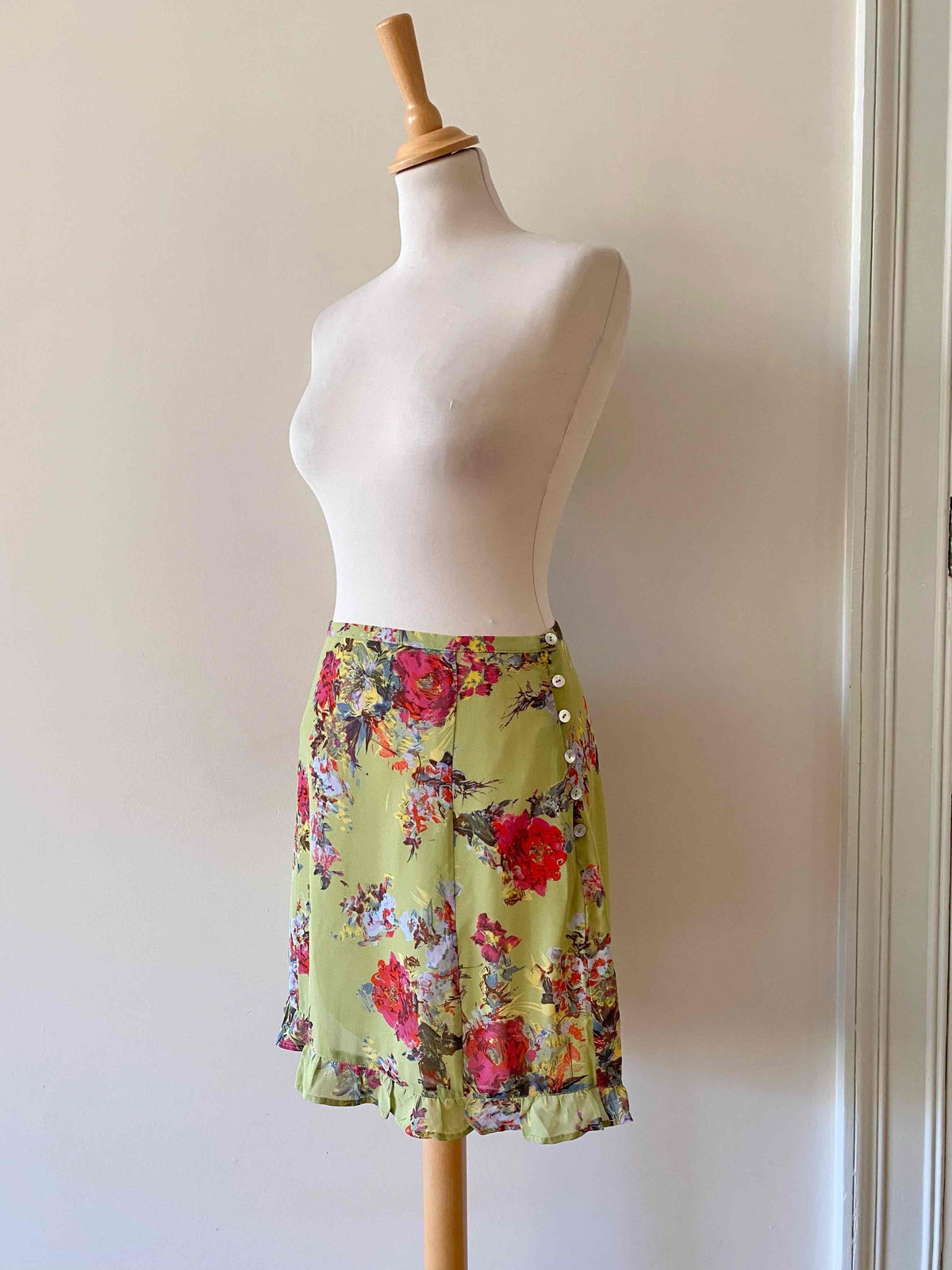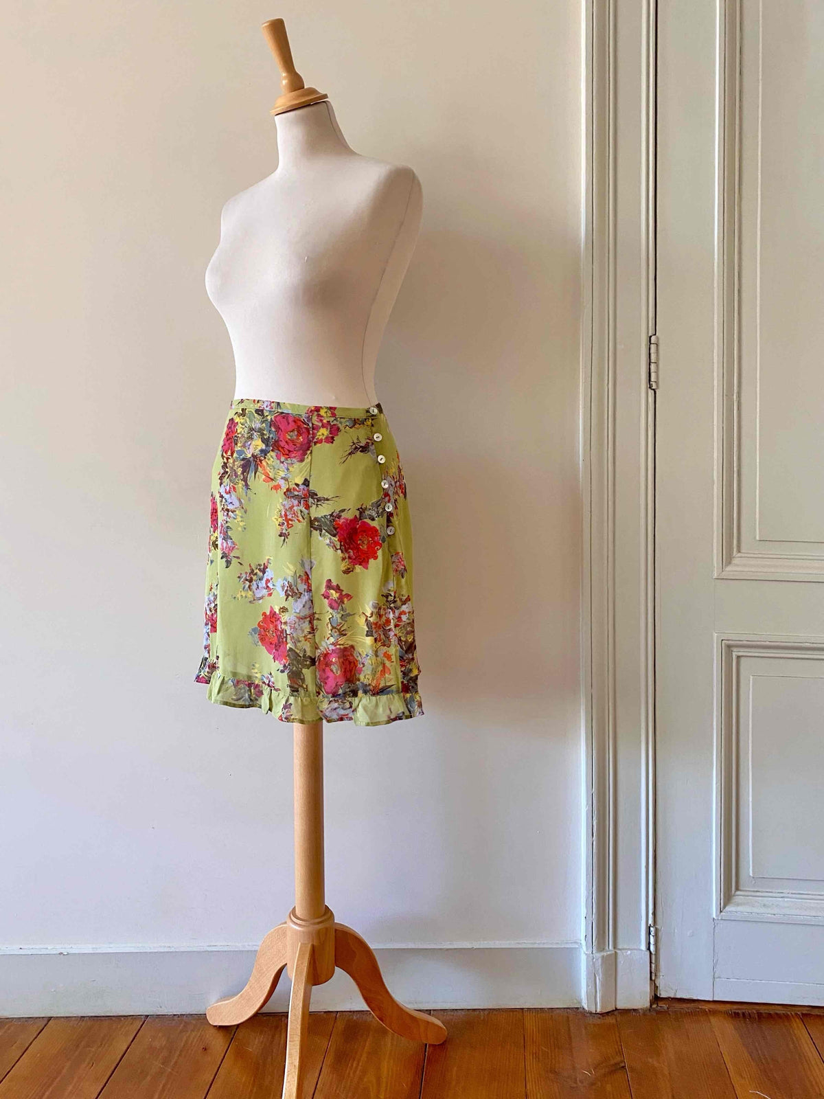Prix unitaire parMini jupe à fleurs Corinne Sarrut maison Cacharel, en voile viscose vert anis imprimée fleurs multicolores rouges, lilas, bas volanté, boutonnage coté, taille 36 portée ici sur un mannequin T36, hanches 45cm.