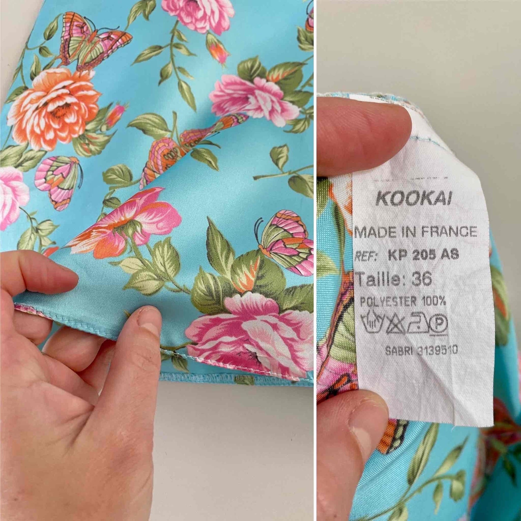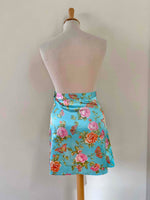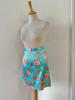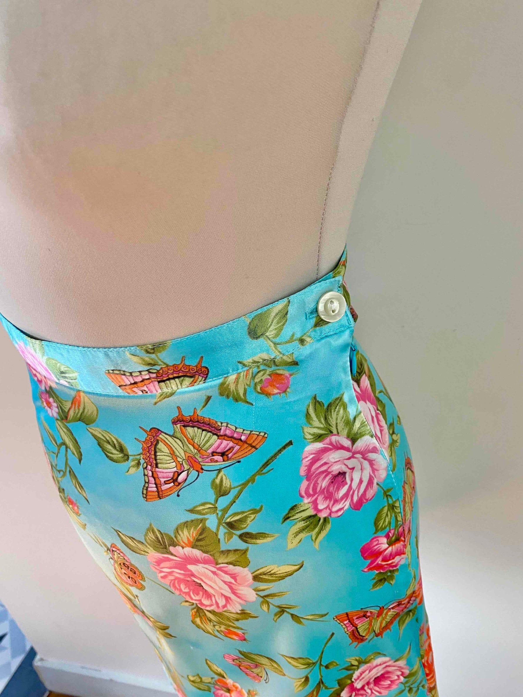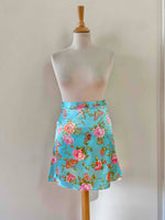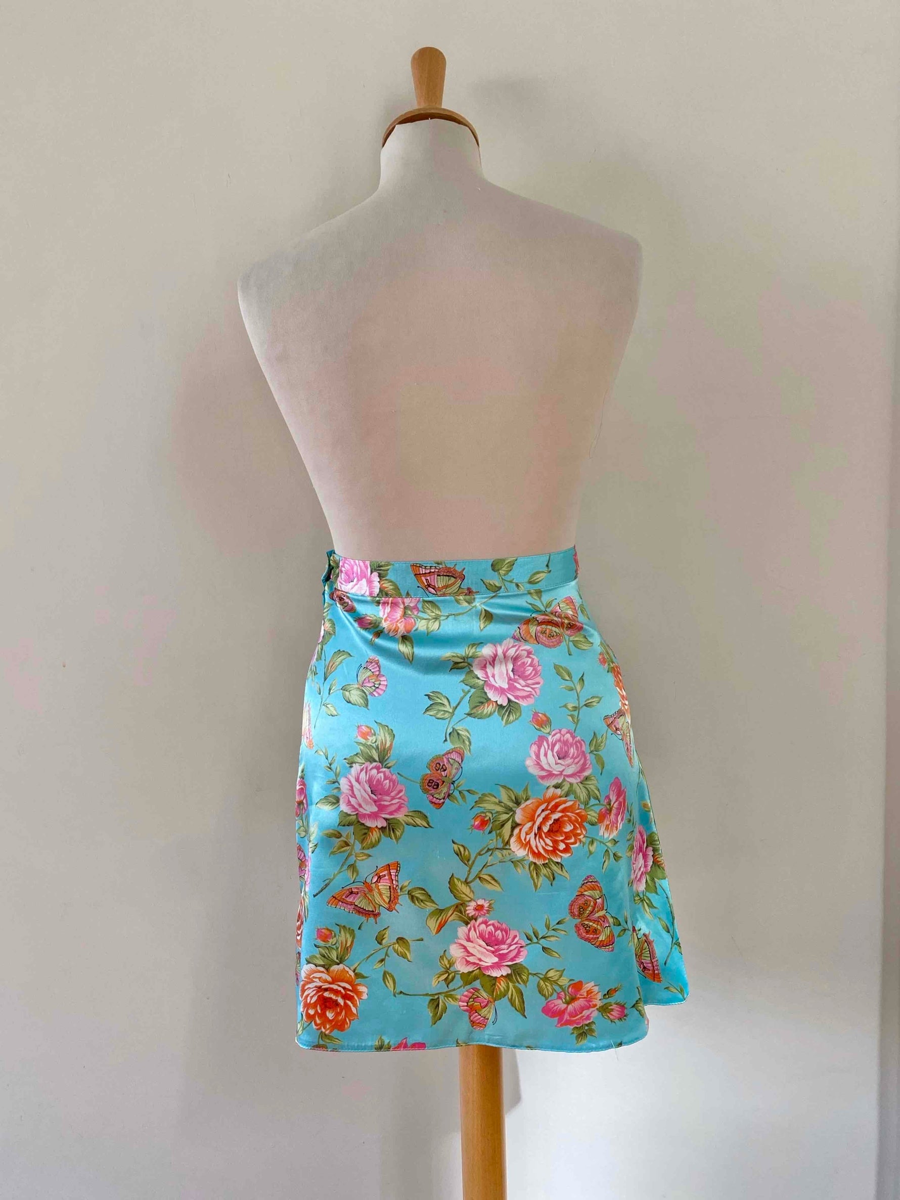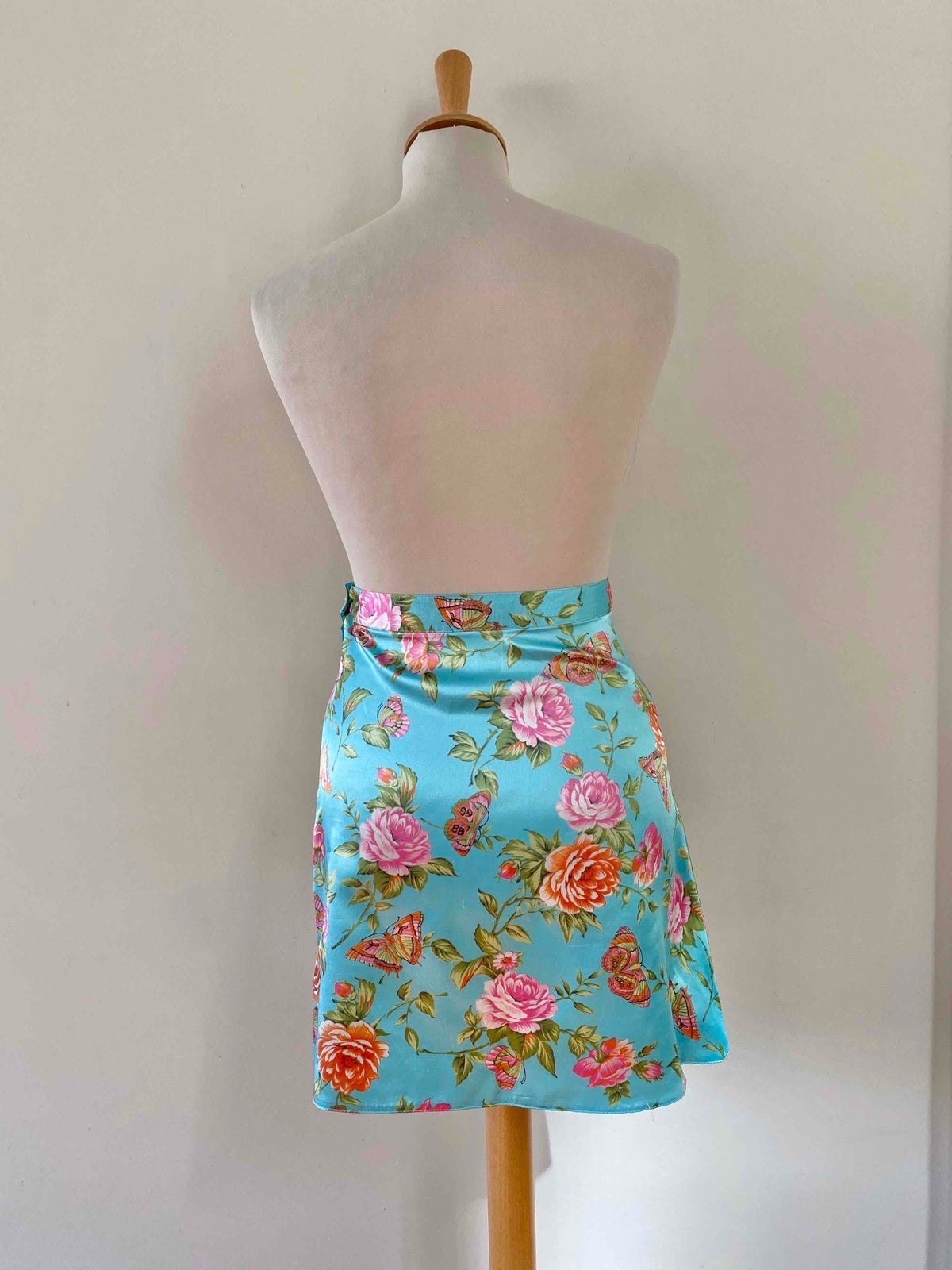 Prix unitaire parMini jupe en satin bleu ciel imprimée fleurs roses et papillons, forme trapèze, fabriquée en France, années 90’s, taille 34 portée ici serrée sur un mannequin T36.