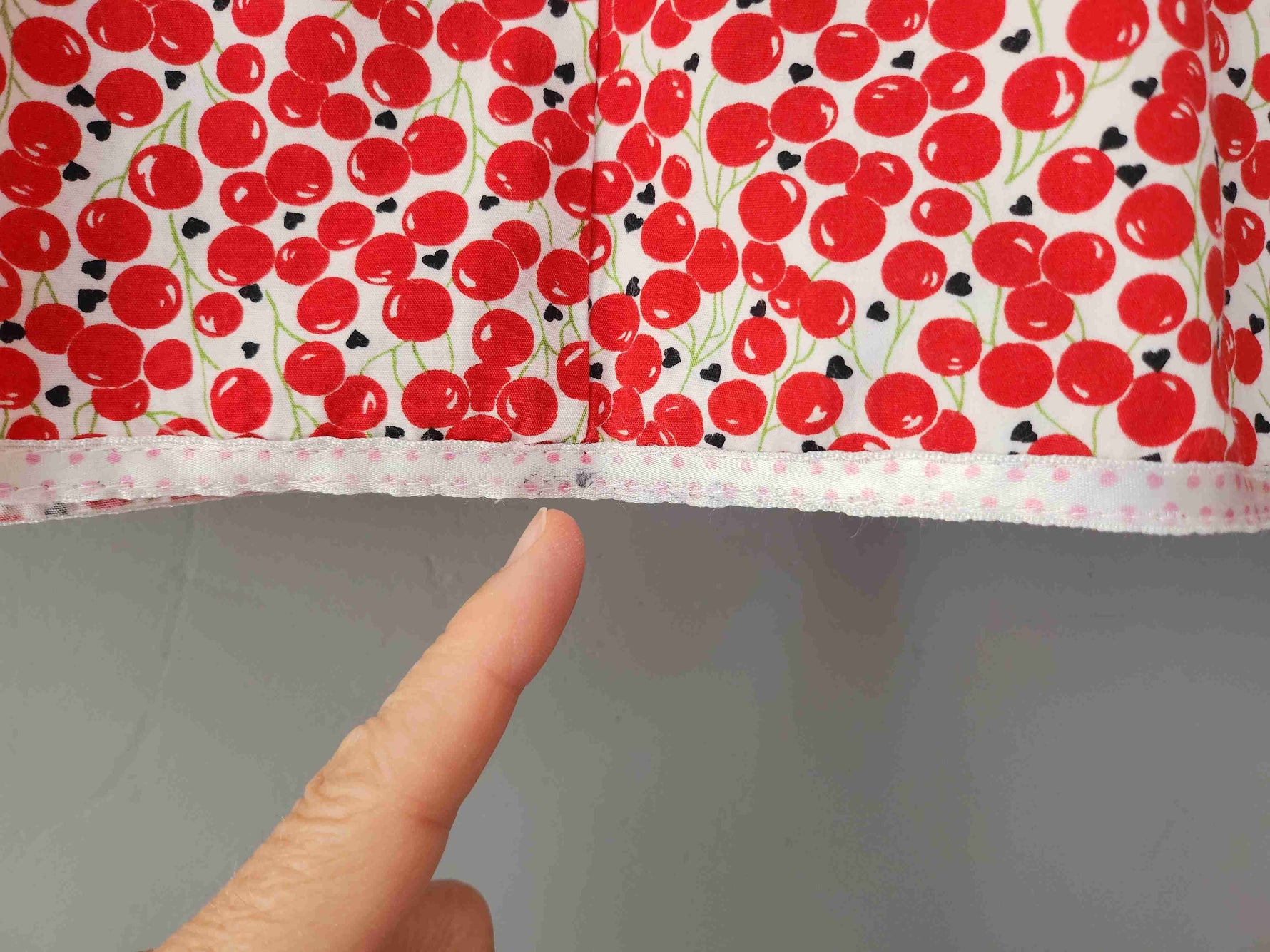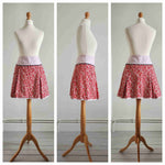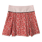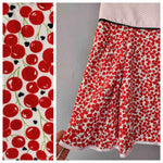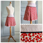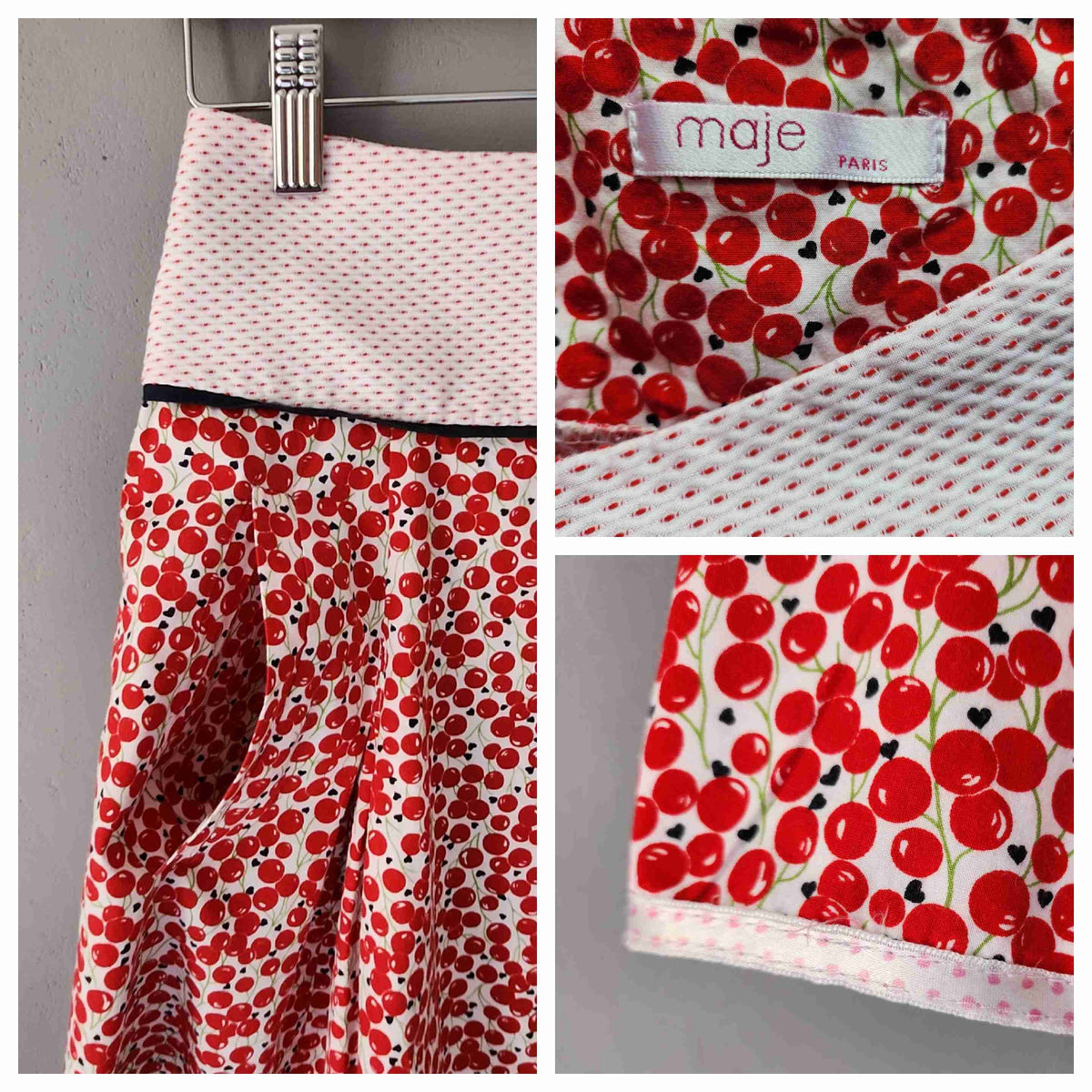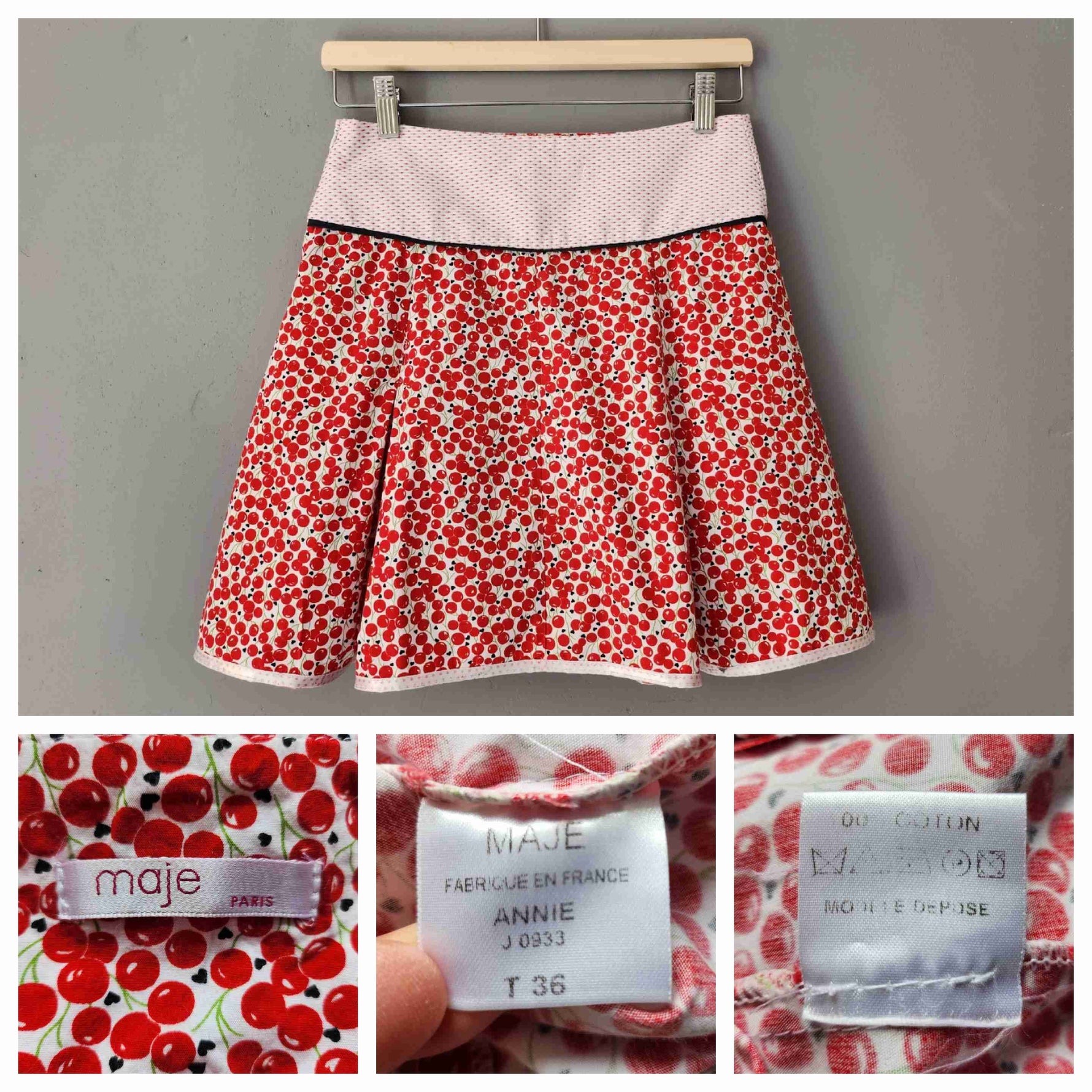 Prix unitaire parMini-jupe trapèze, en coton imprimé cerises rouges sur fond blanc, à plis creux devant et derrière, large empiècement taille, poches invisibles latérales, finition ruban satin à petits pois au bas. Fermeture éclair côté. Fabriqué en France.