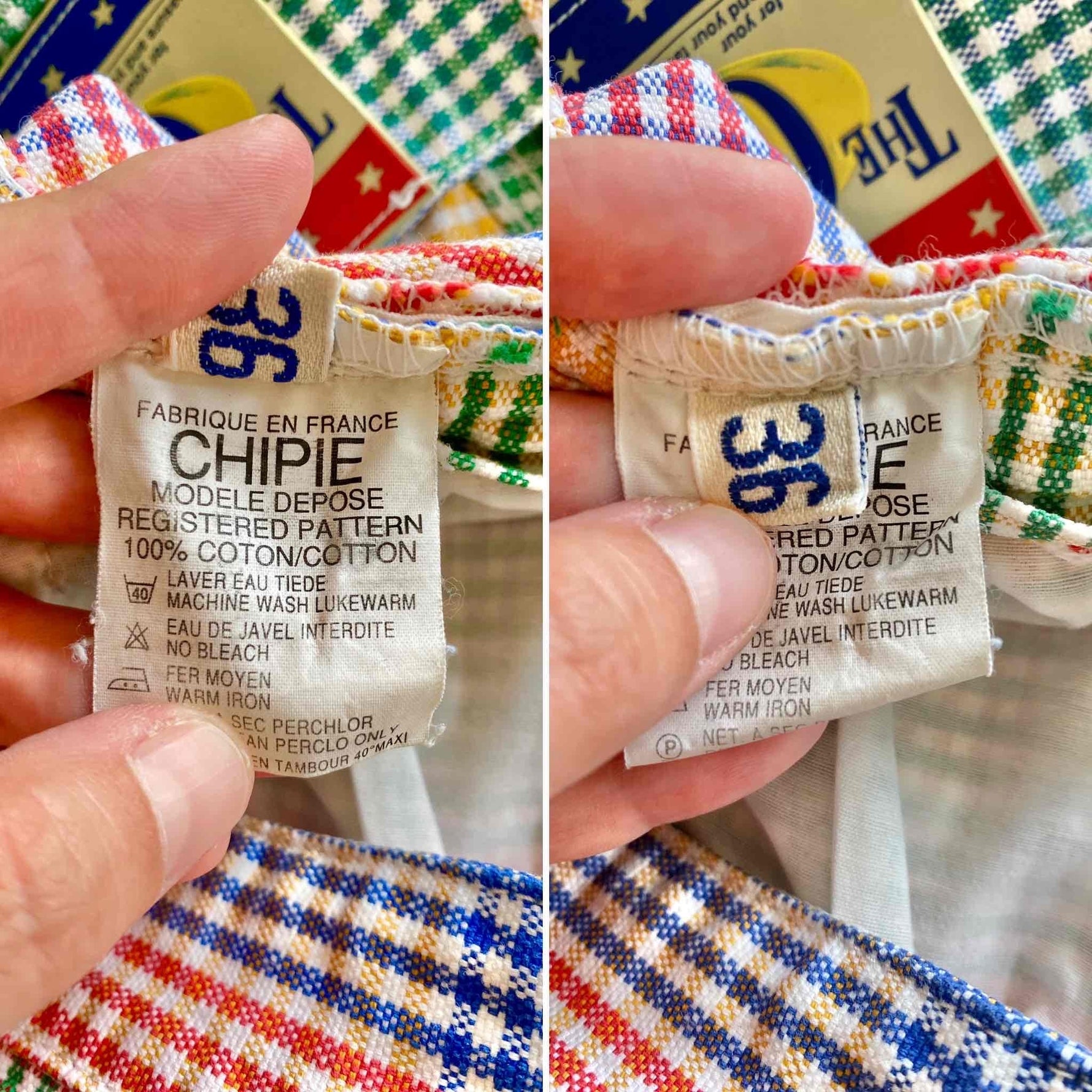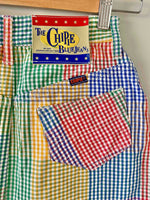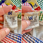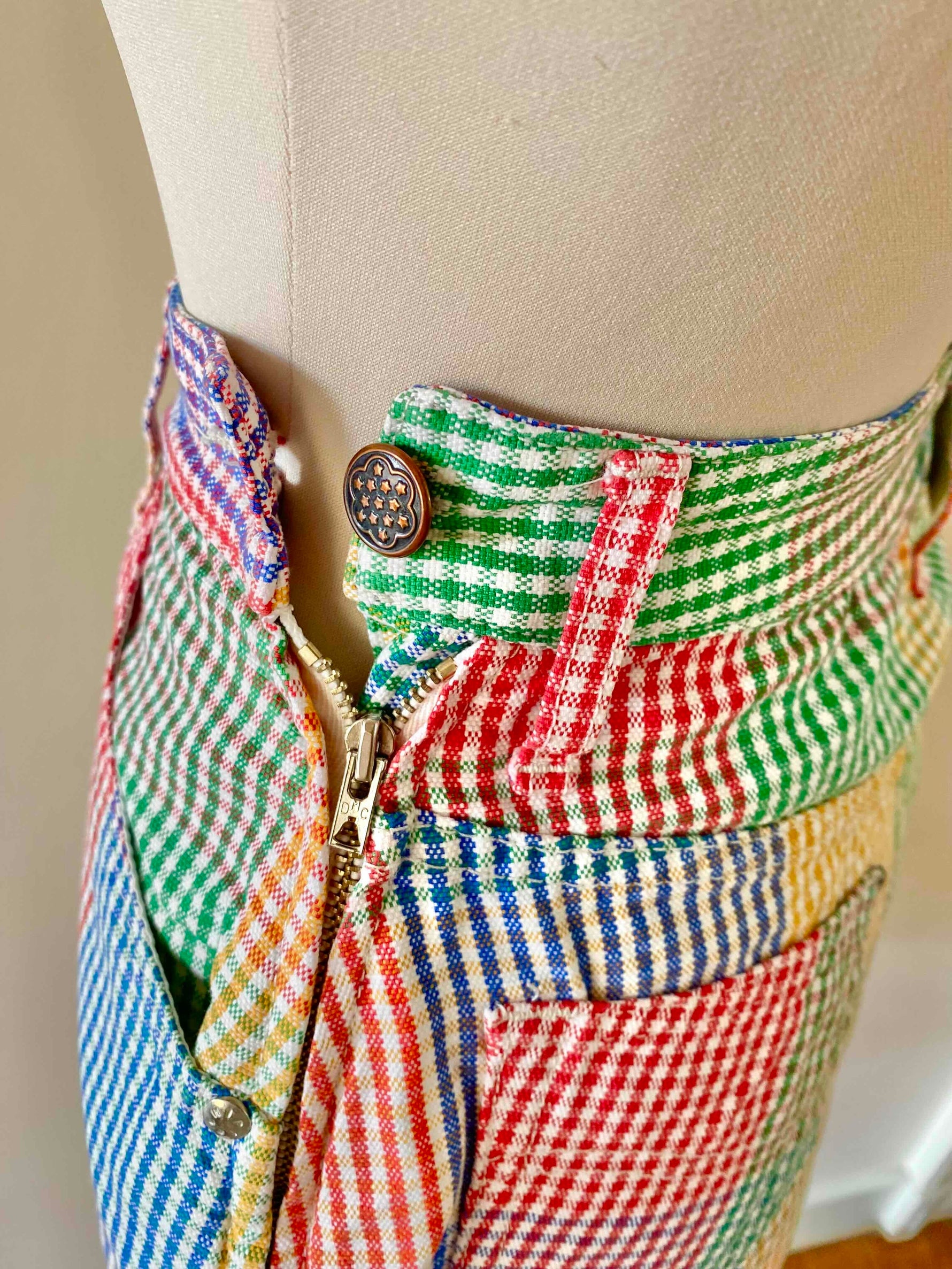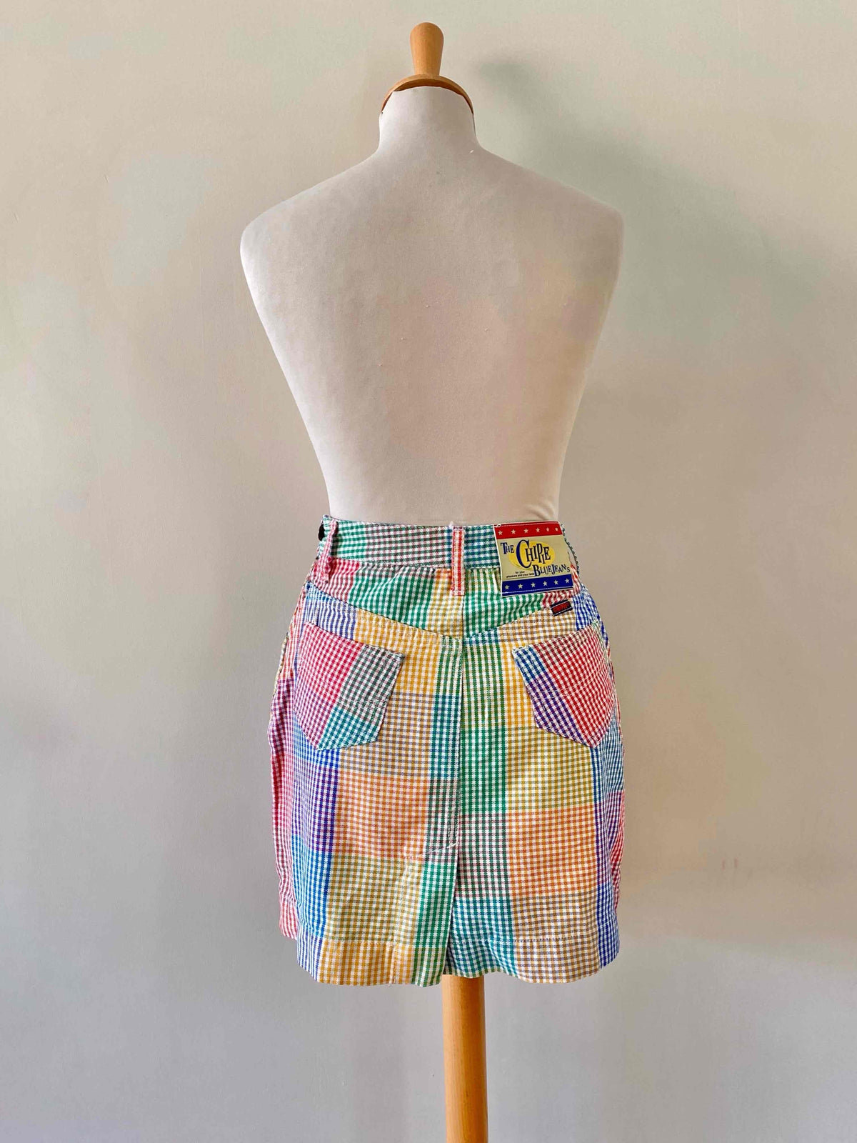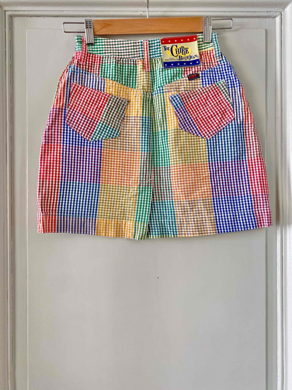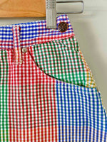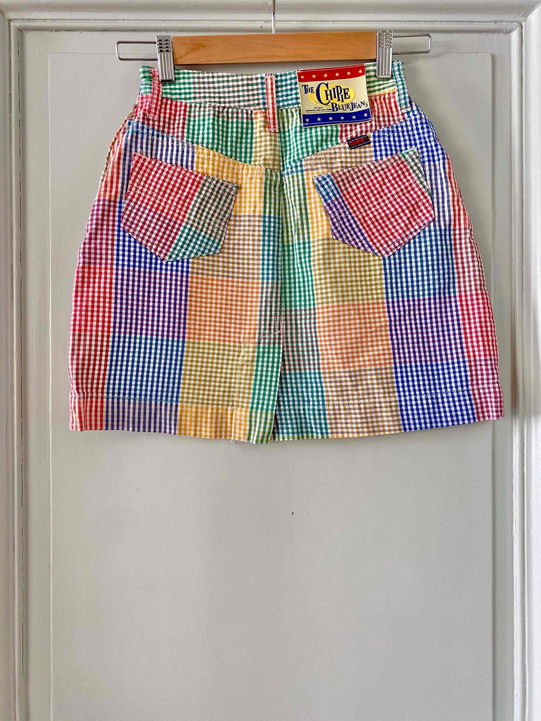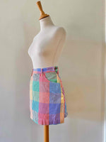 Prix unitaire parMini jupe denim vichy, en coton jeans fond blanc carreaux vichy rouges, jaunes, verts et bleus, taille haut, 5 poches, fermeture éclaire et bouton jeans sur le côté, Chipie 90’s, fabriquée en France, taille 34 actuelle portée ici ouverte sur un mannequin T36.