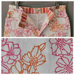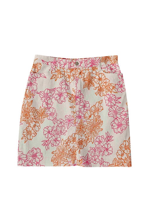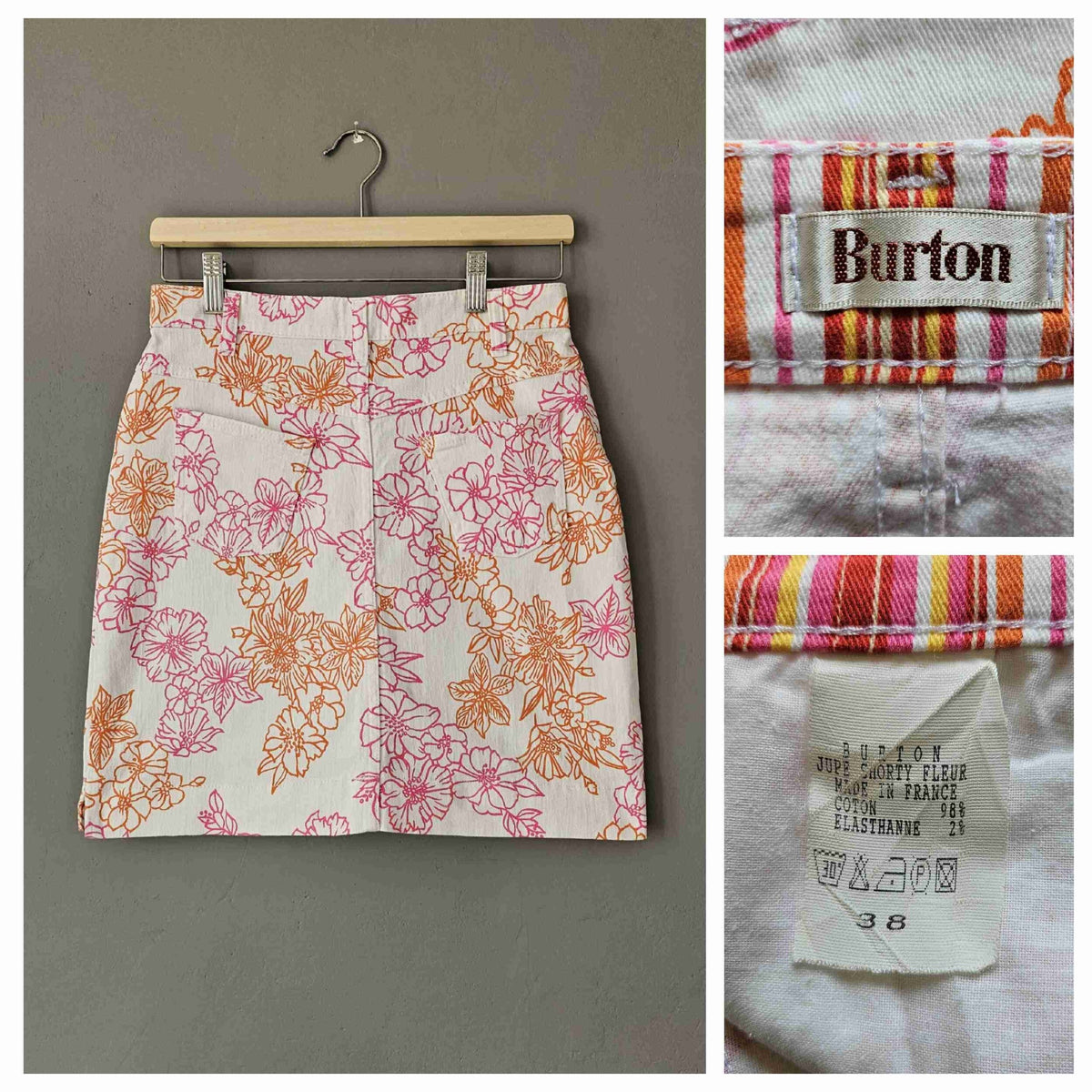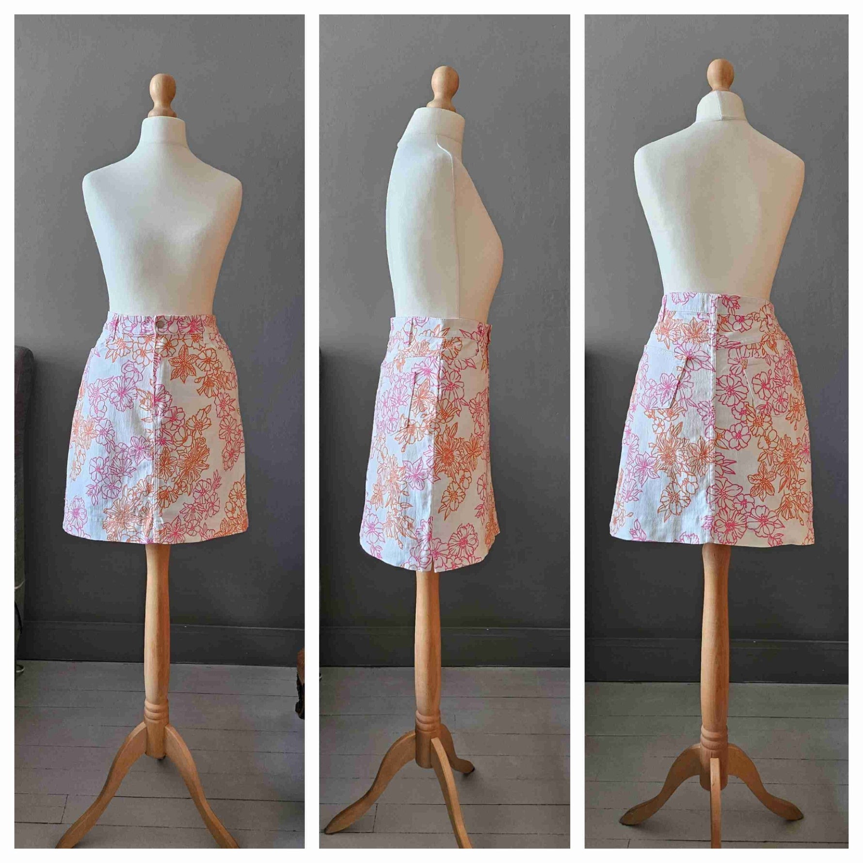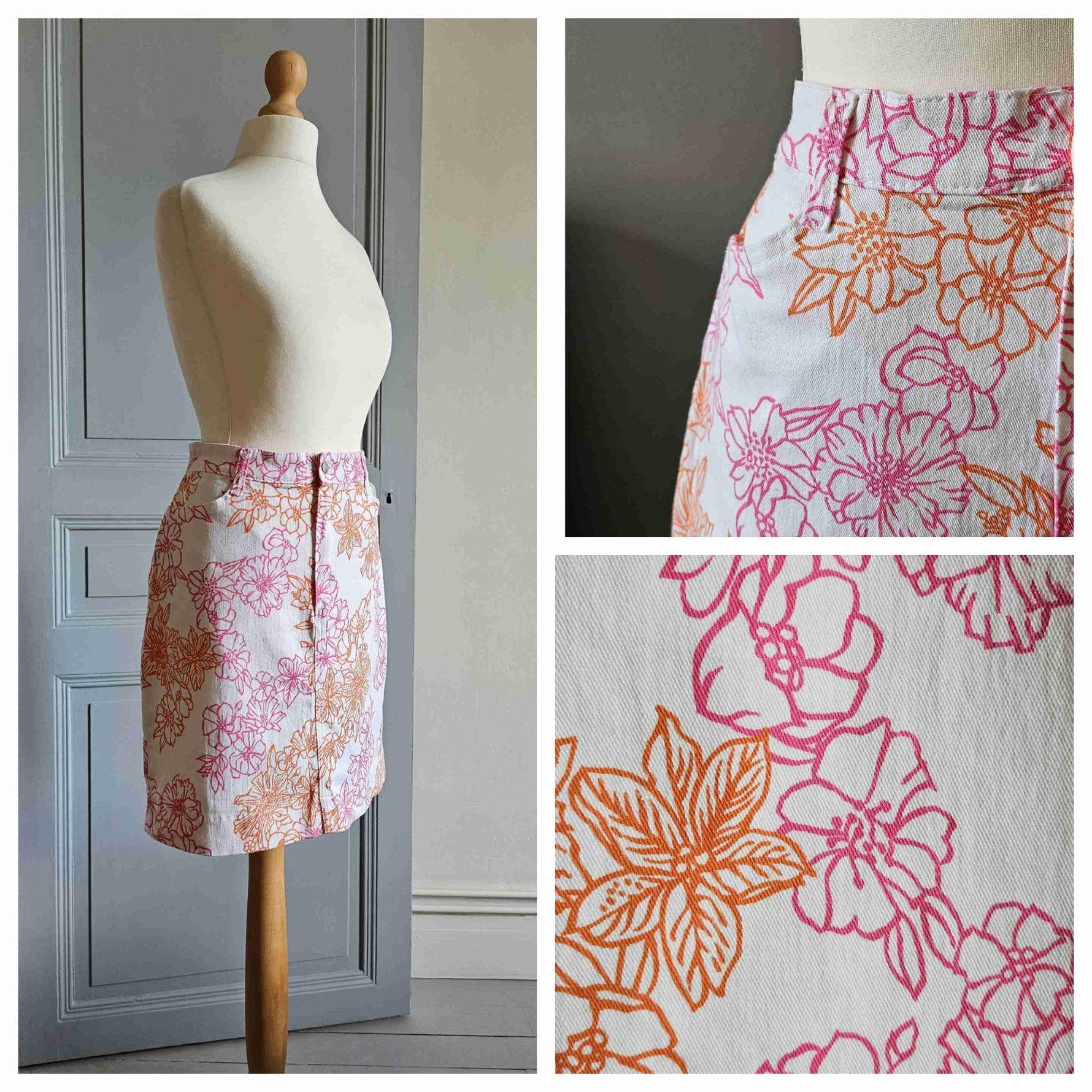 Prix unitaire parMini-jupe en denim blanc imprimé fleurs corail et rose bonbon, taille haute, fermeture Éclair devant, poches avant et arrière, passants pour ceinture, mini fentes côtés. Marque Burton. Coton 98%. Fabriqué en France.