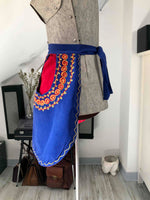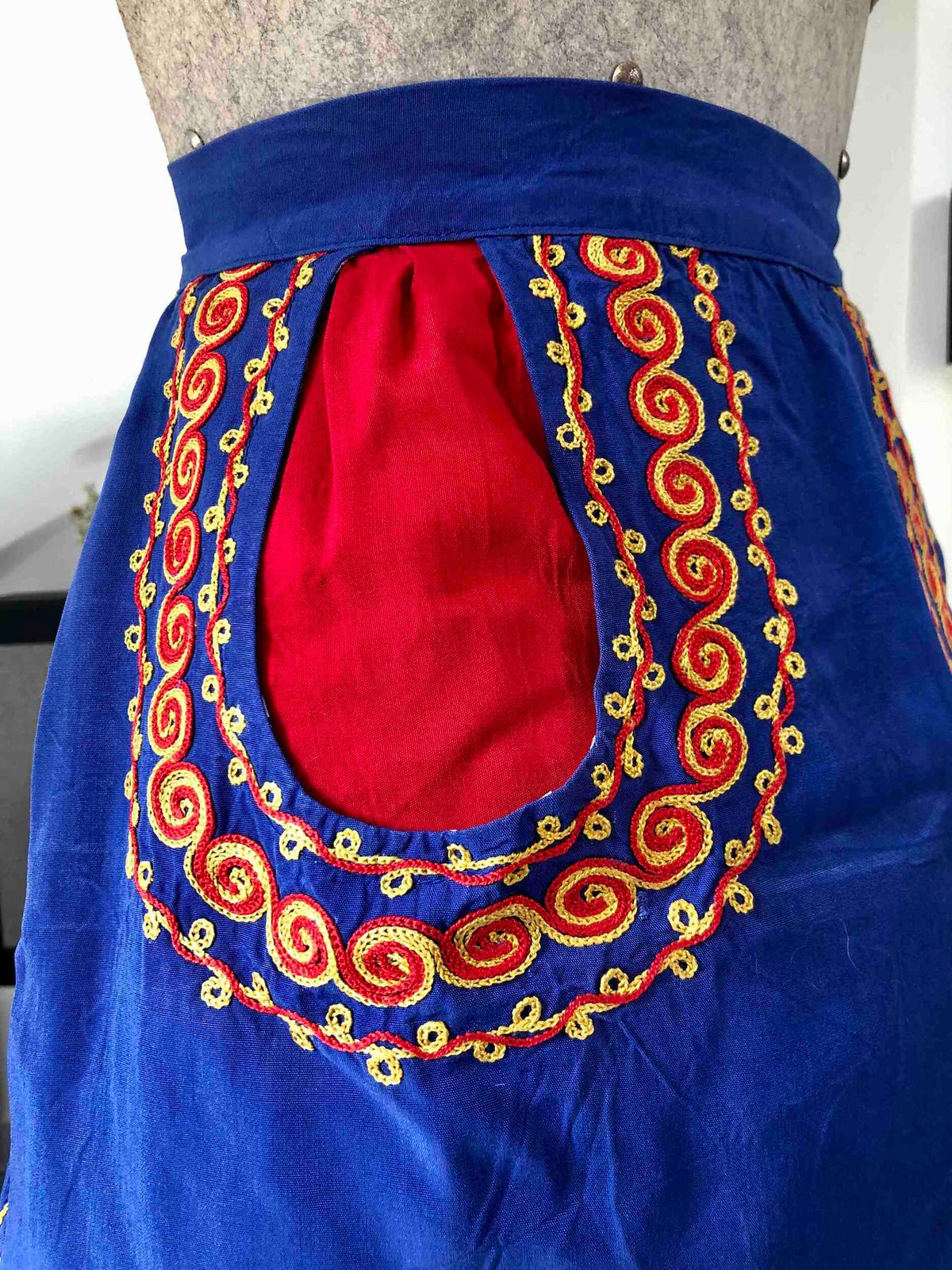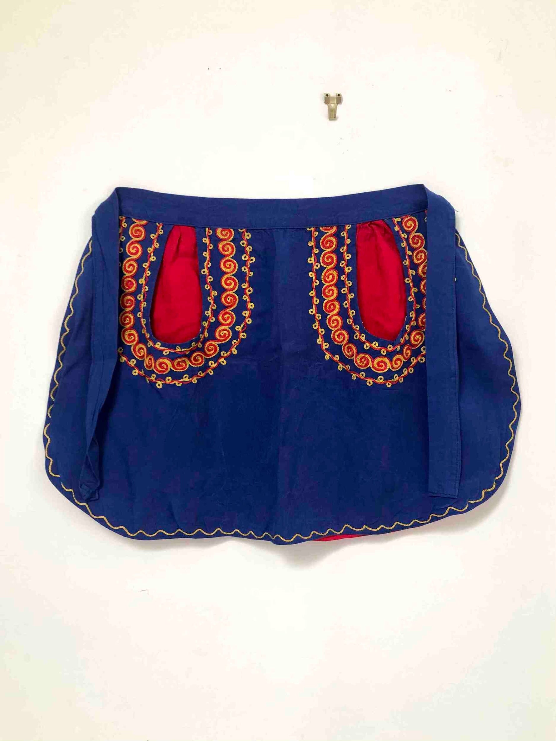 Prix unitaire parTablier en coton brodé. Une pièce vintage 70’s cousue main, avec poche et doublure. Taille unique.