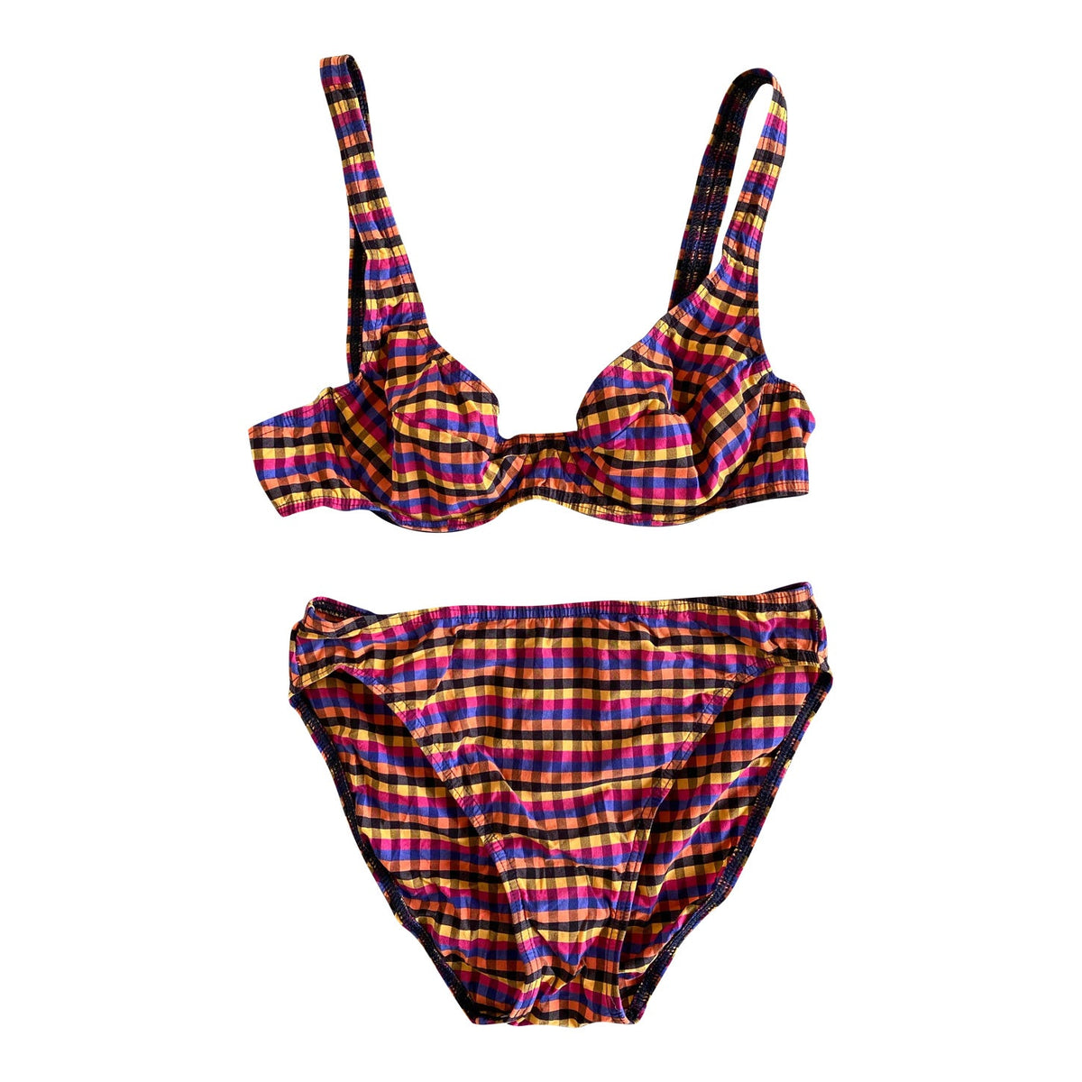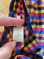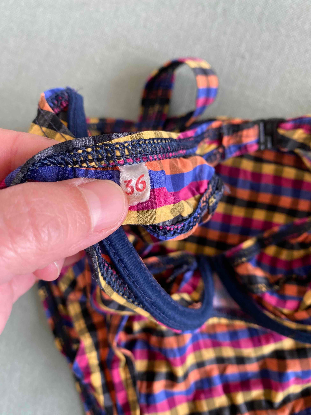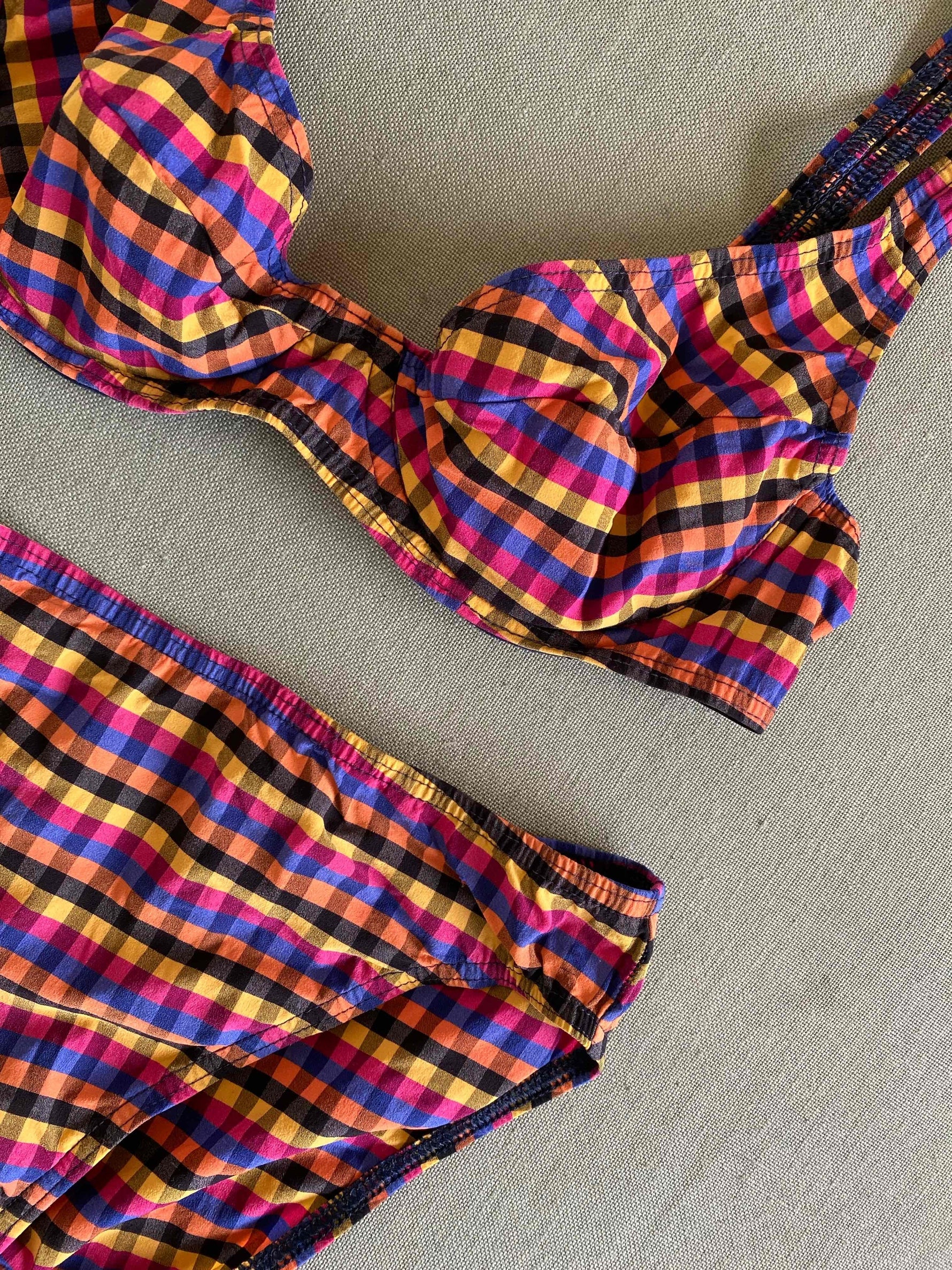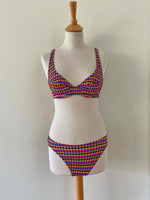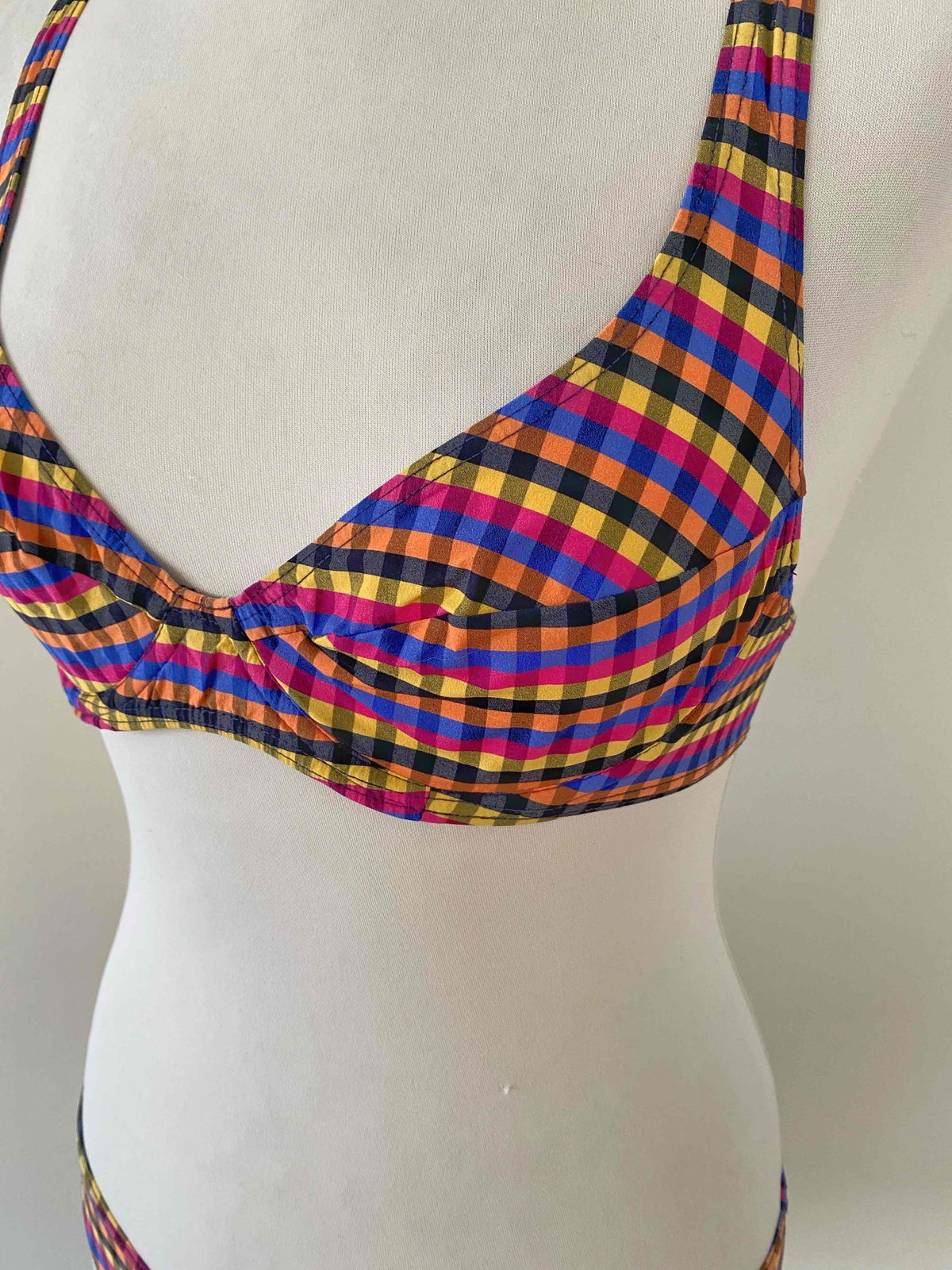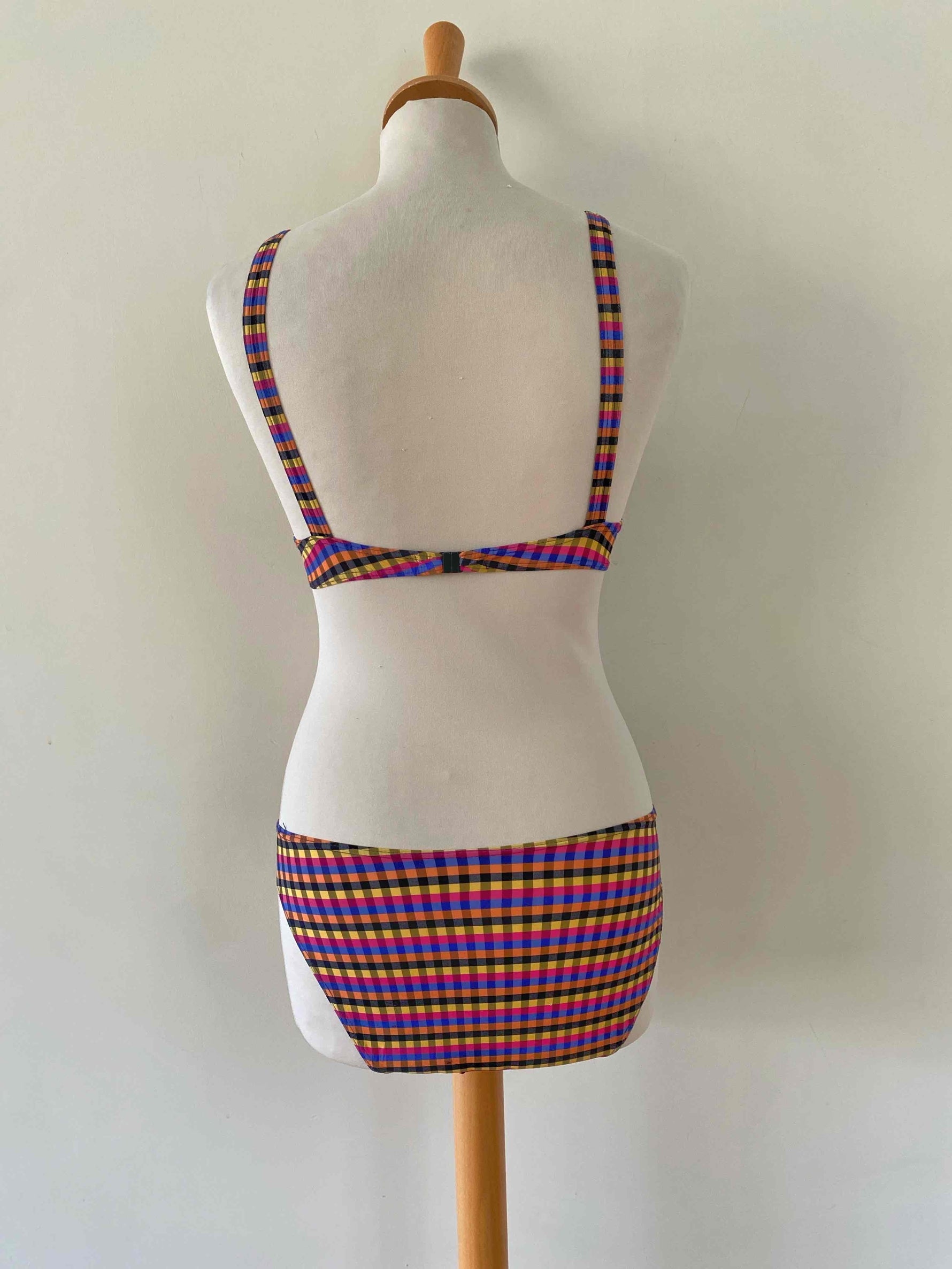 Prix unitaire parBikini vichy 80’s à carreaux vichy multicolores rose fuschias, bleu, jaunes et noirs, haut corbeille armaturé bonnet A, taille normal, fabriqué en France, taille 34 porté ici sur un mannequin T36.