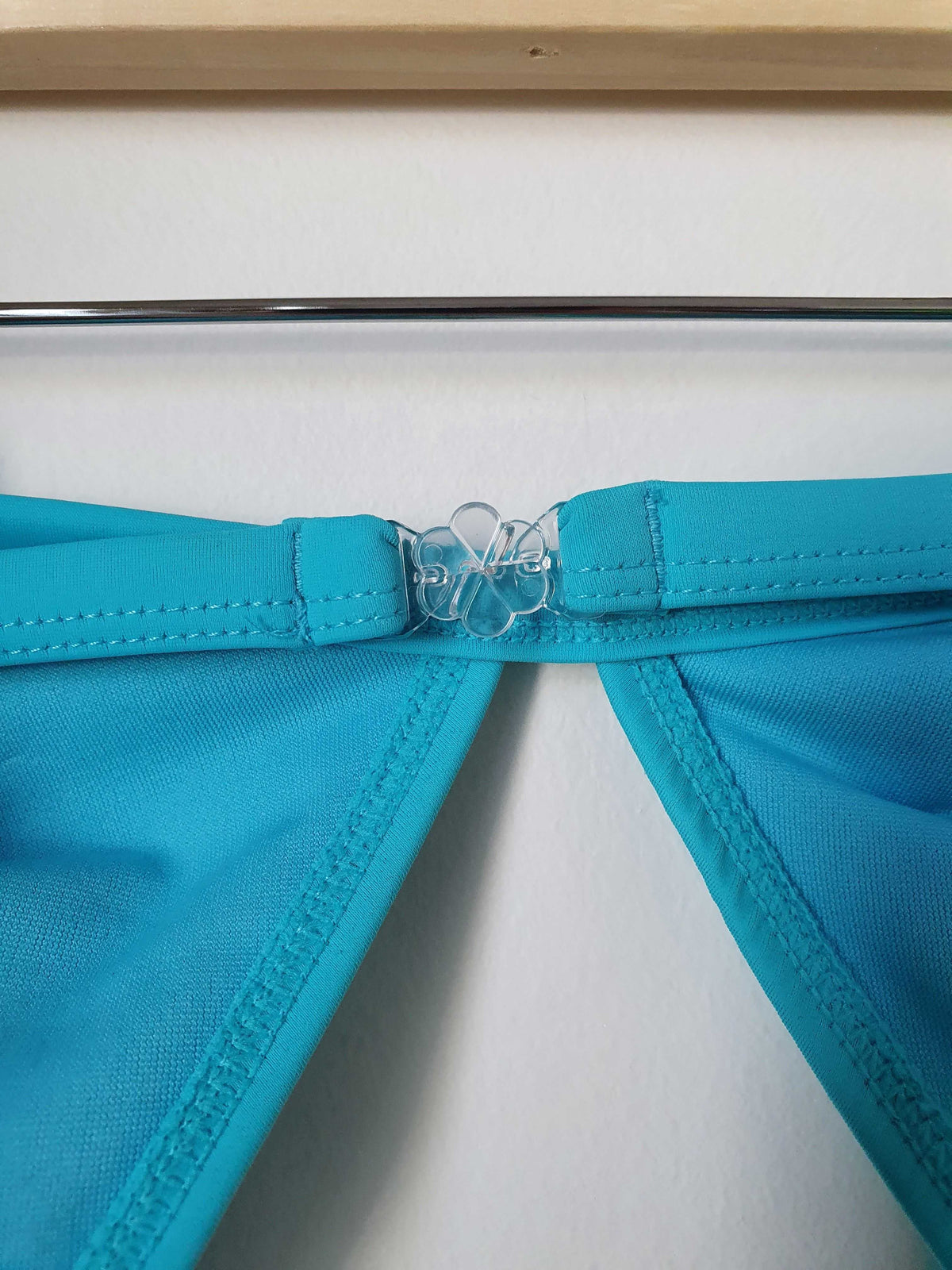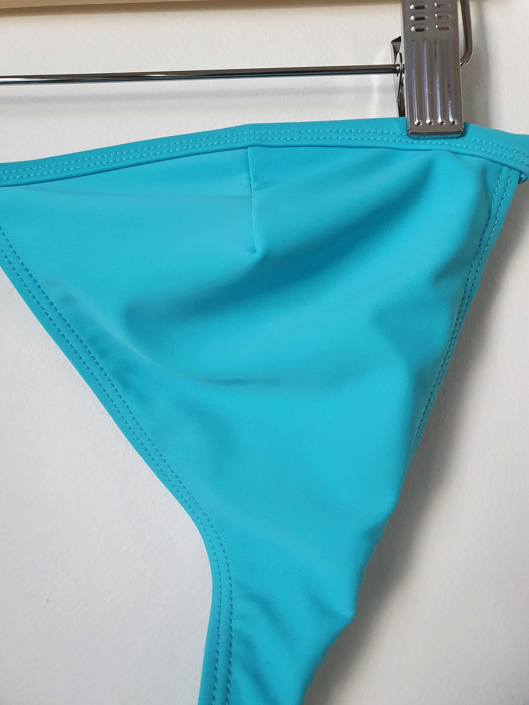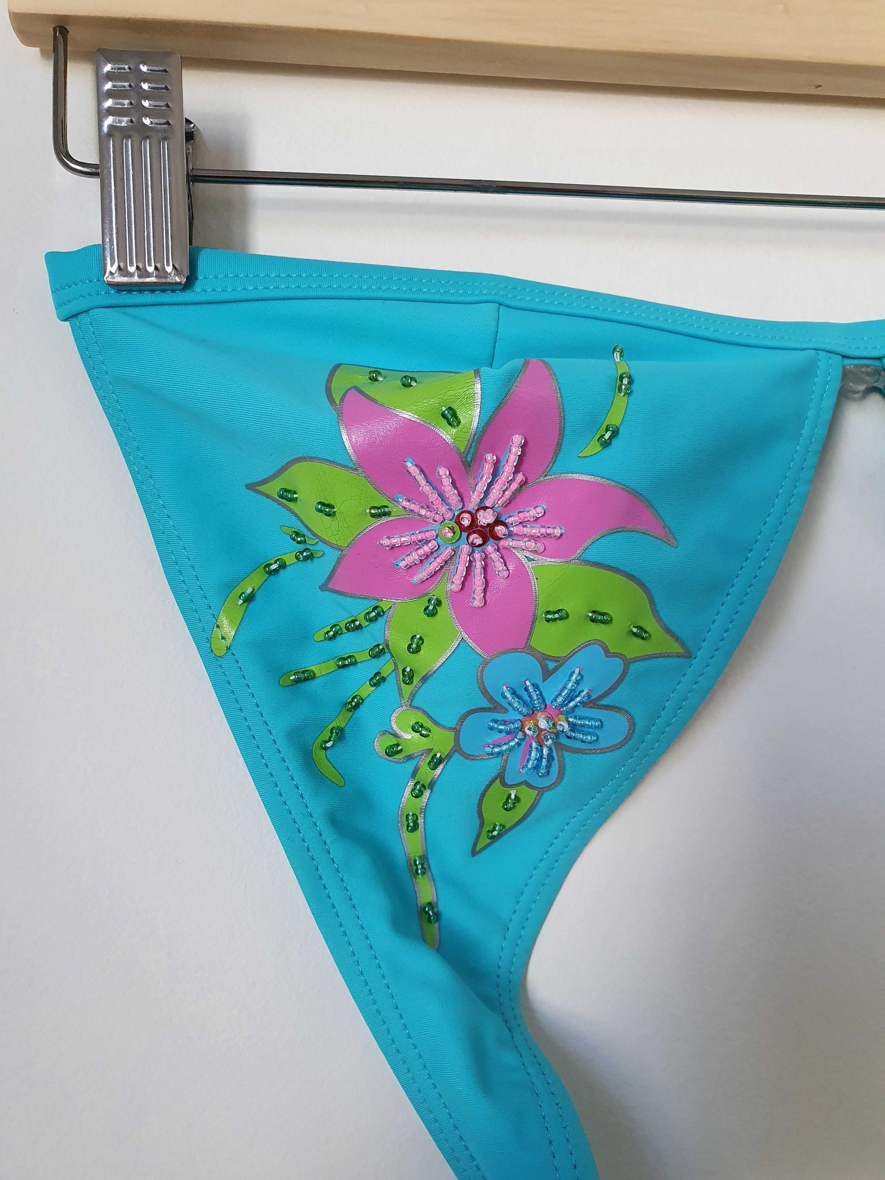 Prix unitaire parHaut de bikini, triangle. Couleur turquoise. Fleurs en perles. Taille M/38.