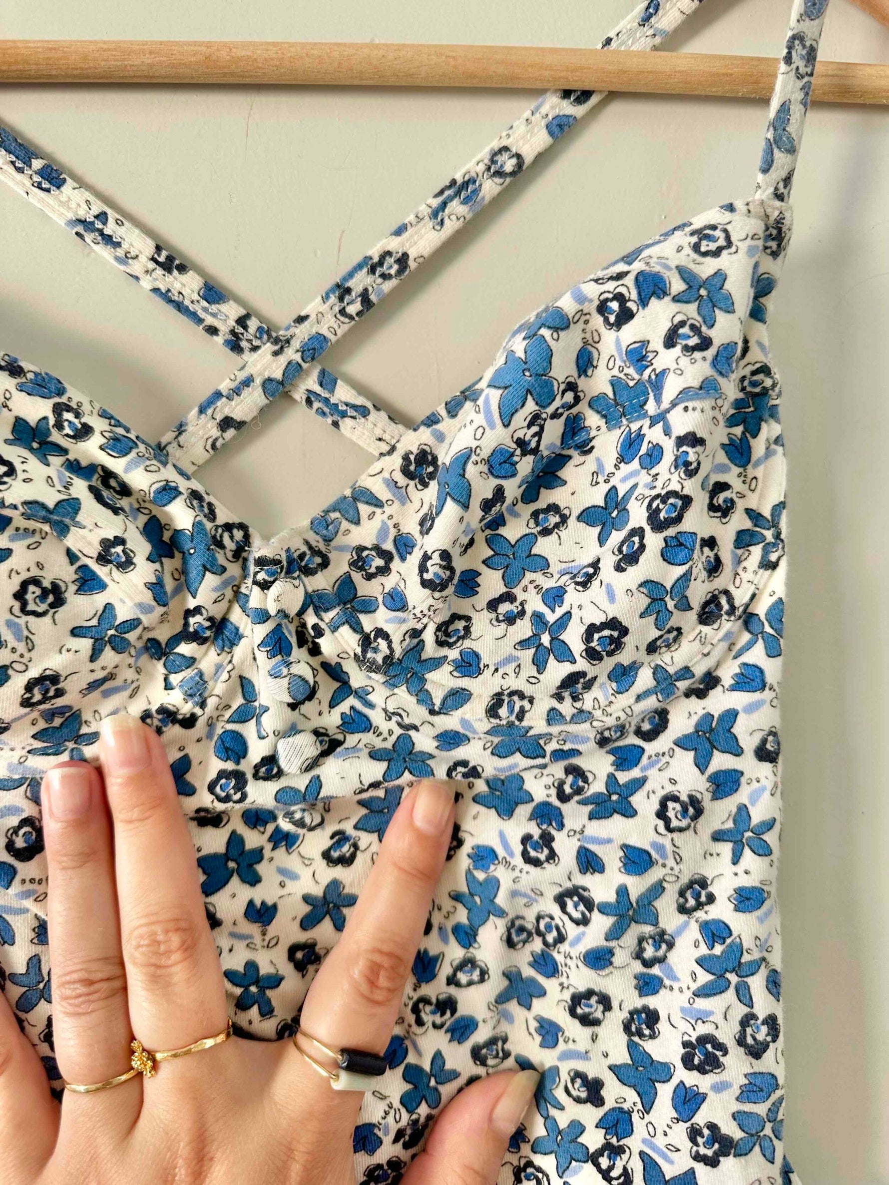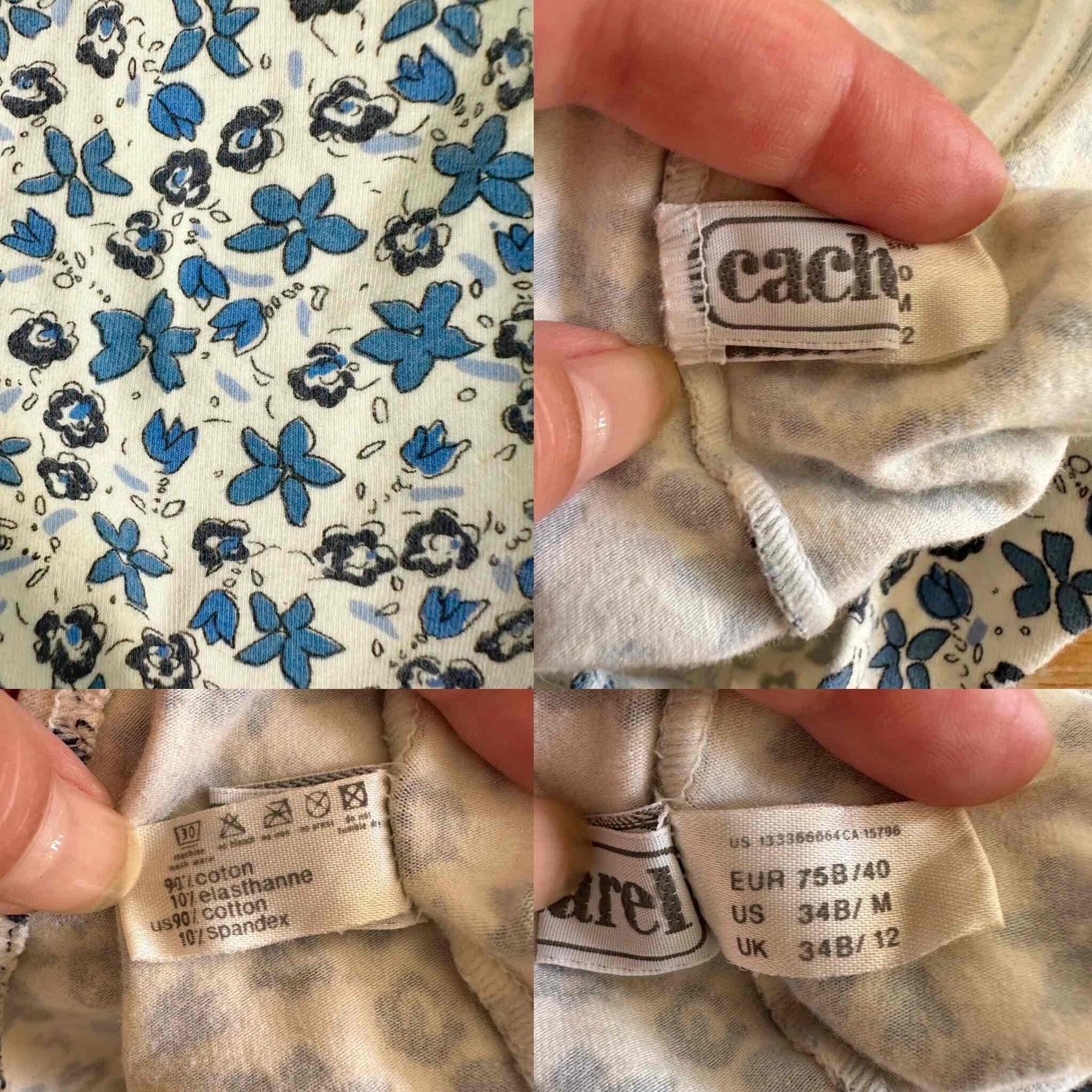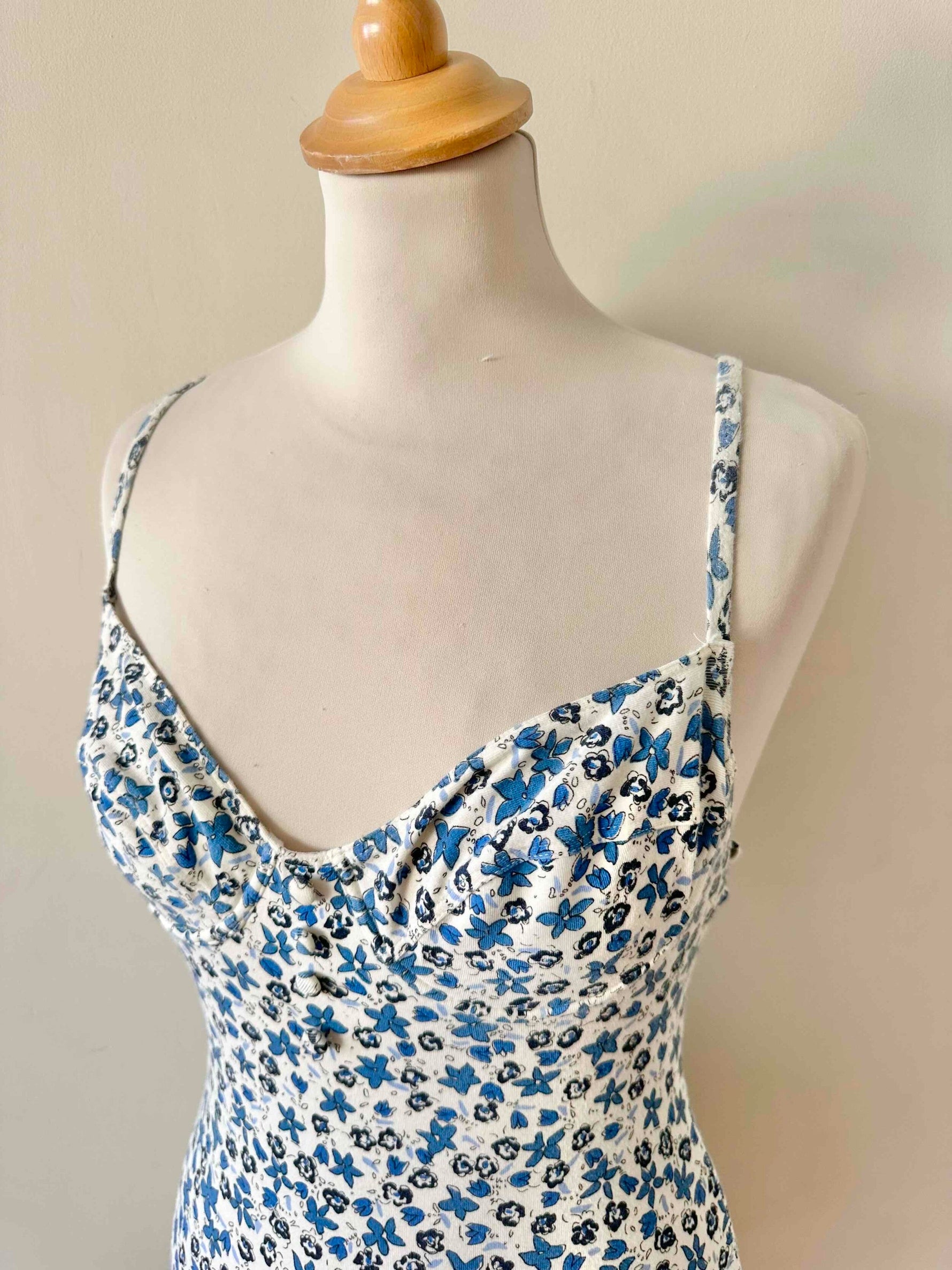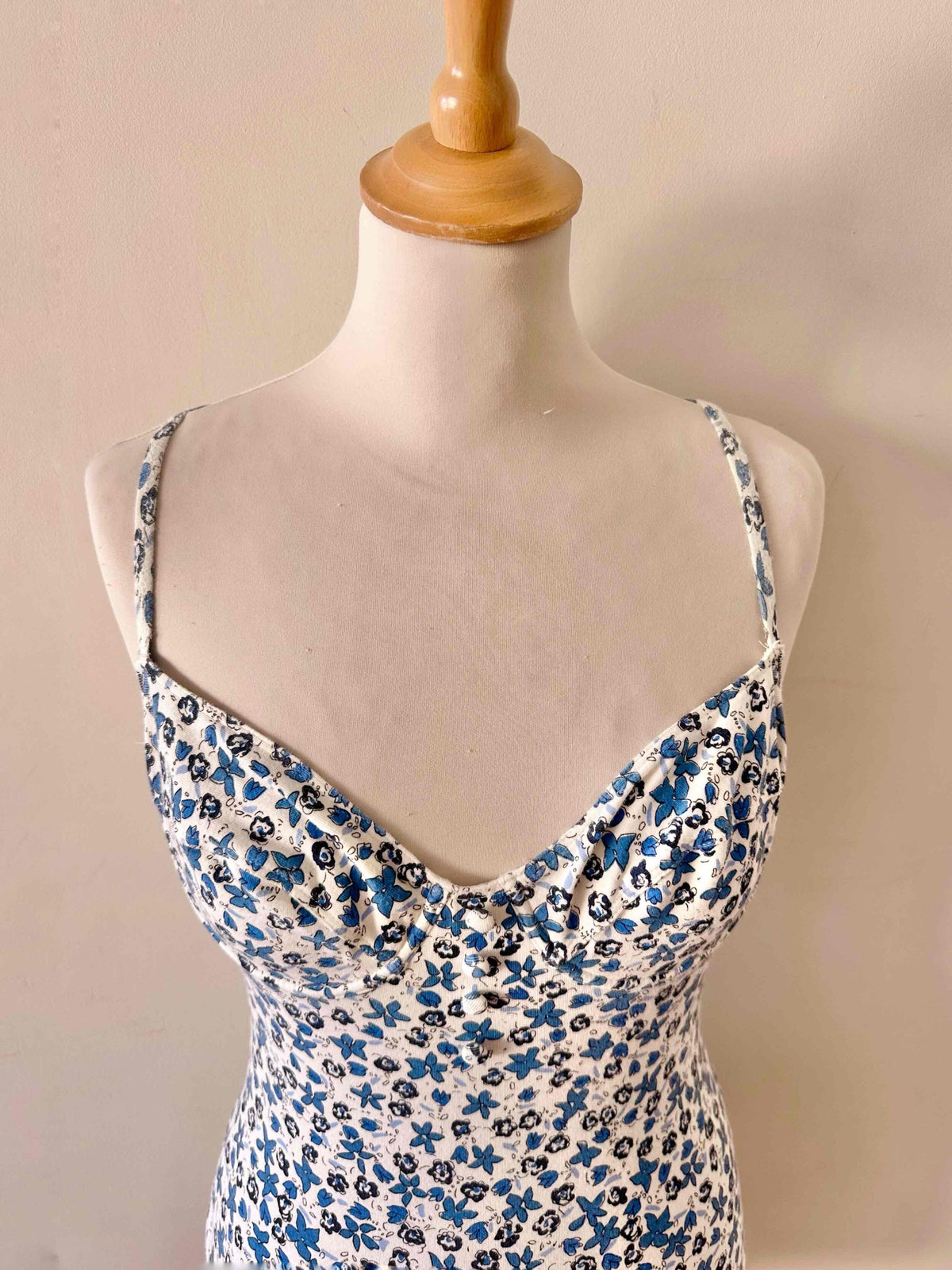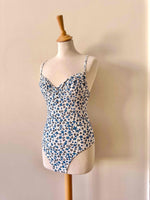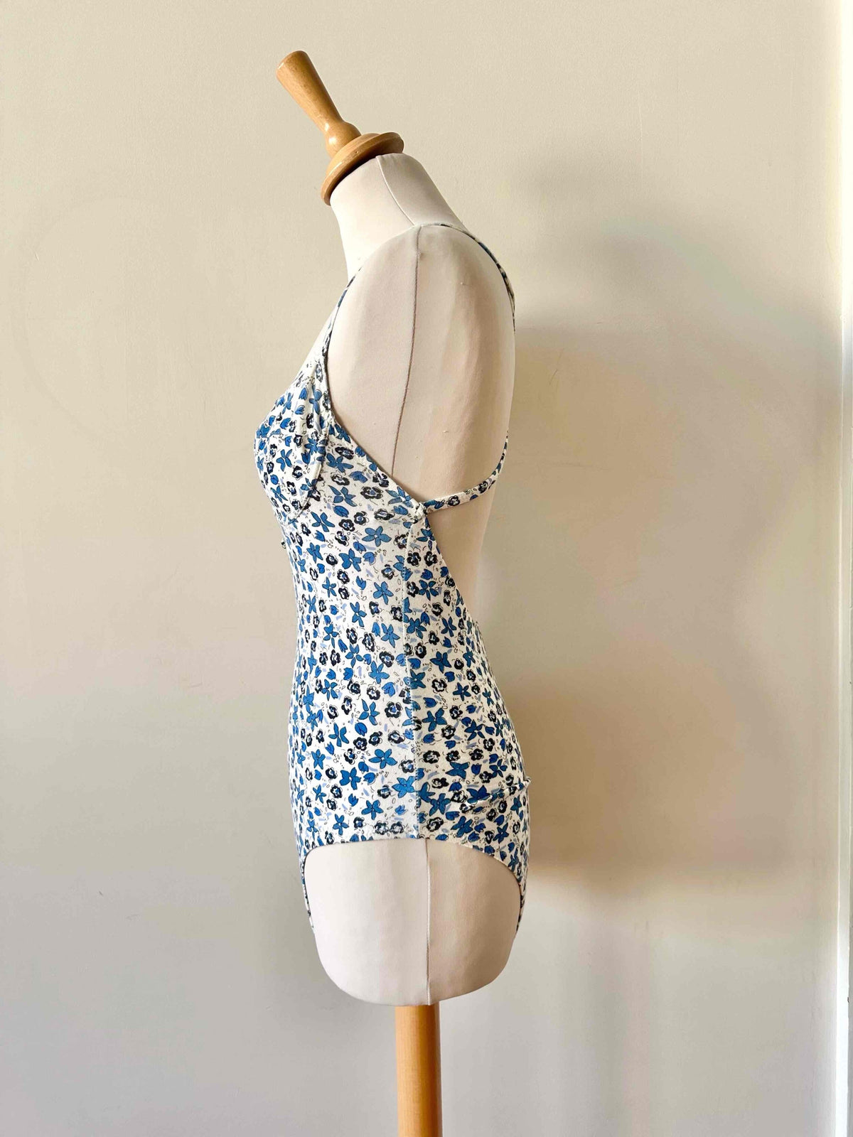 Prix unitaire parMaillot de bain Cacharel, en coton élasthanne blanc imprimé motifs petites fleurs bleues, dos nus plongeant et croisé à bretelles fines. Poitrine corbeille à armatures, petits boutons recouvertes milieu poitrine. À porter maillot de bain ou en body, taille 36, bonnet B porté ici sur un mannequin T36.