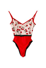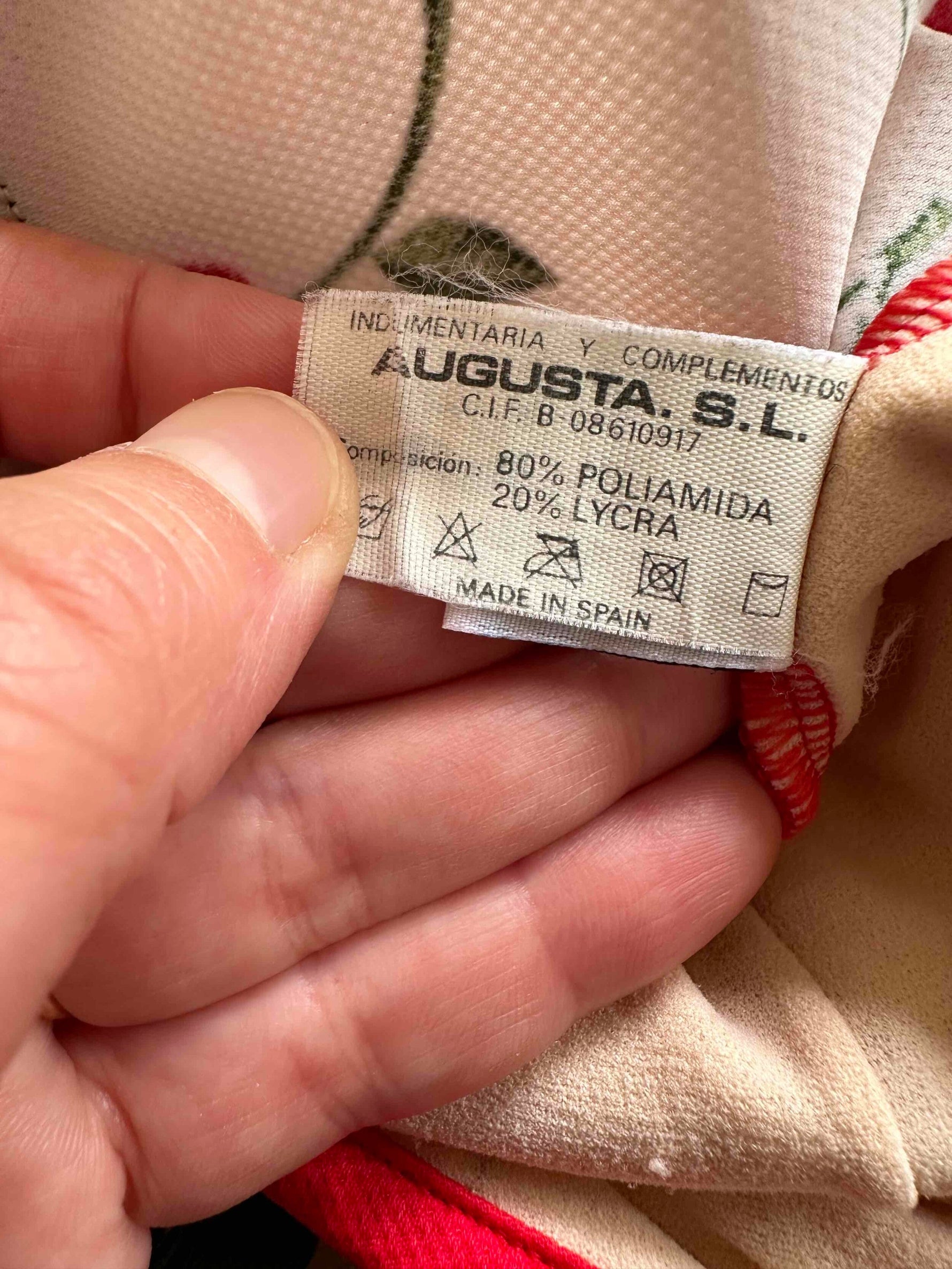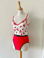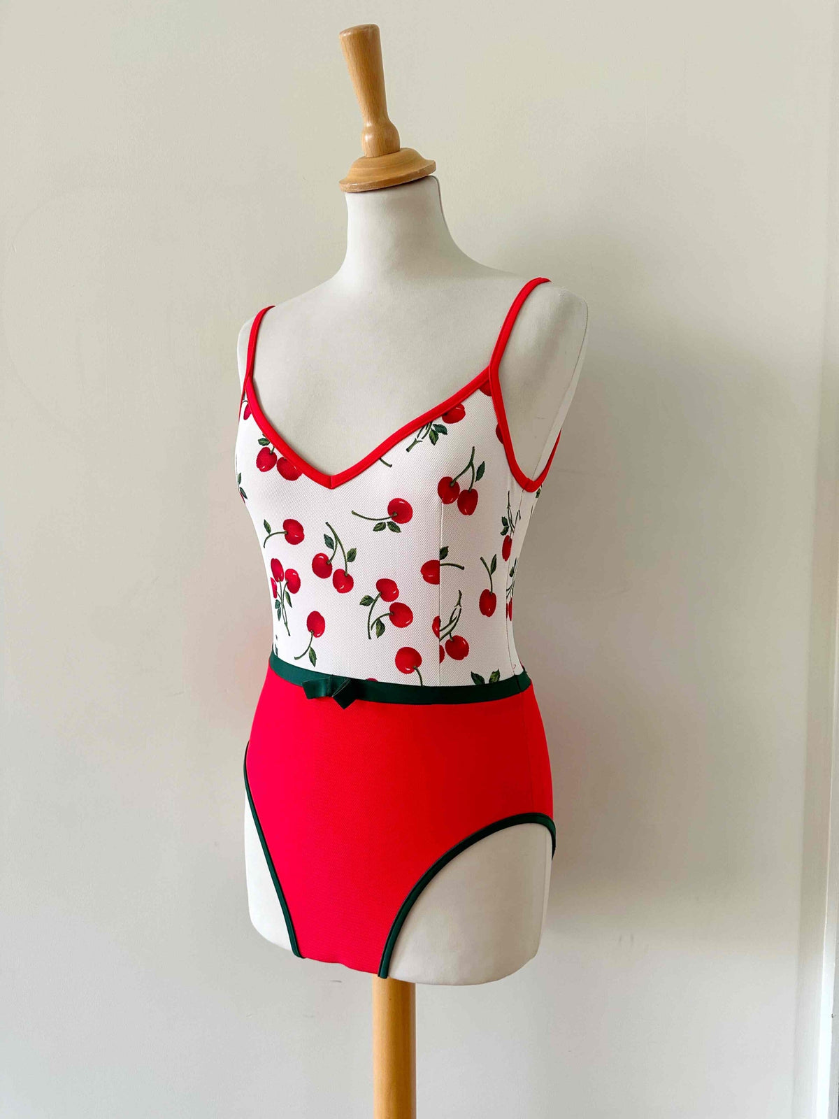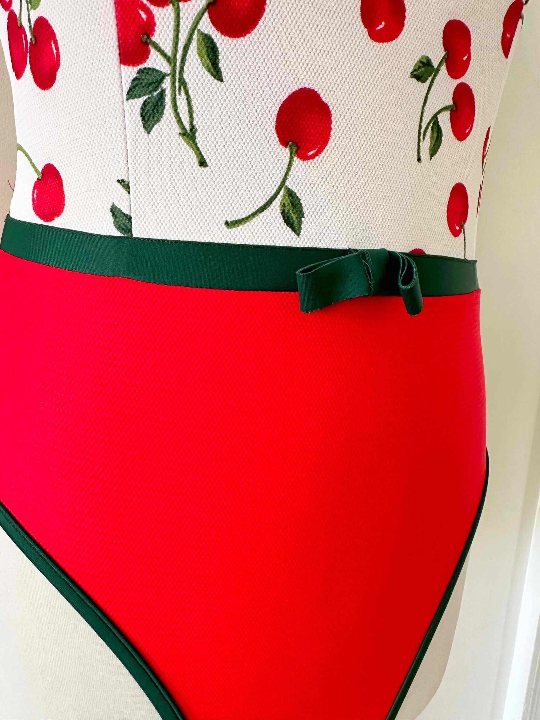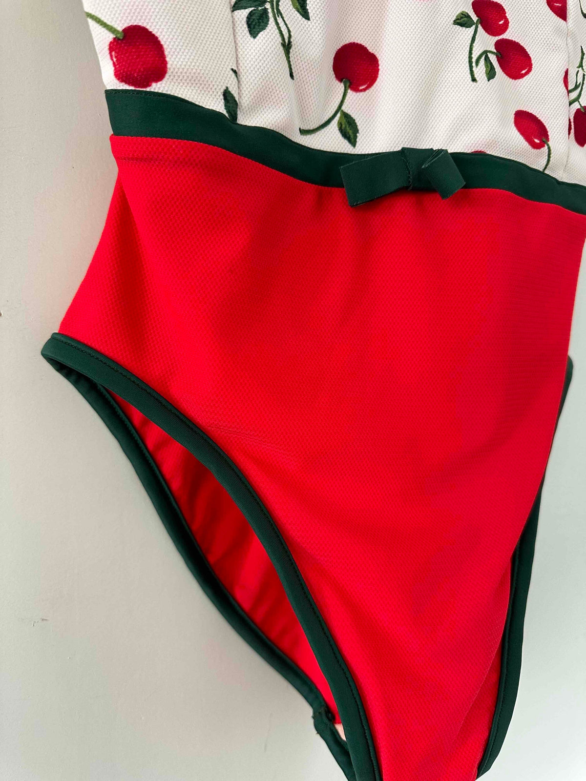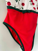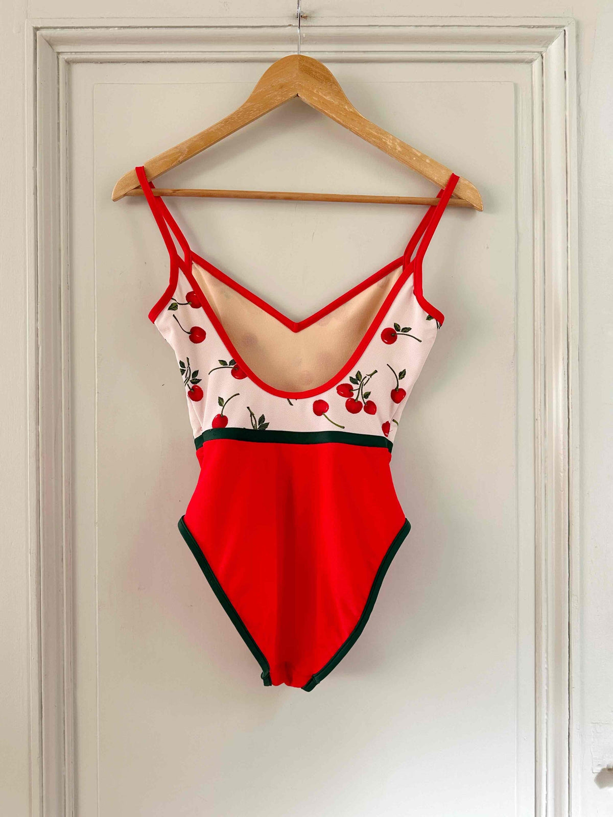 Prix unitaire parMaillot de bain cerise, une pièce gaufré effet piqué, imprimé blanc cerise rouge, bordures vertes, dos nu plongeant à nouer, années 90s, taille 34, porté ici sur un mannequin T36.