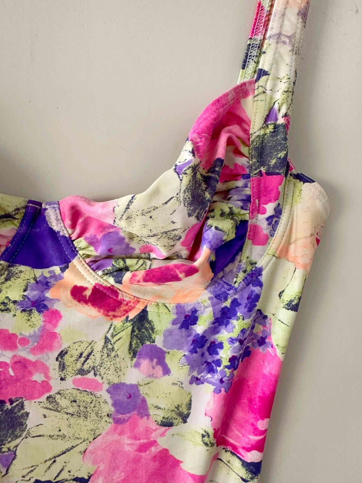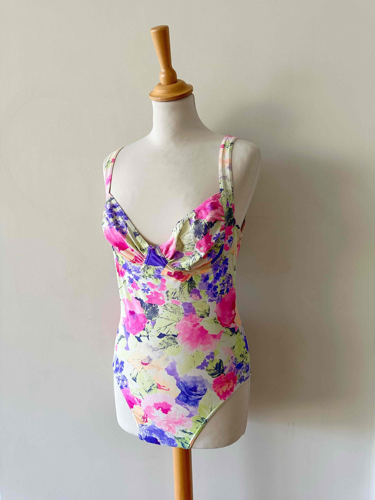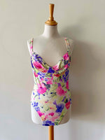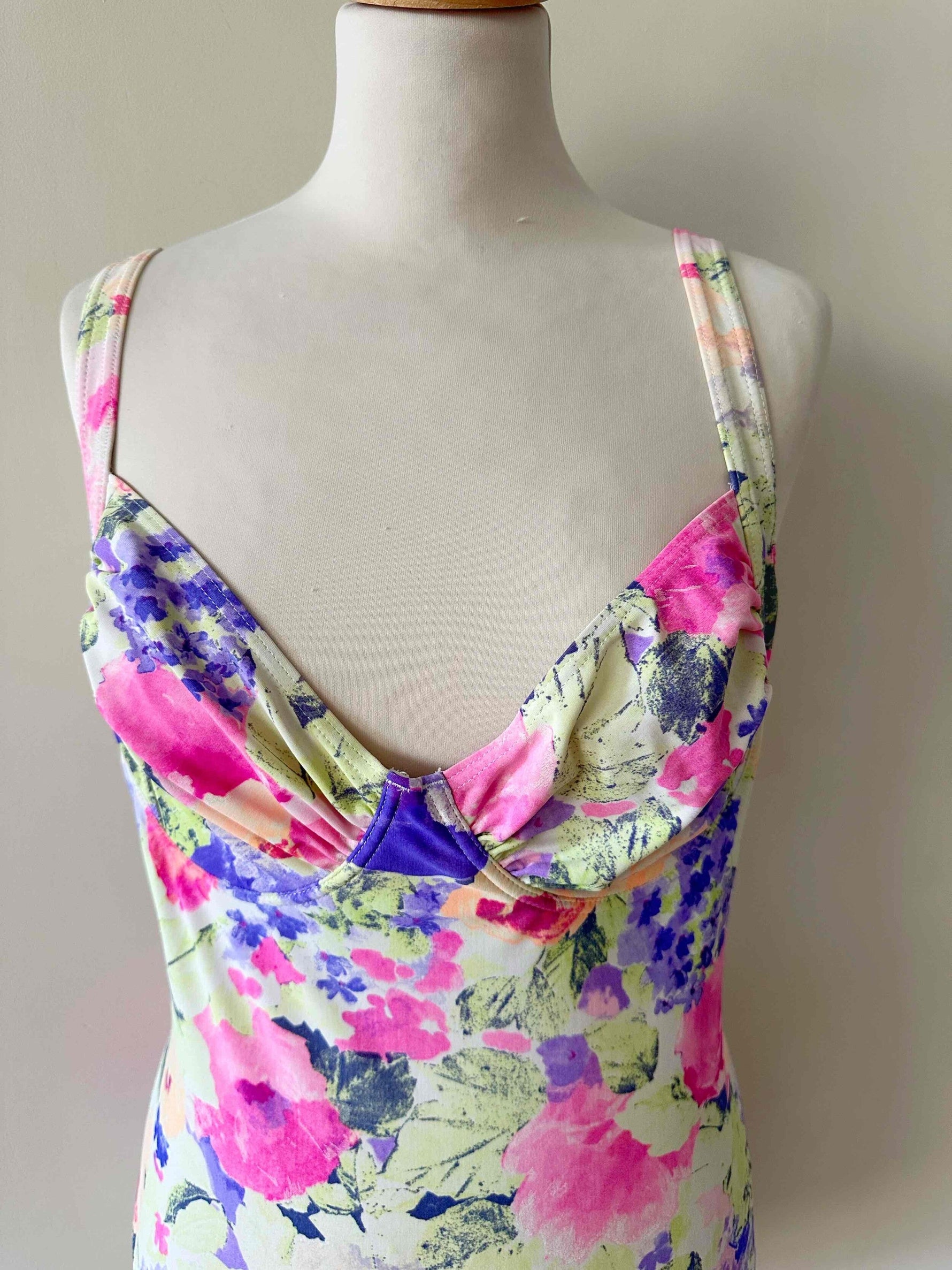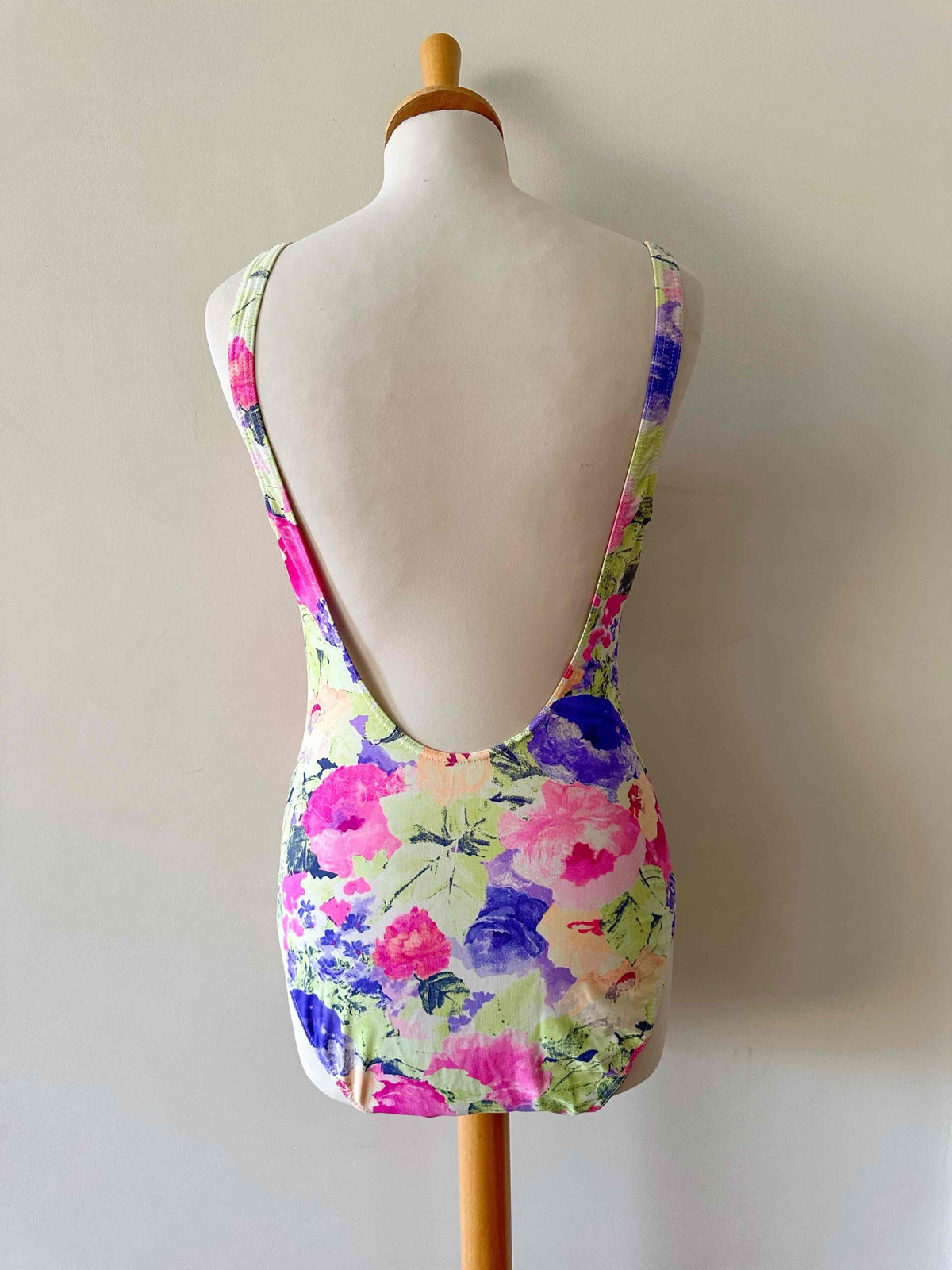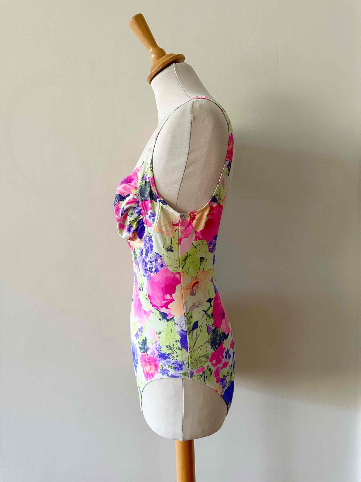 Prix unitaire parMaillot de bain à fleurs 90s, en lycra blanc imprimé fleurs multicolores fluo et pastels, poitrine armaturée et froncée, dos nu plongeant, taille 40 porté ici sur un mannequin T36.