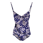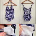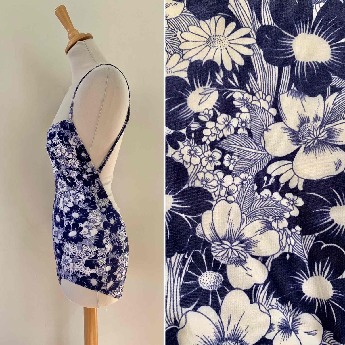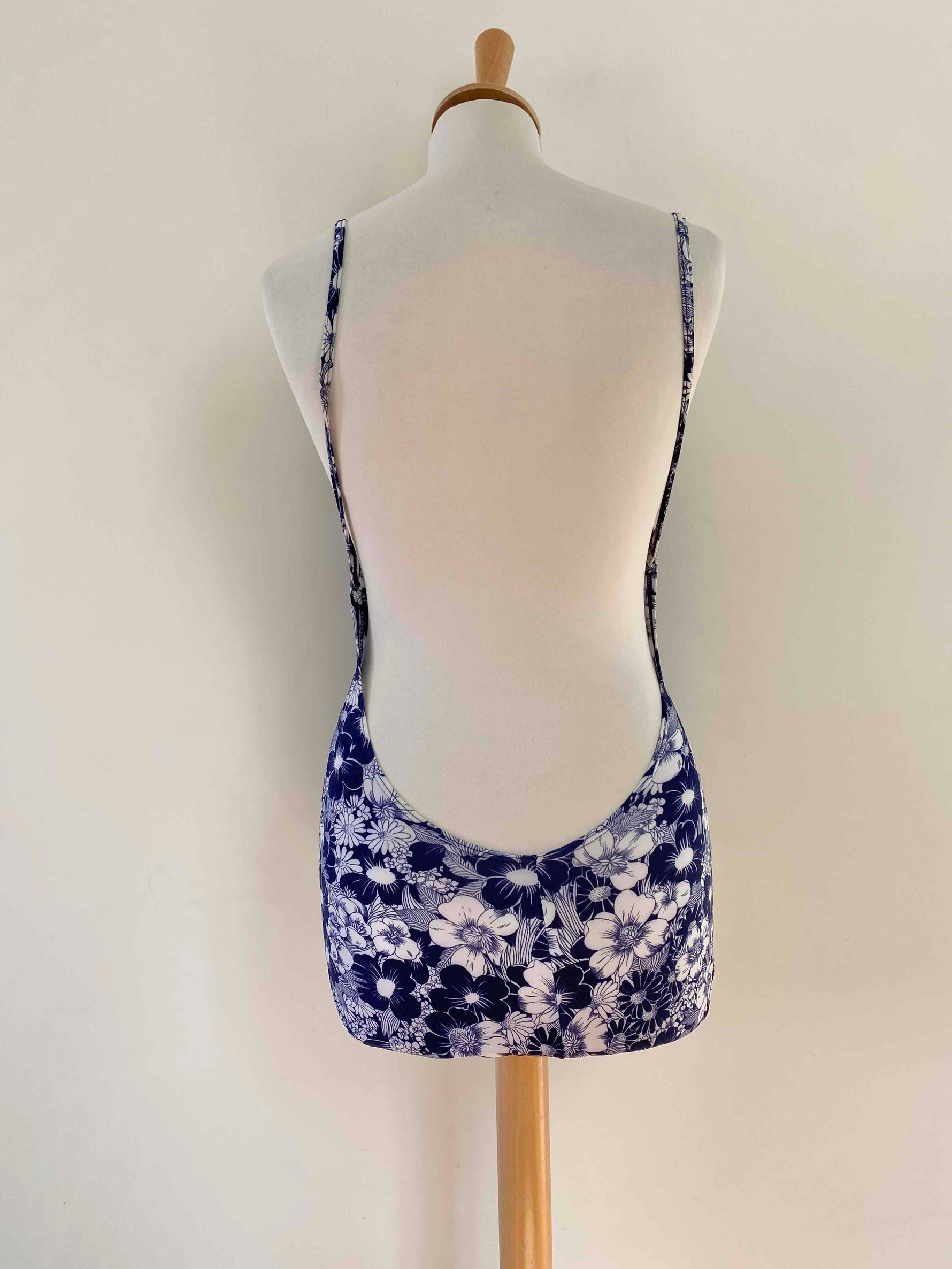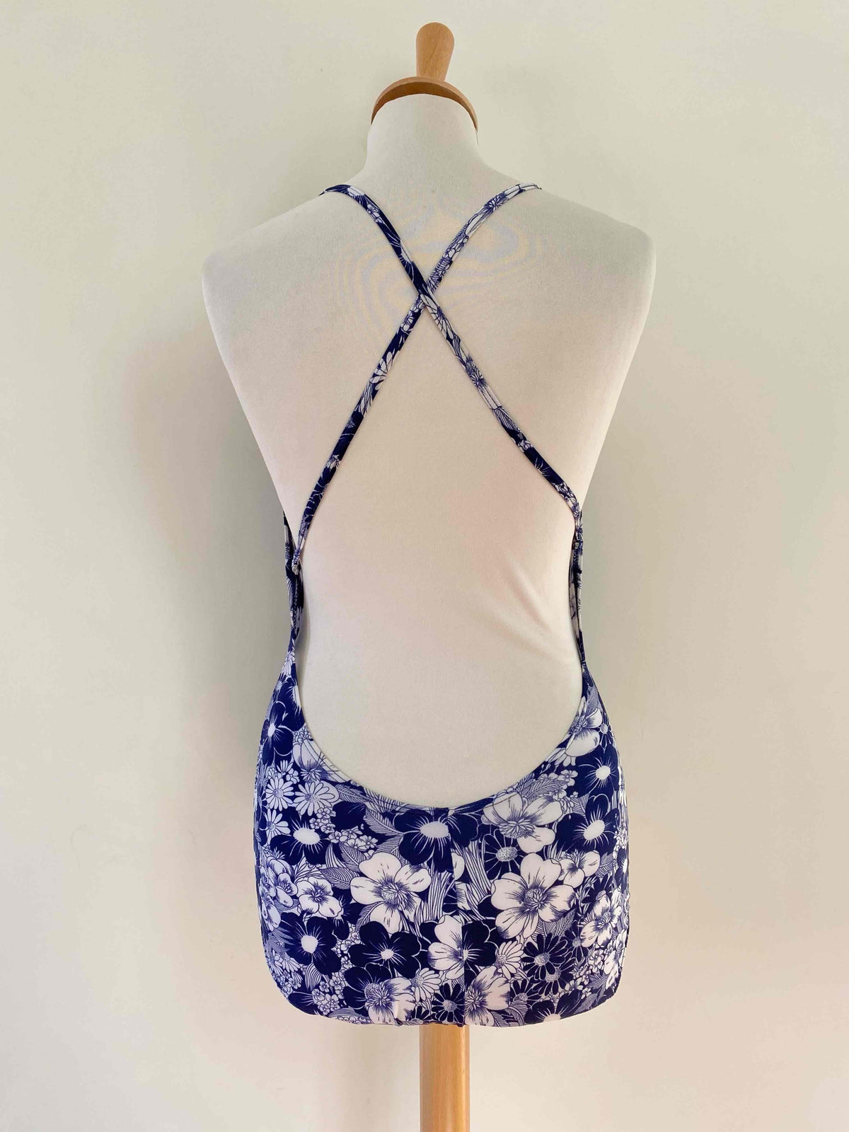 Prix unitaire parMaillot de bain 70’s à fleurs bleu marine et blanches, dos nu plongeant, bretelles à croiser ou nouer cou.