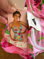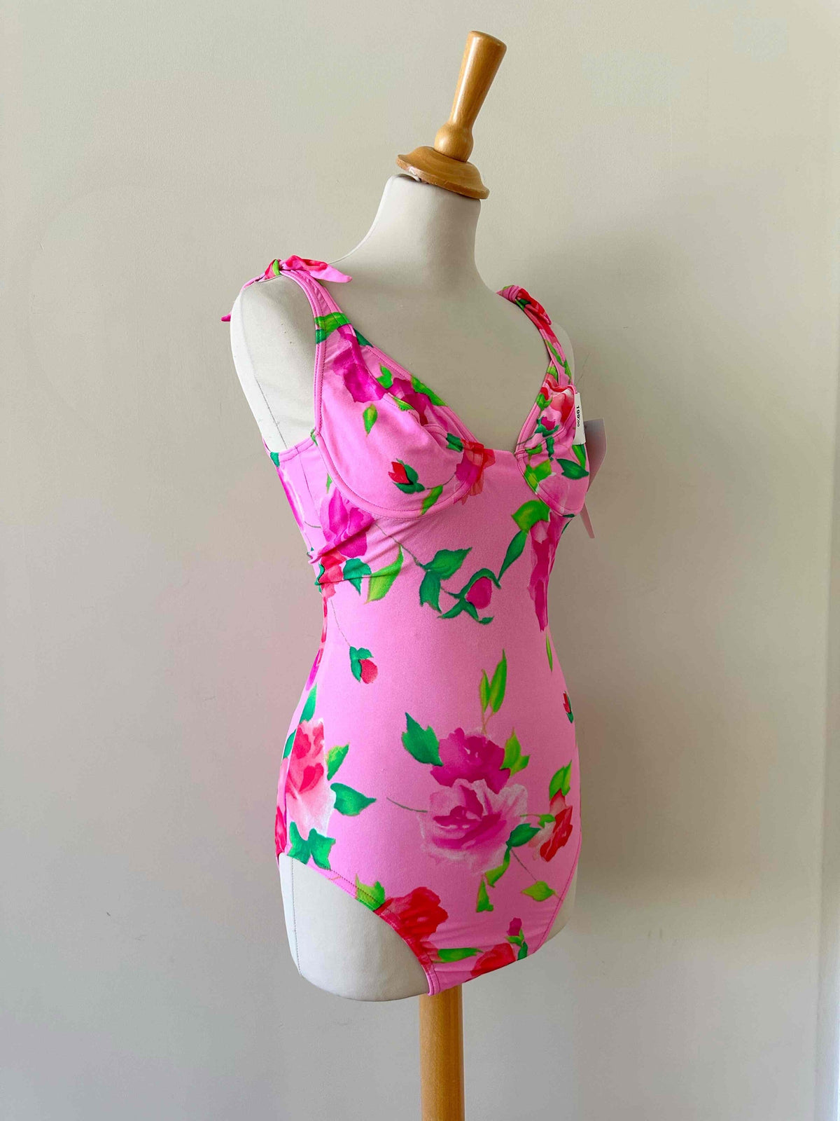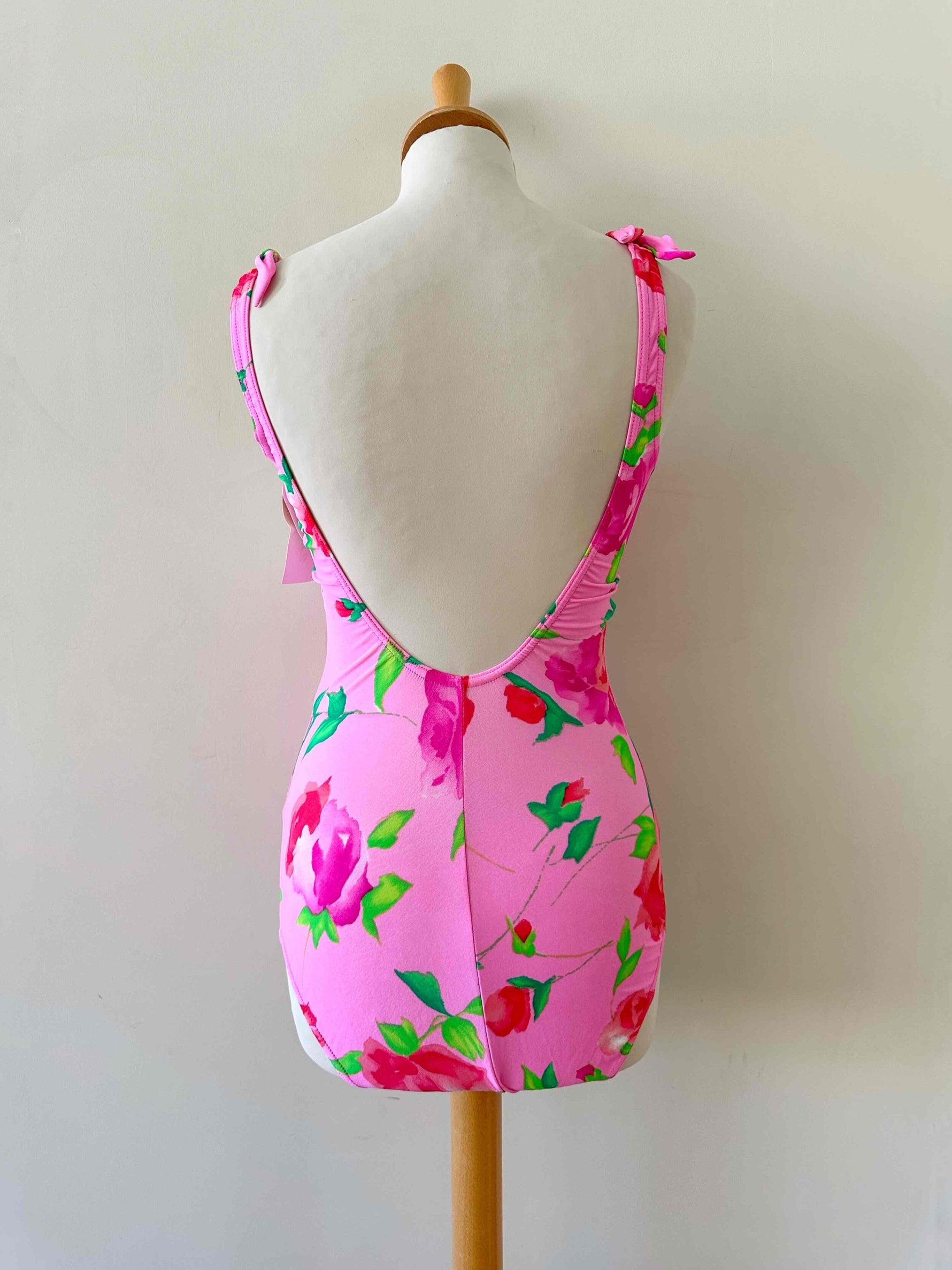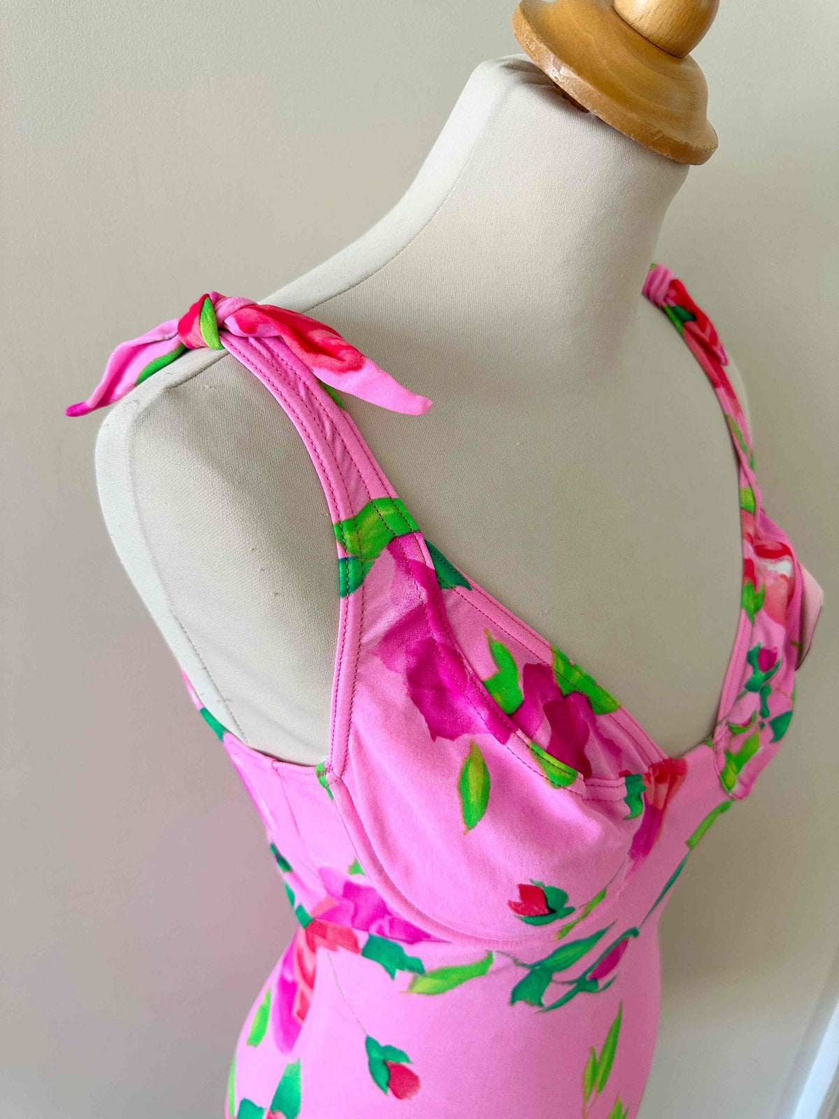 Prix unitaire parMaillot de bain à fleurs René Derhy, dos nu plongeant, poitrine corbeille, petits noeuds à nouer sur les épaules, années 90s, taille 38 porté ici sur un mannequin T36.