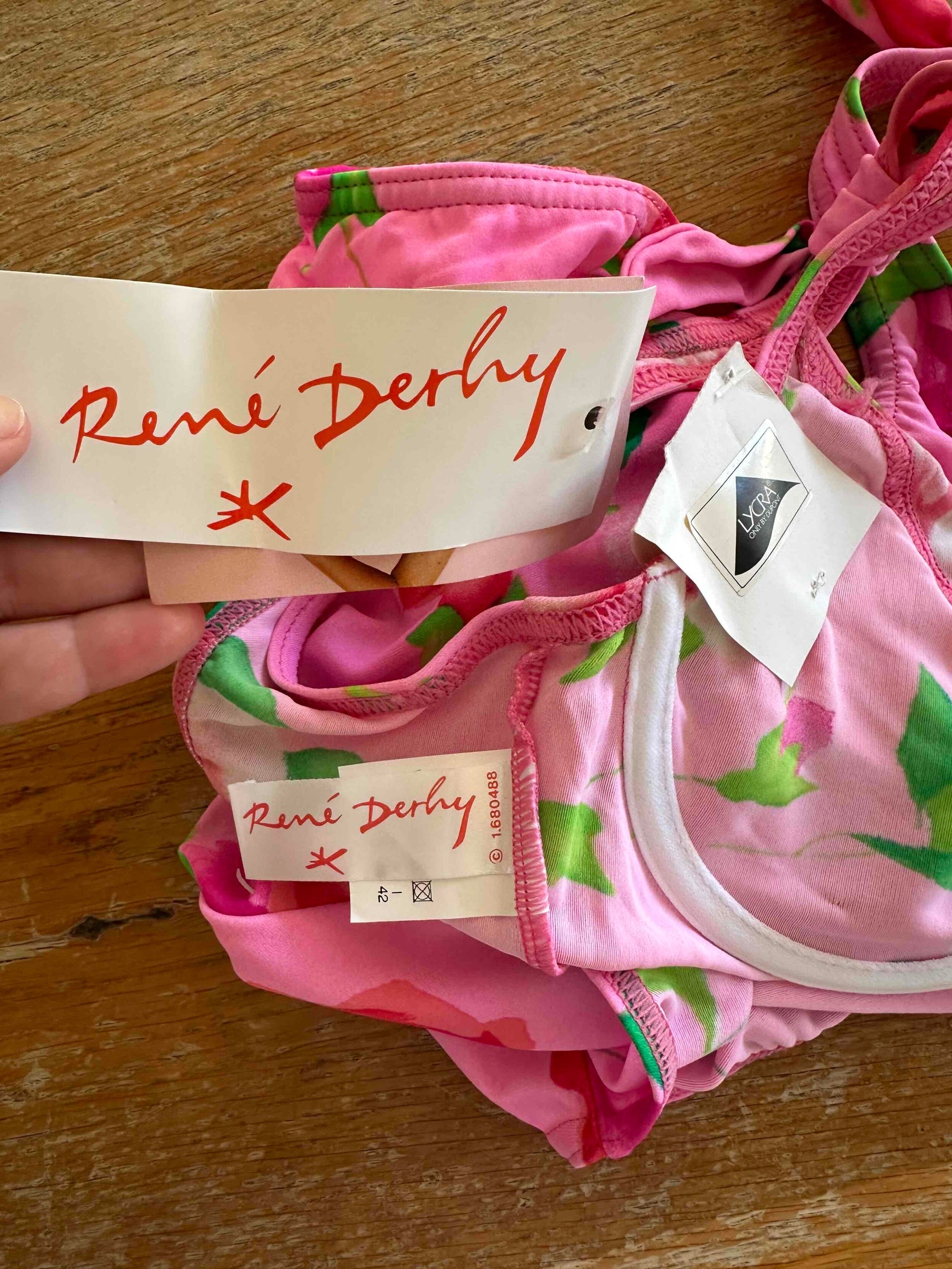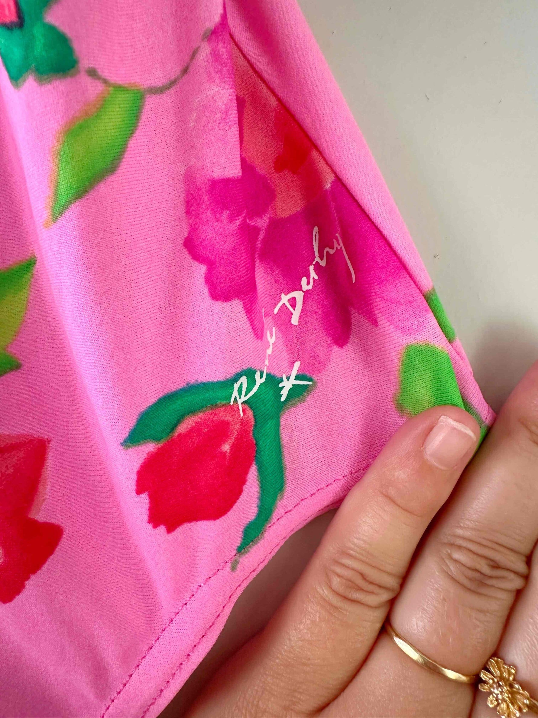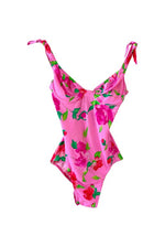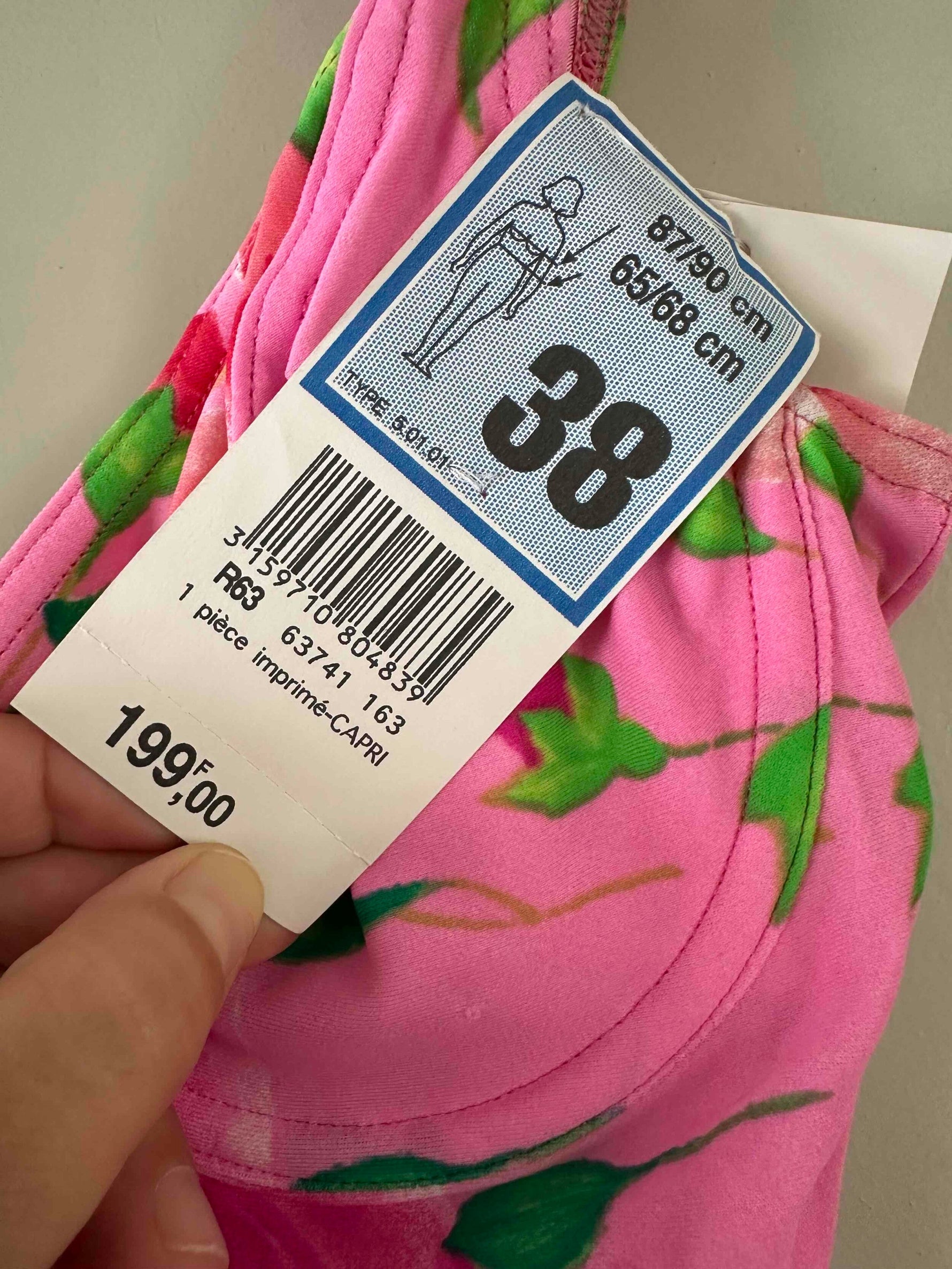 Prix unitaire parMaillot de bain à fleurs René Derhy, dos nu plongeant, poitrine corbeille, petits noeuds à nouer sur les épaules, années 90s, taille 38 porté ici sur un mannequin T36.