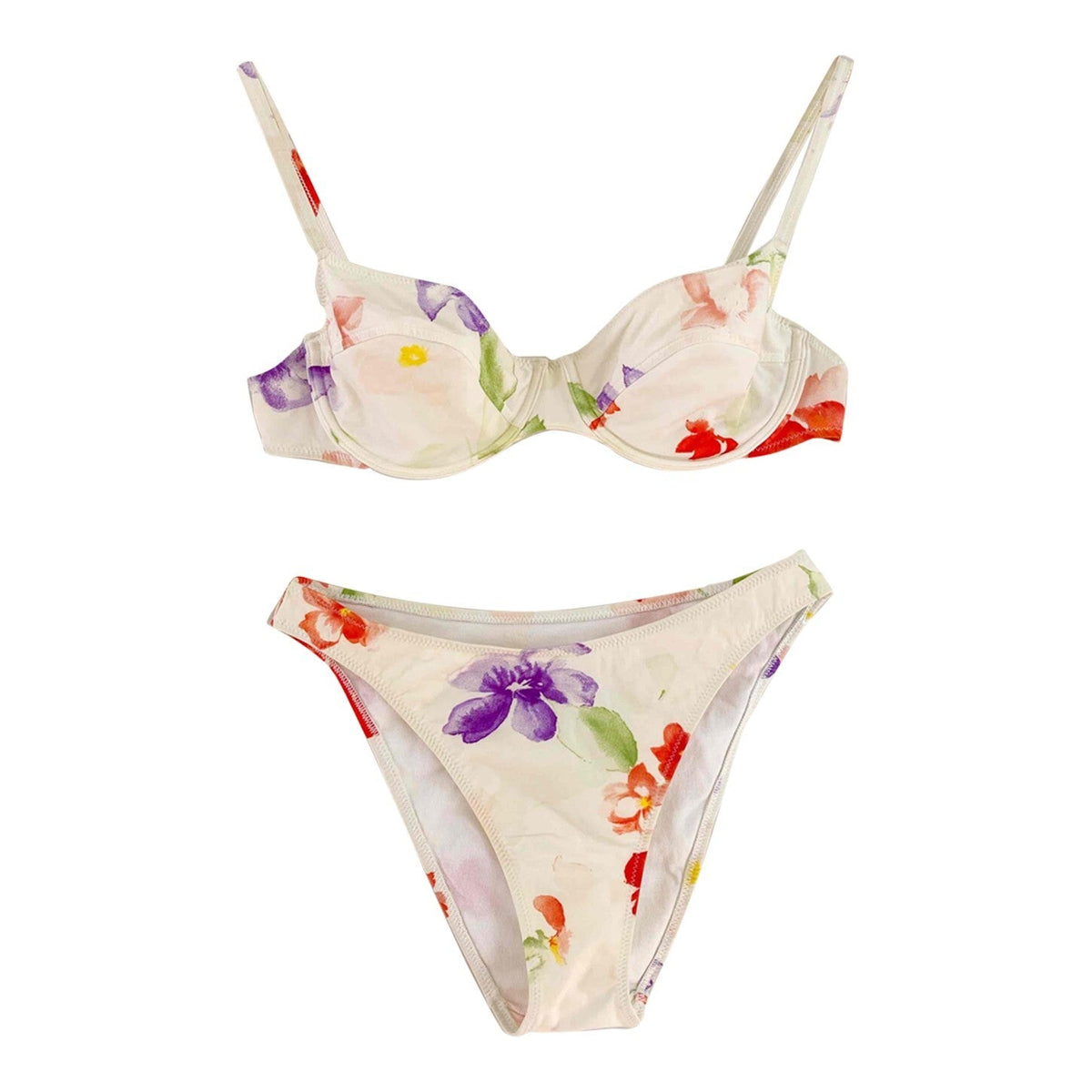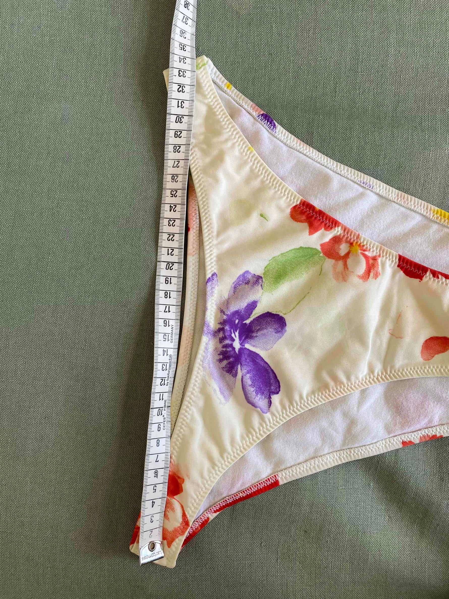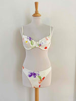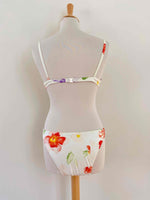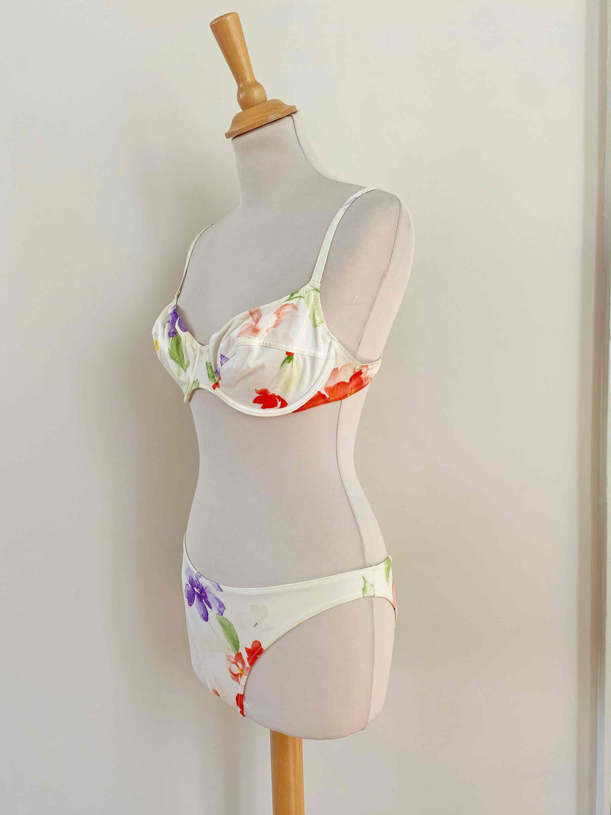 Prix unitaire parBikini Cacharel blanc imprimé fleurs aquarelles multicolores rouges, violettes, vertes, jaunes, haut armaturé fermoir à clip, culotte échancrée taille haute, taille actuelle 38, bonnet C portée ici sur un mannequin T36.