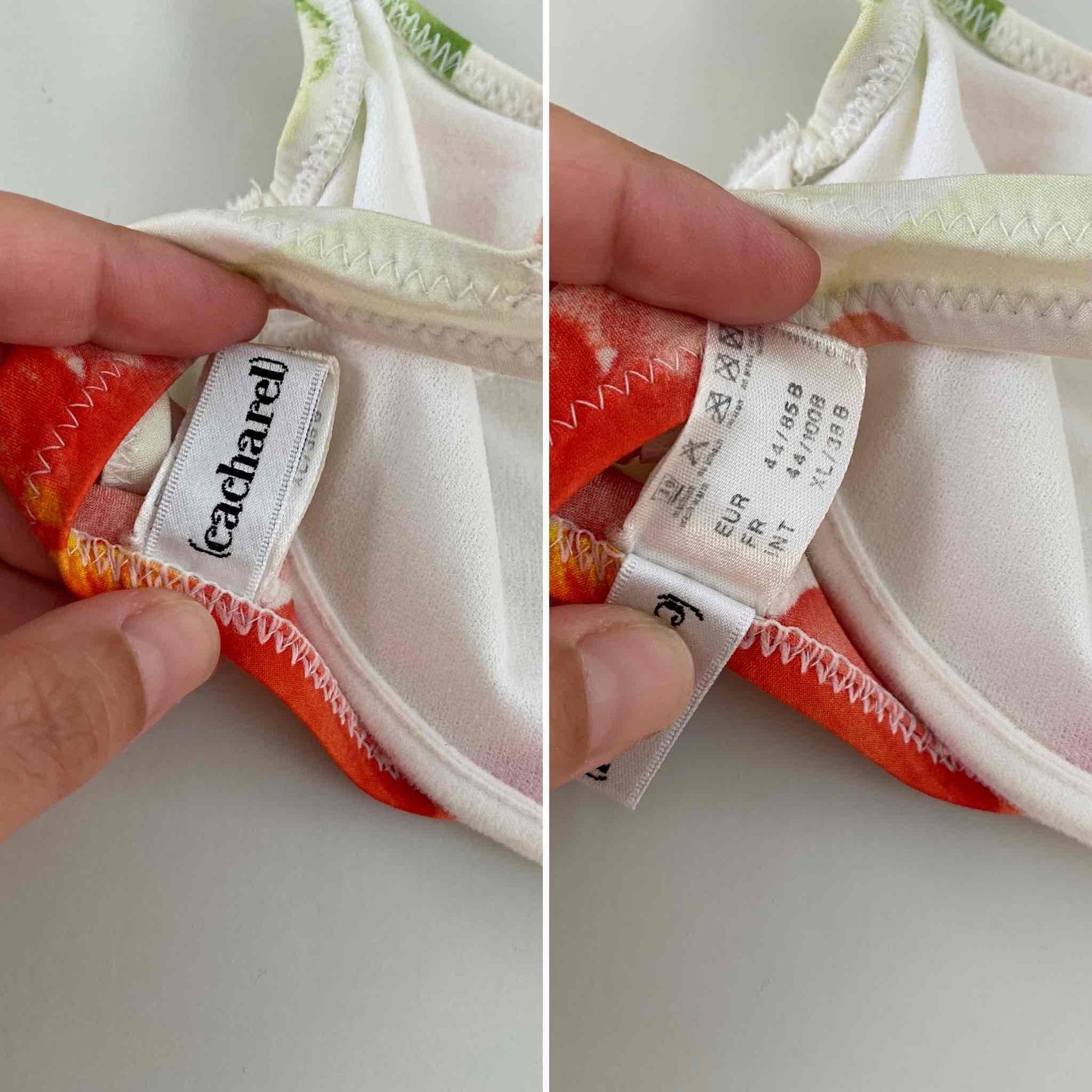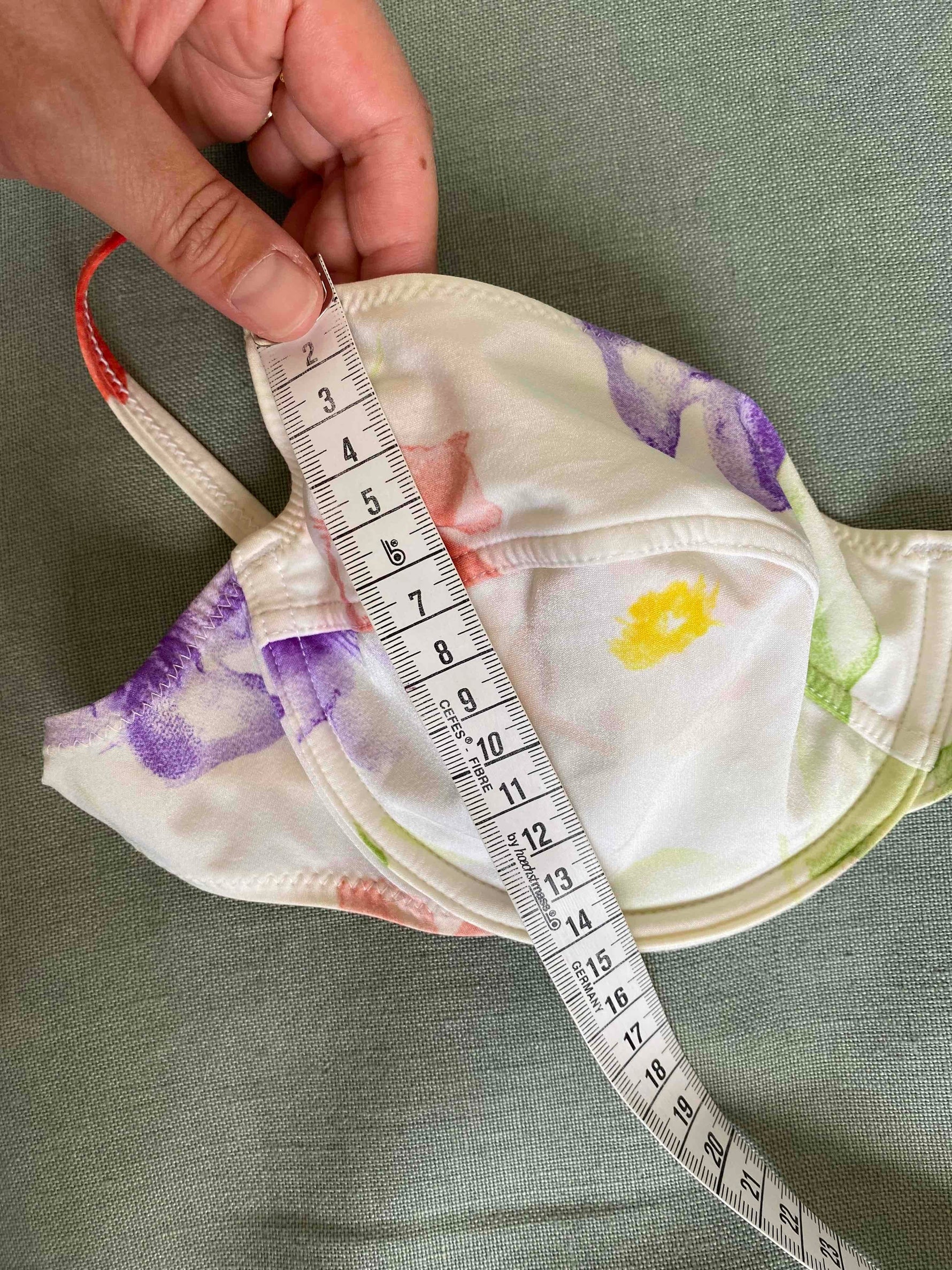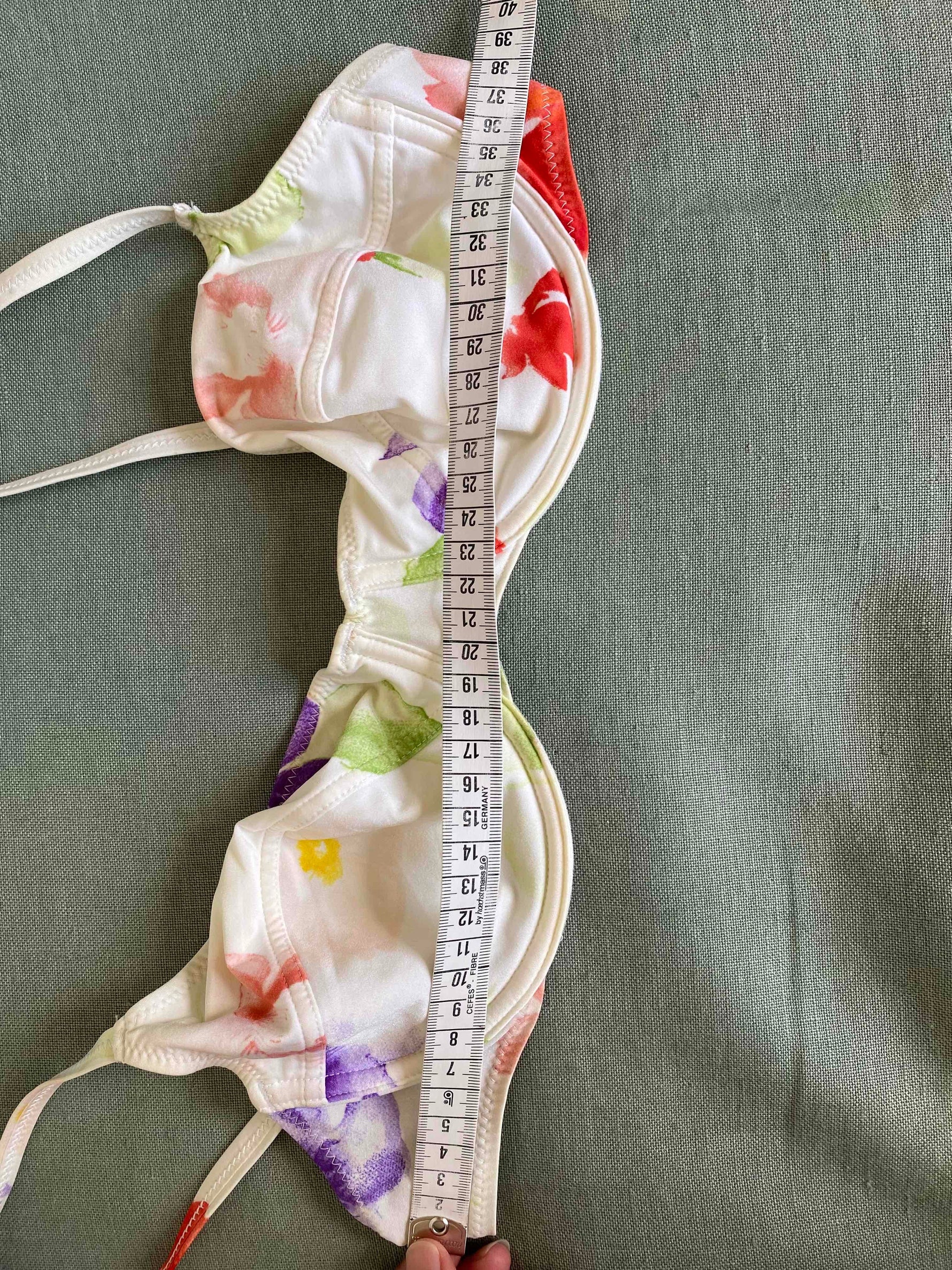 Prix unitaire parBikini Cacharel blanc imprimé fleurs aquarelles multicolores rouges, violettes, vertes, jaunes, haut armaturé fermoir à clip, culotte échancrée taille haute, taille actuelle 38, bonnet C portée ici sur un mannequin T36.