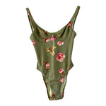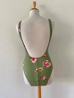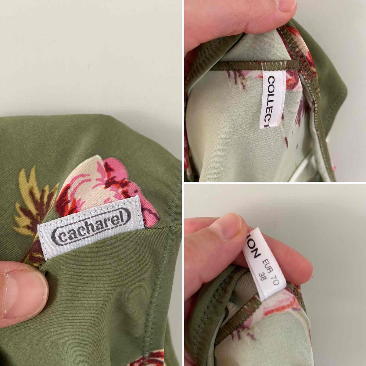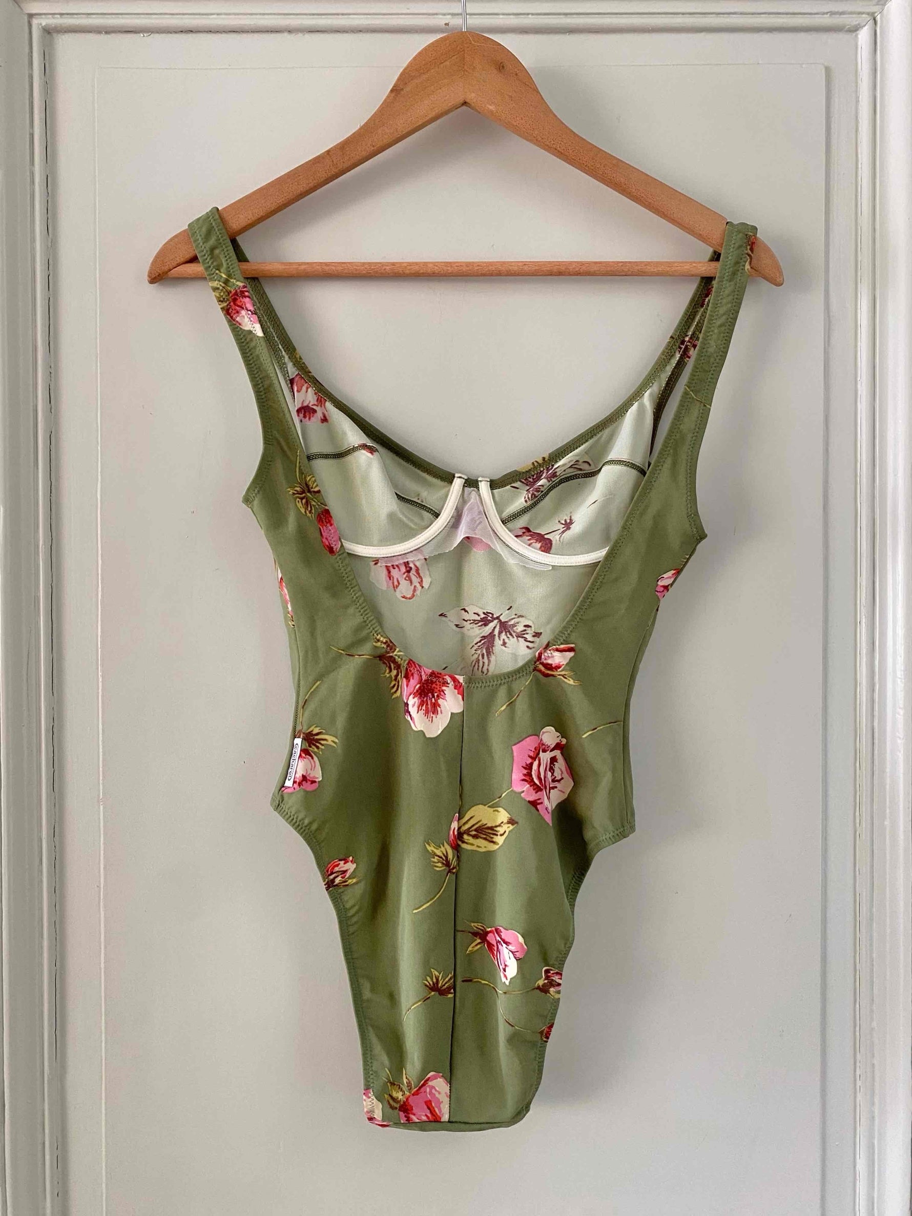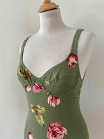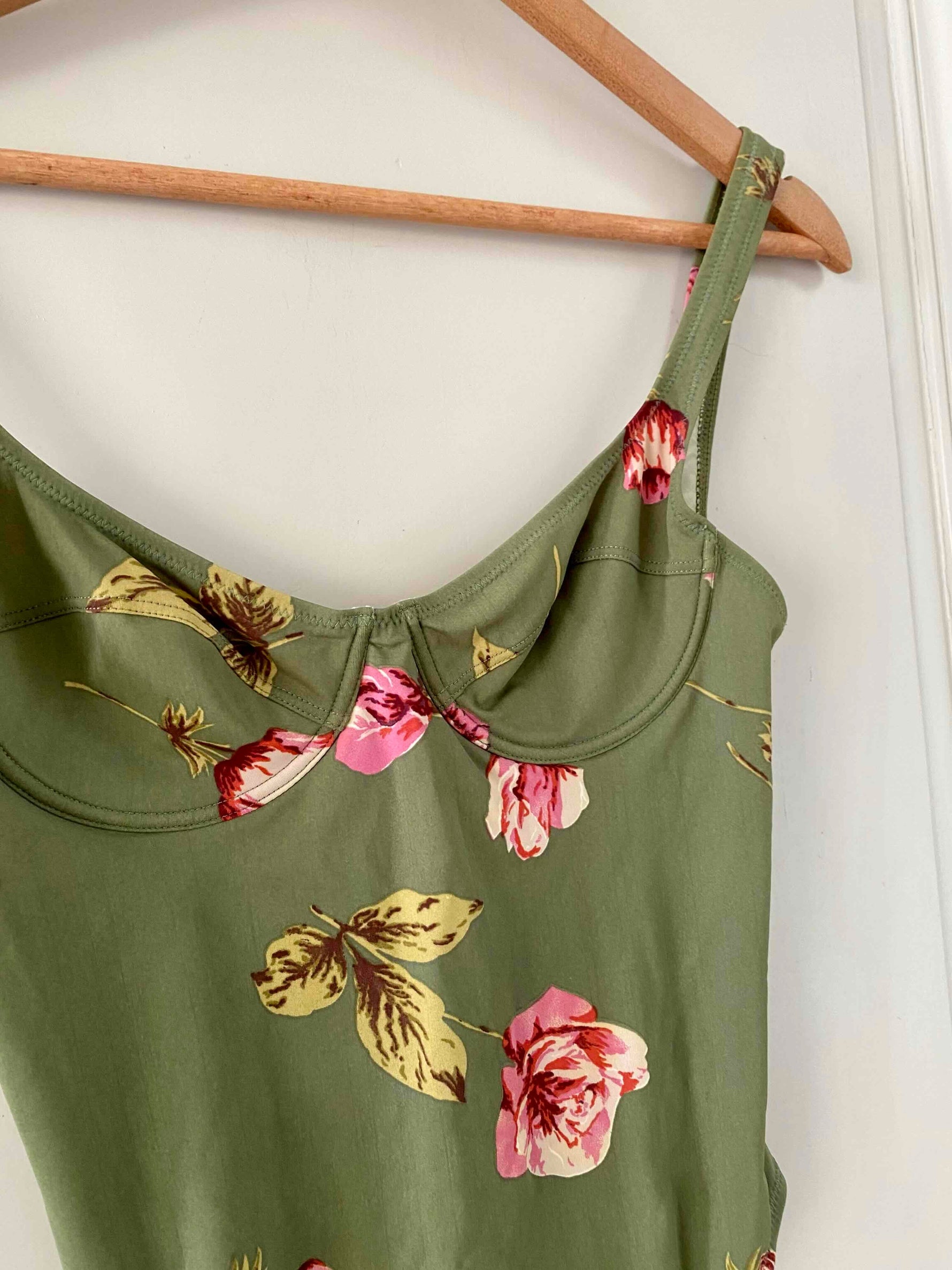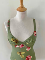 Prix unitaire parMaillot de bain Cacharel à fleurs vert olive imprimée fleurs roses et jaunes, poitrine corbeille à armatures, dos nu échancré, années 80’s, taille 36 bonnet B, porté ici sur un mannequin T36.
