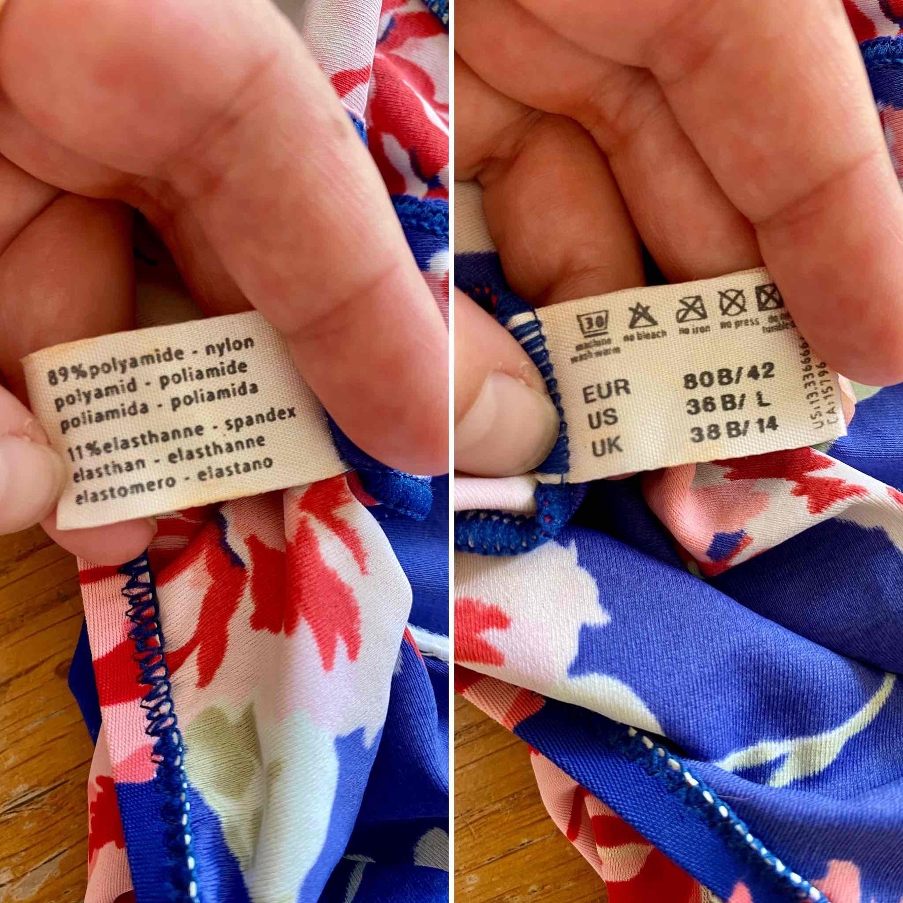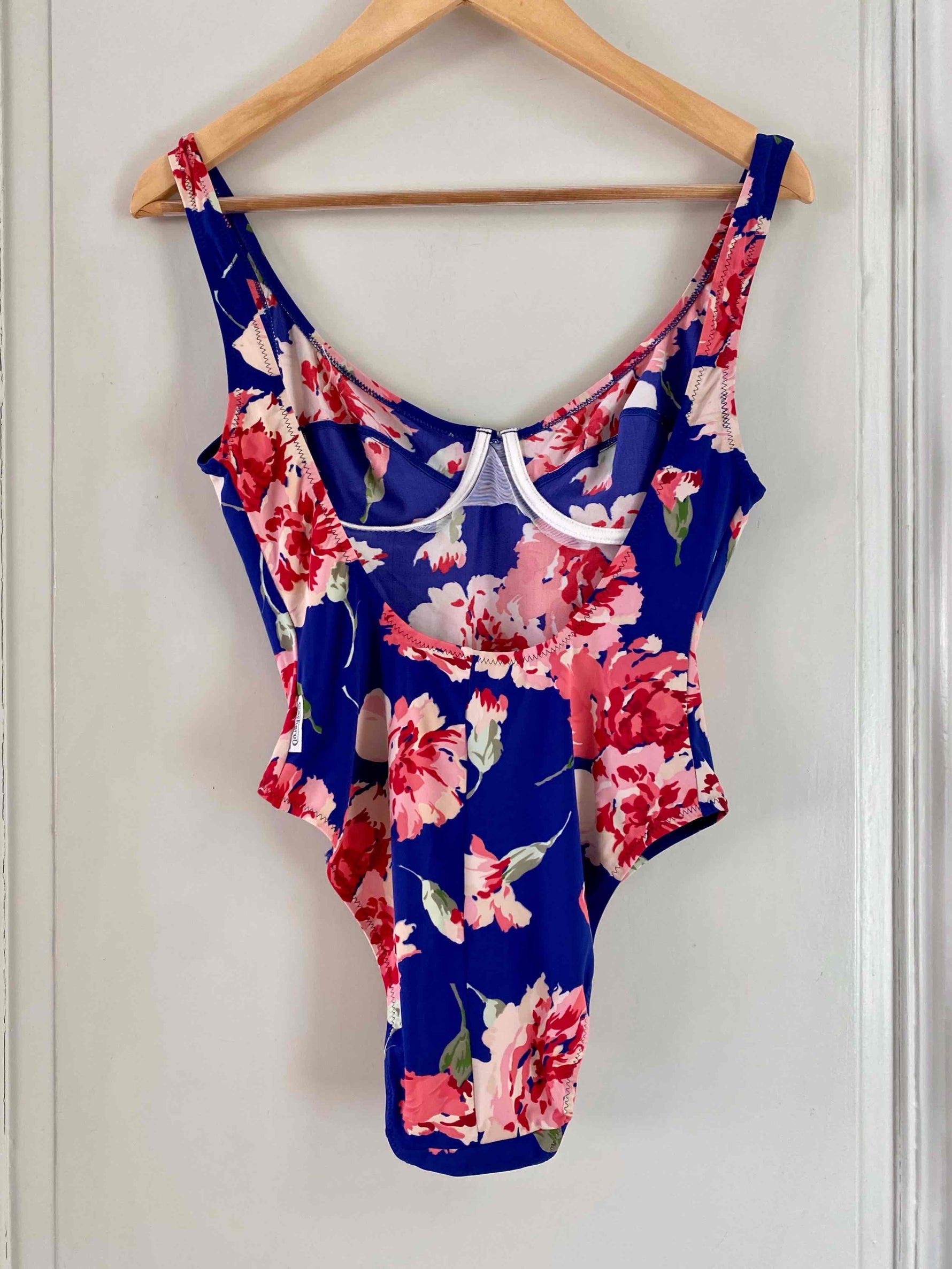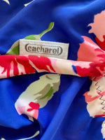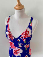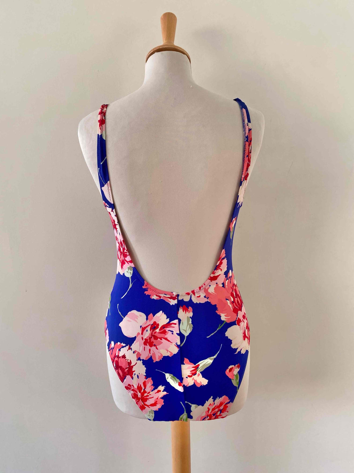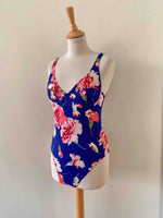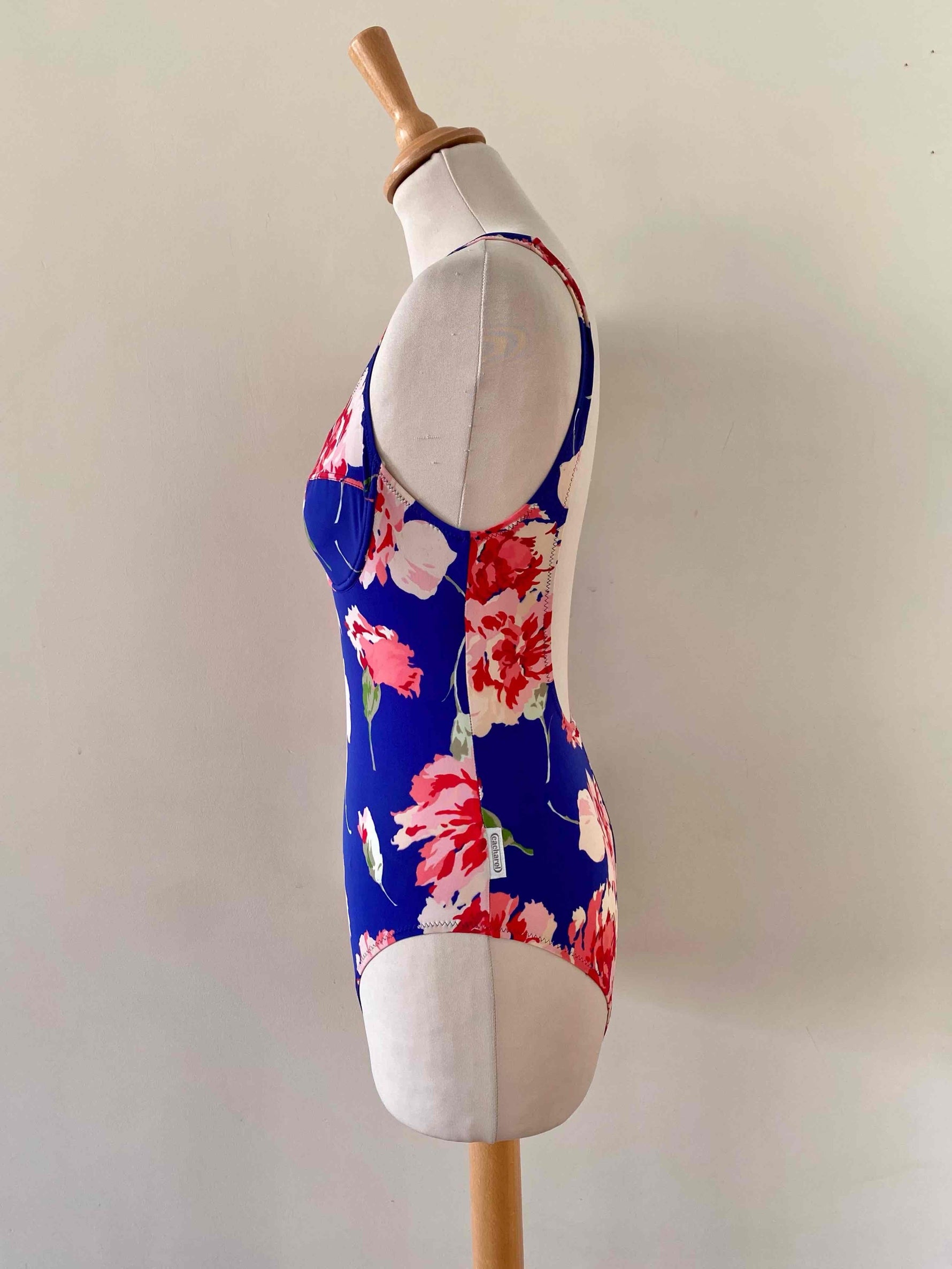 Prix unitaire parMaillot de bain Cacharel une piece, dos nu plongeant, poitrine à armatures, bleu majorelle imprimé grandes fleurs roses pastel et fuschias, fabriqué en France, taille 36 actuelle bonnet B , porté ici sur un mannequin T36.