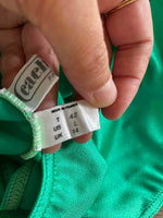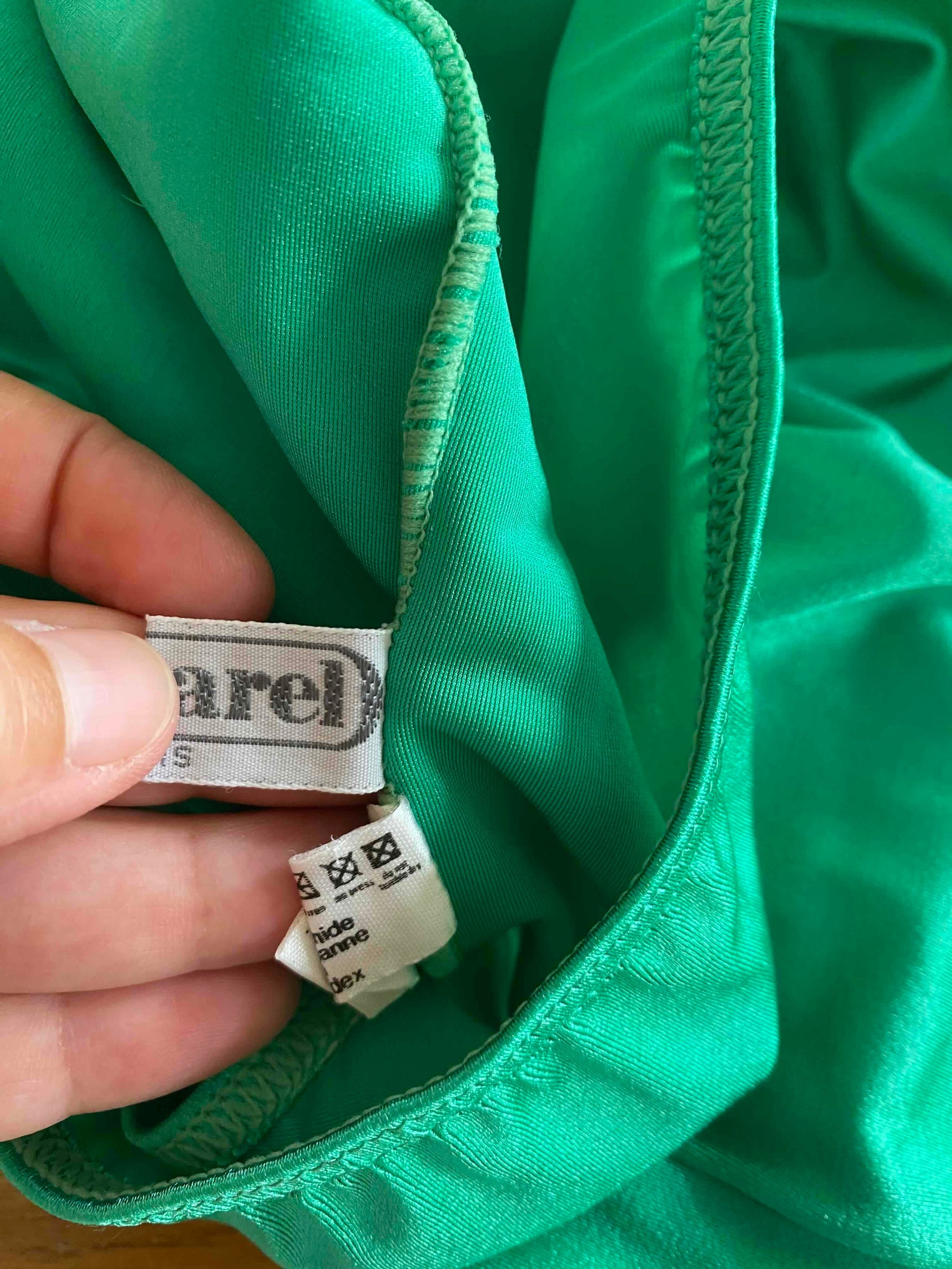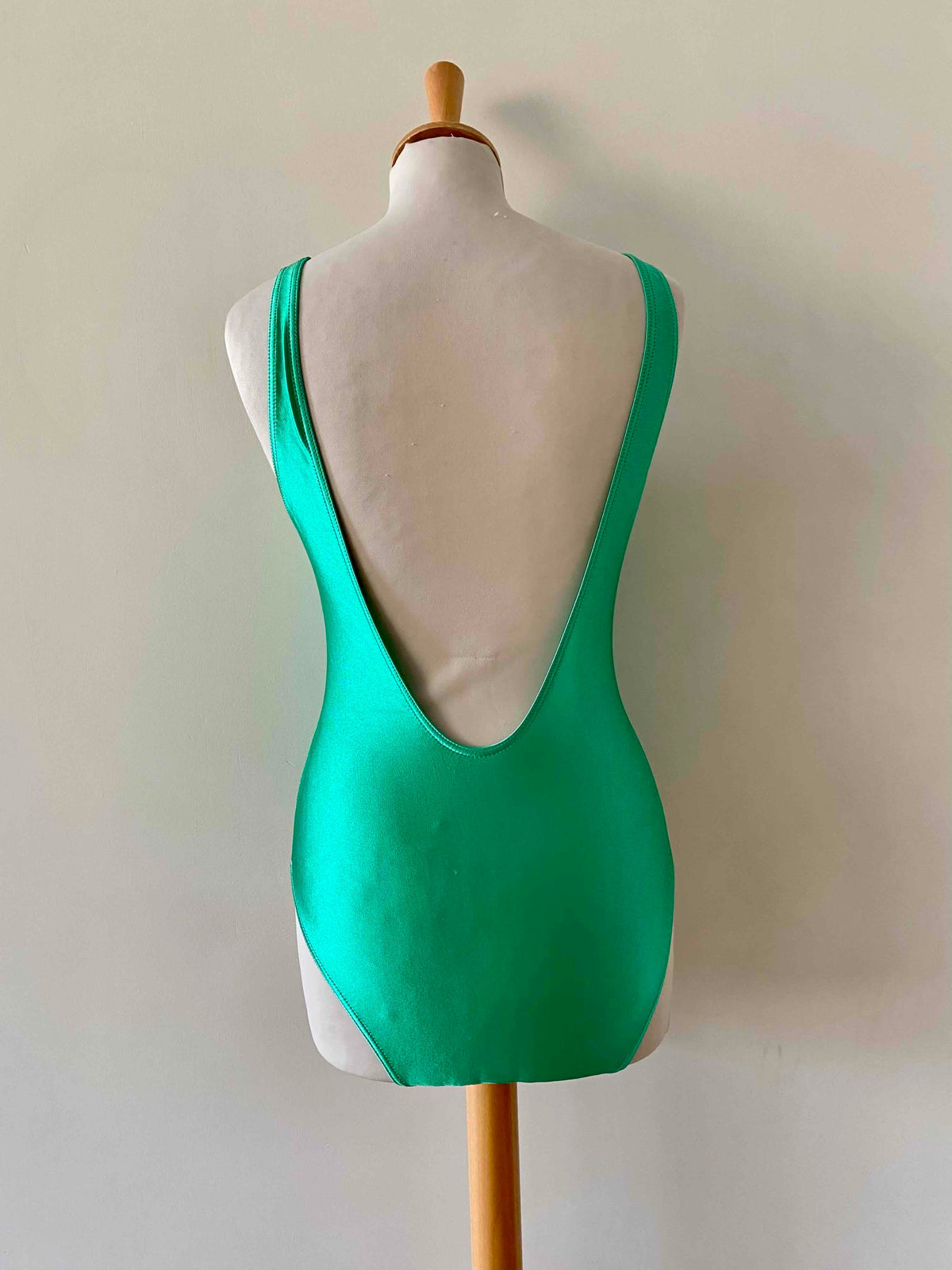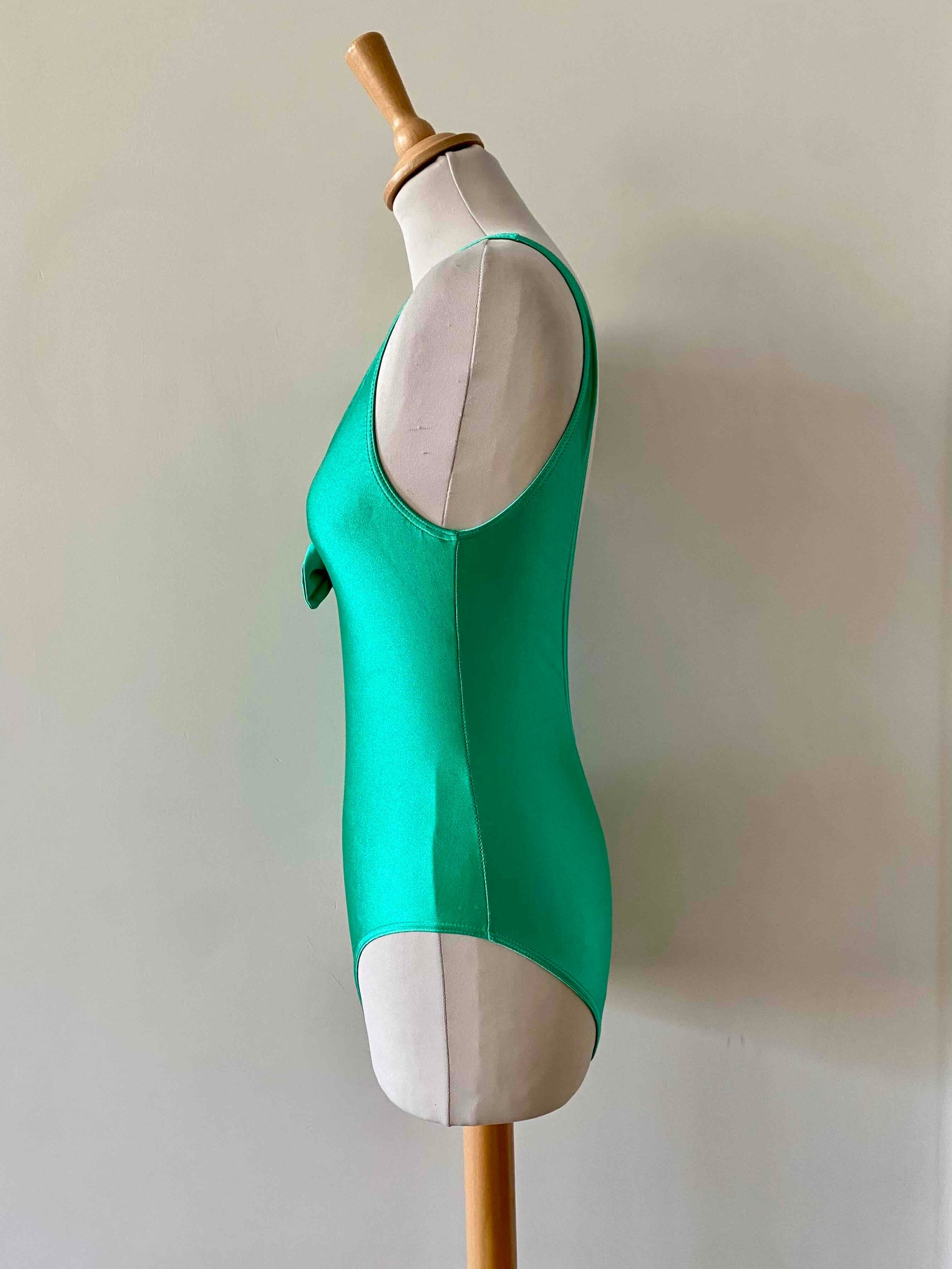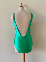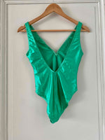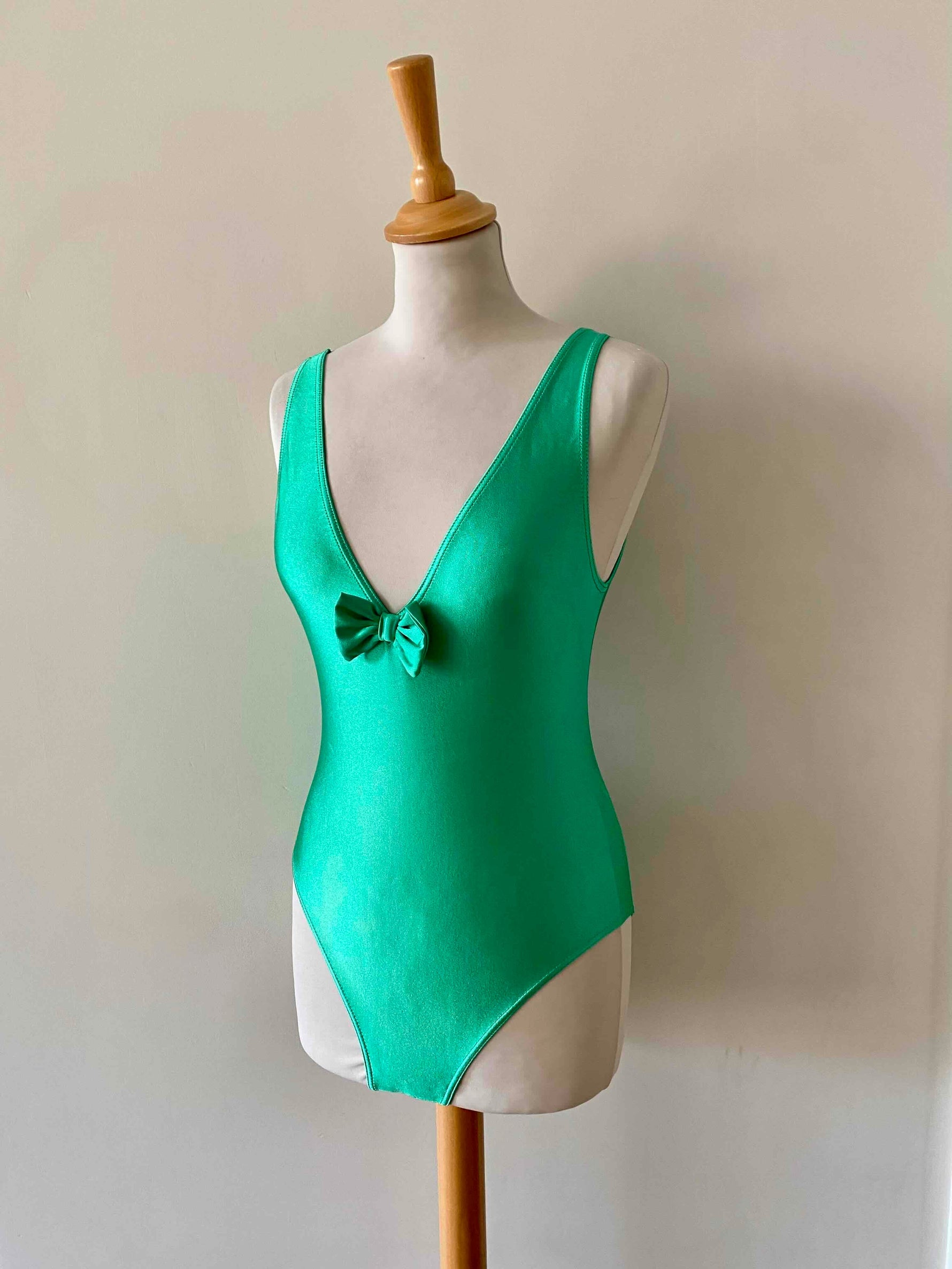 Prix unitaire parMaillot de bain Cacharel, en lycra vert chlorophylle, col V plongeant devant avec noeud papillon, dos nu plongeant, fabriqué en France, taille 34 et 36 porté ici sur un mannequin T36, peut également se porter en body.