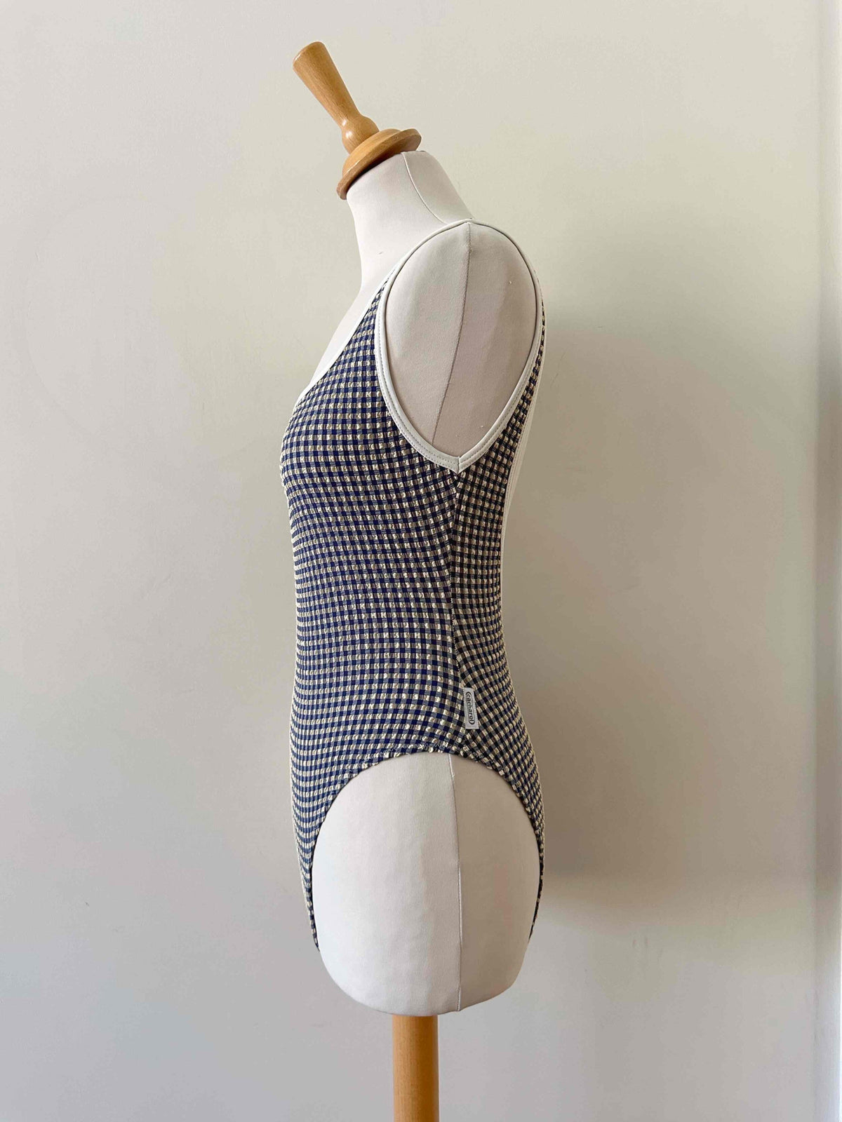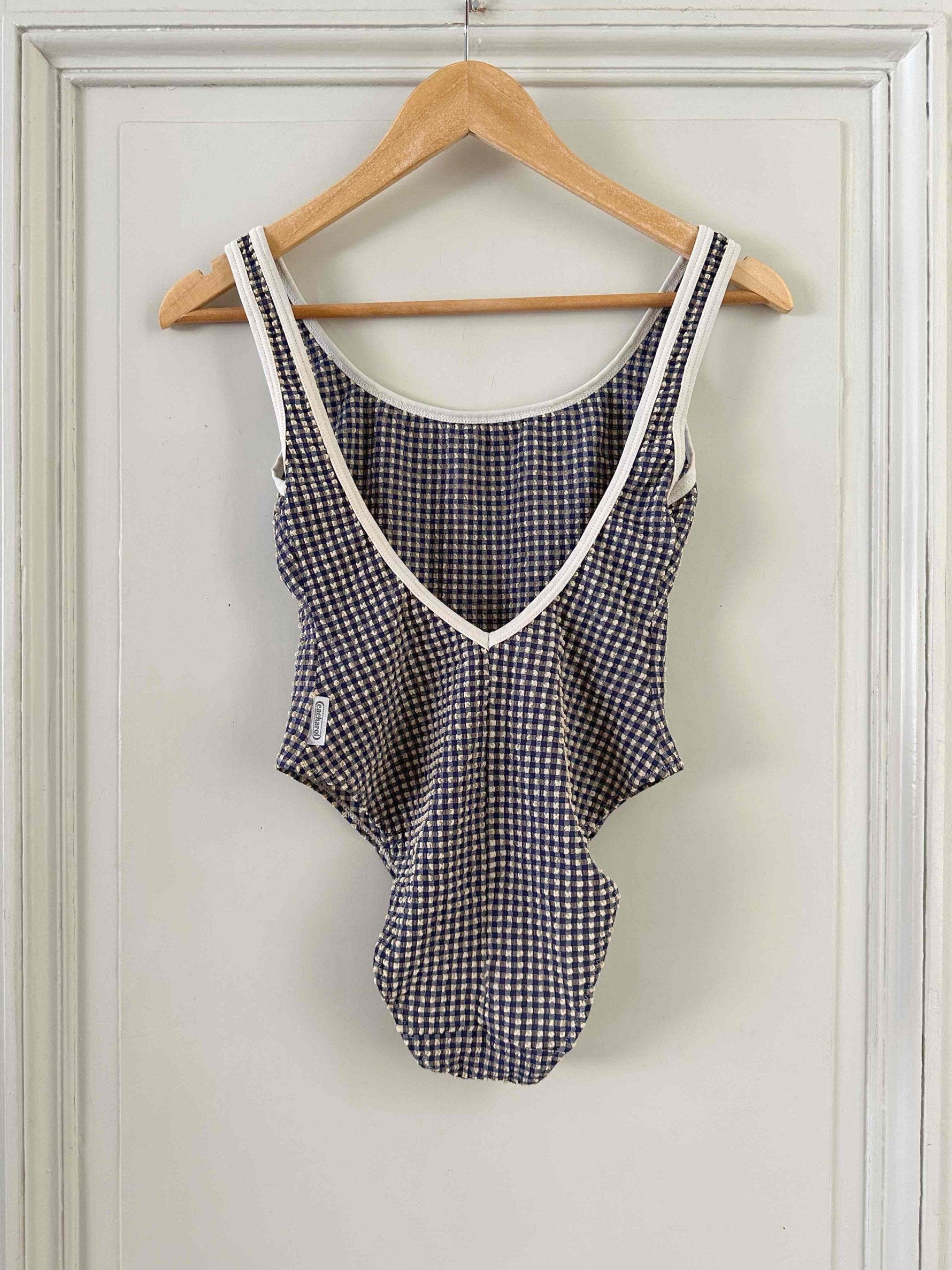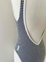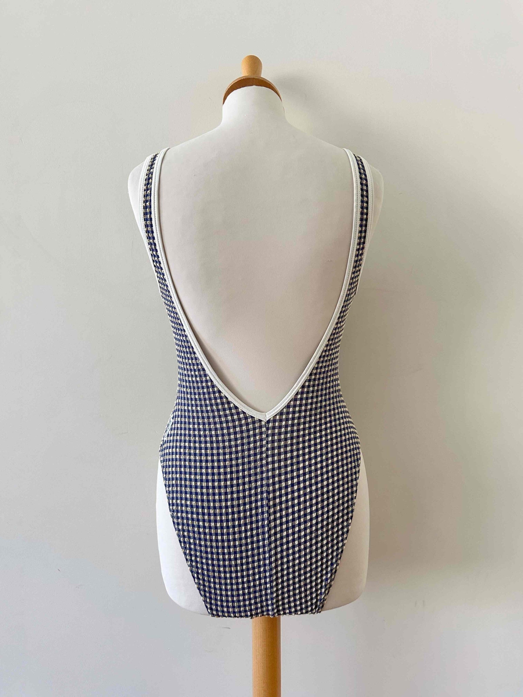 Maillot de bain vichy Cacharel, en matière gaufrée à carreaux vichy bleus foncés et écrus, bordures blanches, dos nu plongeant, fabriqué en France, années 90s, taille 36 porté ici sur un mannquin T36.