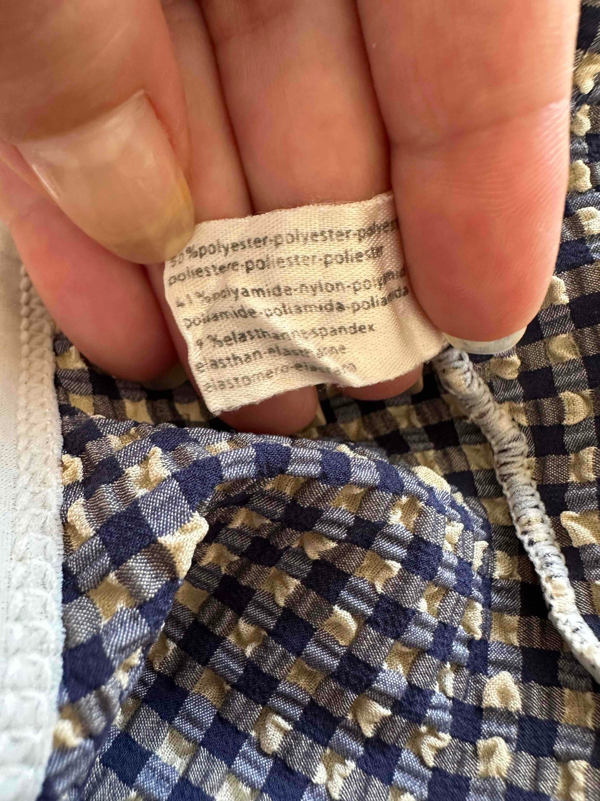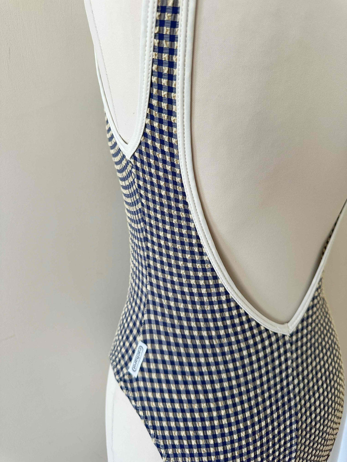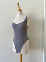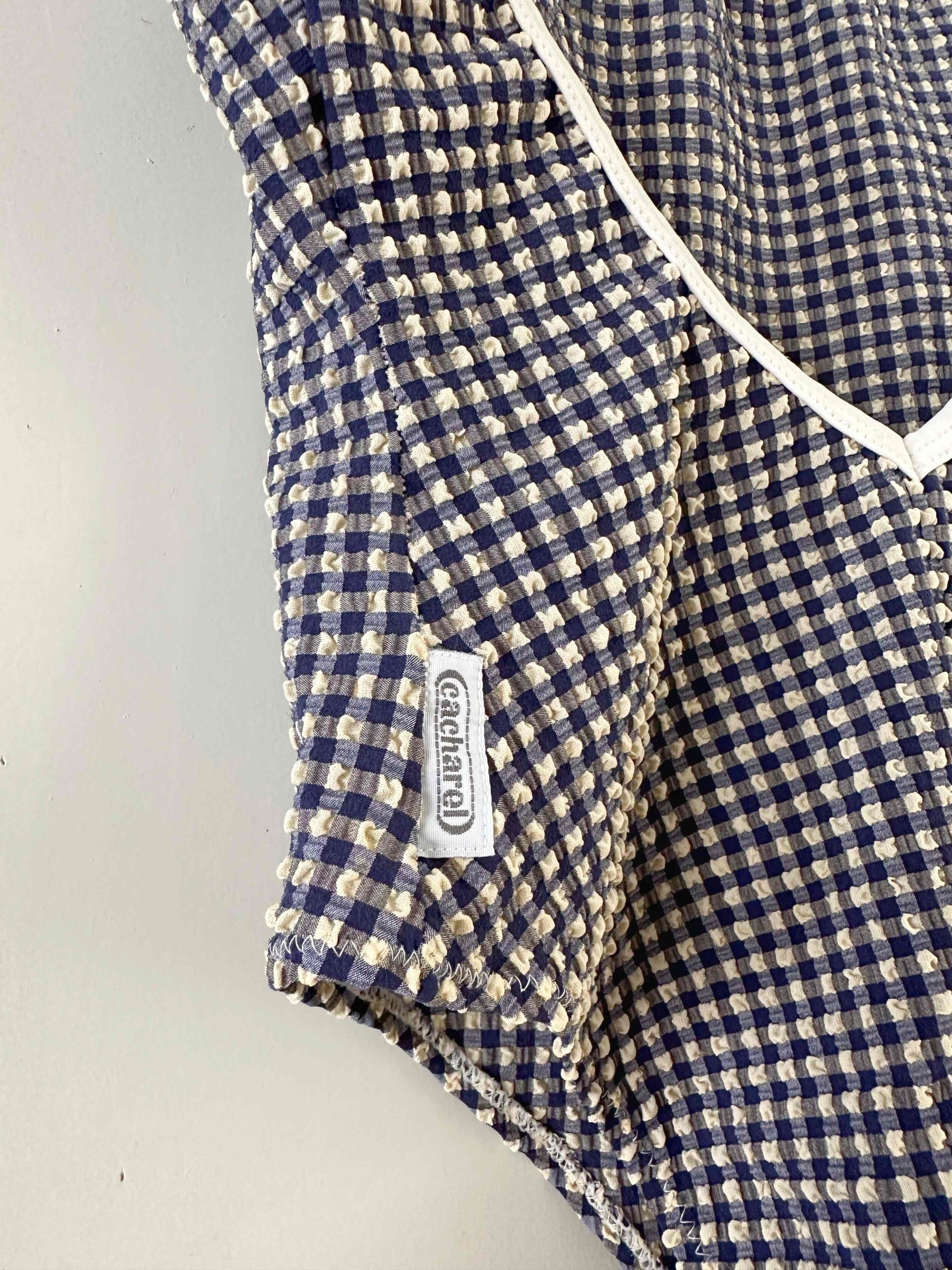 Maillot de bain vichy Cacharel, en matière gaufrée à carreaux vichy bleus foncés et écrus, bordures blanches, dos nu plongeant, fabriqué en France, années 90s, taille 36 porté ici sur un mannquin T36.
