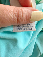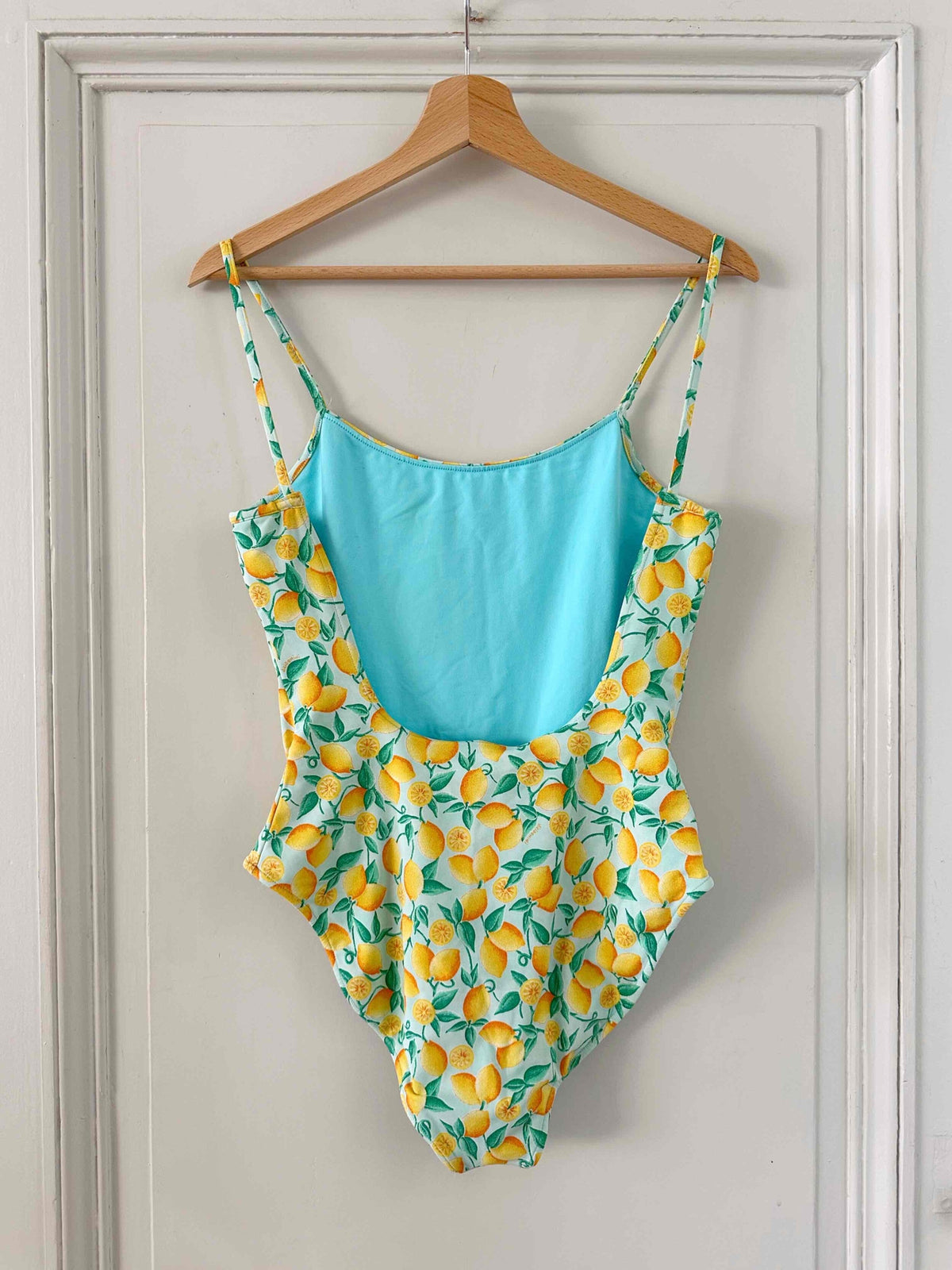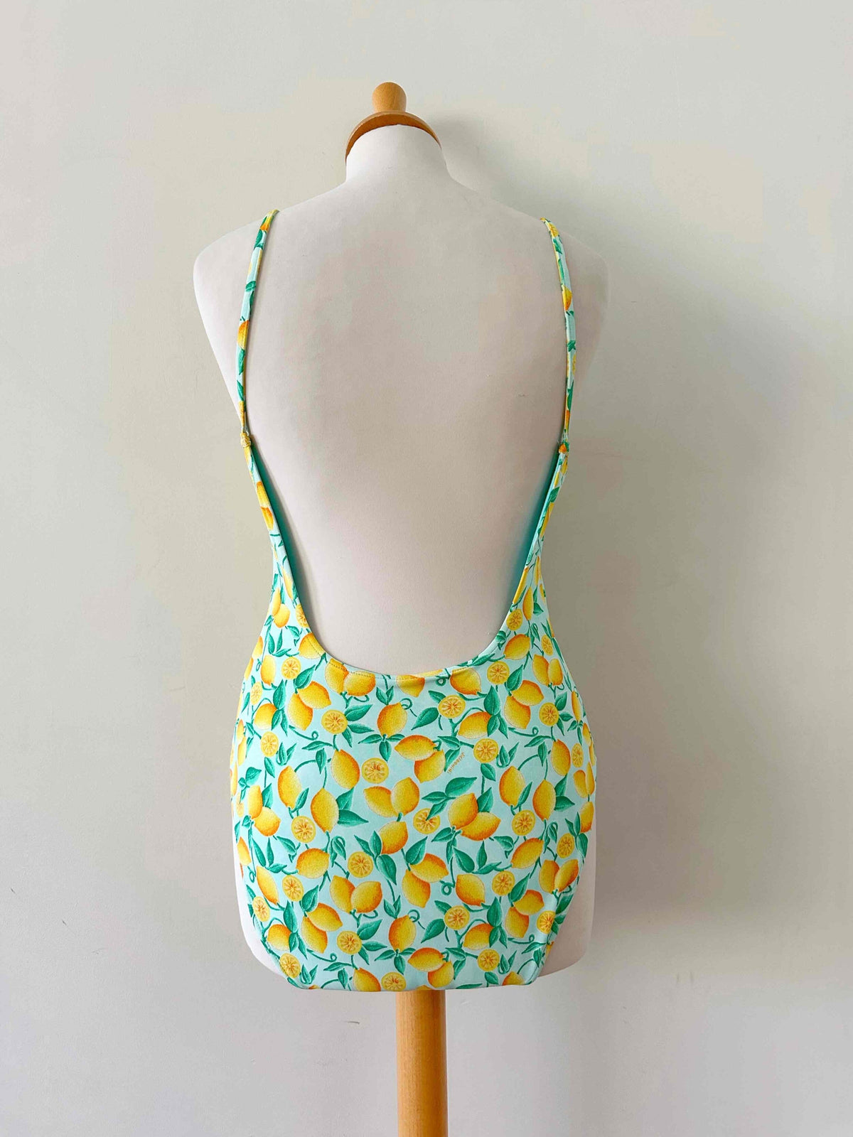 Maillot de bain une pièce motifs citron, fond bleu piscine imprimé citrons jaunes et verts, bretelles fines, dos nu plongeant, fabriqué en France, taille 36 porté ici sur un mannequin T36 et bonnet 85B.