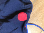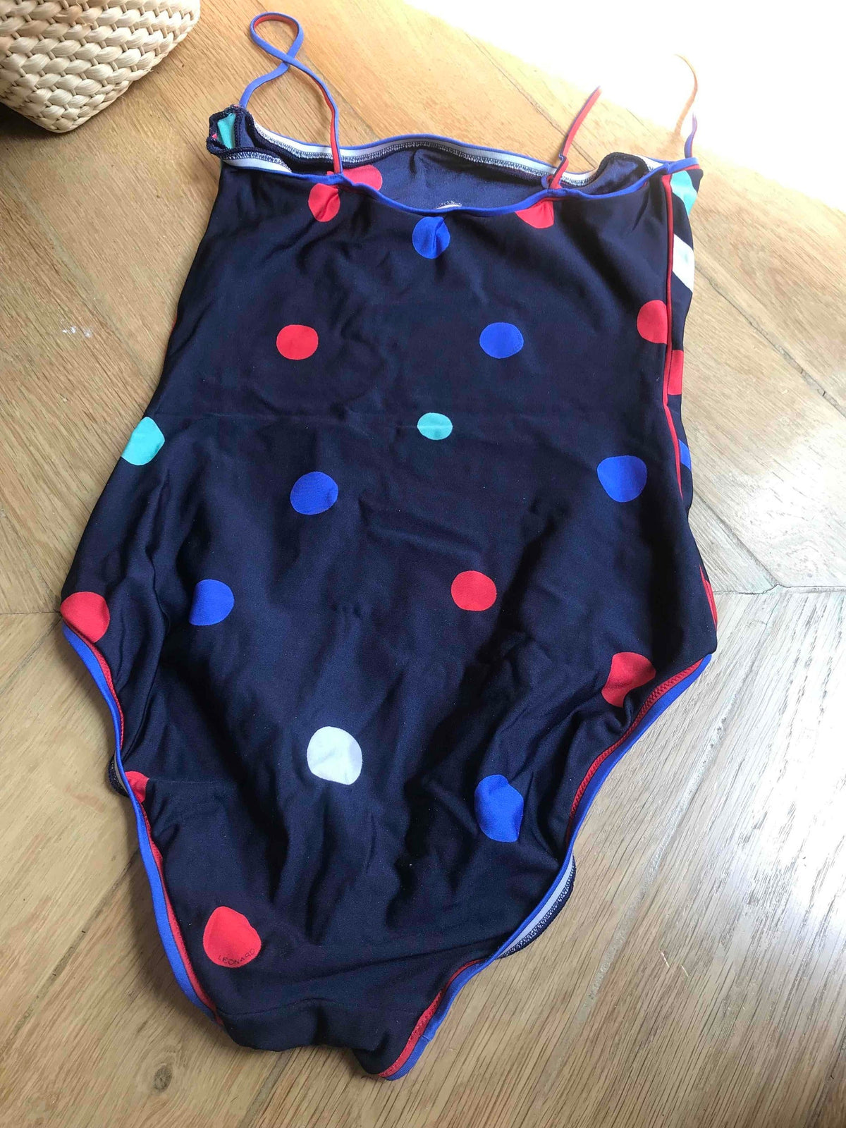 Prix unitaire parMaillot de bain une pièce, marine à pois blancs et rouges. De la marque de luxe Léonard. Bretelles fines.