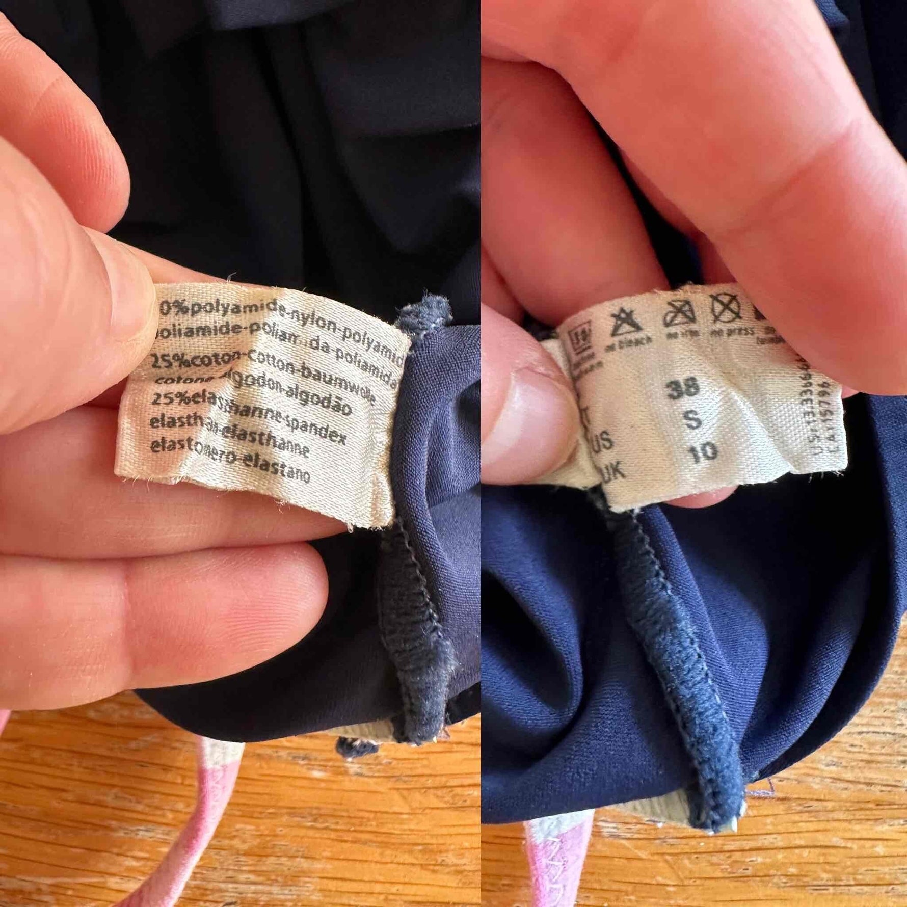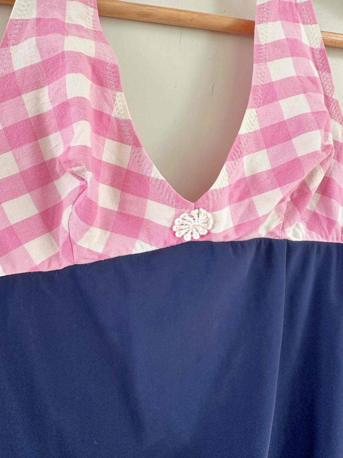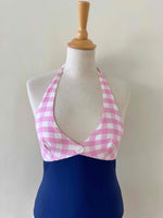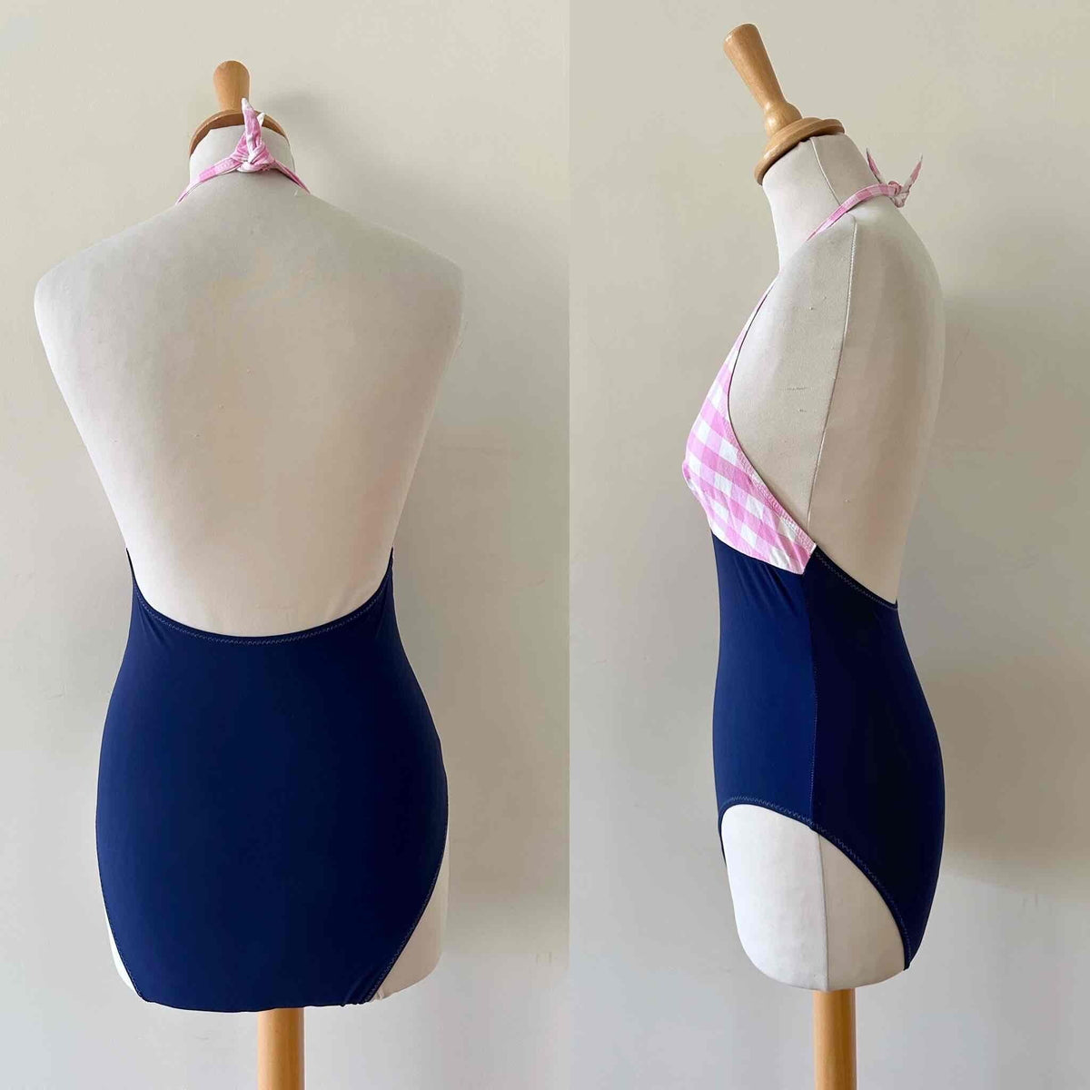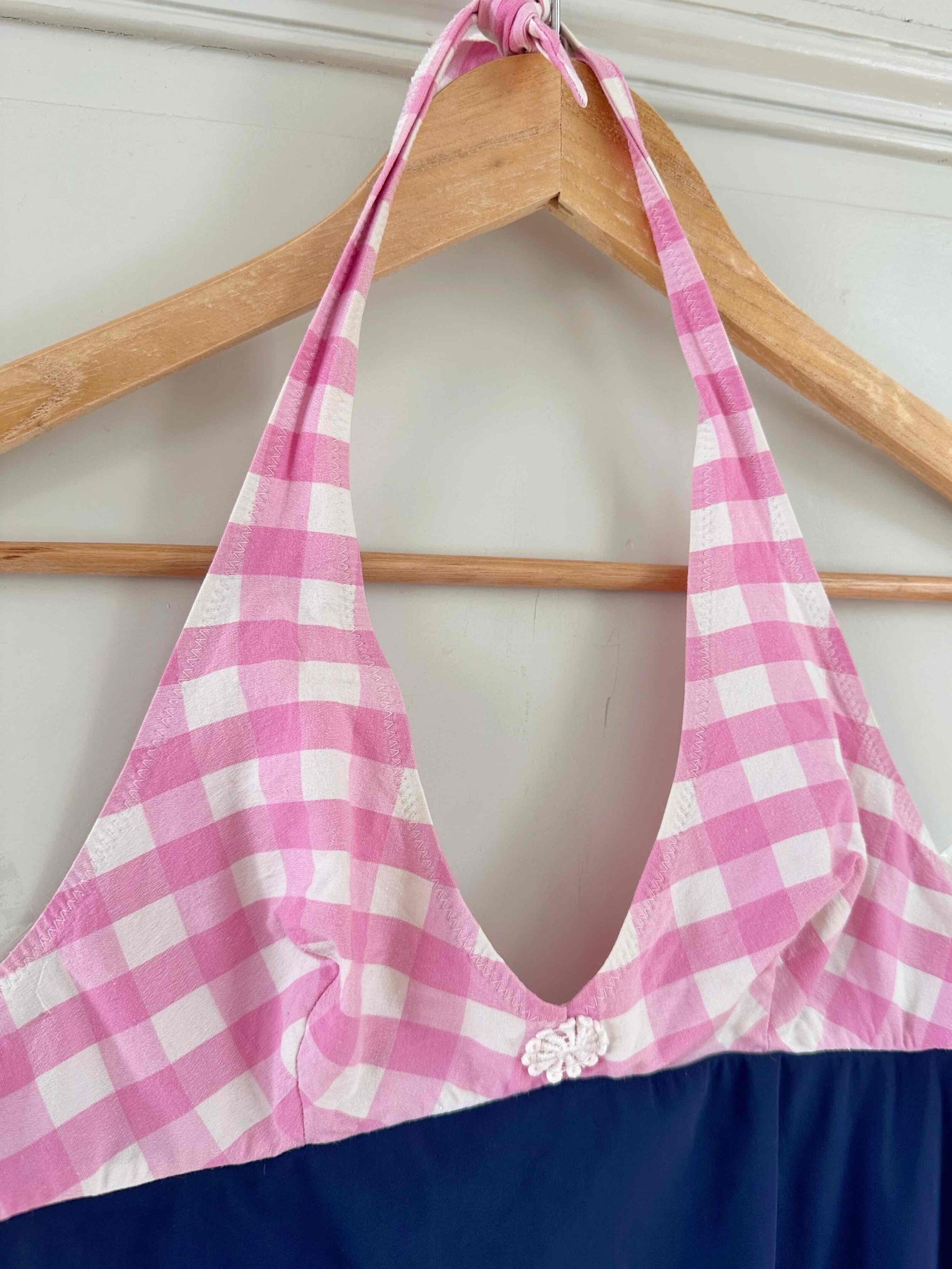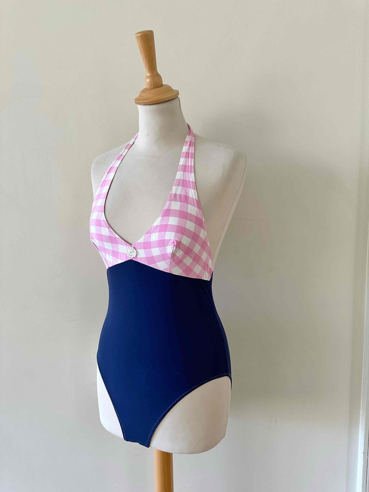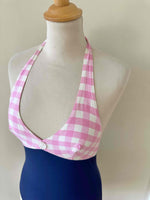 Prix unitaire parMaillot de bain vichy, dos nu plongeant à nouer, haut triangle décolleté, en vichy rose et blanc avec petite fleur brodée milieu poitrine, bas bleu nuit, fabriqué en France, taille 36, porté ici sur un mannequin T36. Contient du coton.