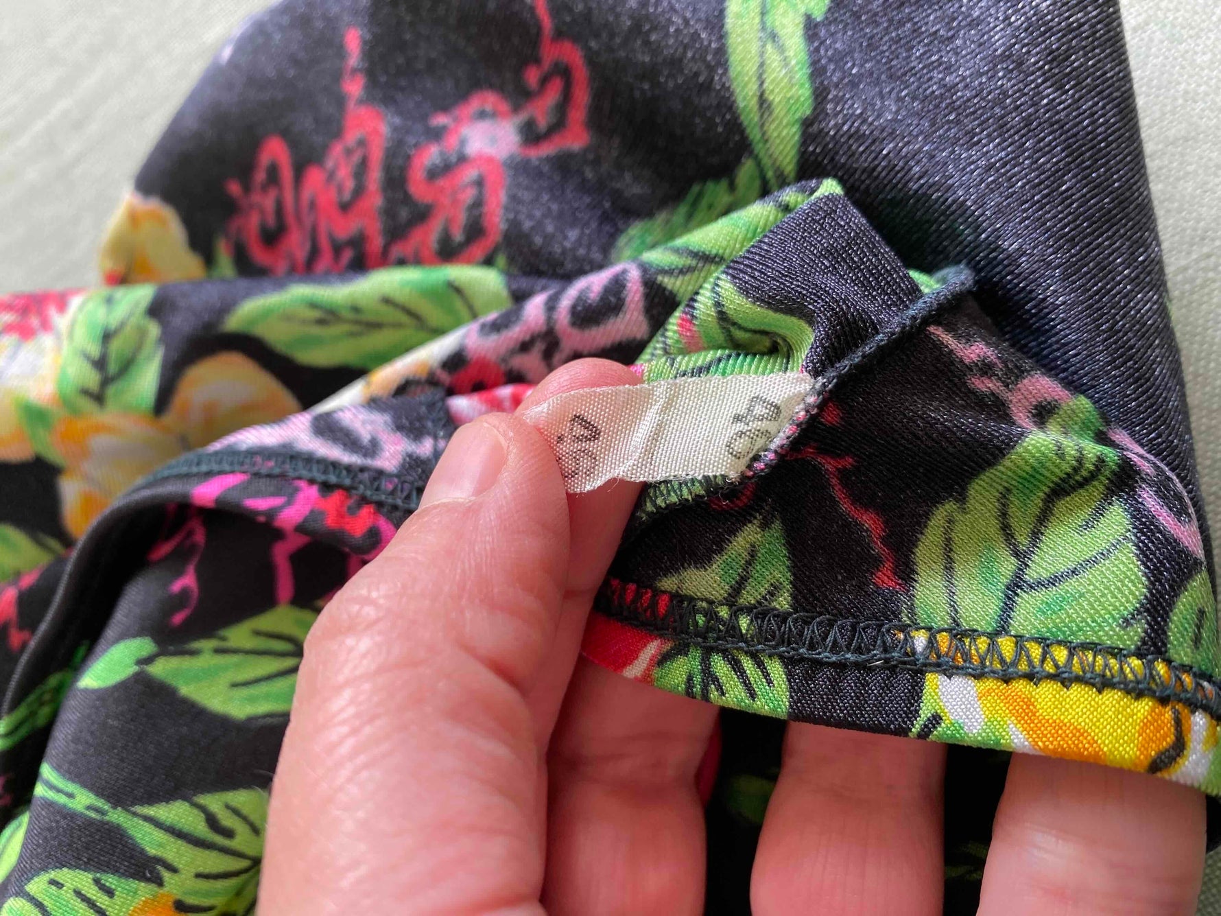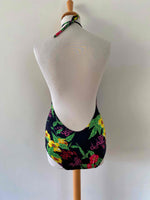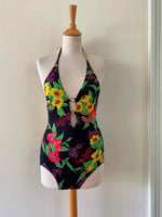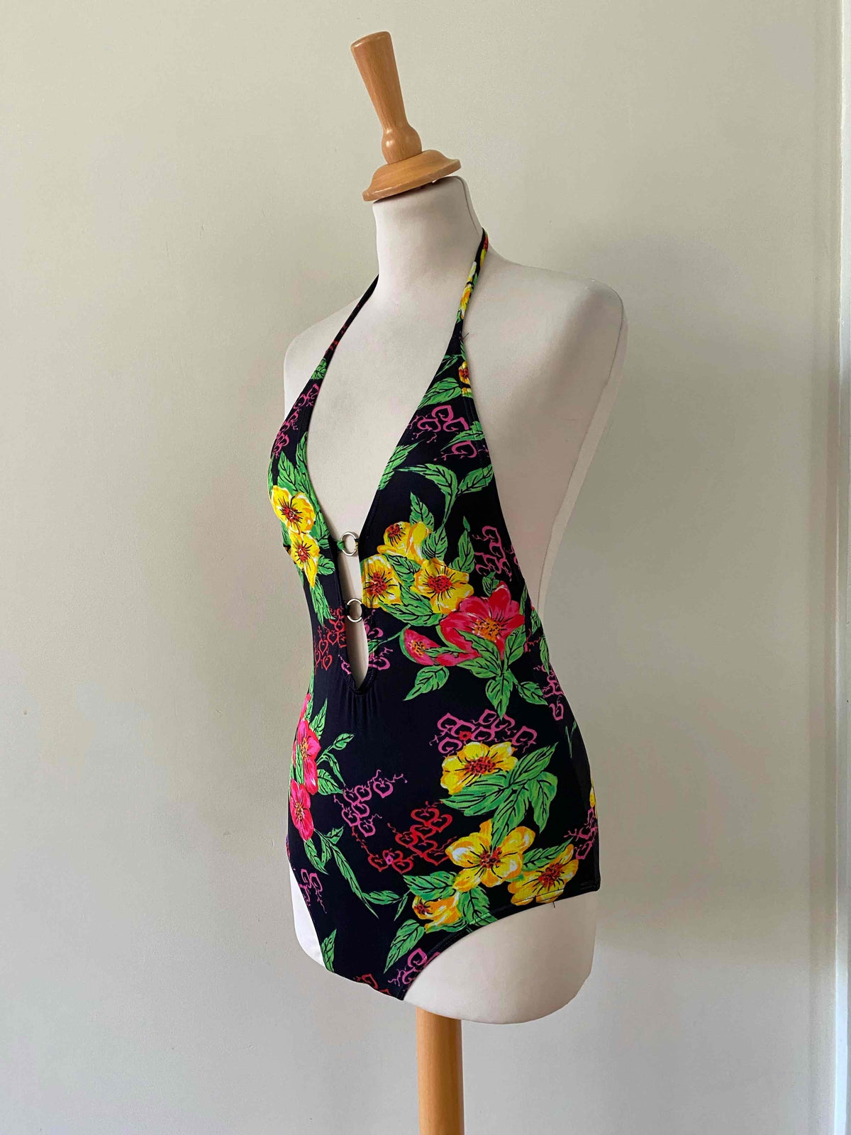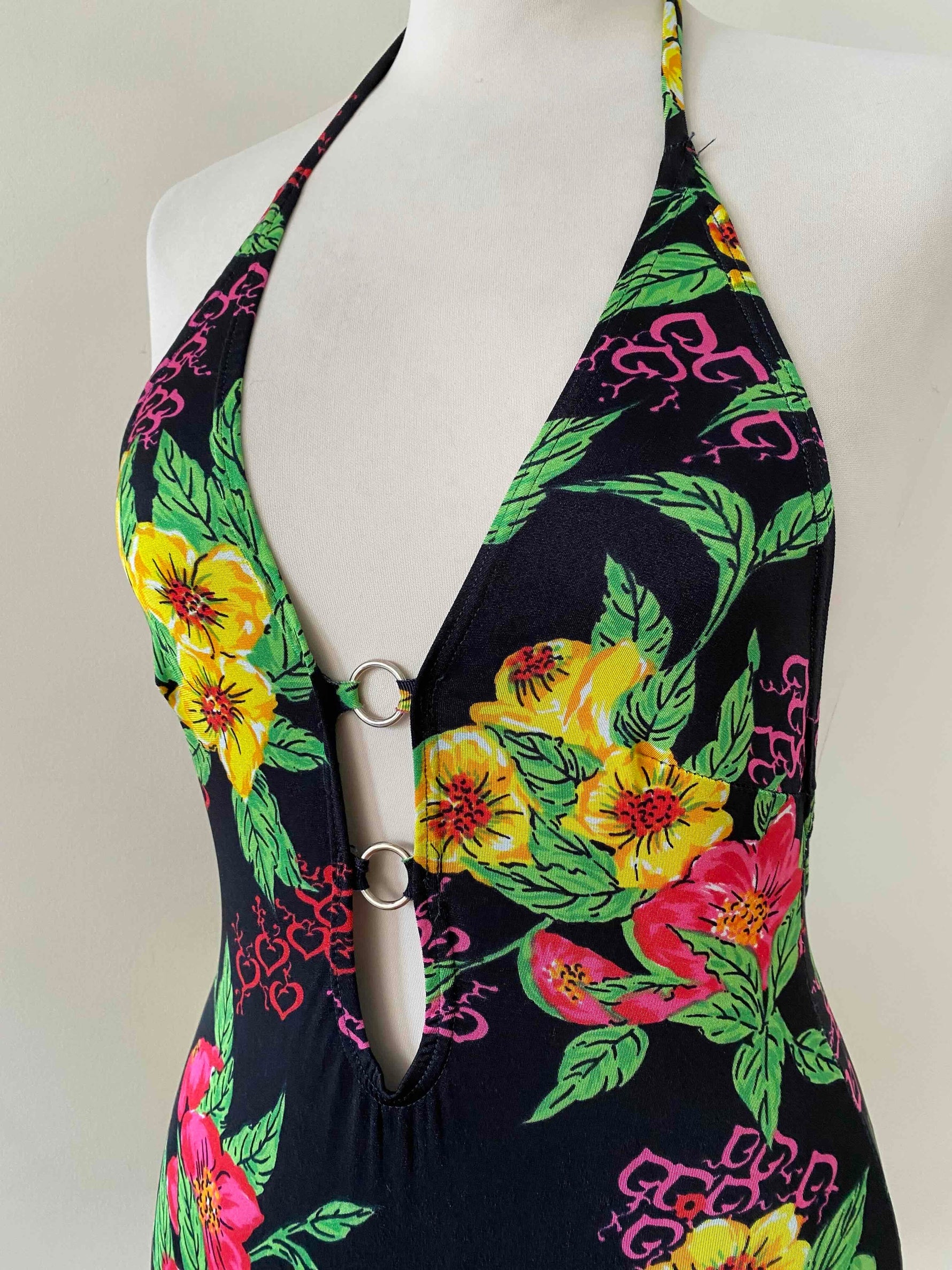 Prix unitaire parMaillot de bains dos nu 80’s noire à fleurs multicolores, anneaux poitrine plingeante ajourée, à nouer cou dos, fabriqué en Italie, taille 34 porté ici serré sur un mannequin T36.