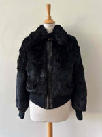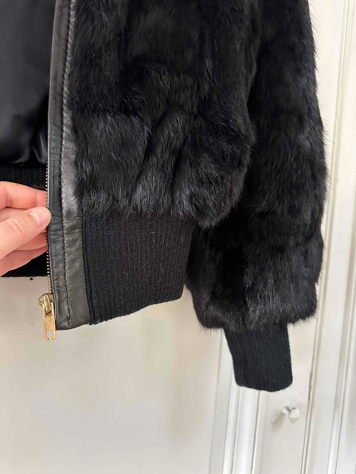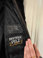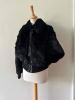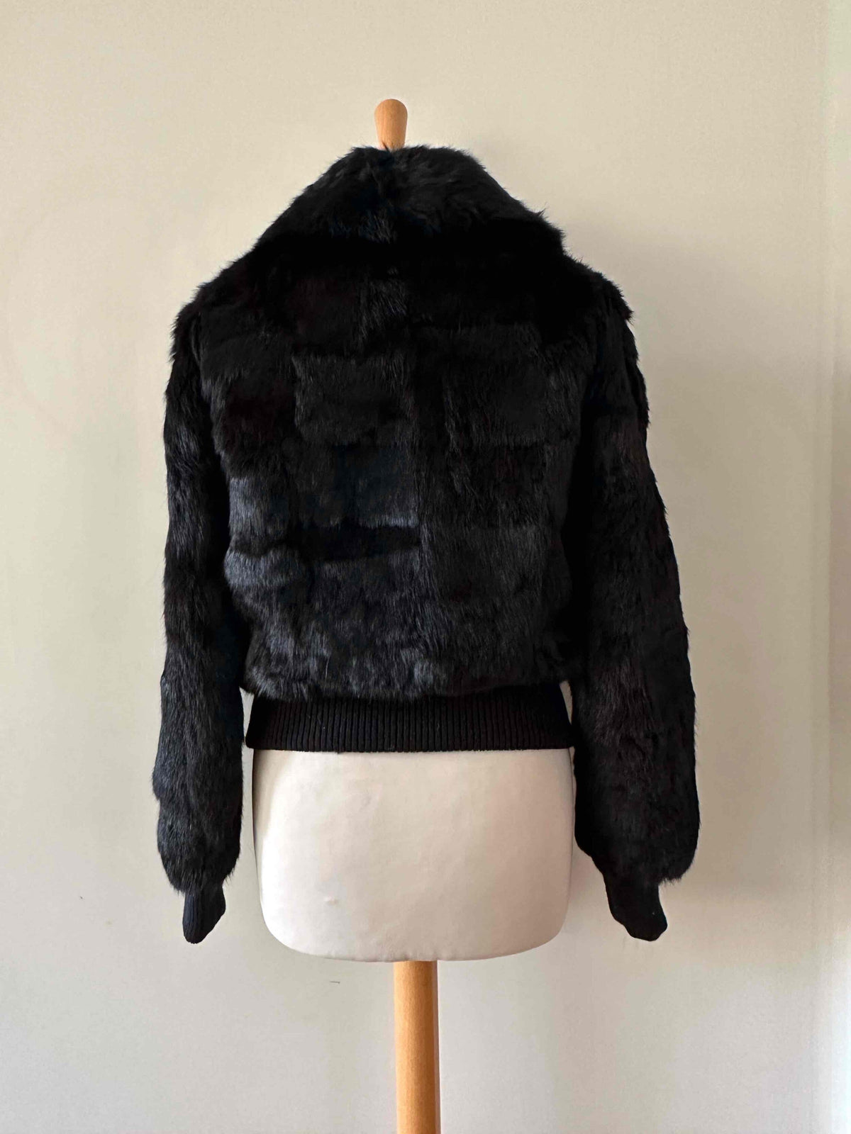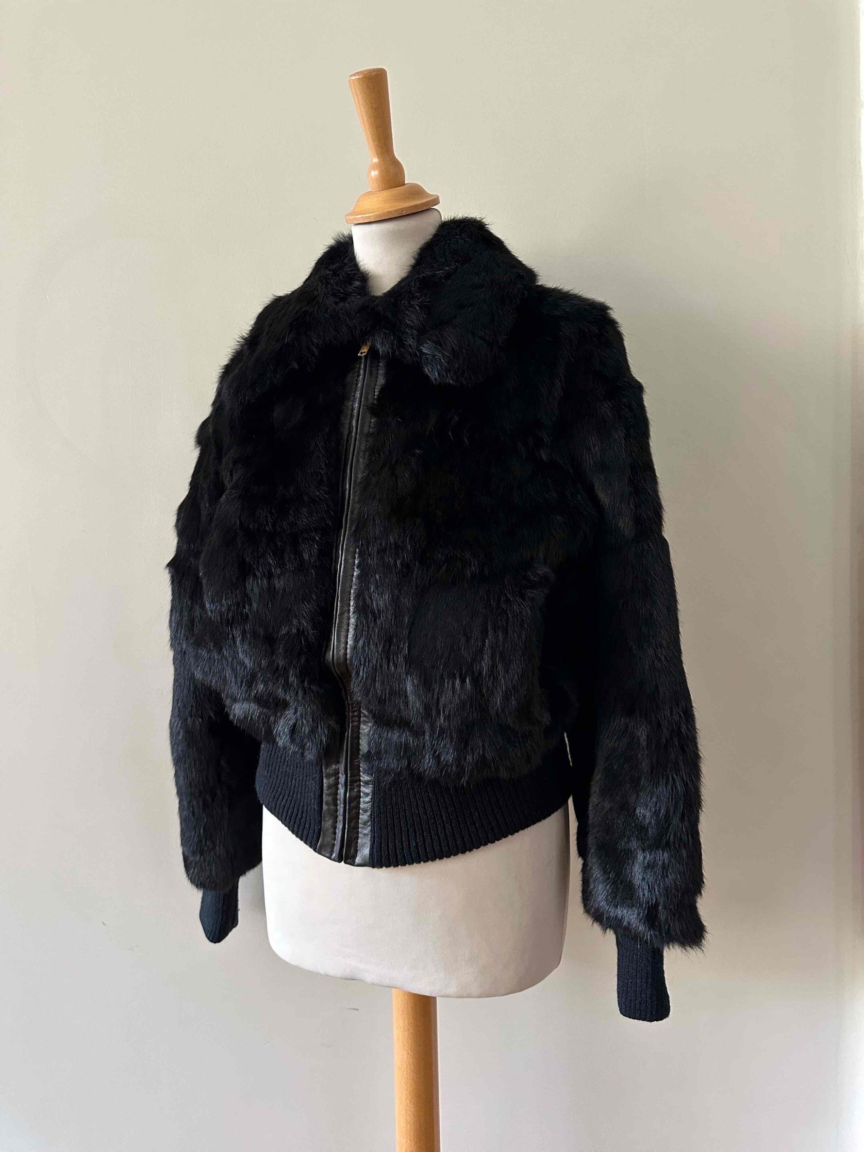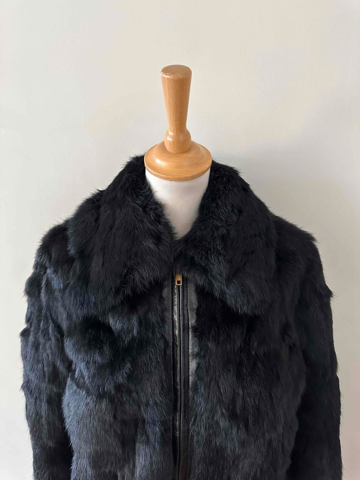Prix unitaire parBlouson en fourrure veritable noire, et cuir, forme teddy avec col claudine, bords côtes élastiques en bas et poignets, fabriqué en Allemagne, années 70s, convient aux tailles 34 et 36 porté ici sur un mannequin T36.