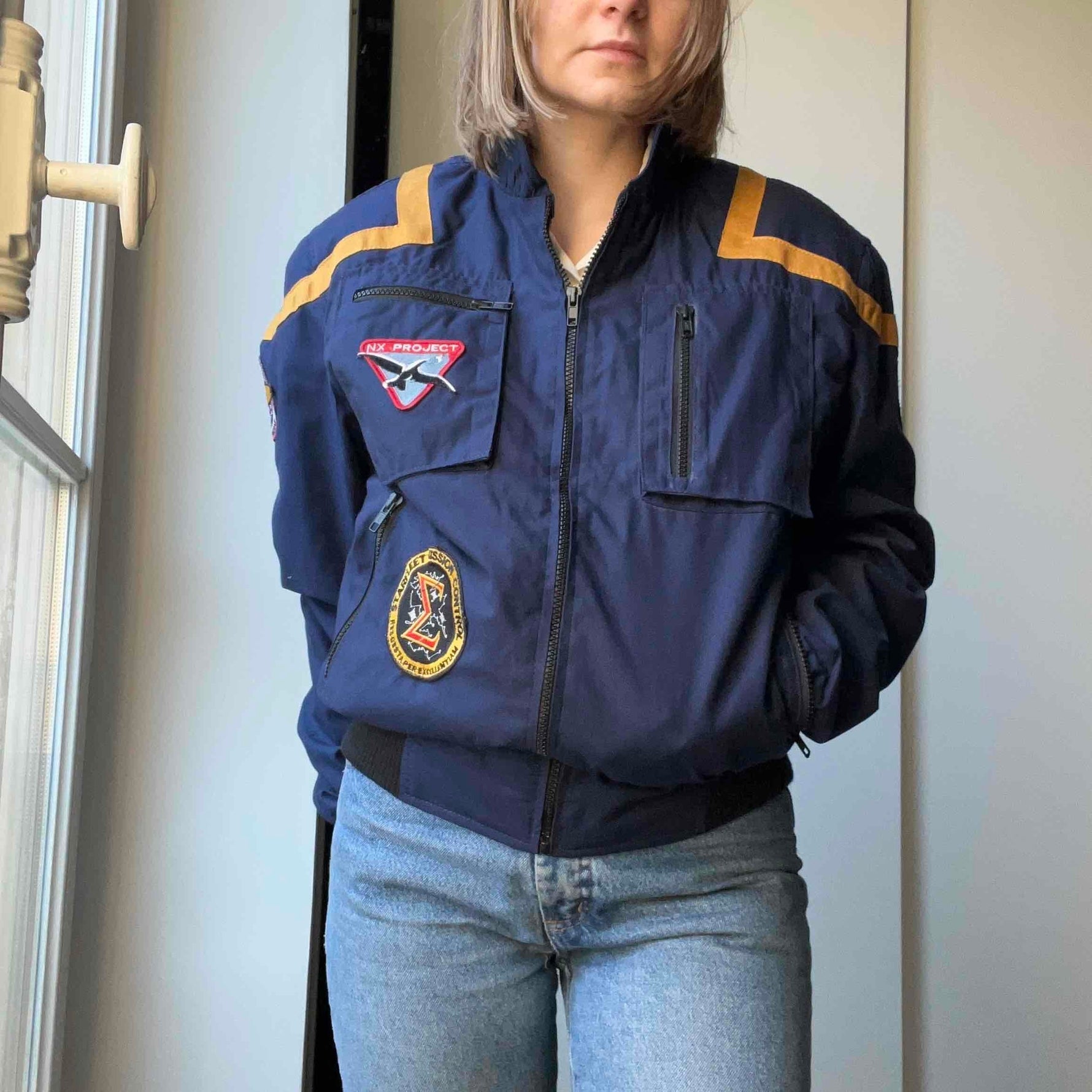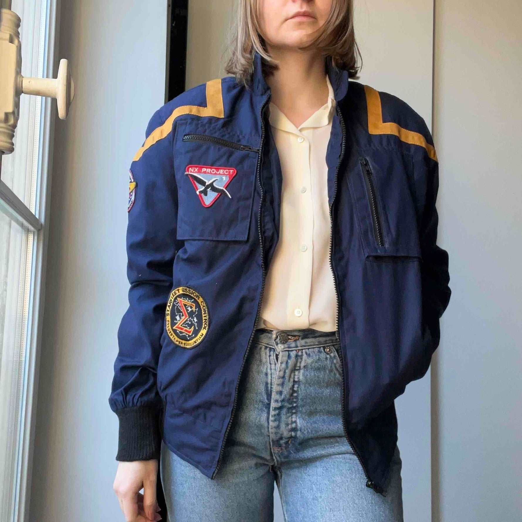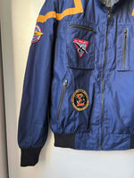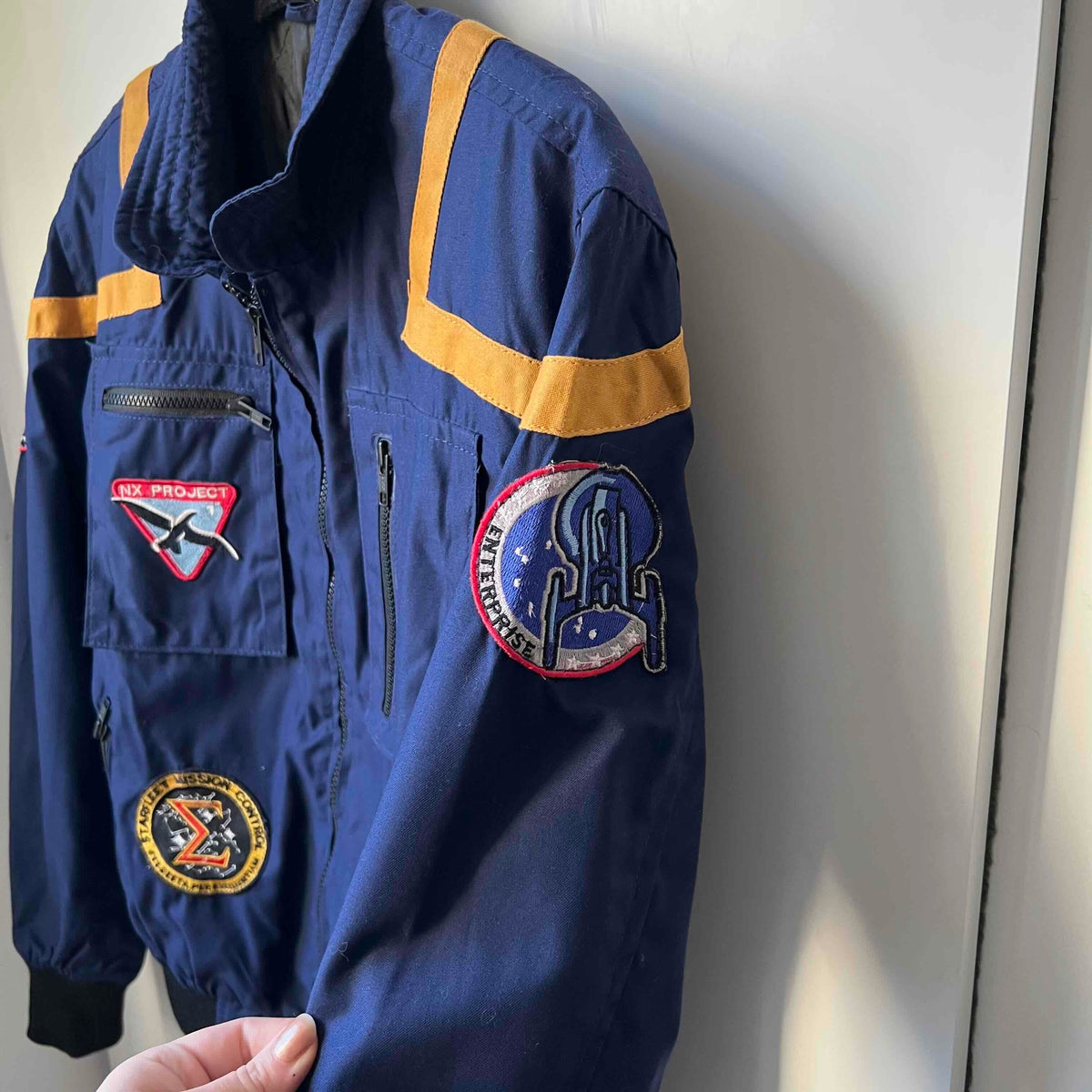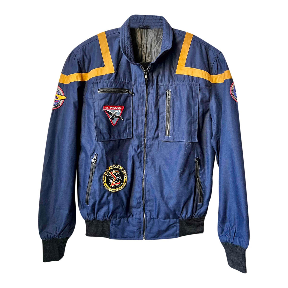 Prix unitaire parVeste courte en coton Bleu marine avec des écussons style astronaute. Fermeture des poches par zip. Détails de jaune et rouge. Taille 36 à 40. Doublure matelassé